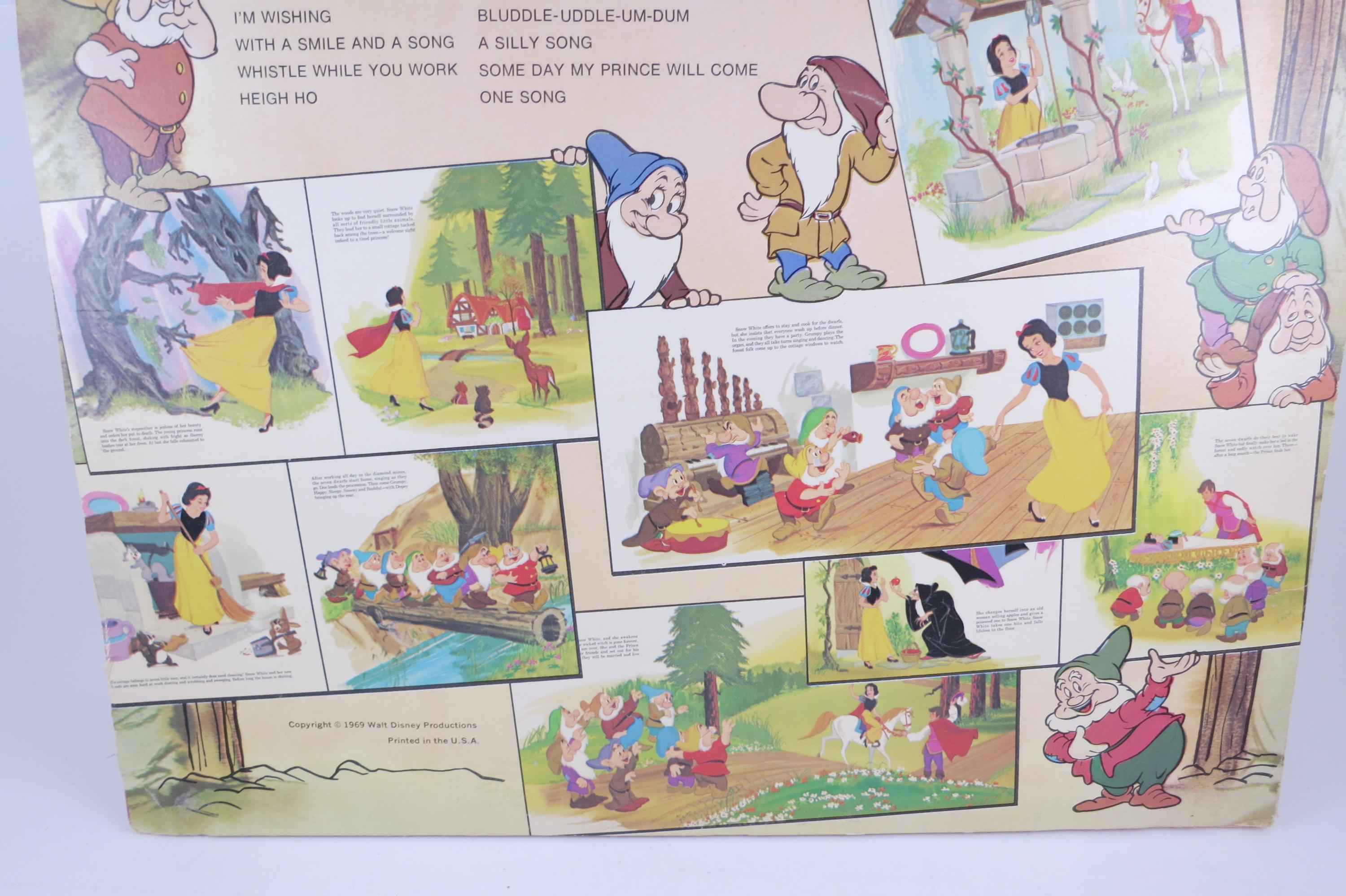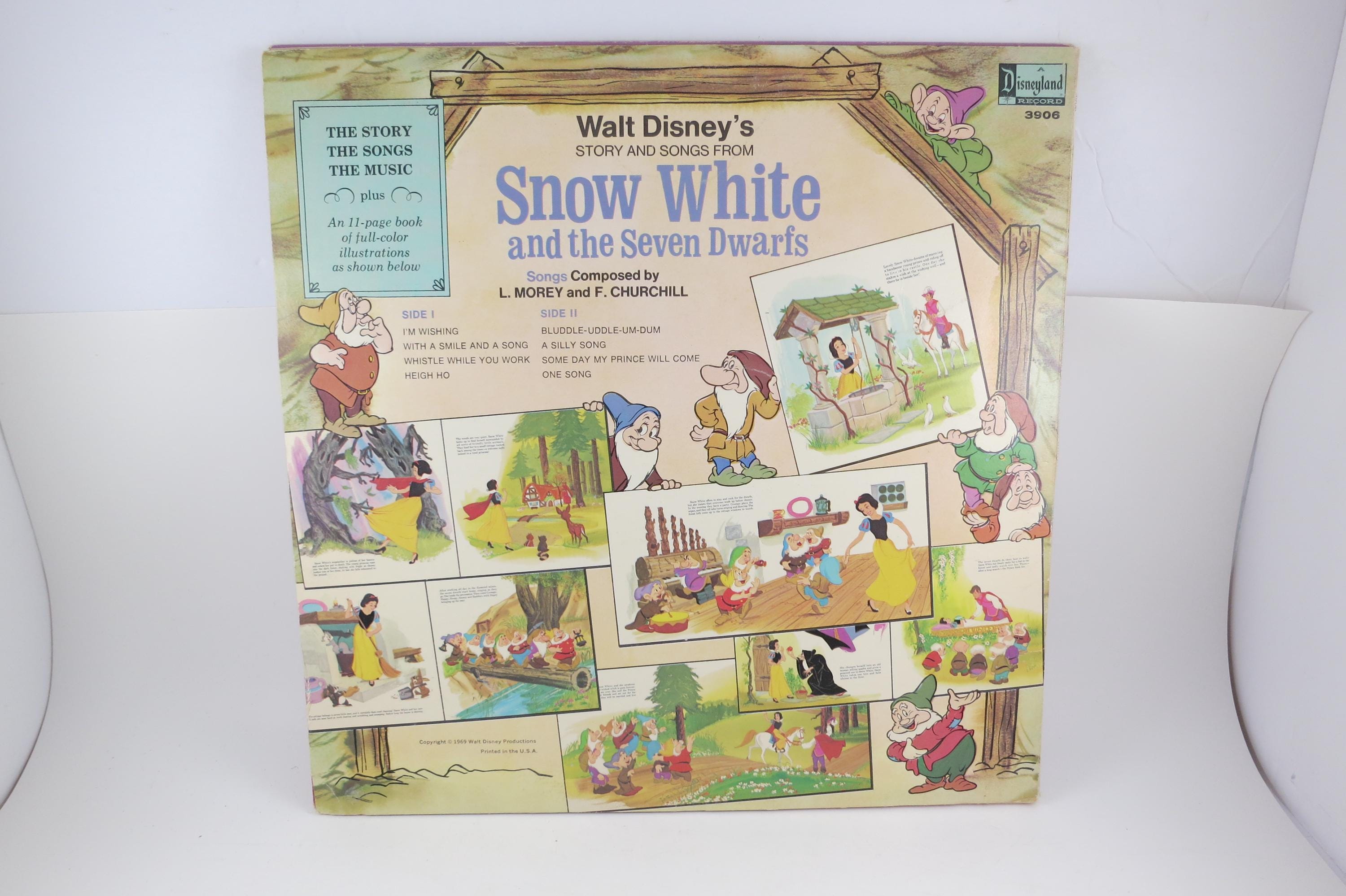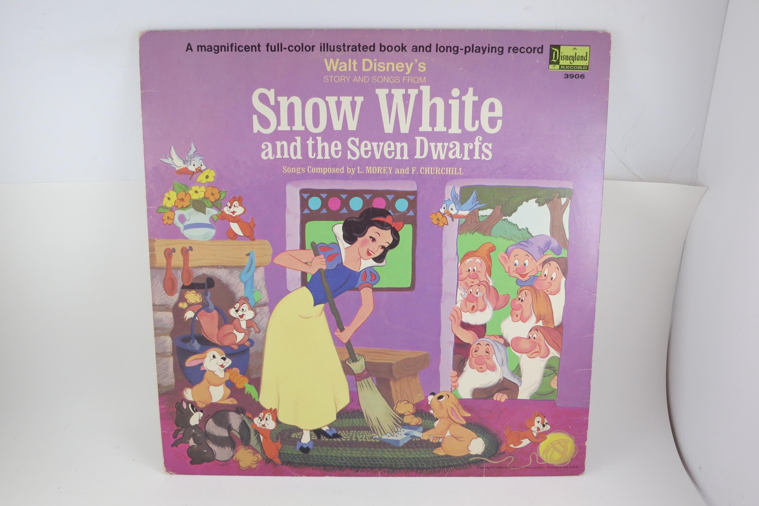 Vintage 1969 Vinyl LP Children's Record Walt Disney Snow White and the Seven Dwarfs with Picture Book. Original gate fold cover is in excellent condition and includes the inner paper sleeve, as well as the original 11 page picture book. Record is fair with scuffs and marks. Tracks are as follows