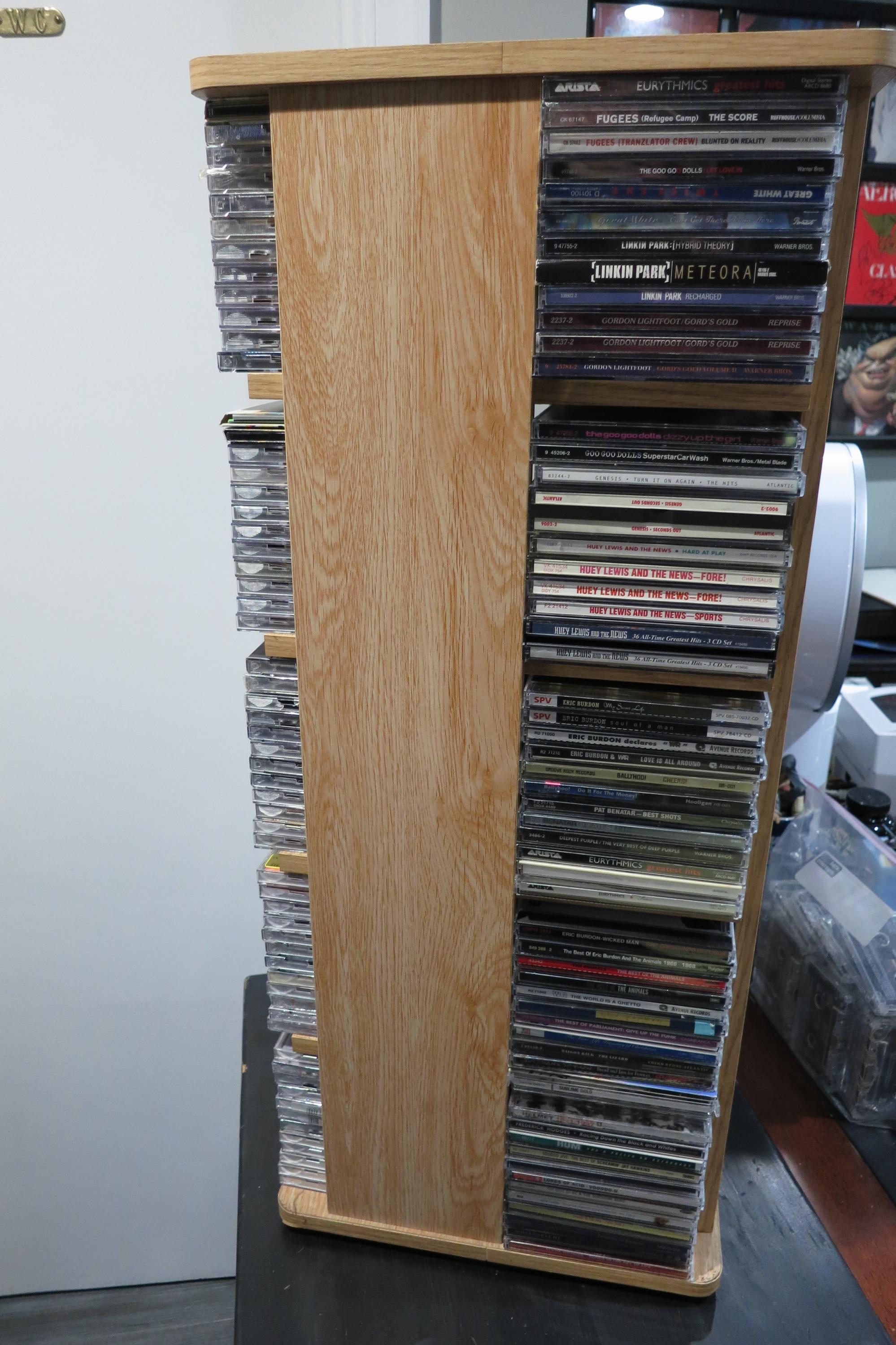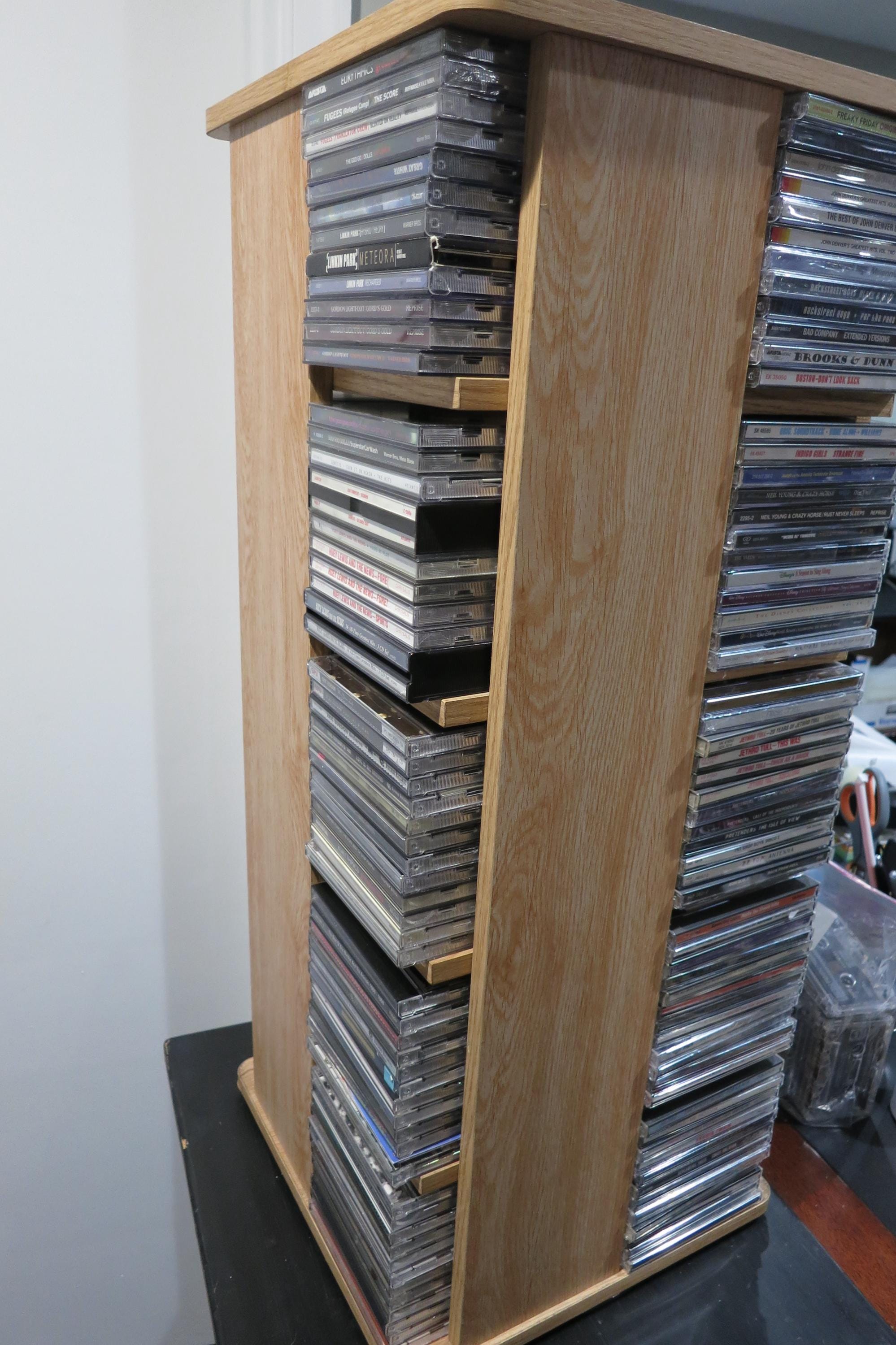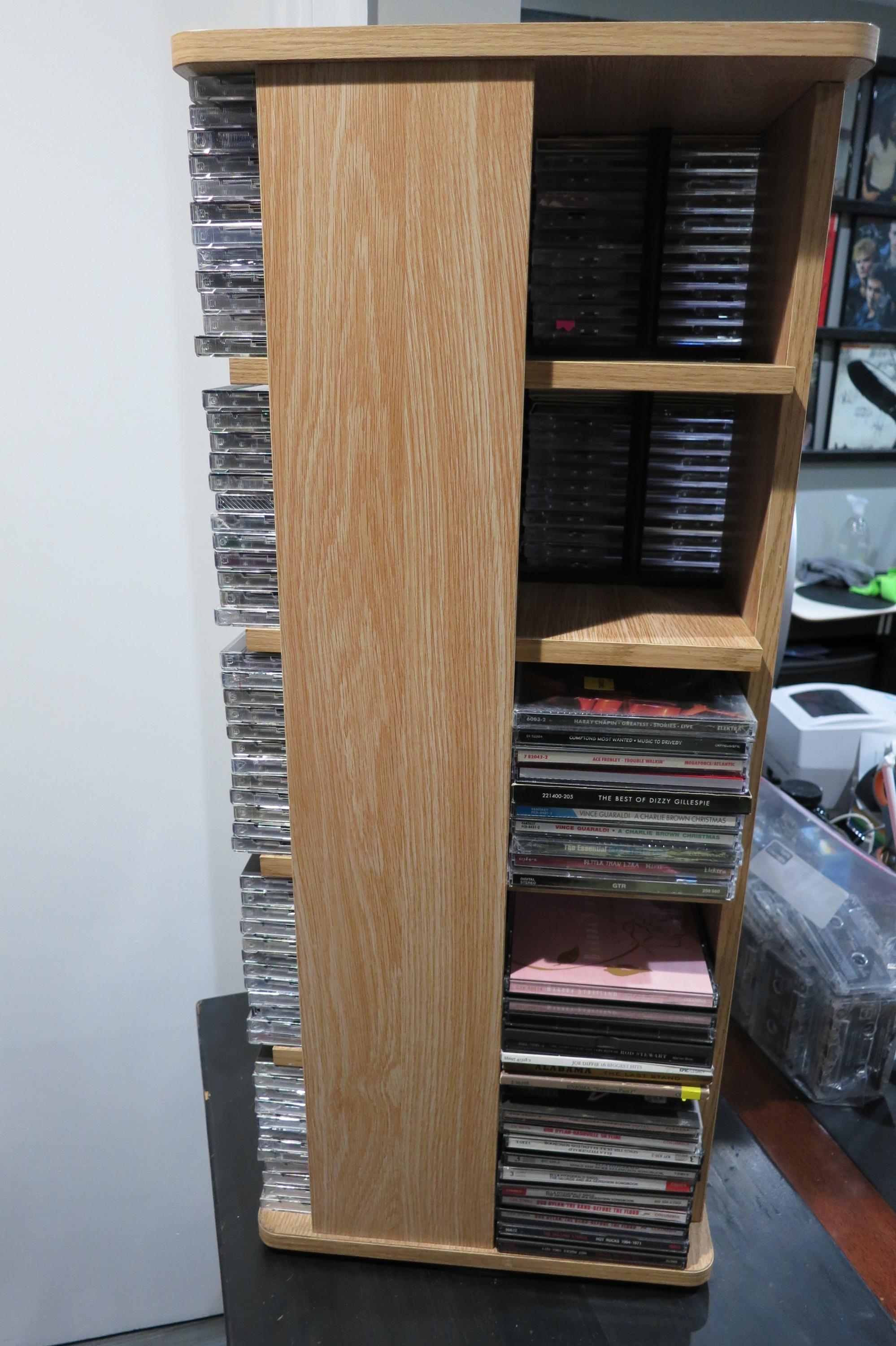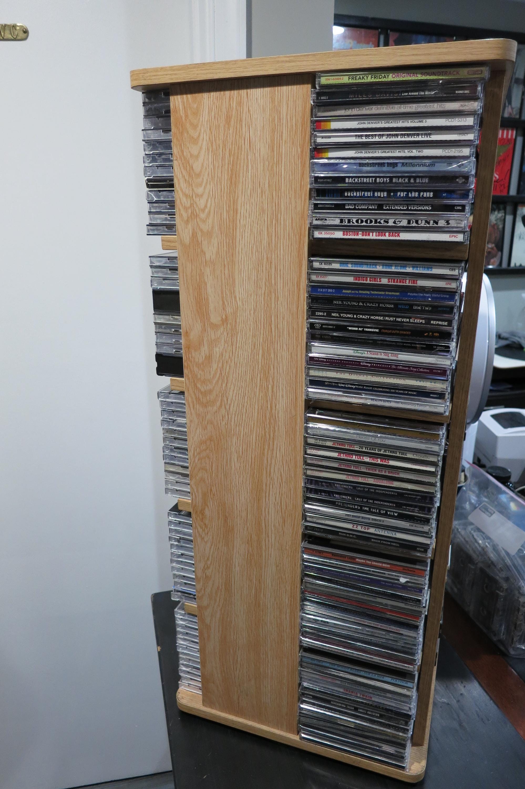 Vintage Case Logic Rotating Solid Wood CD Tower Holds 240 Discs Top of the Line. Very nice way to display/hold your favorite cd's! This was one of the largest of it's time. It measures 28 1/4 inches tall, 12 1/4 by 12 1/4 and weighs 22 pounds without any discs! Quality Piece made by Case Logic. Has 20 sections, 5 each side, each space holds 12 discs. Total storage capacity of 240 discs, singles, doubles, even triples. Very sturdy and nice looking.