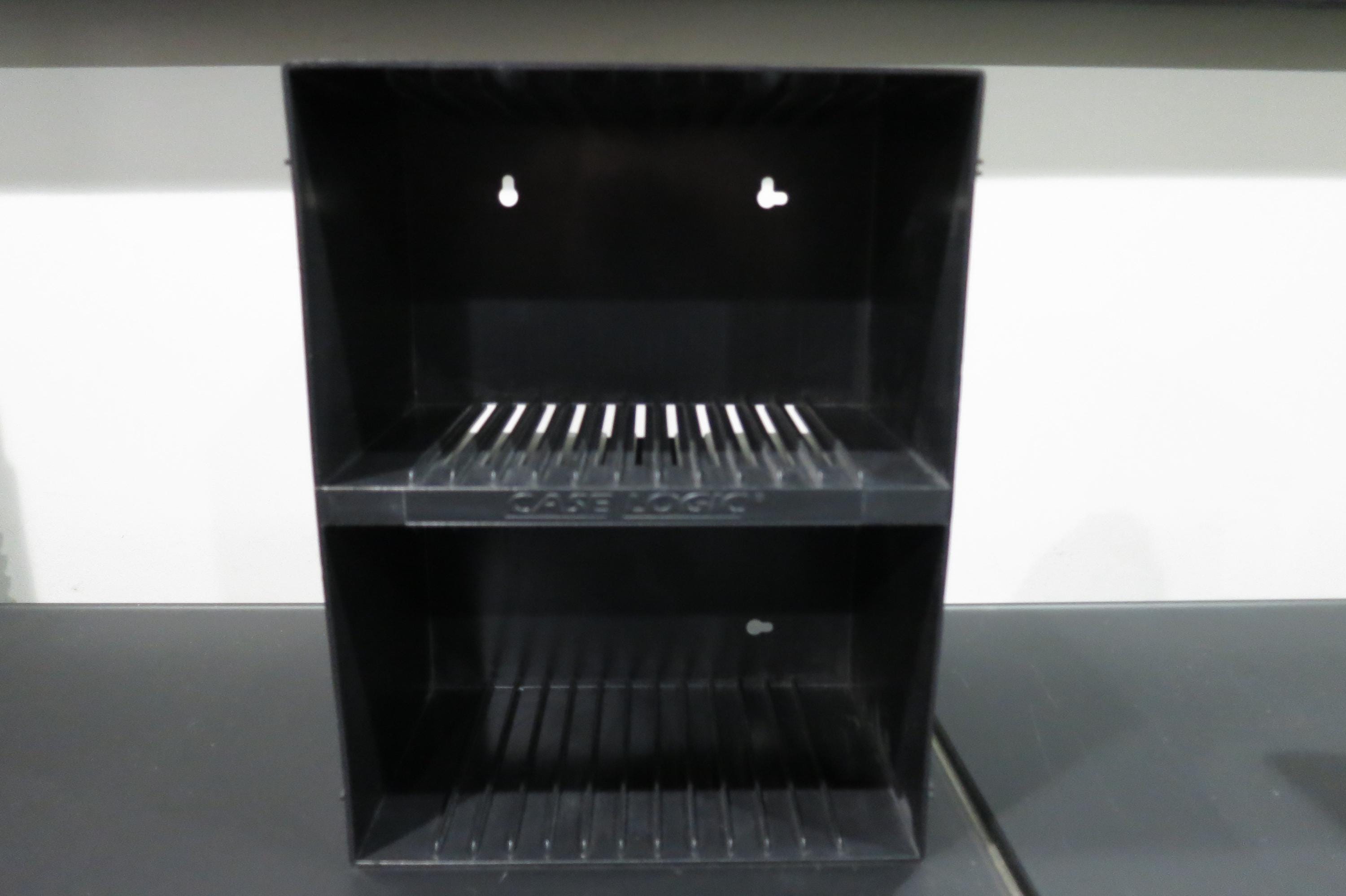 Black Case Logic Hard Plastic 30 CD Holder Wall Mount or Freestanding. Can be free standing or wall mount. Measures 10 3/4 inches wide, 5 1/2 inches deep and 8 1/4 inches tall. Displays horizontally or vertically.
