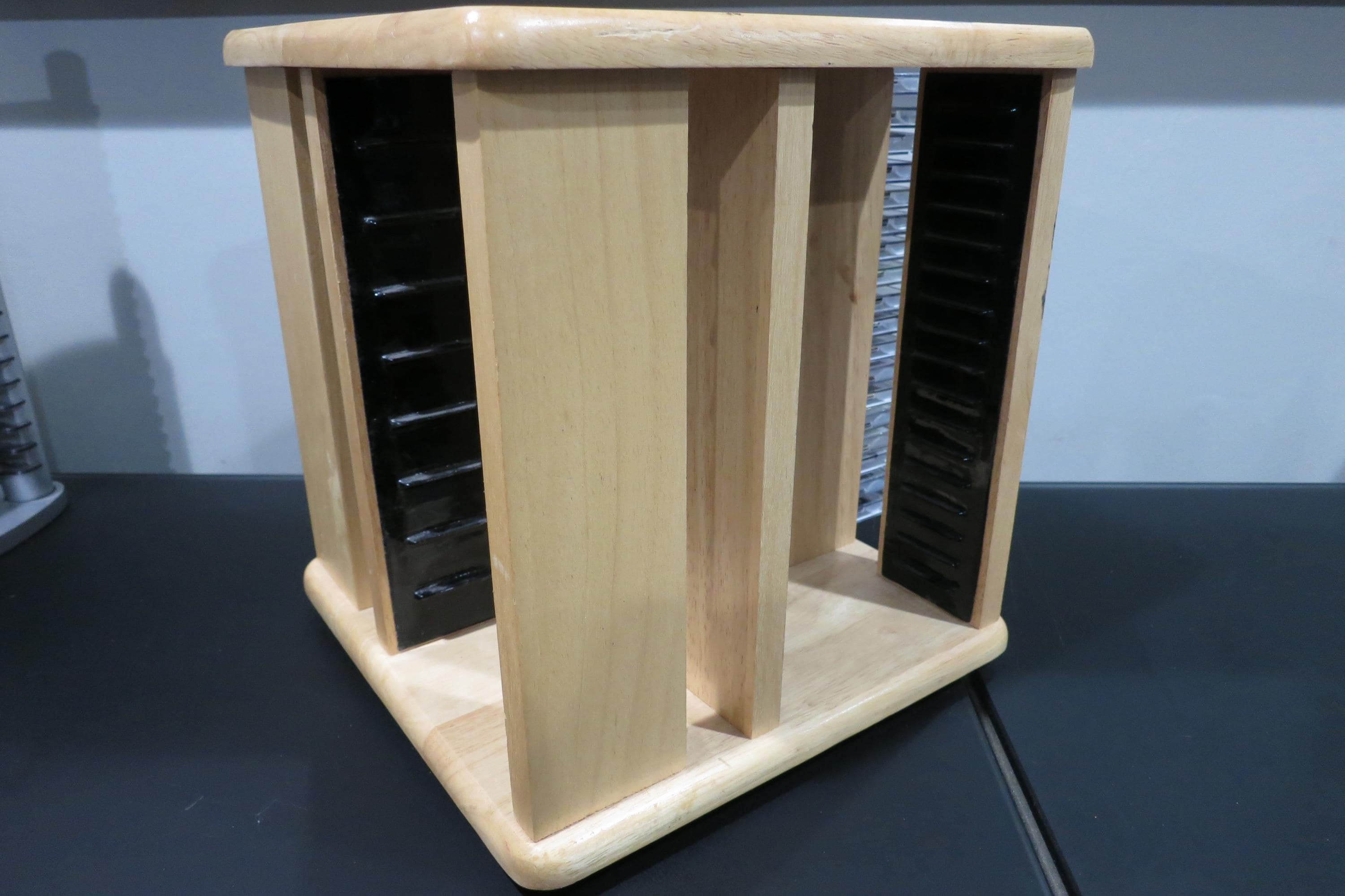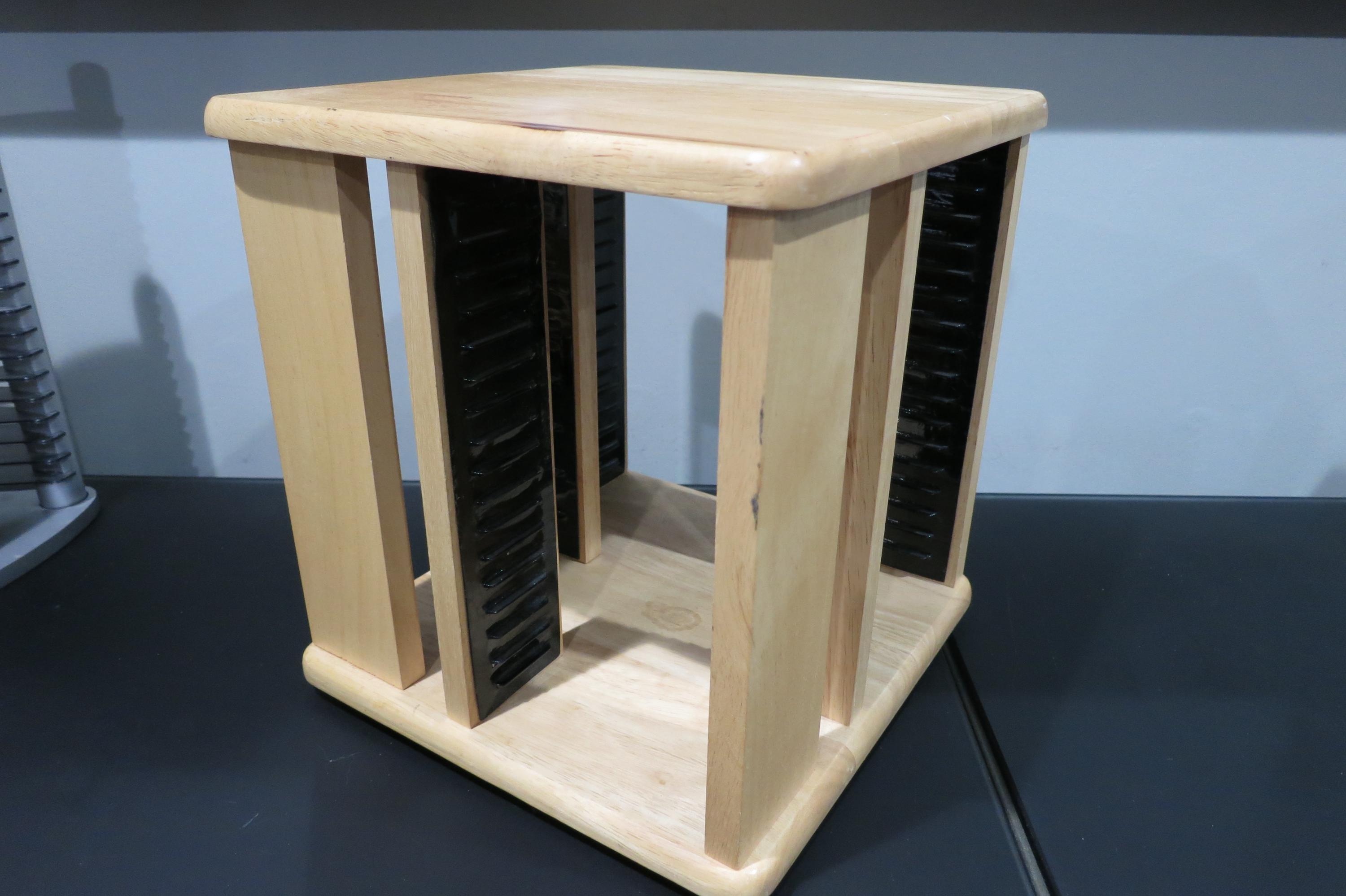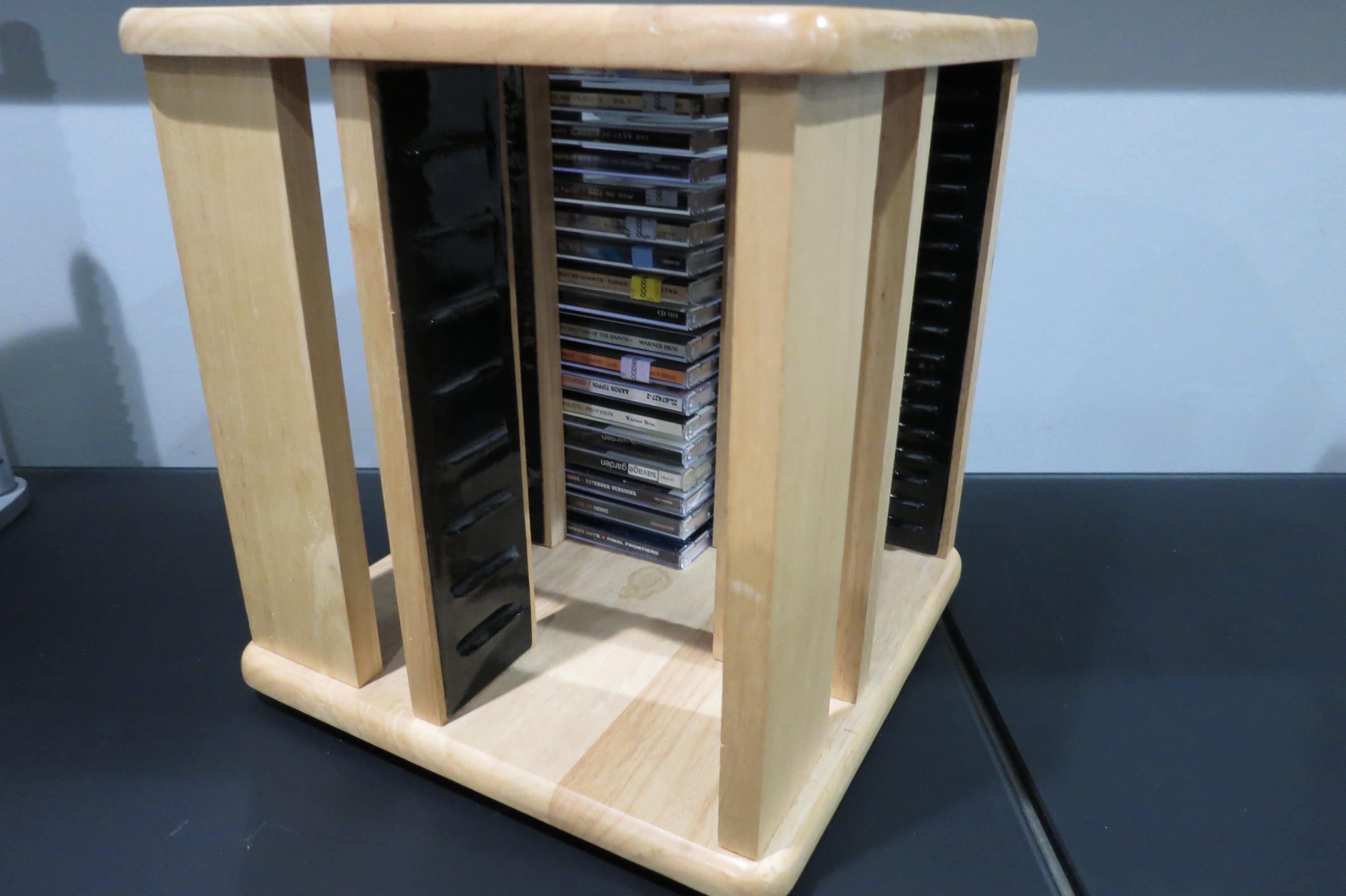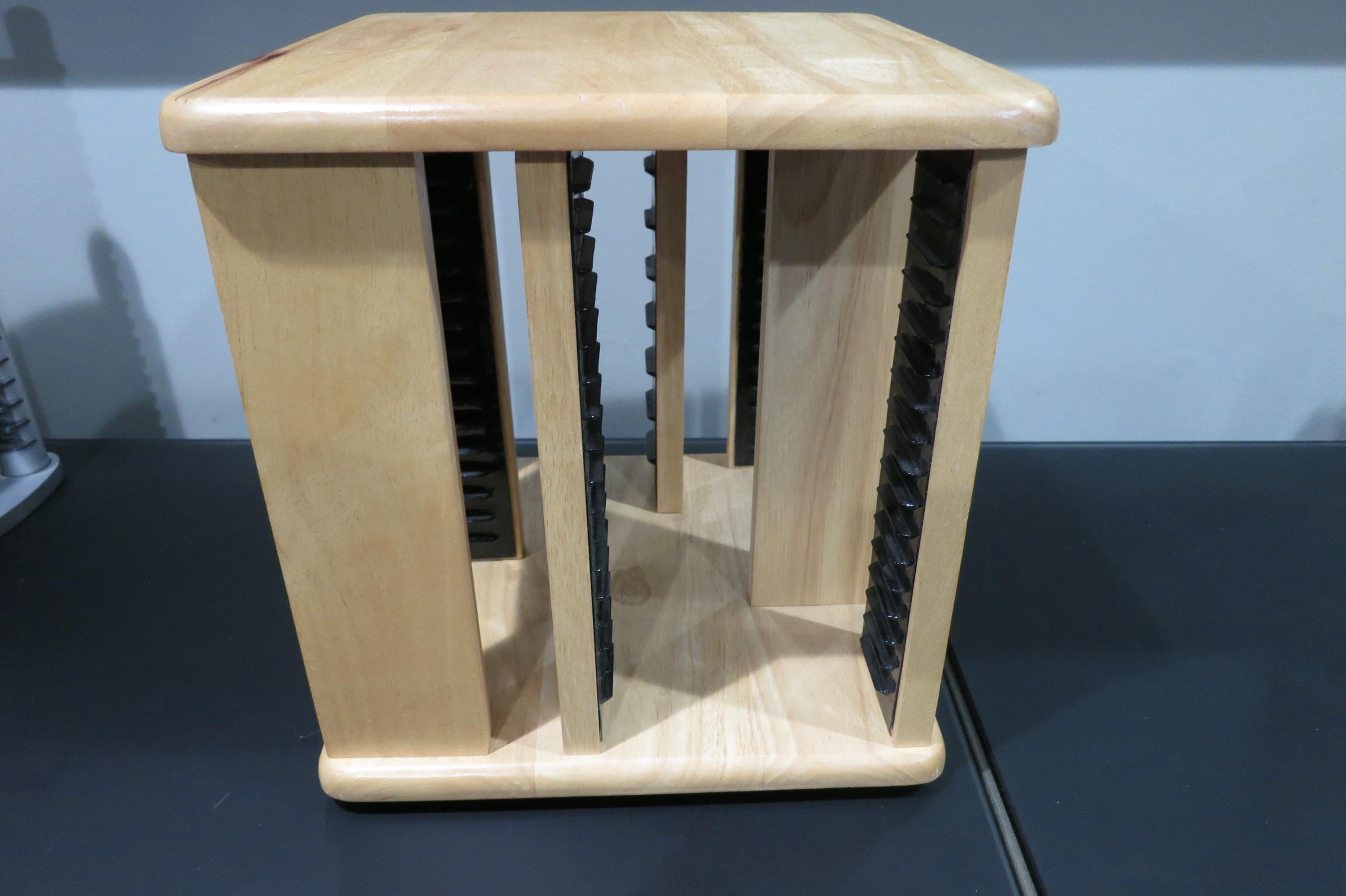 Vintage Blonde Wooden Rotating Carousel 72 CD Holder Ash. Measures 11 1/2 inches tall and 10 3/4 by 10 3/4.