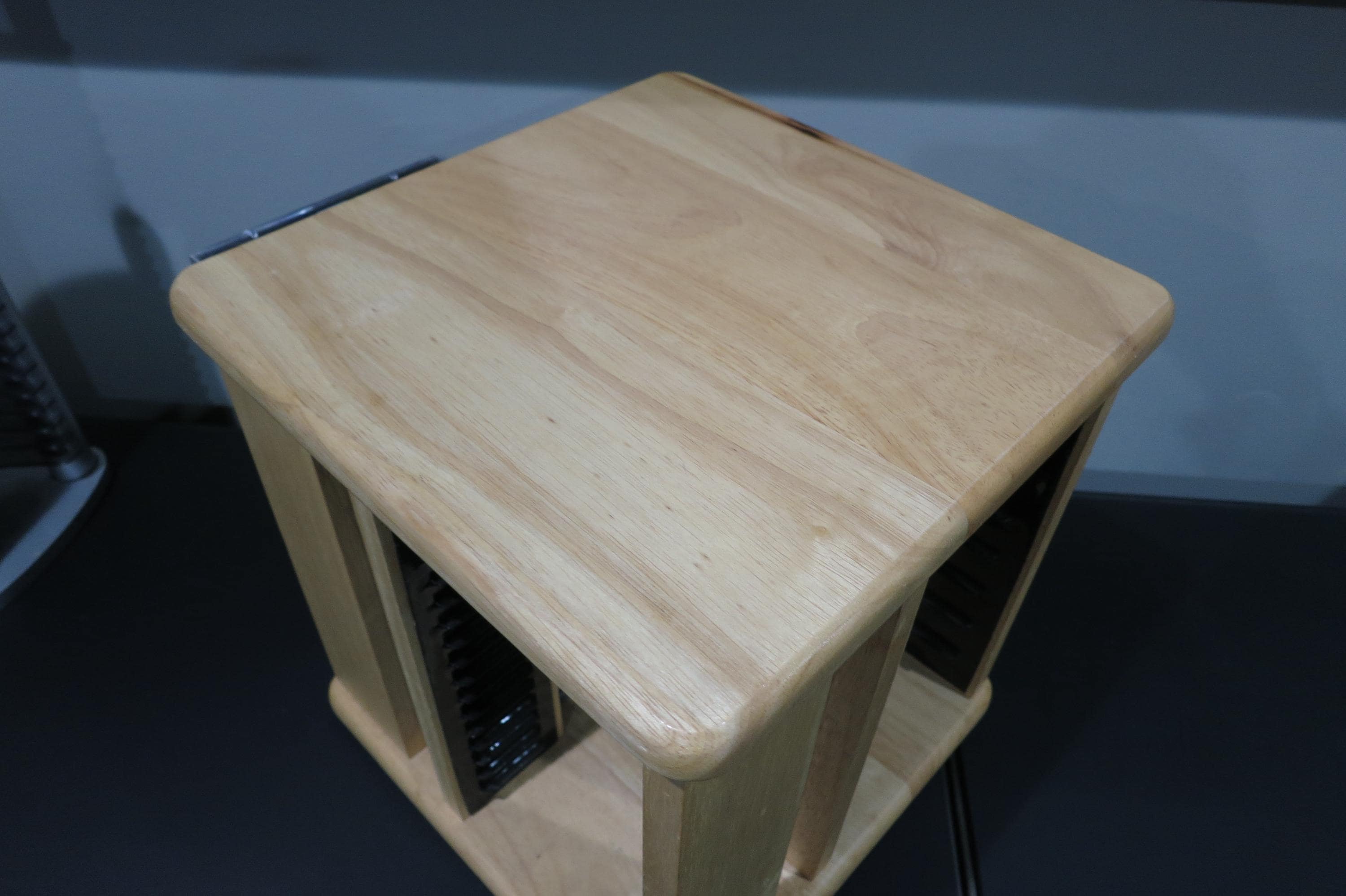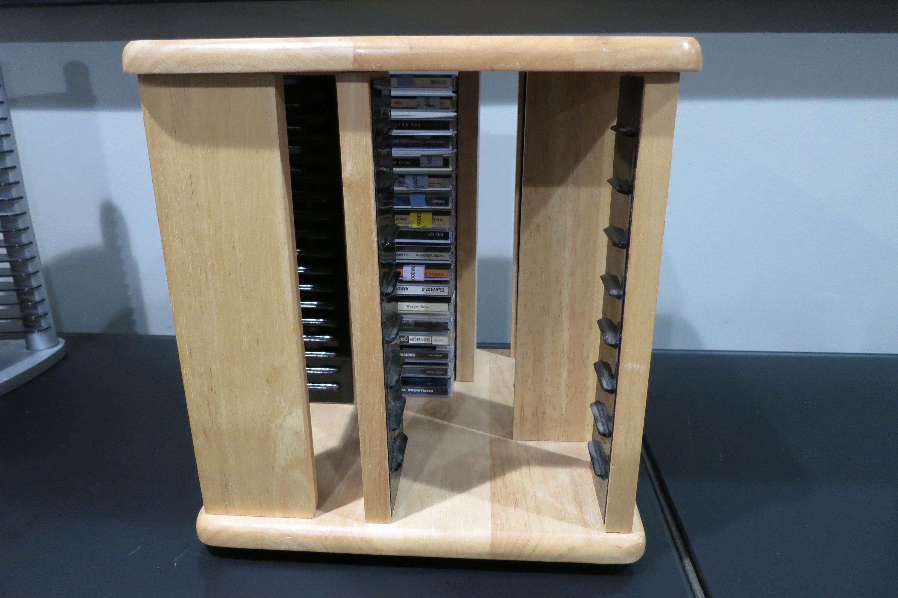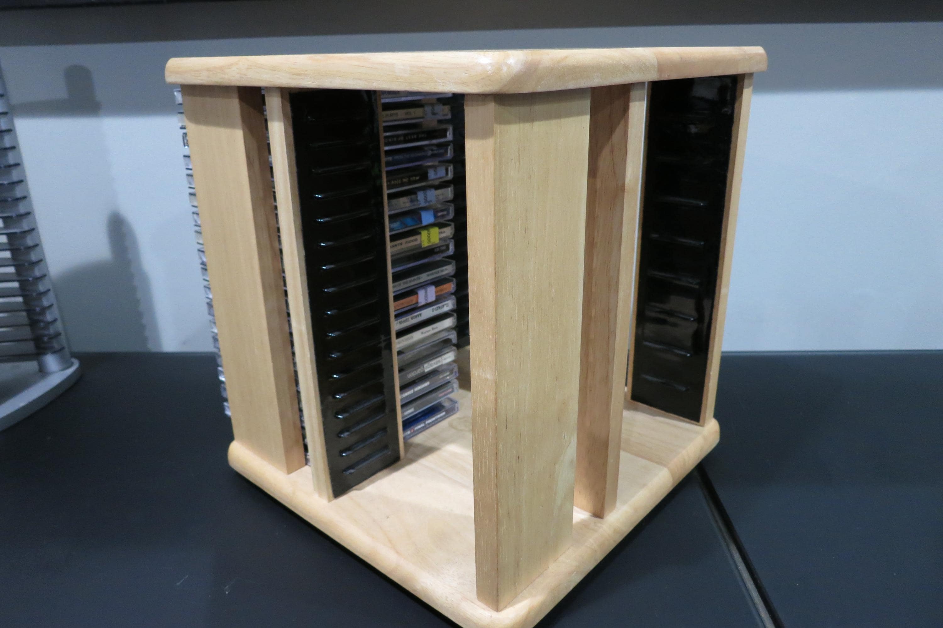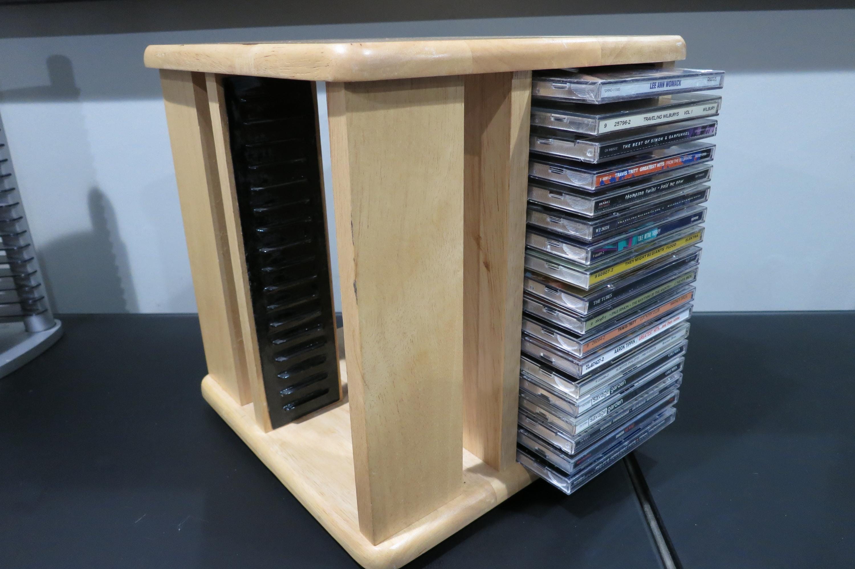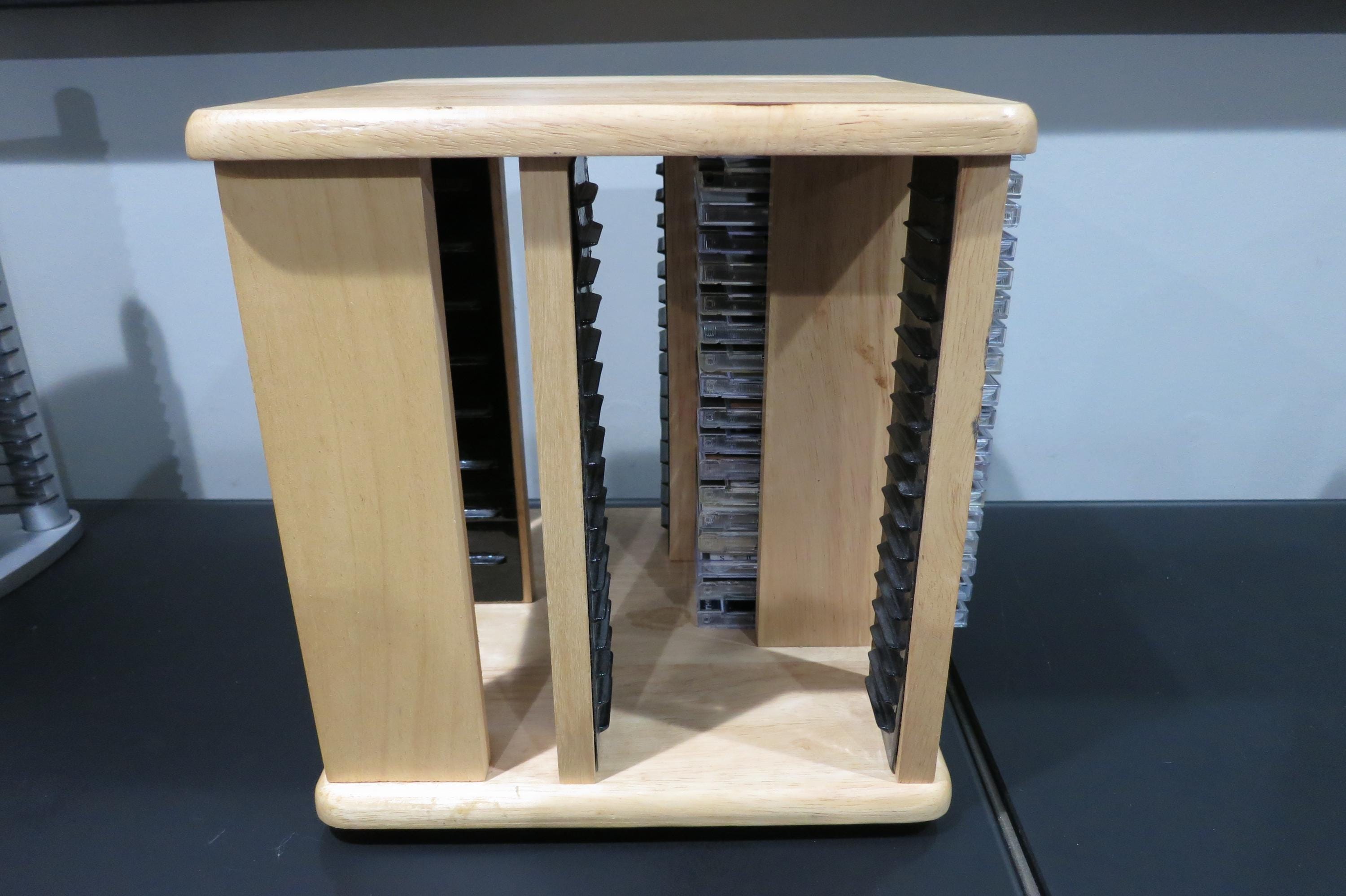 Vintage Blonde Wooden Rotating Carousel 72 CD Holder Ash. Measures 11 1/2 inches tall and 10 3/4 by 10 3/4.