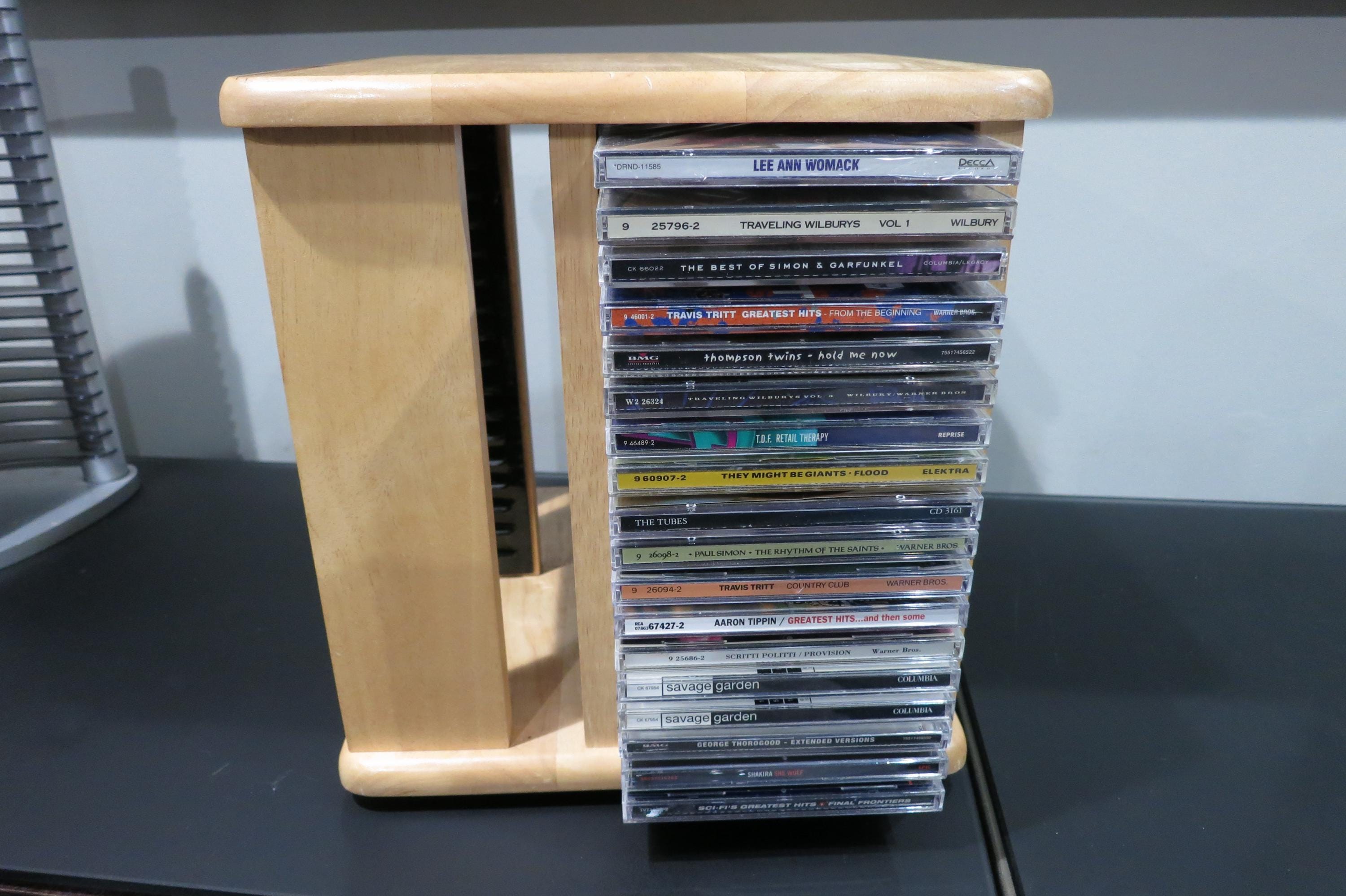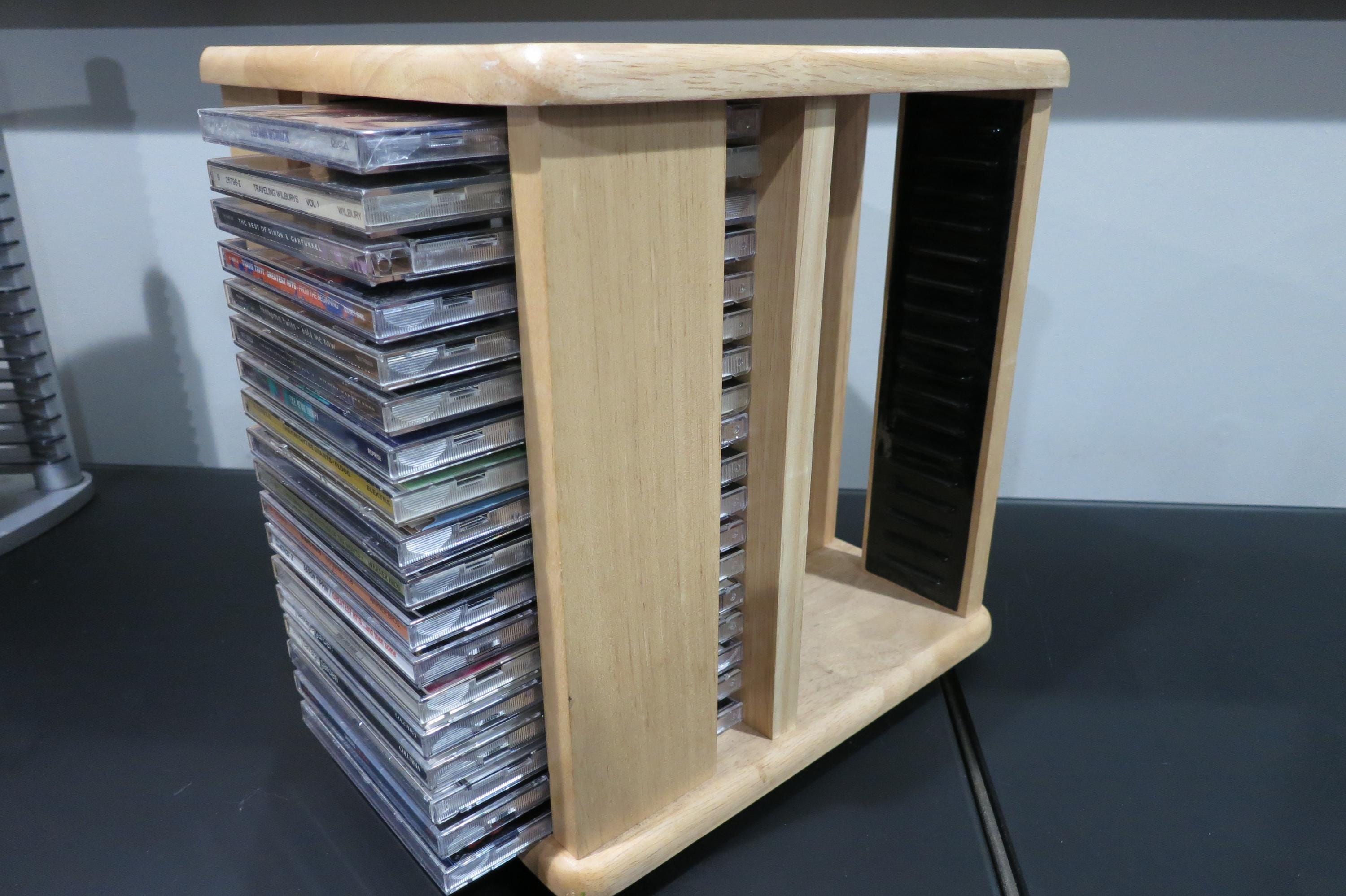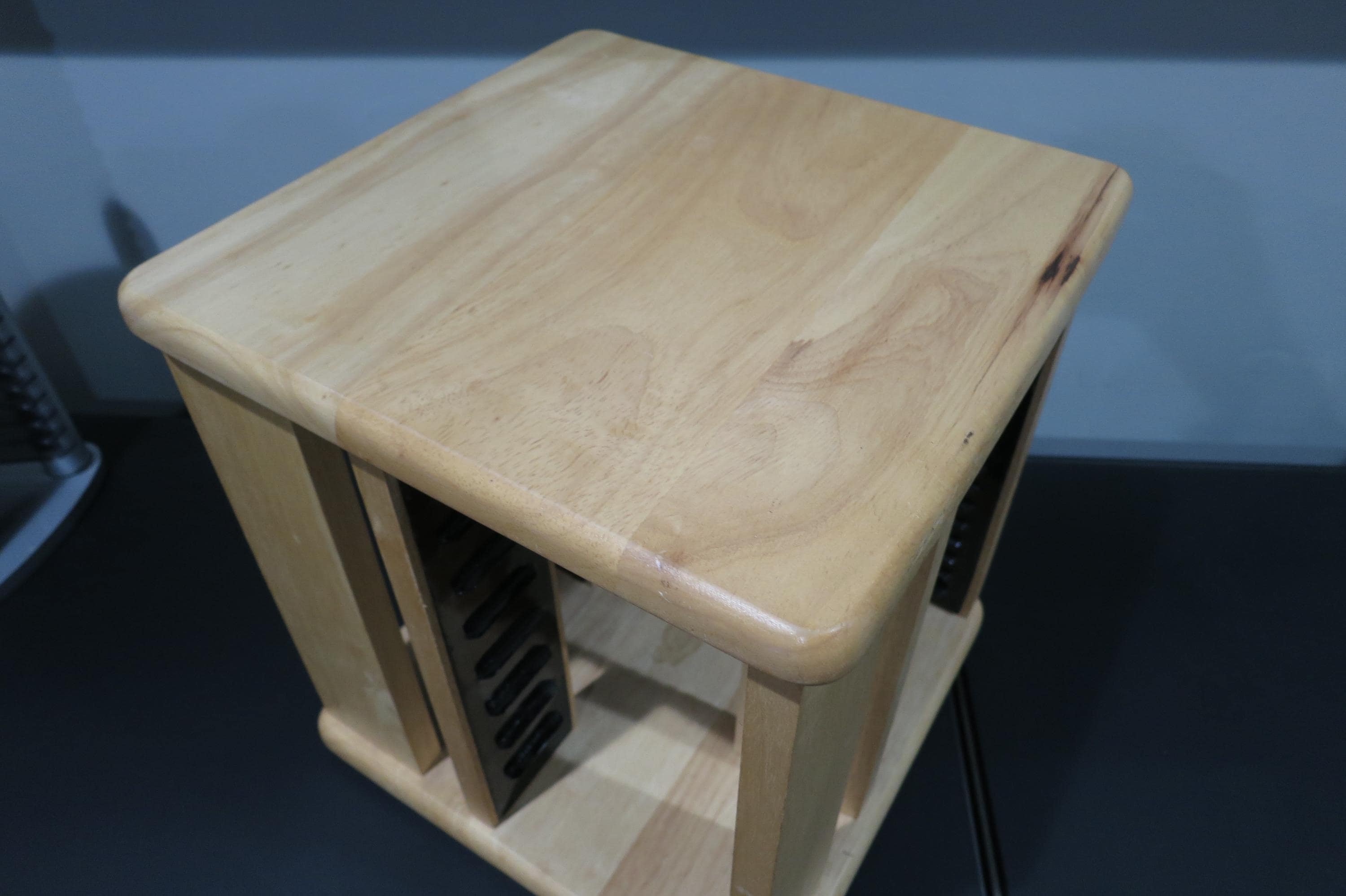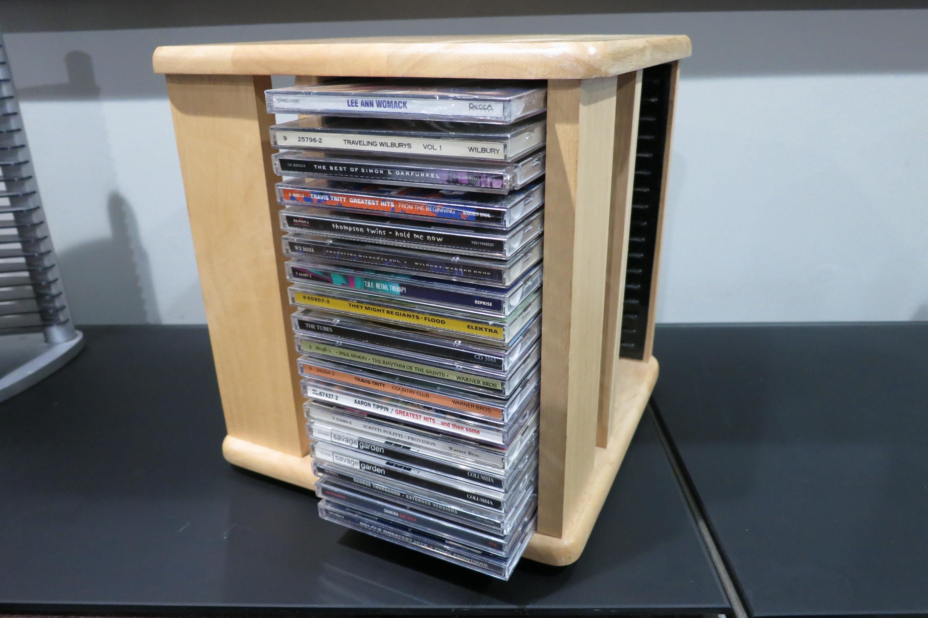 Vintage Blonde Wooden Rotating Carousel 72 CD Holder Ash. Measures 11 1/2 inches tall and 10 3/4 by 10 3/4.