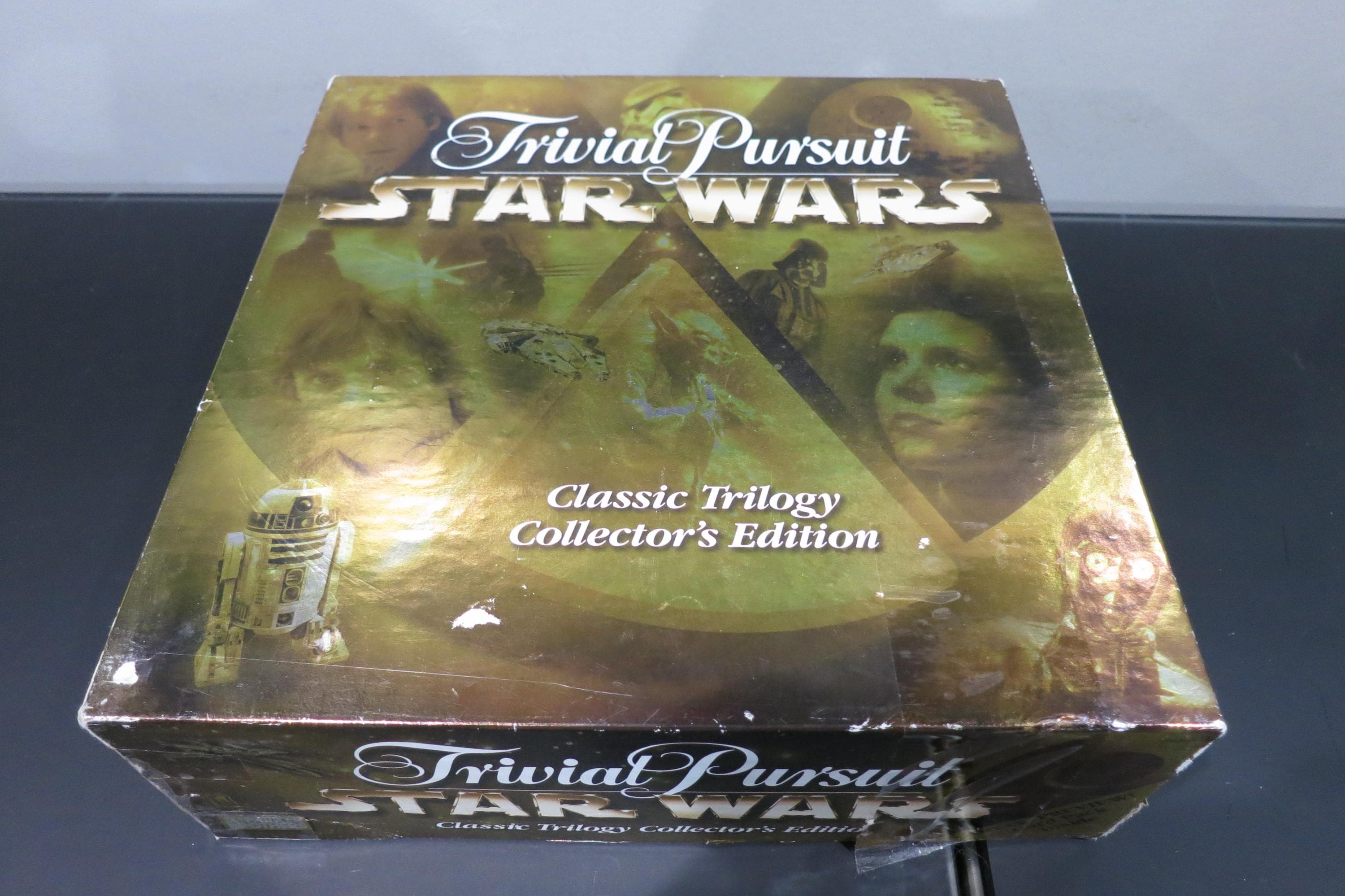 Vintage 1997 Star Wars Classic Trilogy Trivial Pursuit Game 100% Complete Collectors Edition. We know this game can provide hours, if not days, of enjoyment (and frustration!) 100% Complete in the original box. Box is worn and taped on the top and bottom.