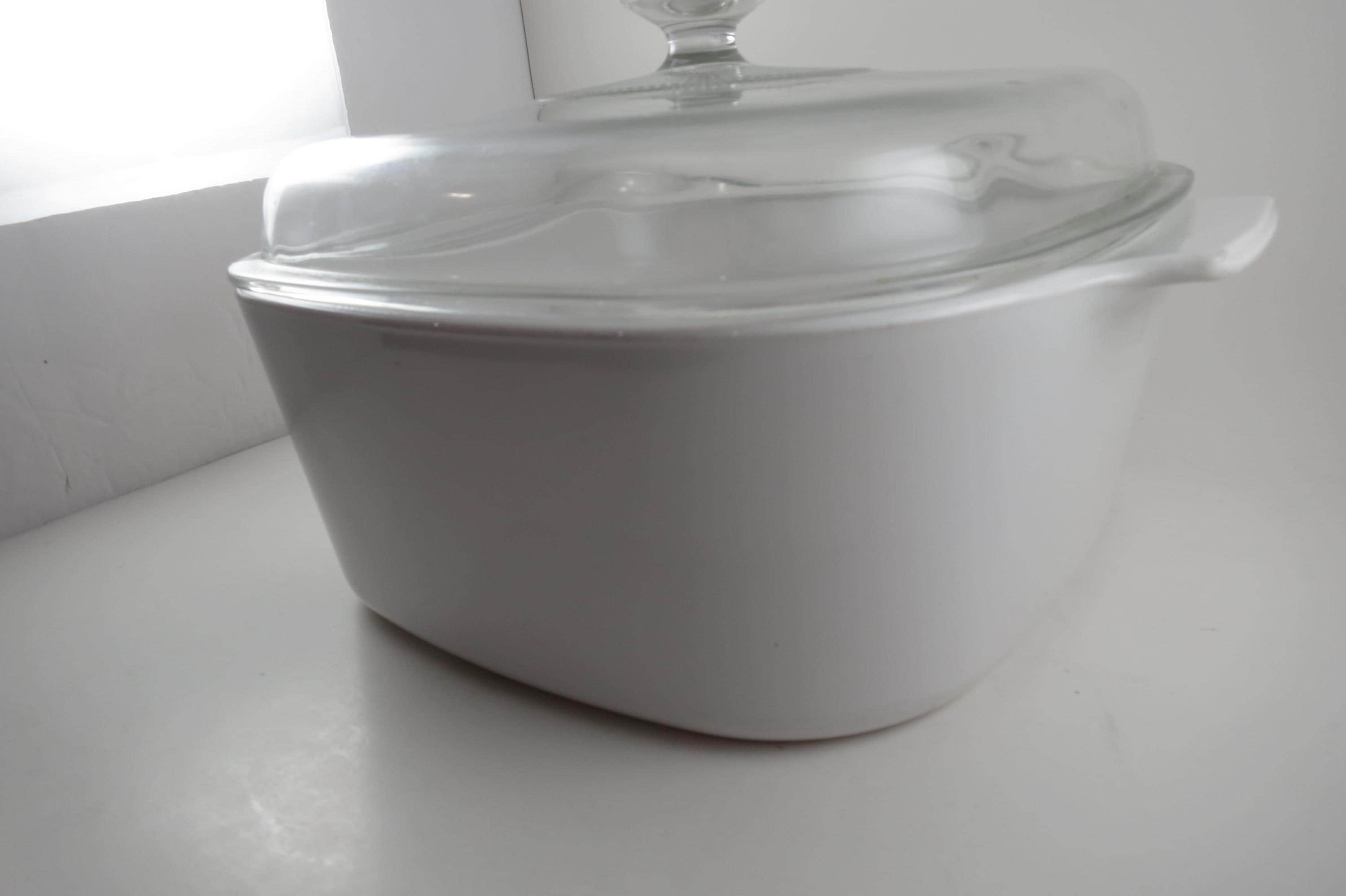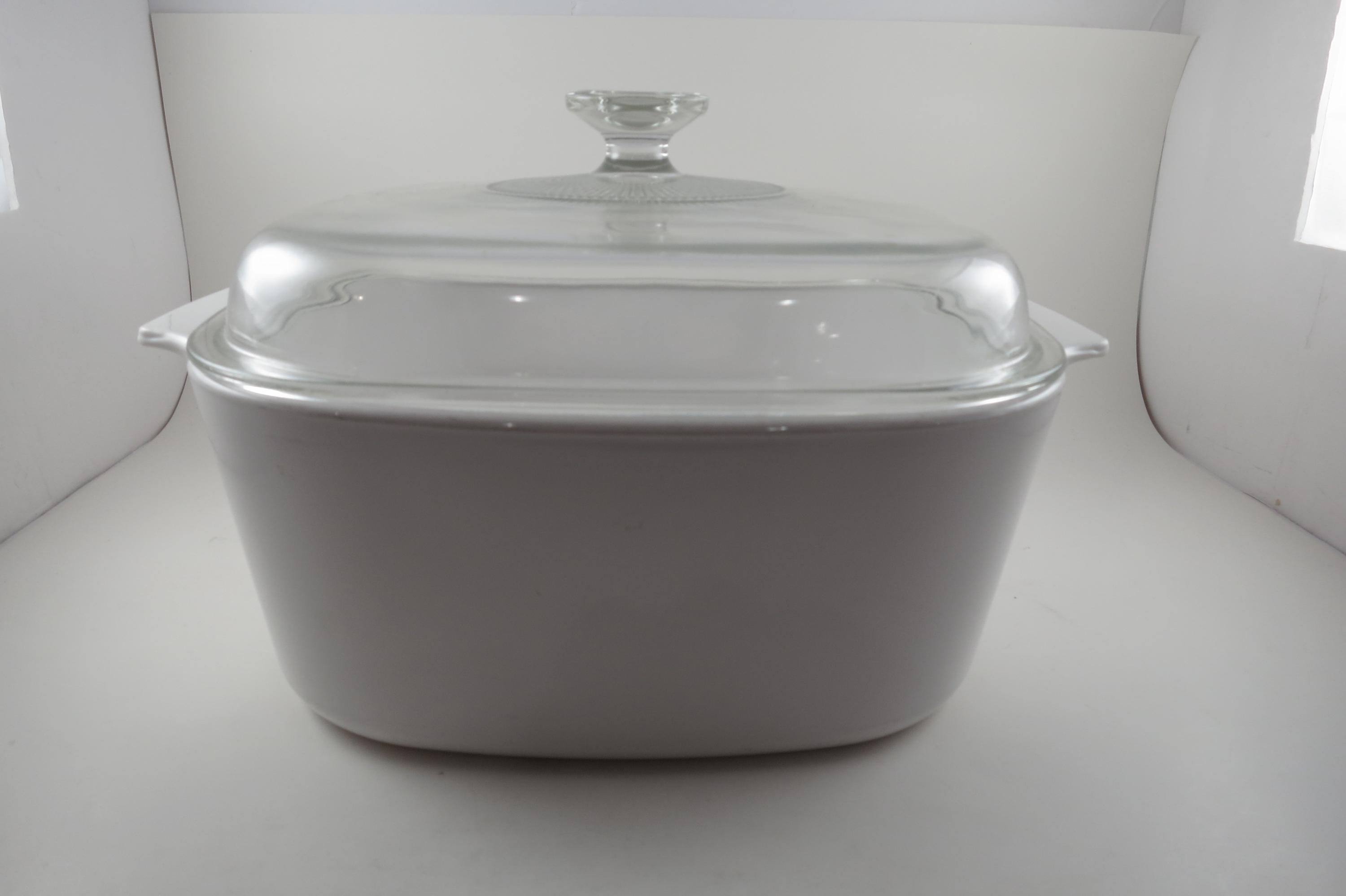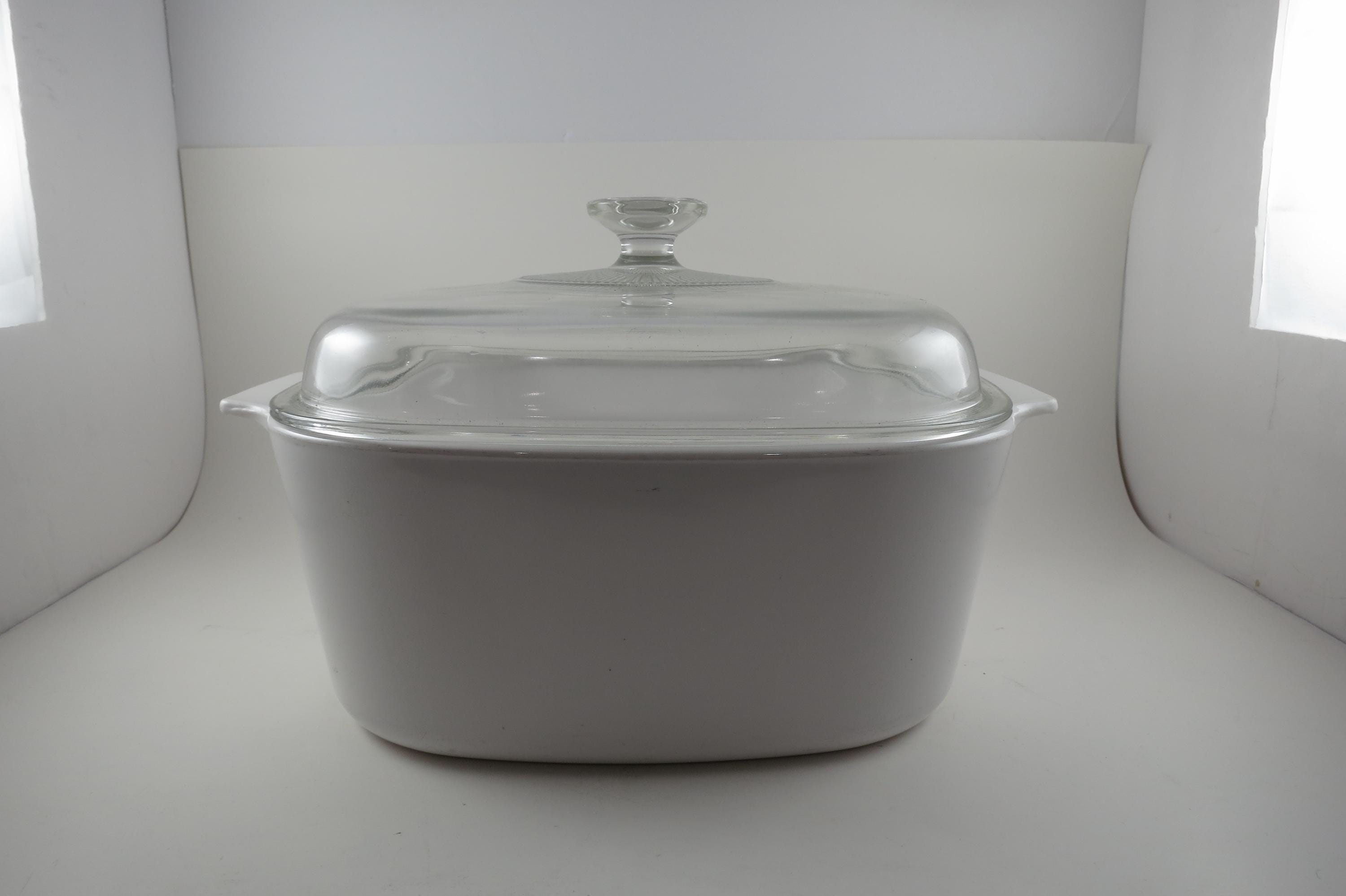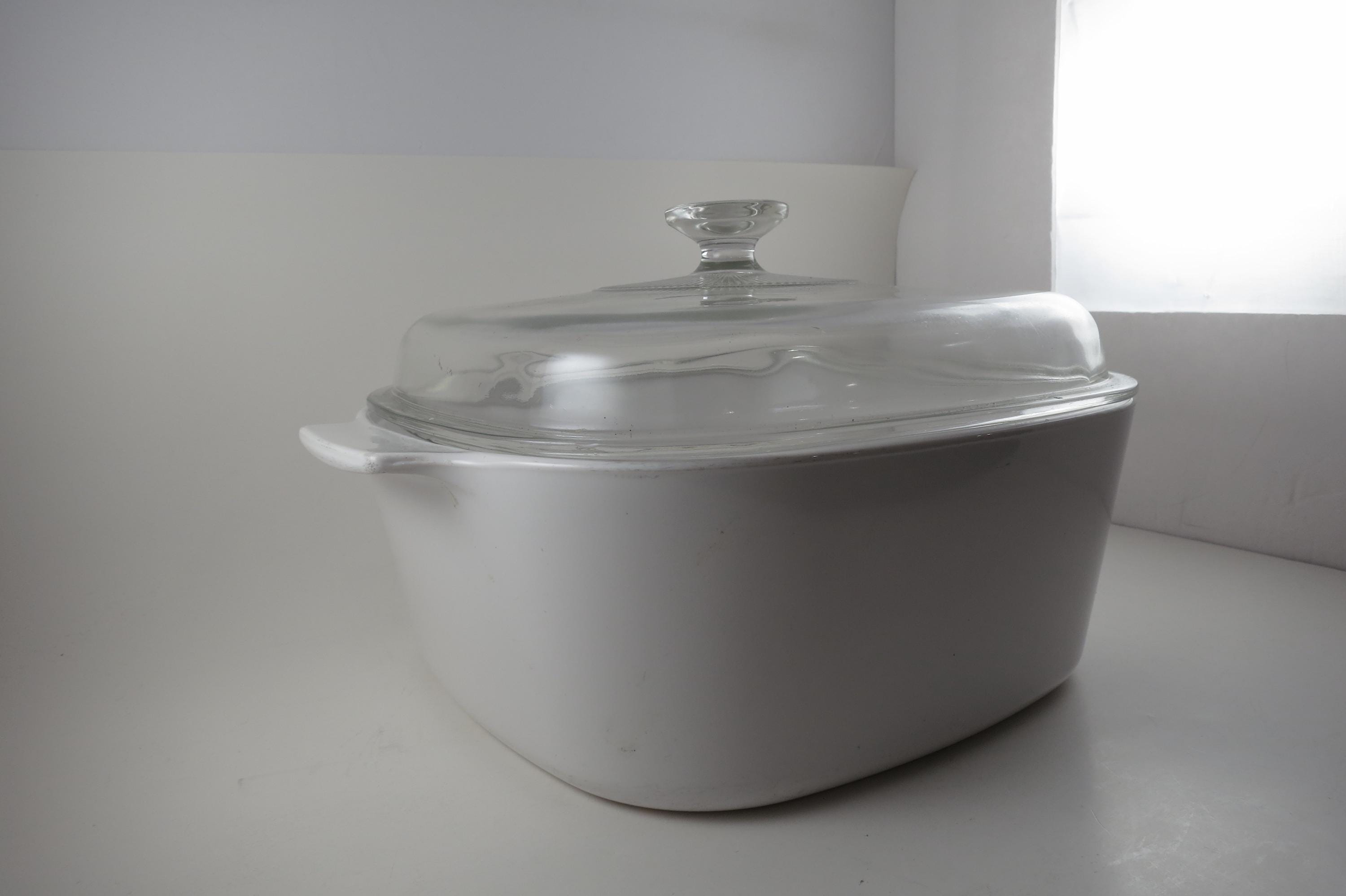 Vintage Corning Ware Dutch Oven: 5 Quart Liter All/Just White with Glass Lid. Large 5 Quart Dutch Oven, complete with the original glass lid. Shows light use wear. Ready to keep using or display!