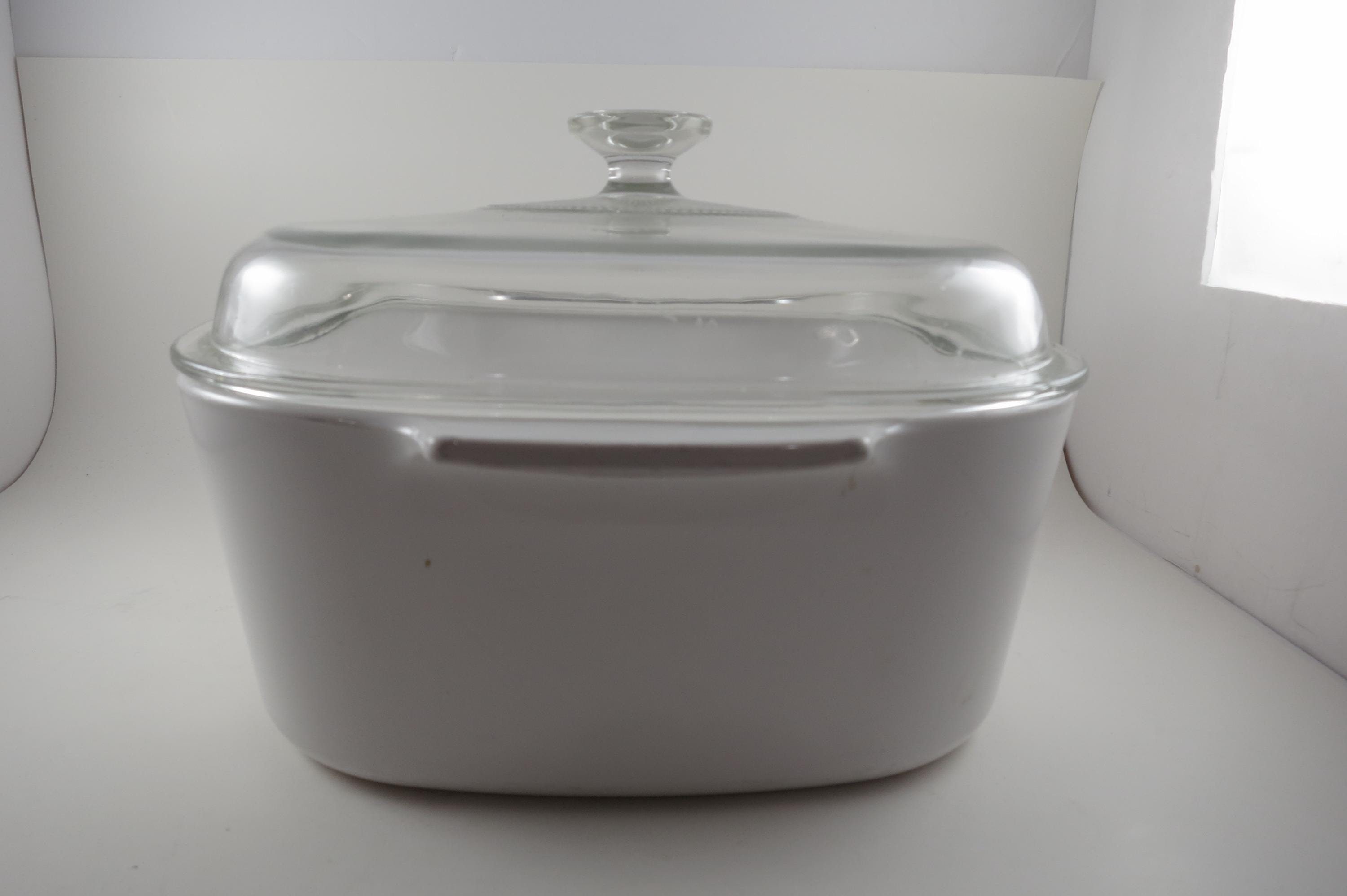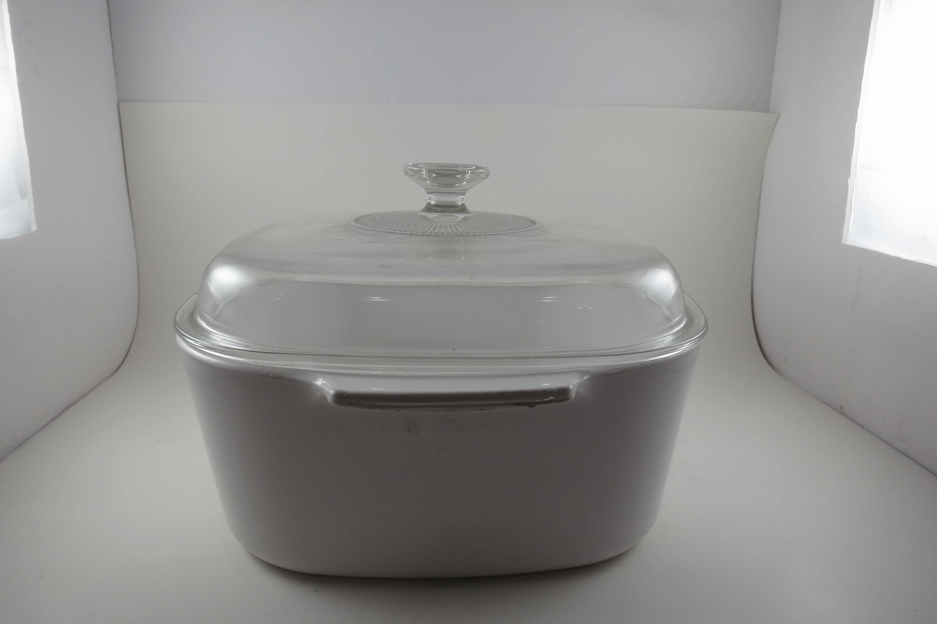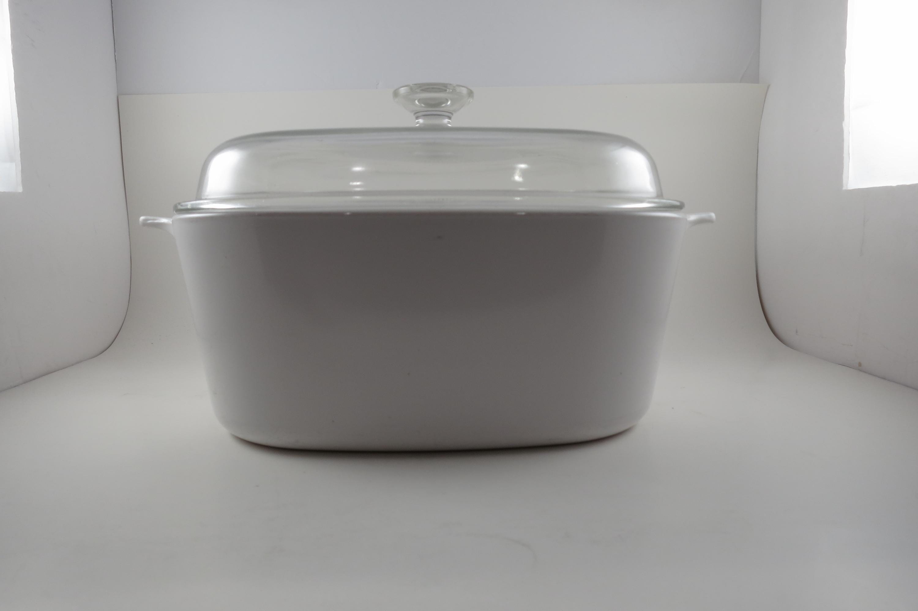 Vintage Corning Ware Dutch Oven: 5 Quart Liter All/Just White with Glass Lid. Large 5 Quart Dutch Oven, complete with the original glass lid. Shows light use wear. Ready to keep using or display!