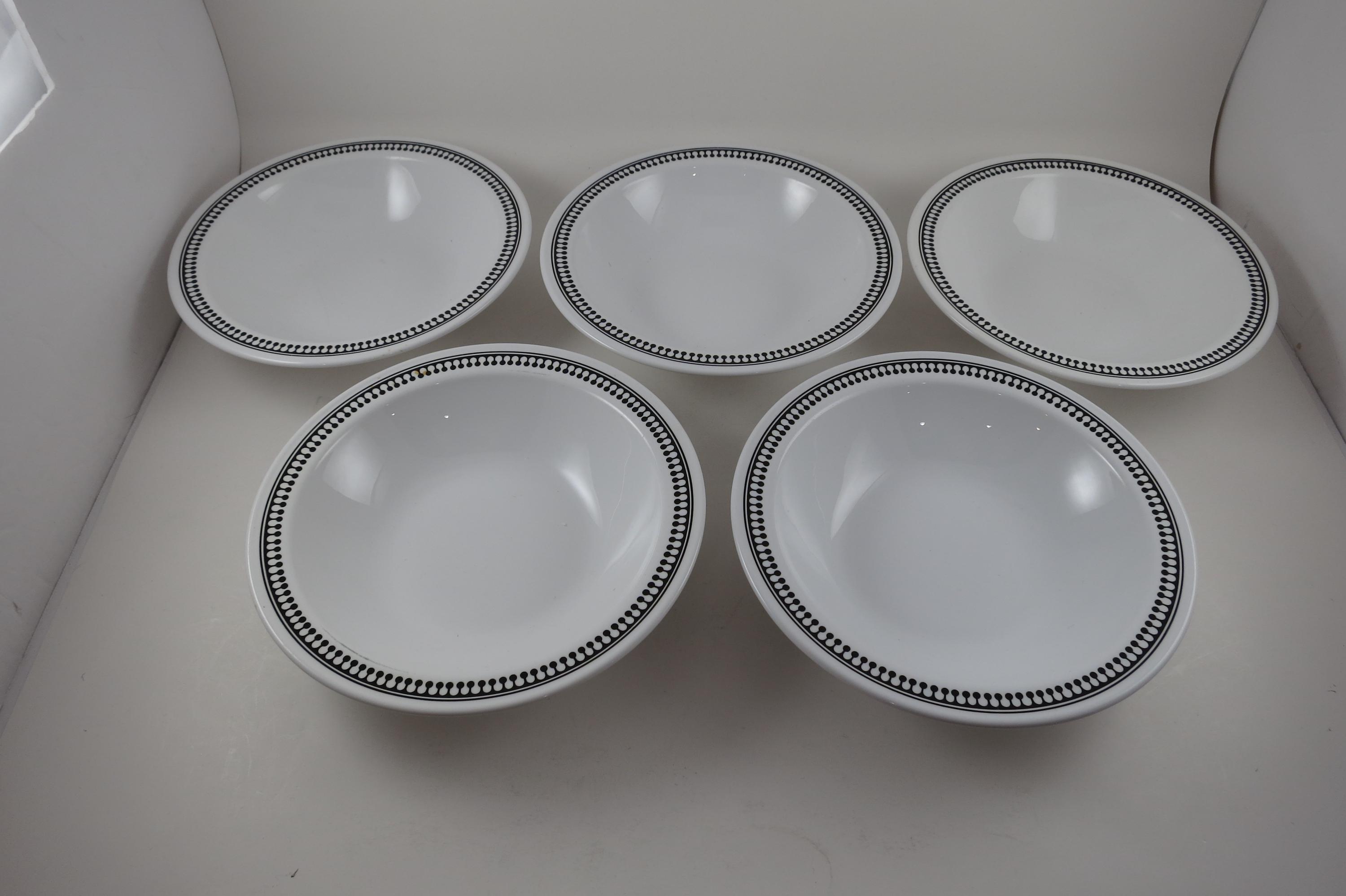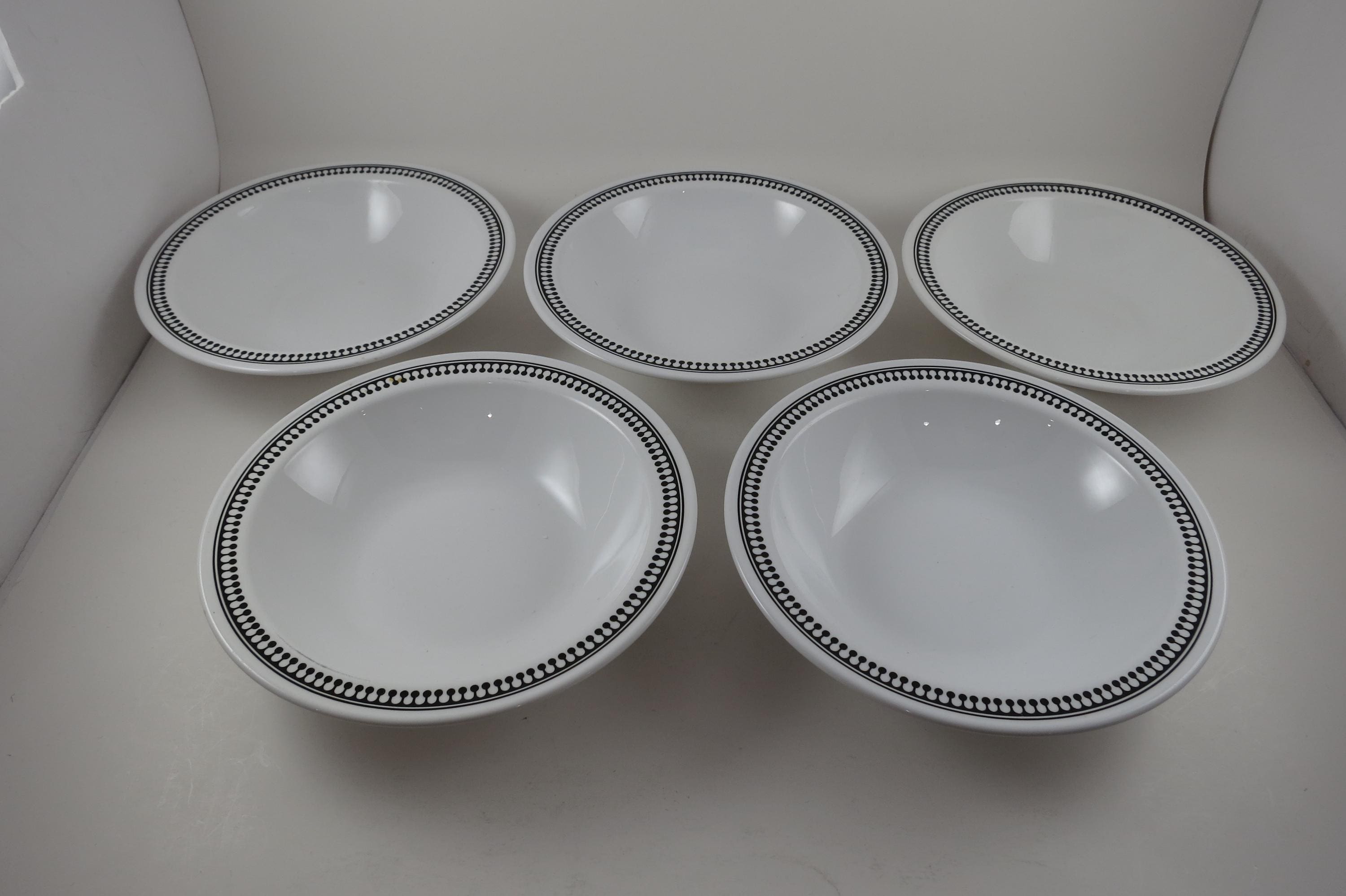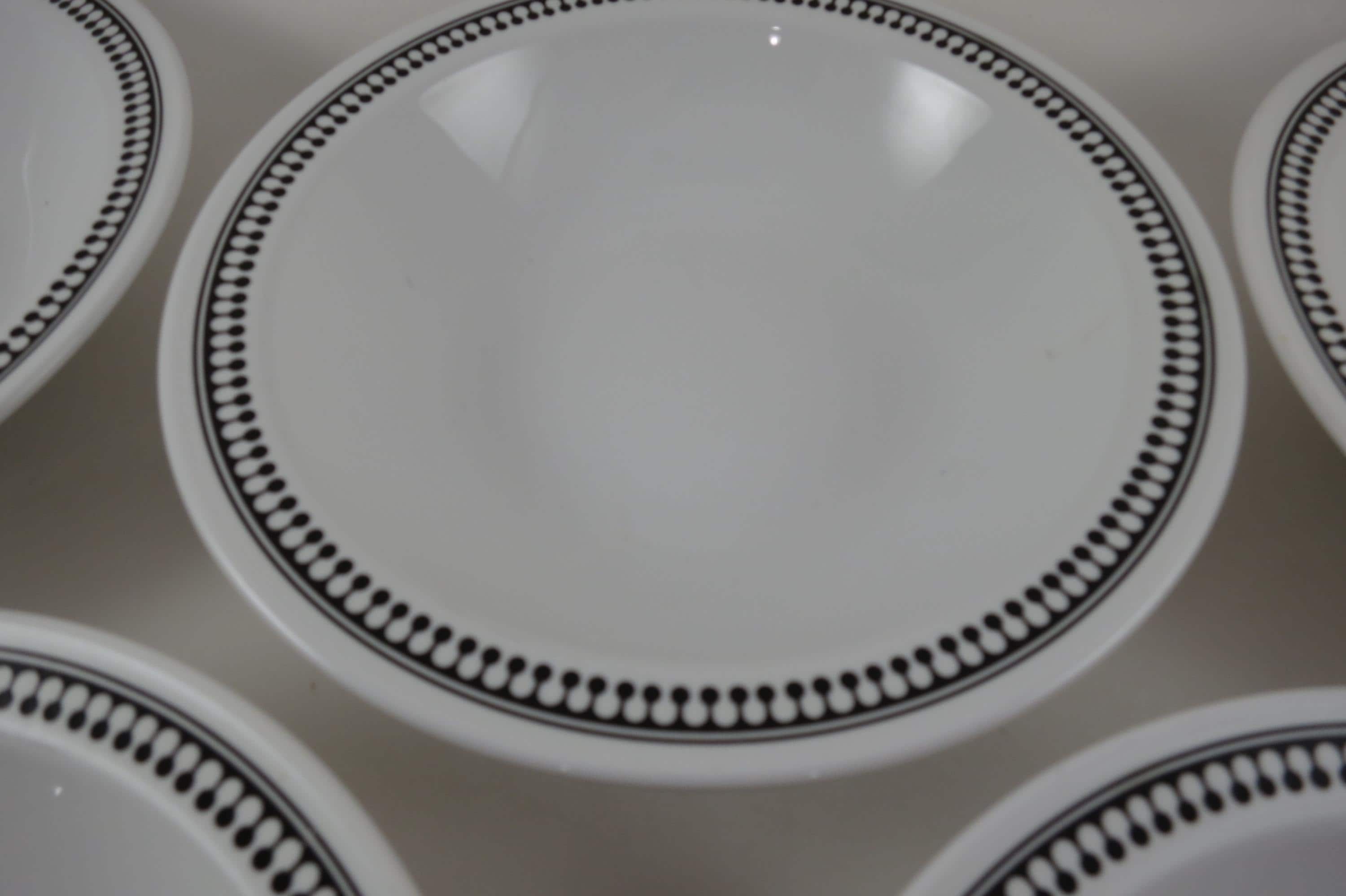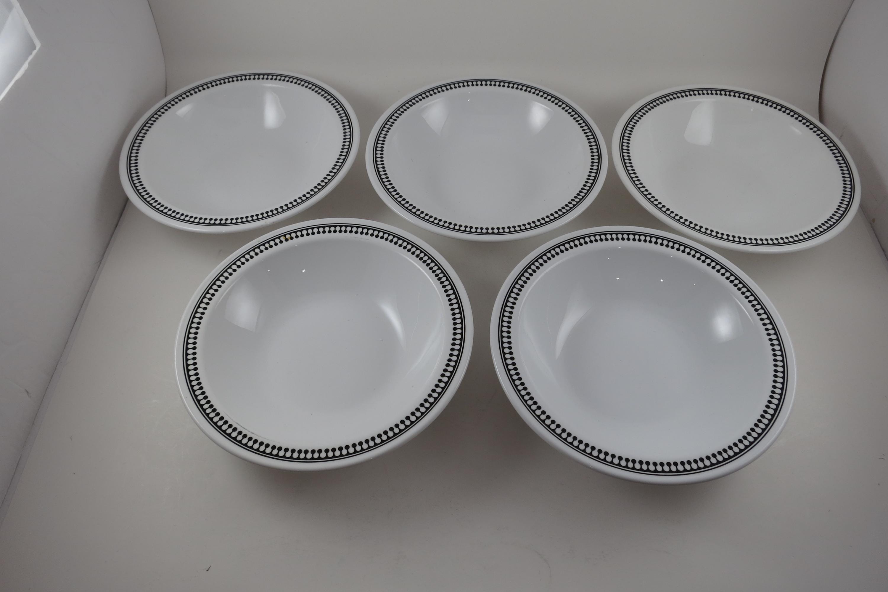 Set of Five Pyroceram Brand Corning Black Knight 7 Inch Soup Bowls. These are in excellent condition with No chips, cracks or damages. Beautiful Pattern! Listing is for a set of five 7 Inch Soup Bowls.