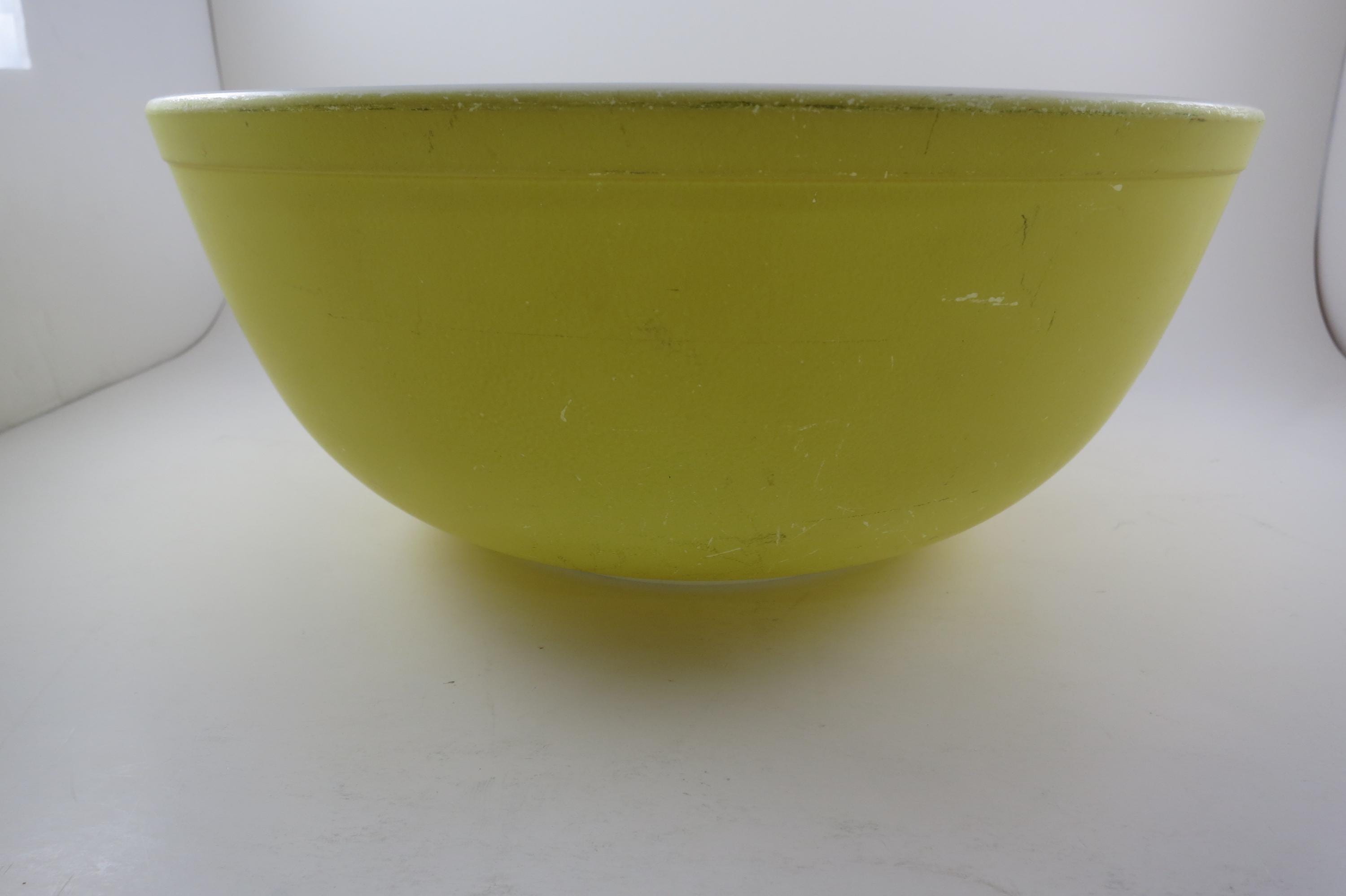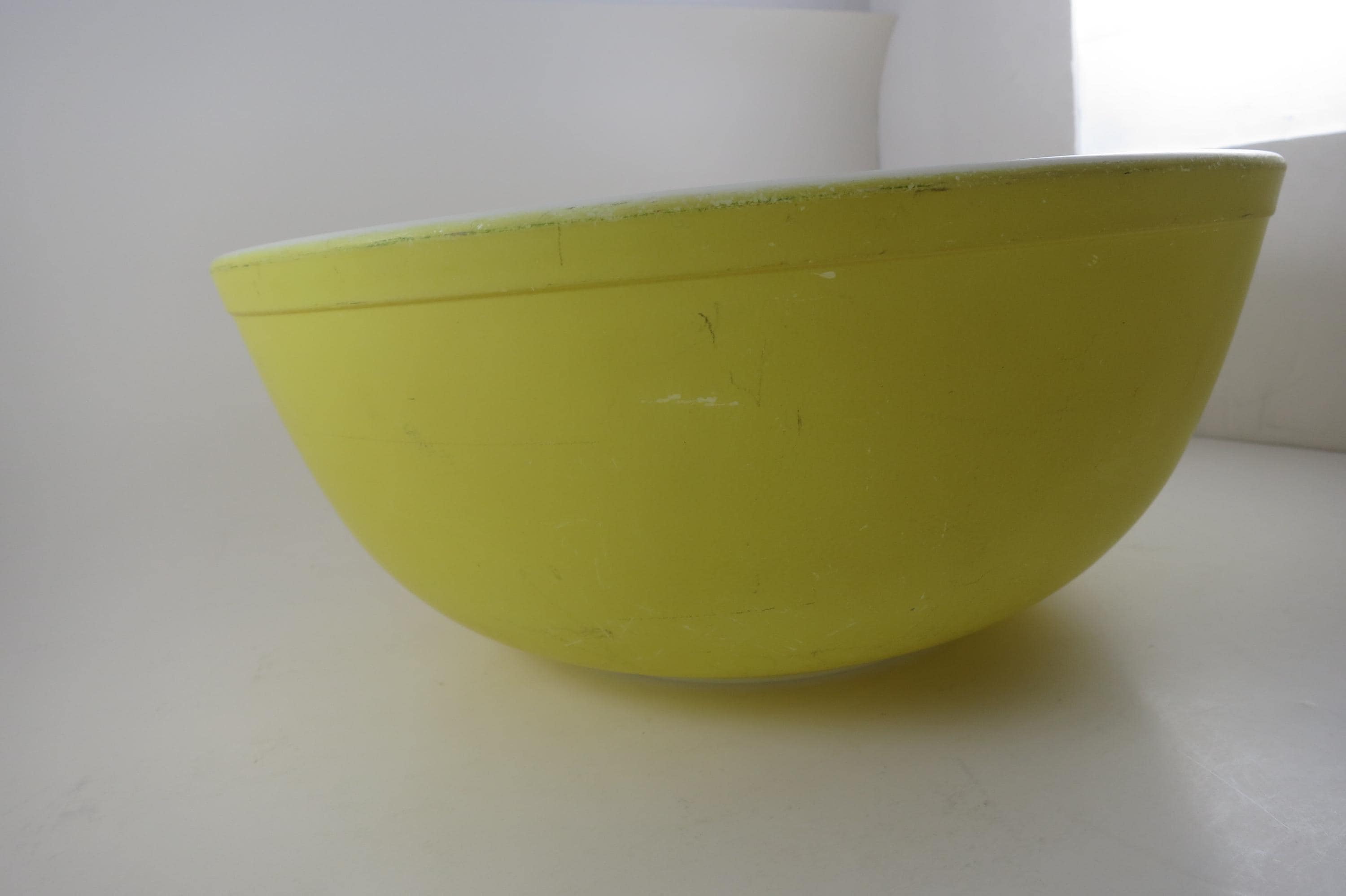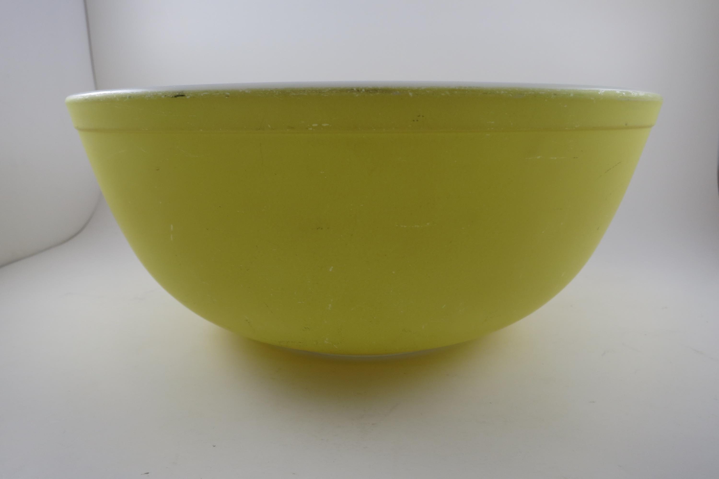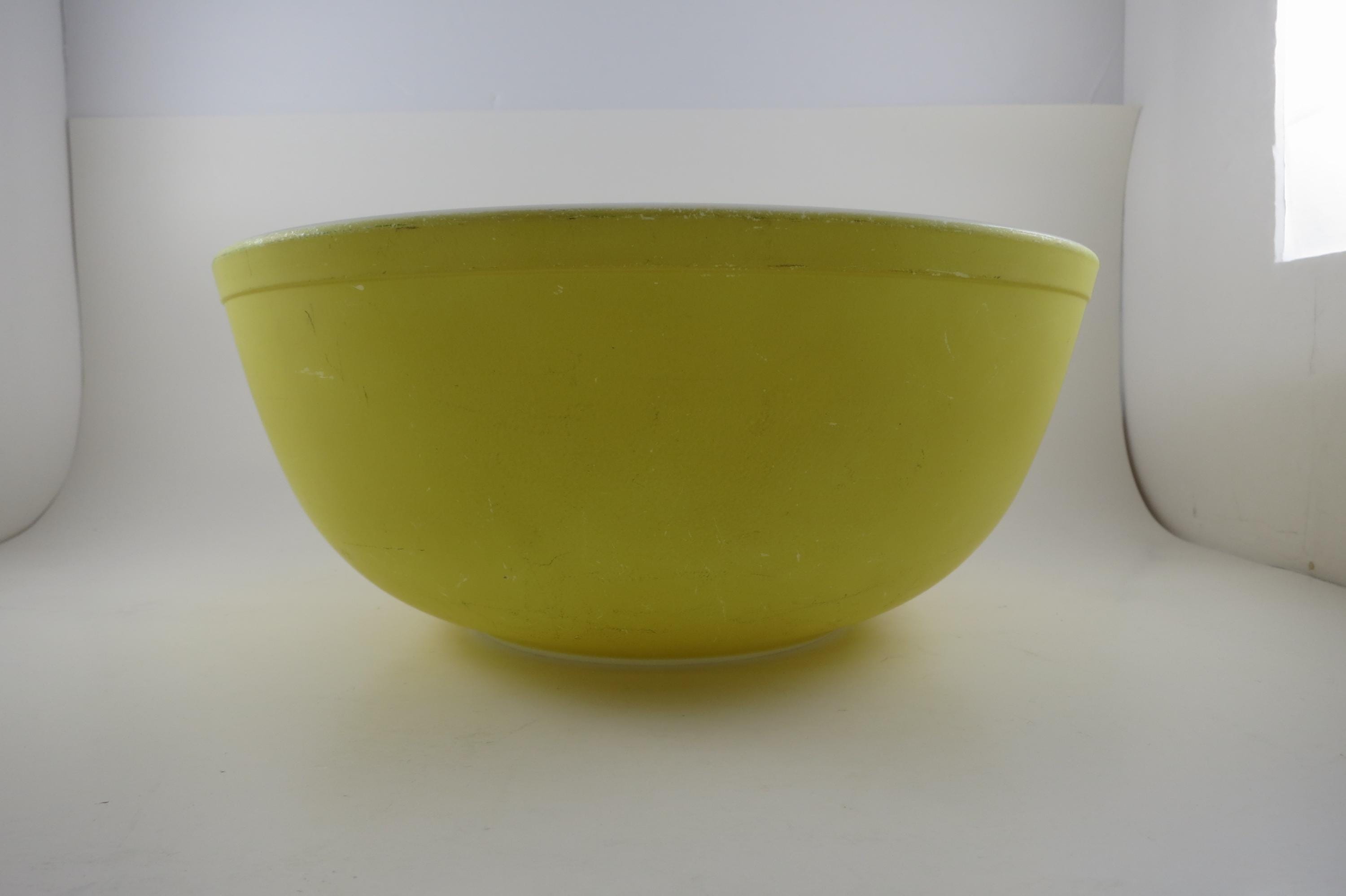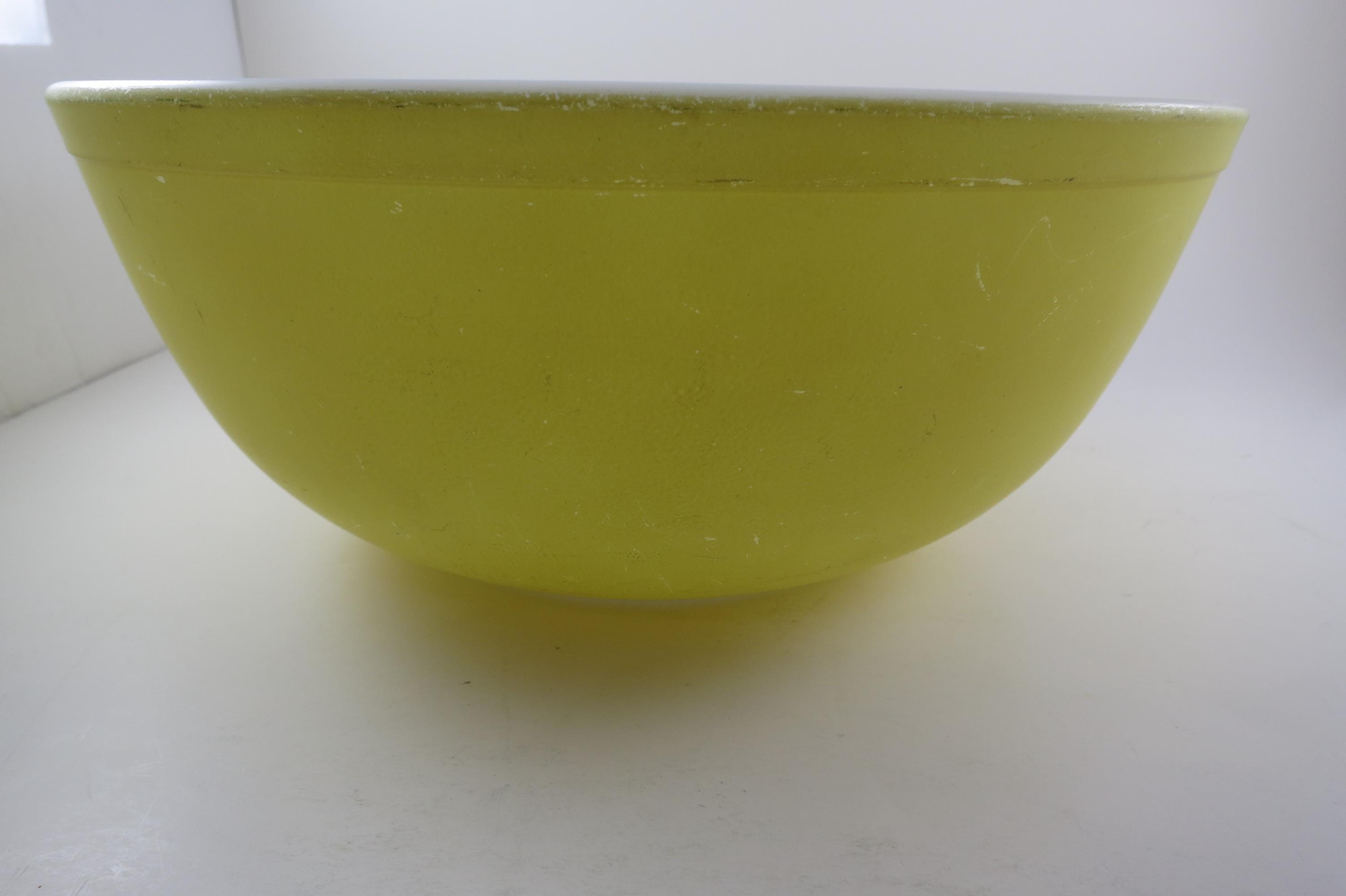 Yellow Pyrex Mixing Bowl 4 Quart 404 Very Good Condition. Has a few wear spots from normal use. Beautiful Large Yellow Bowl!