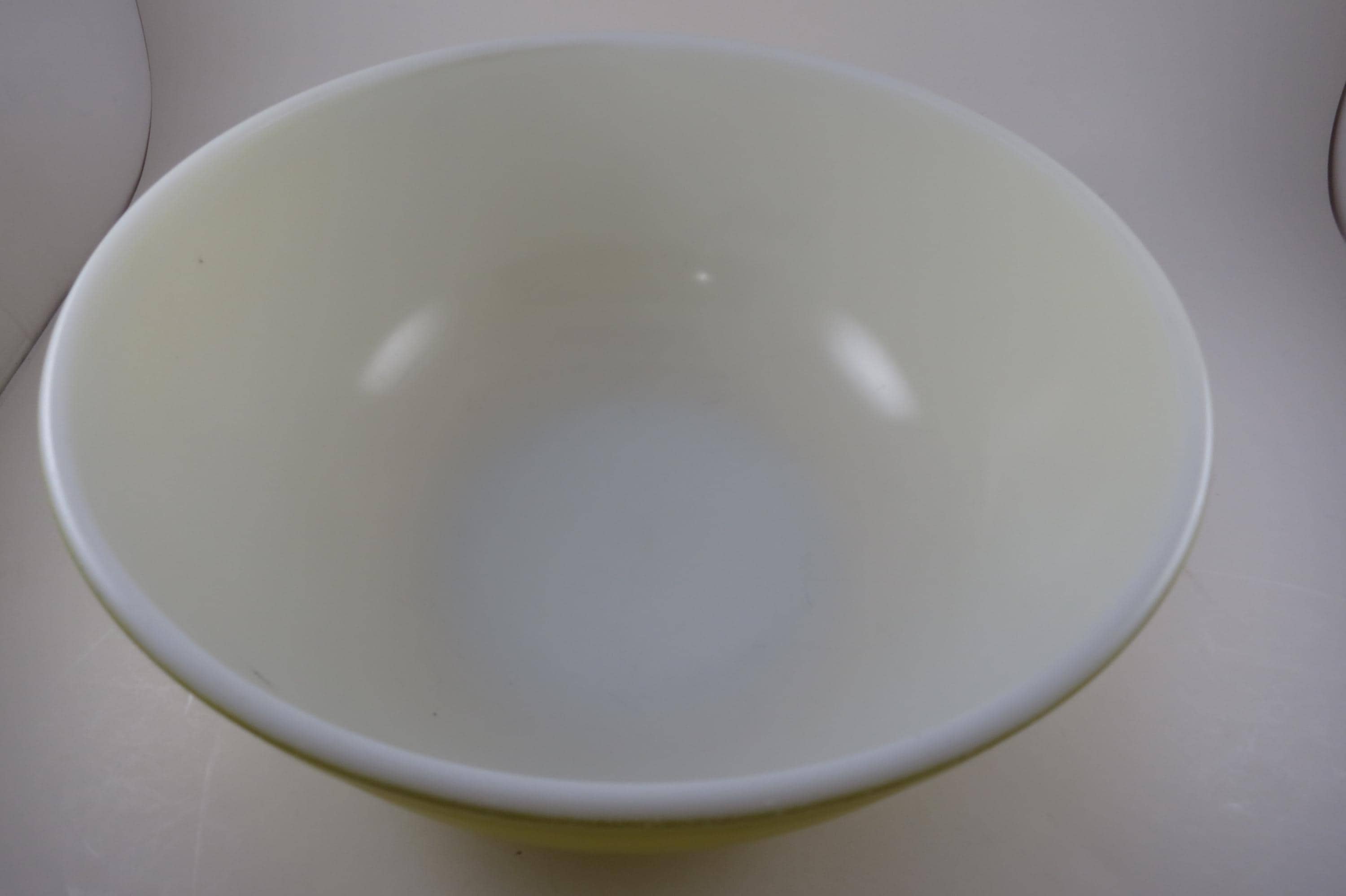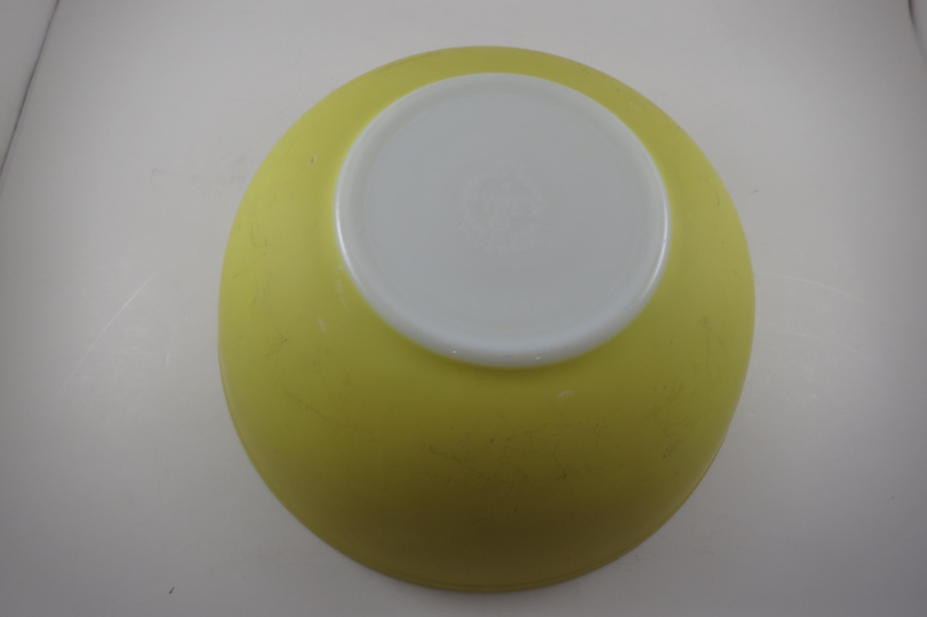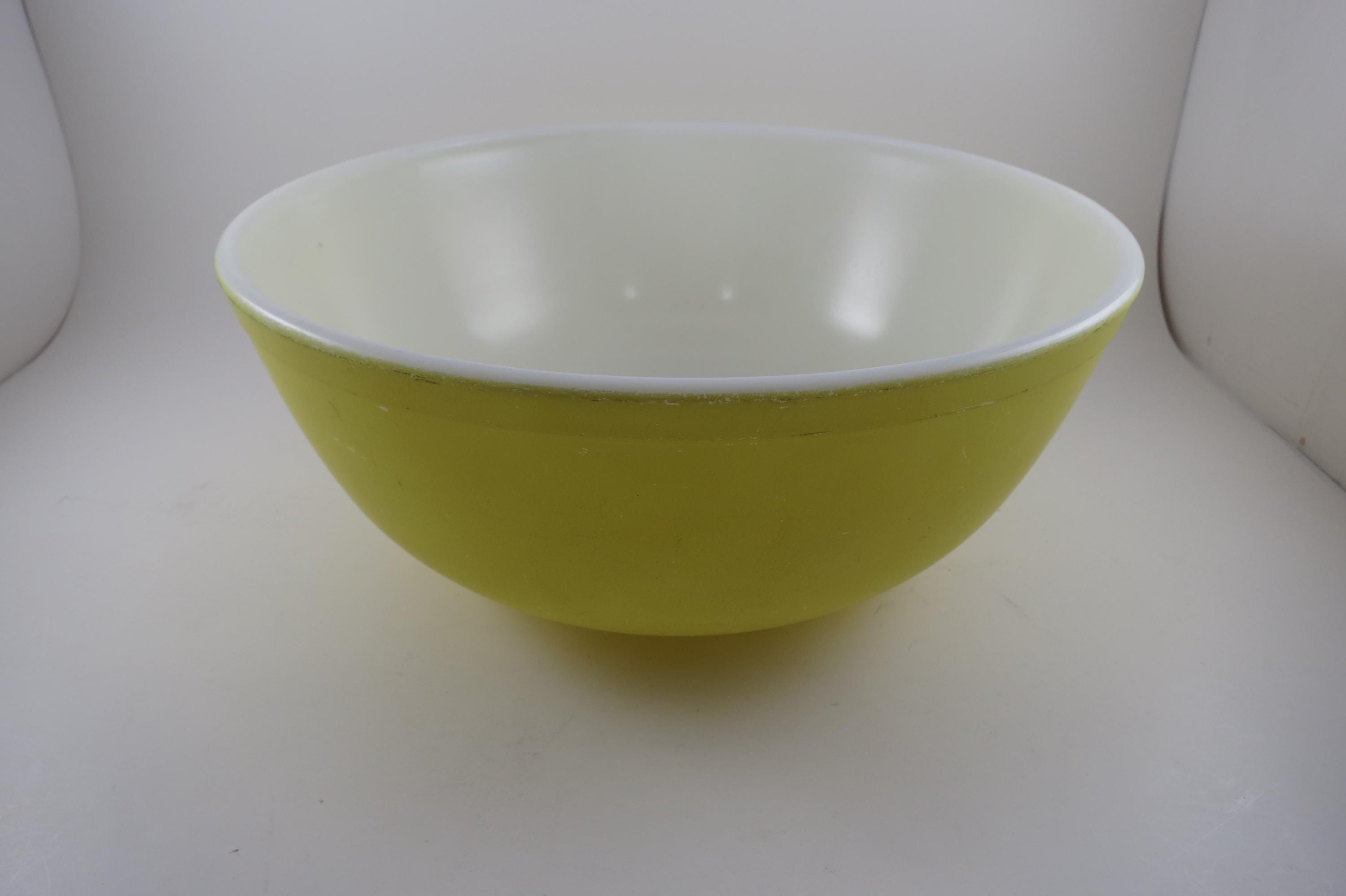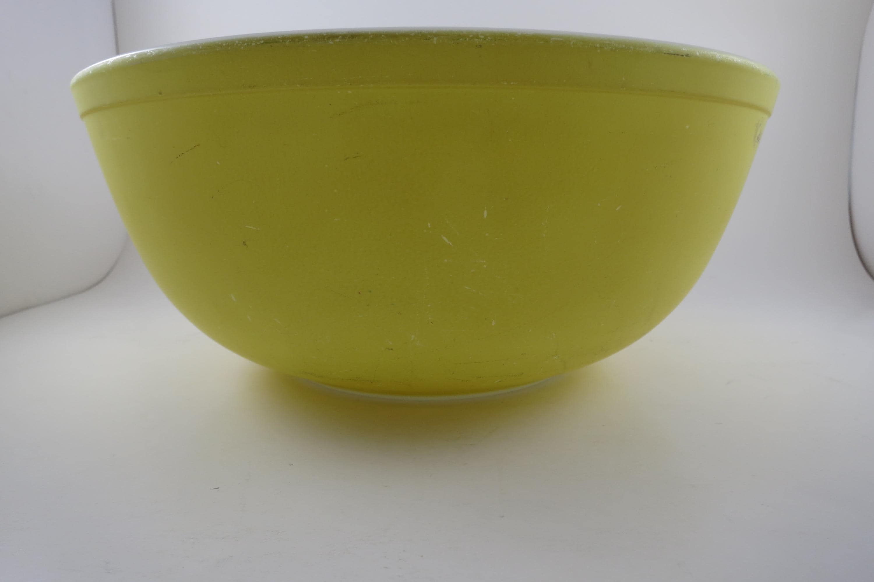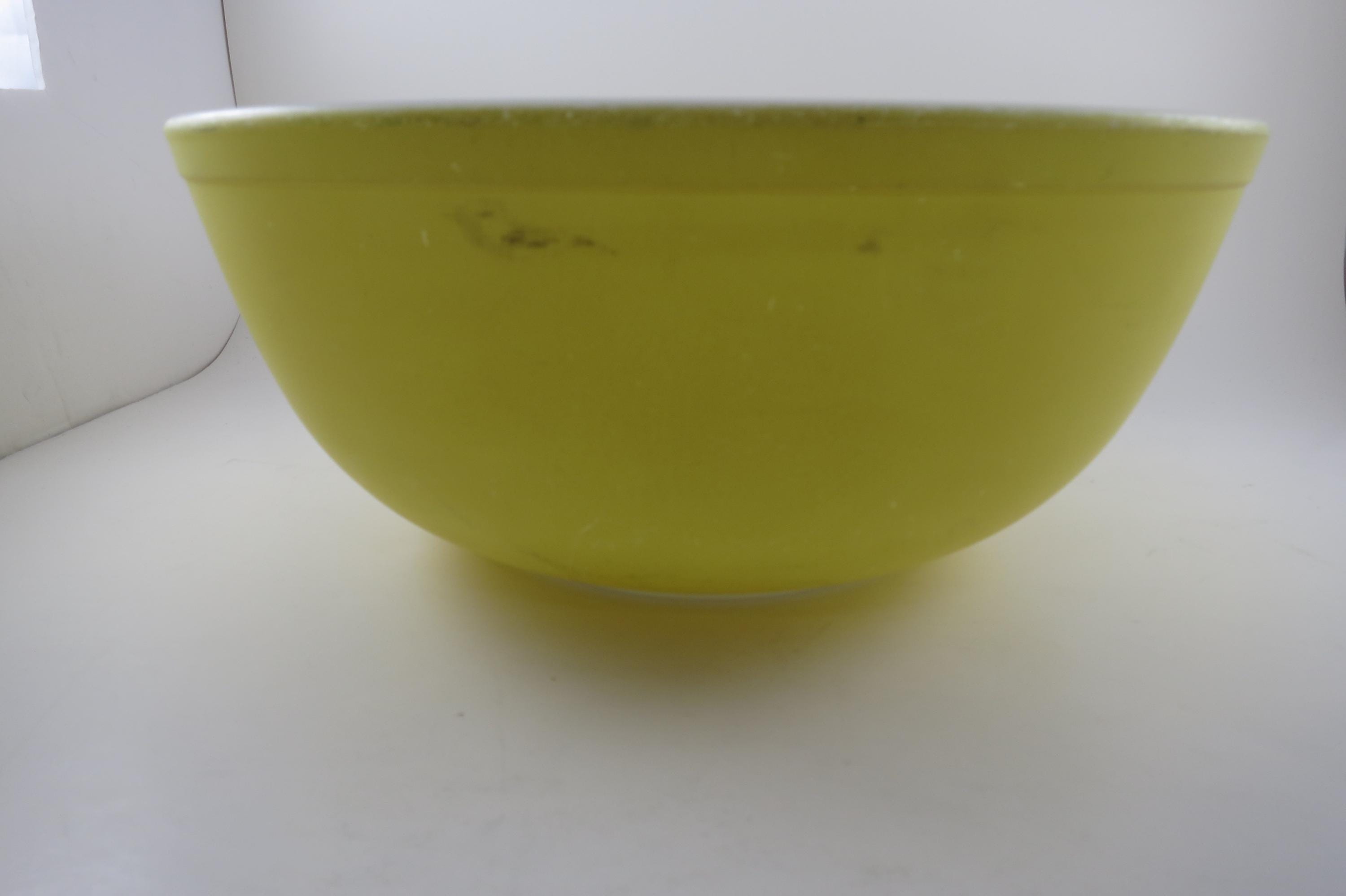 Yellow Pyrex Mixing Bowl 4 Quart 404 Very Good Condition. Has a few wear spots from normal use. Beautiful Large Yellow Bowl!