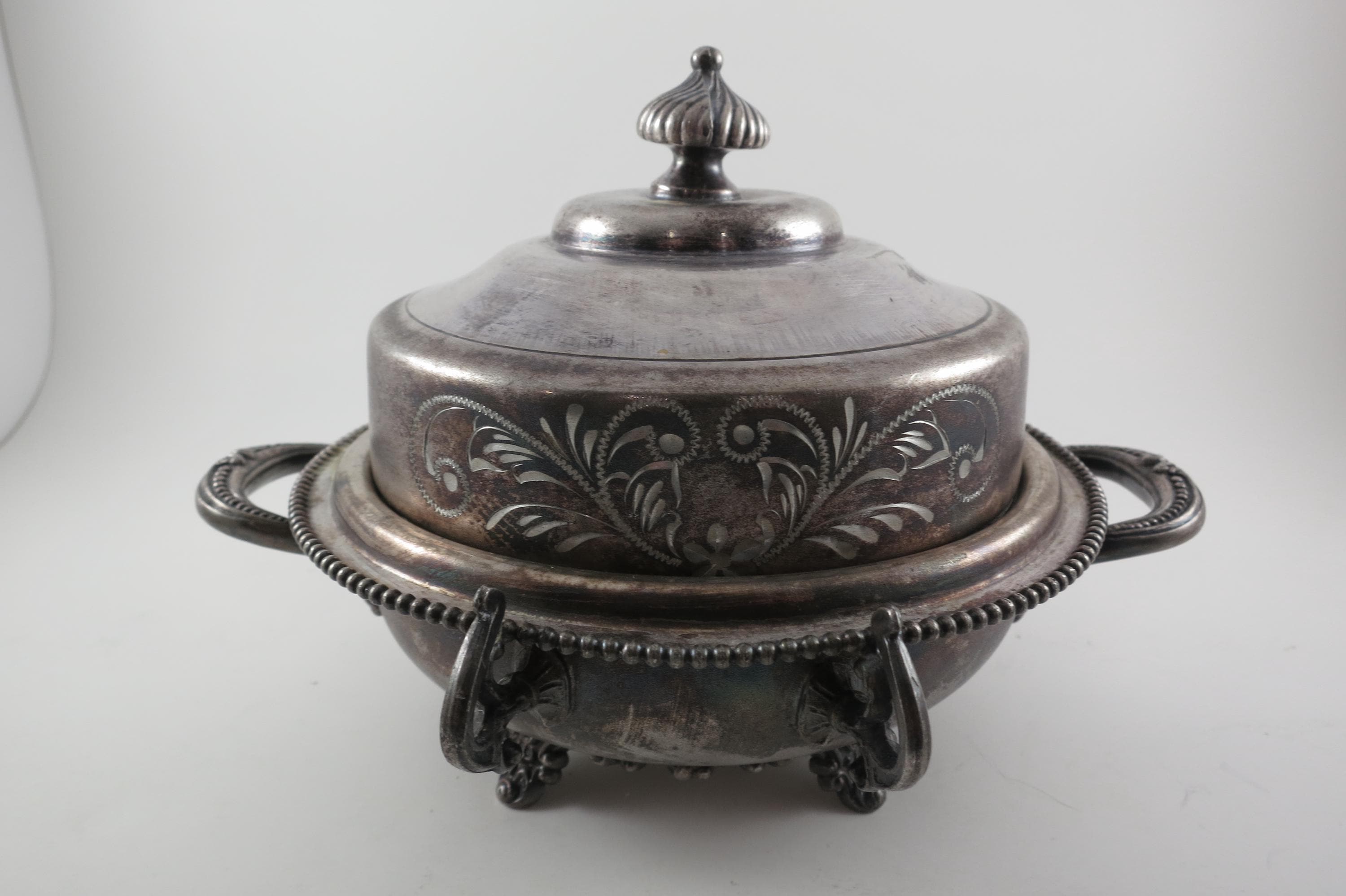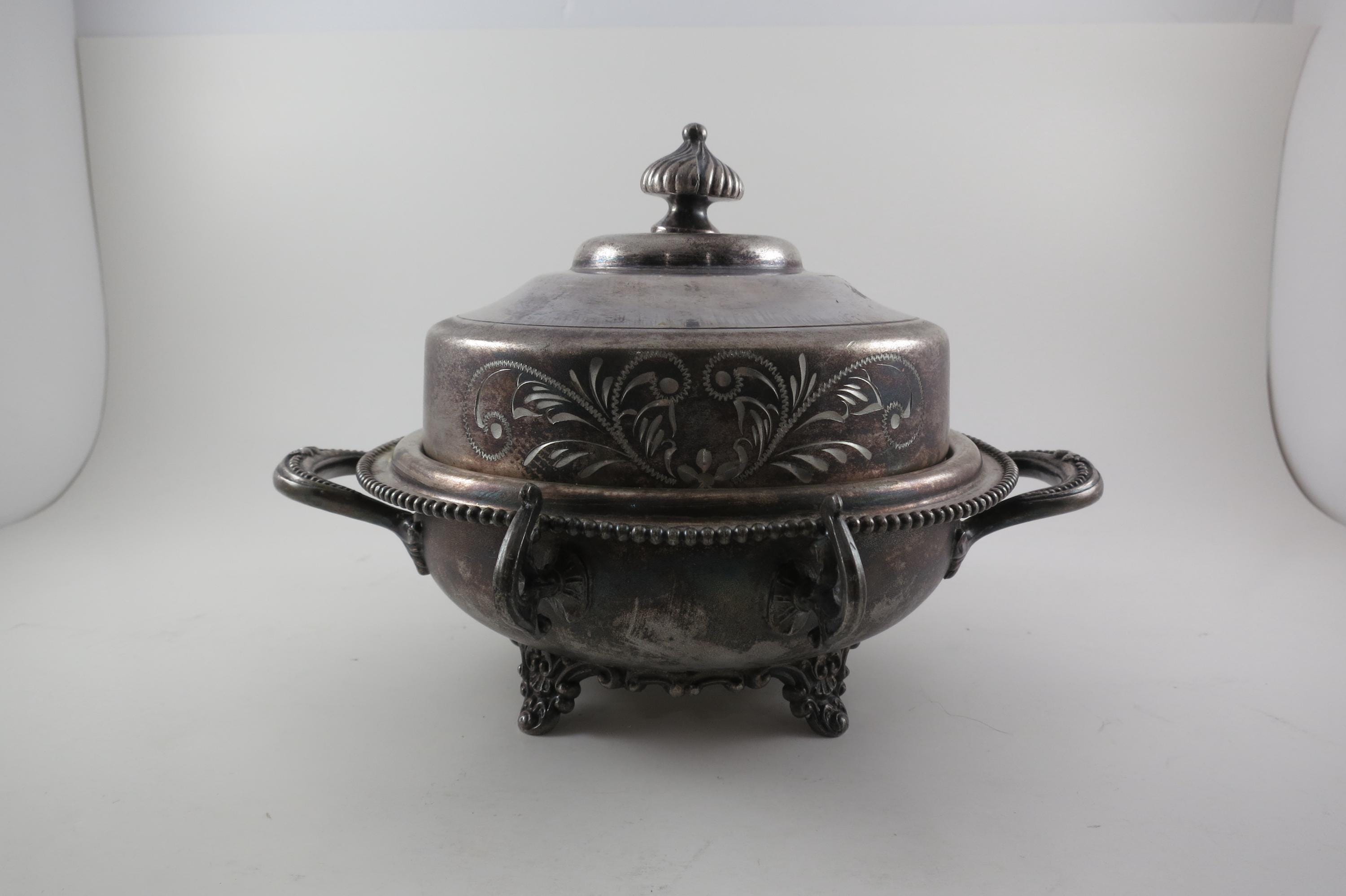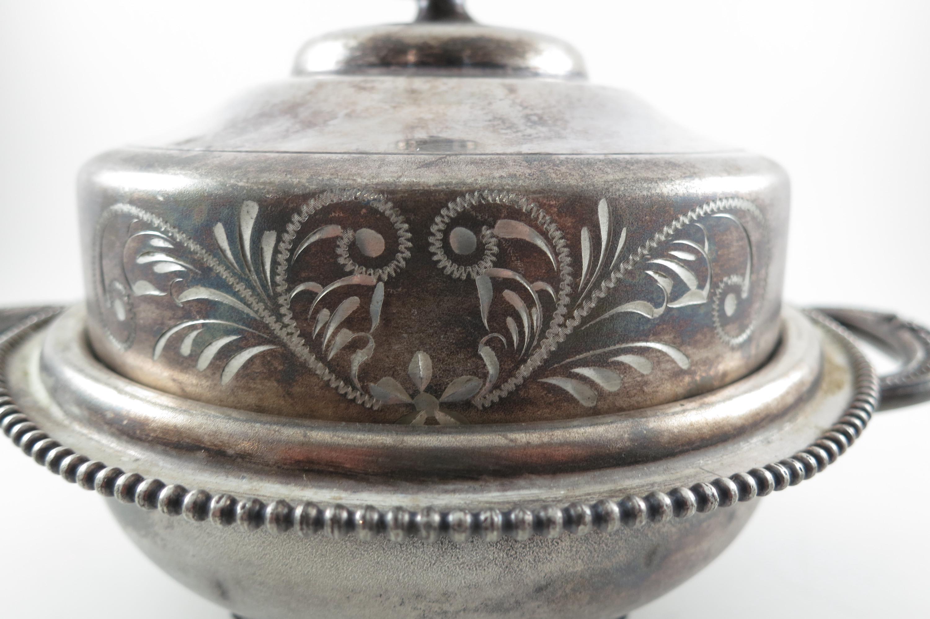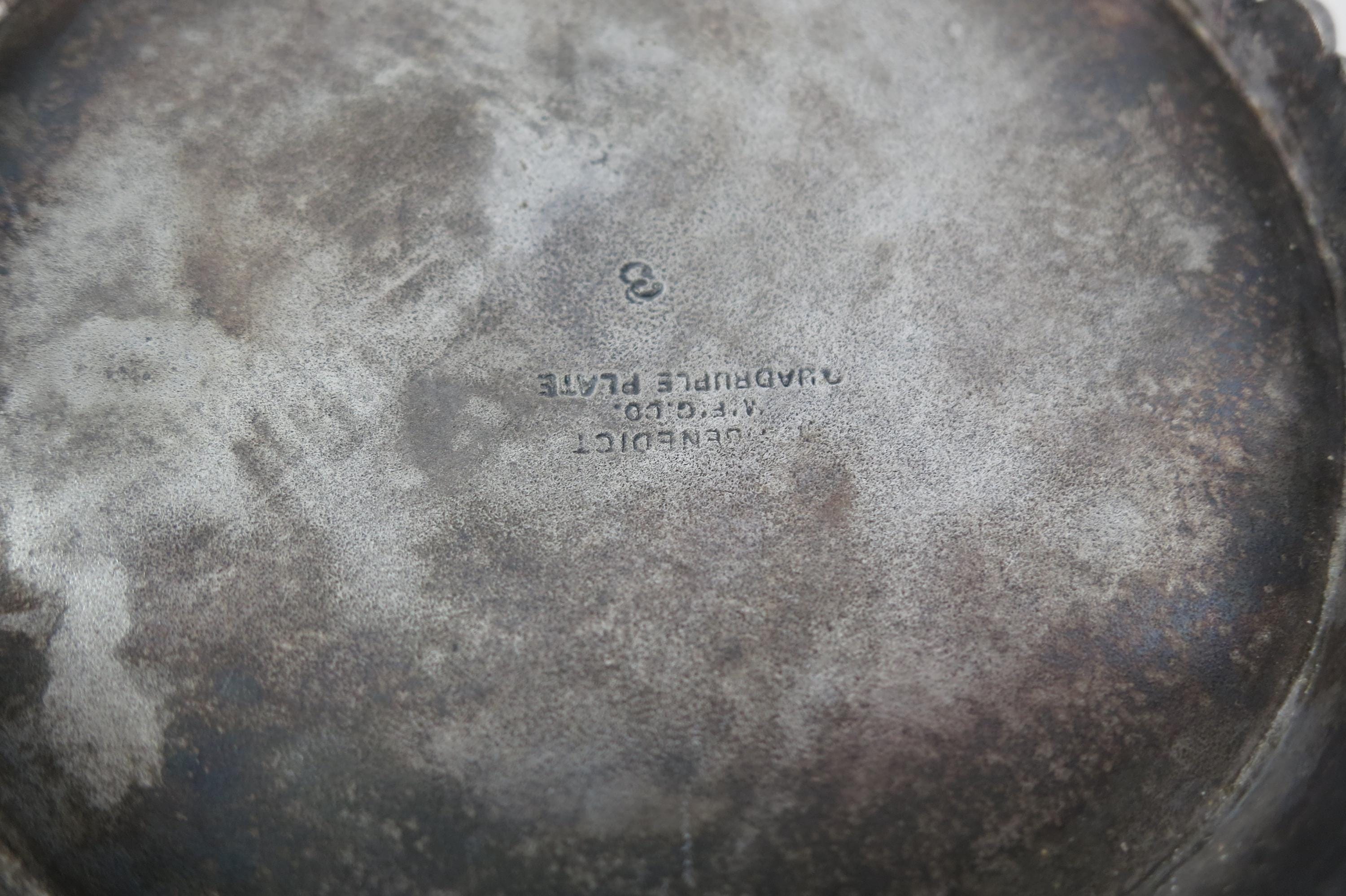 Antique Benedict Quadruple Plate Butter Cooler Bowl w/ Spoon Holders. It is in very good condition but will need a good cleaning/polishing. Measures 7 1/2 inches wide and 6 inches tall.