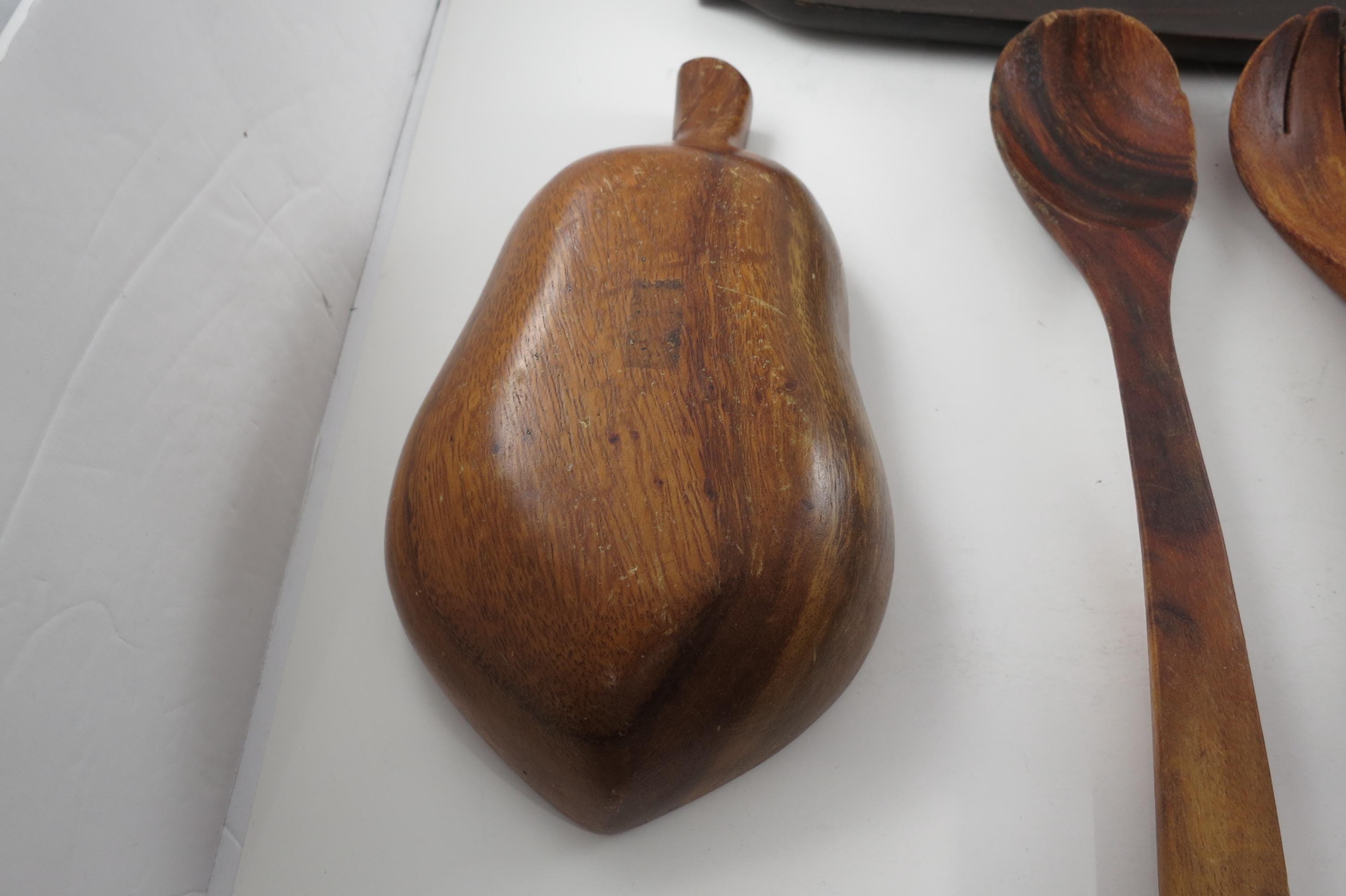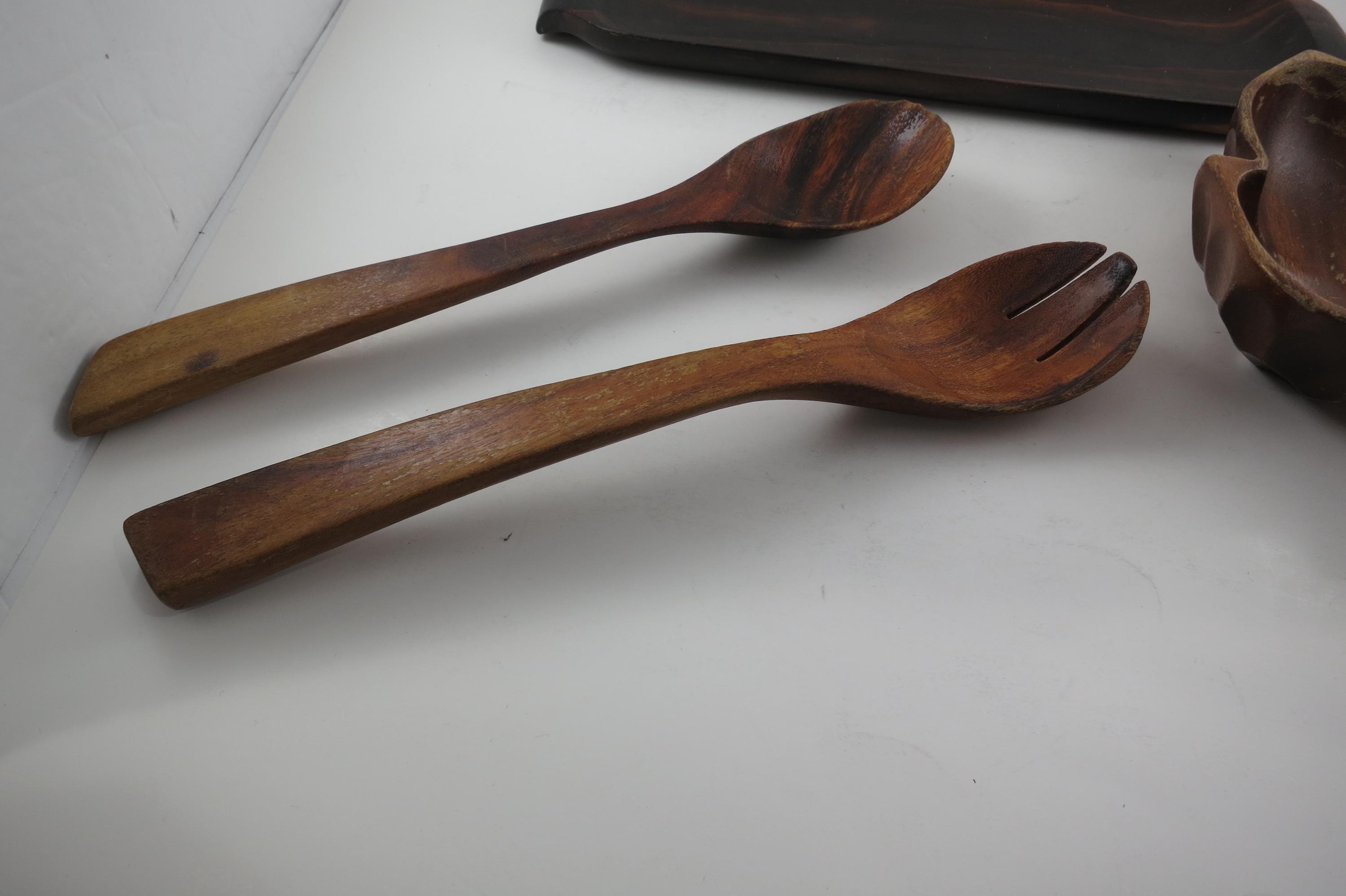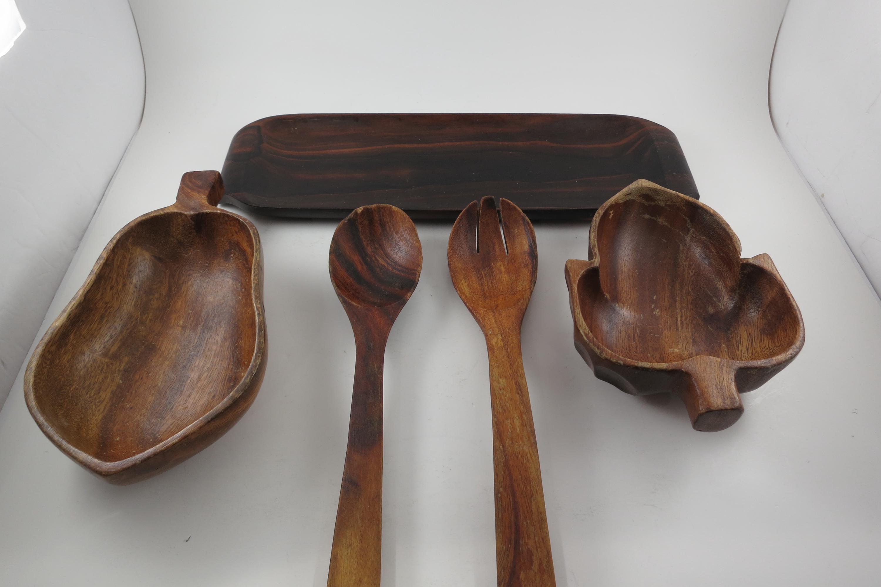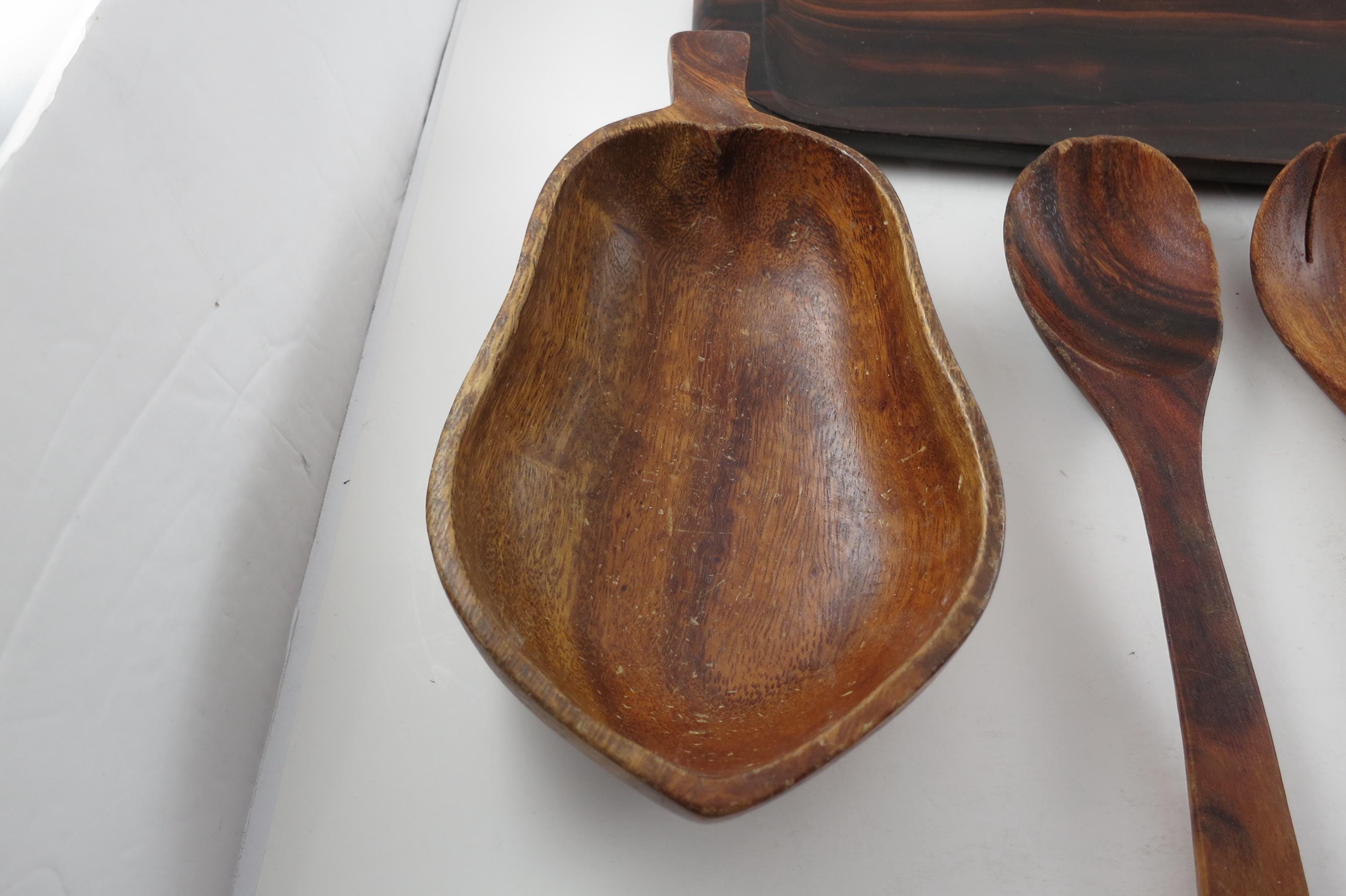 Vintage Monkey Pod Wood Set of 5 Pieces Spoons Nut Shaped Dish Long Tray.