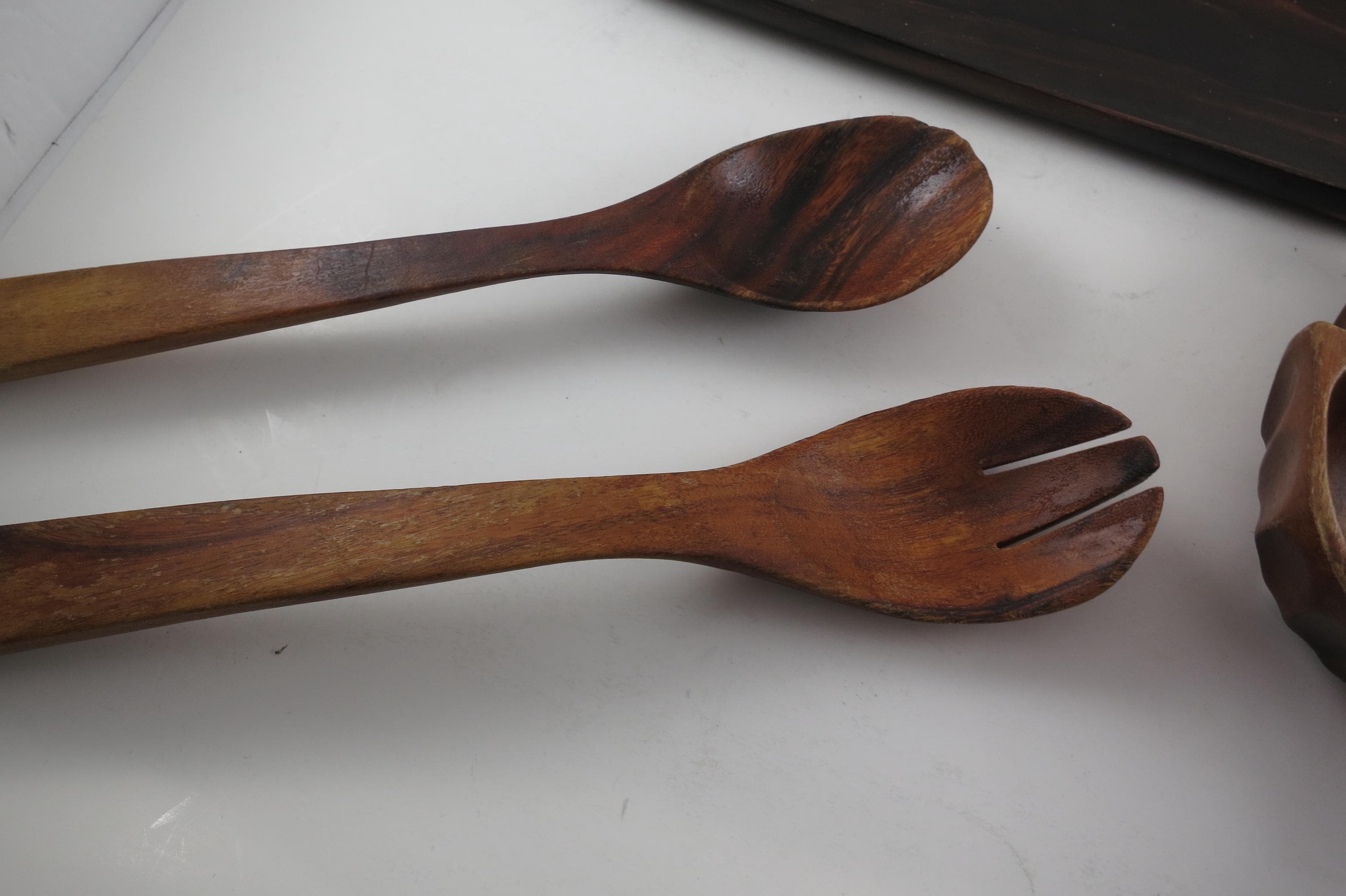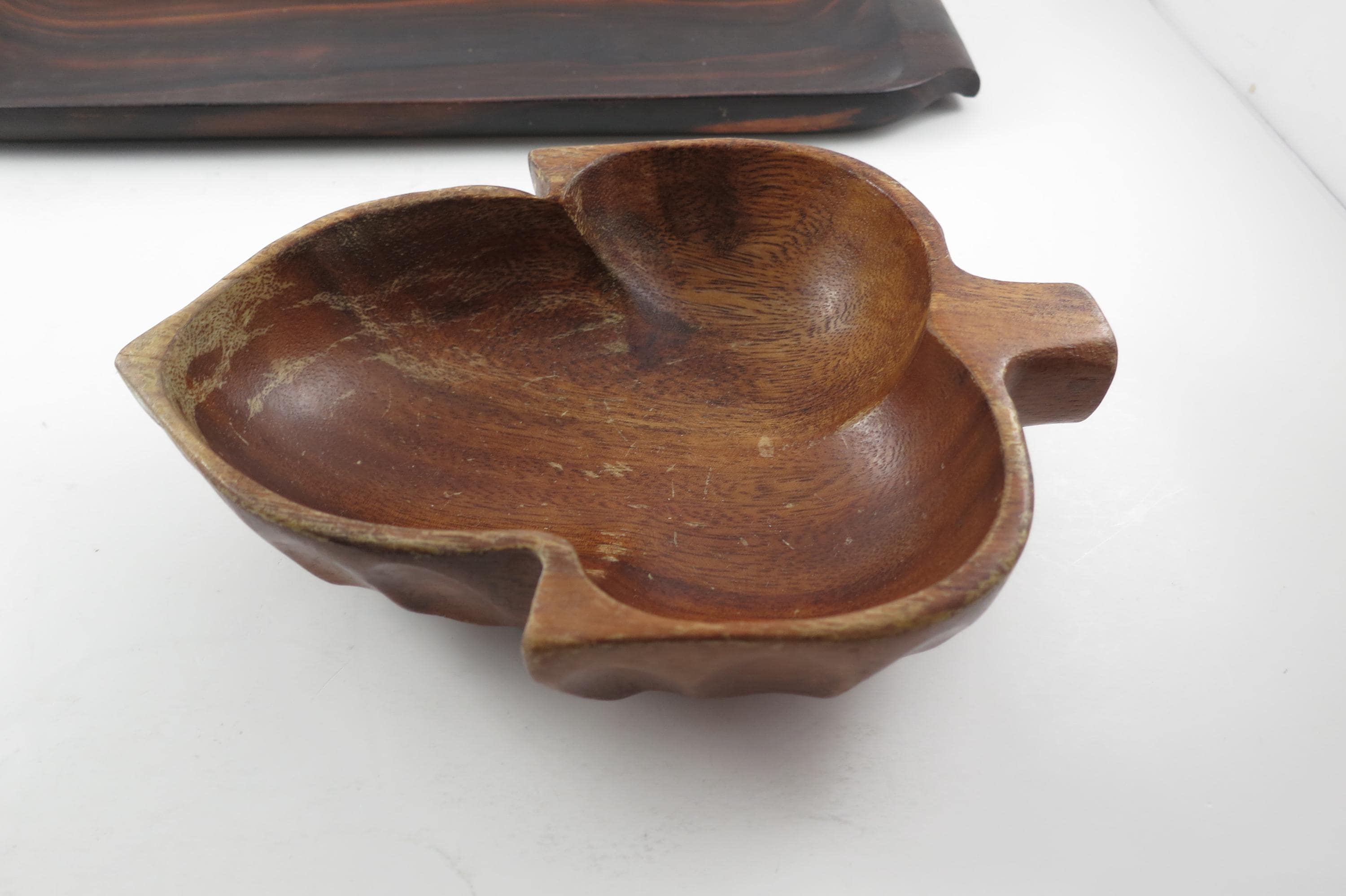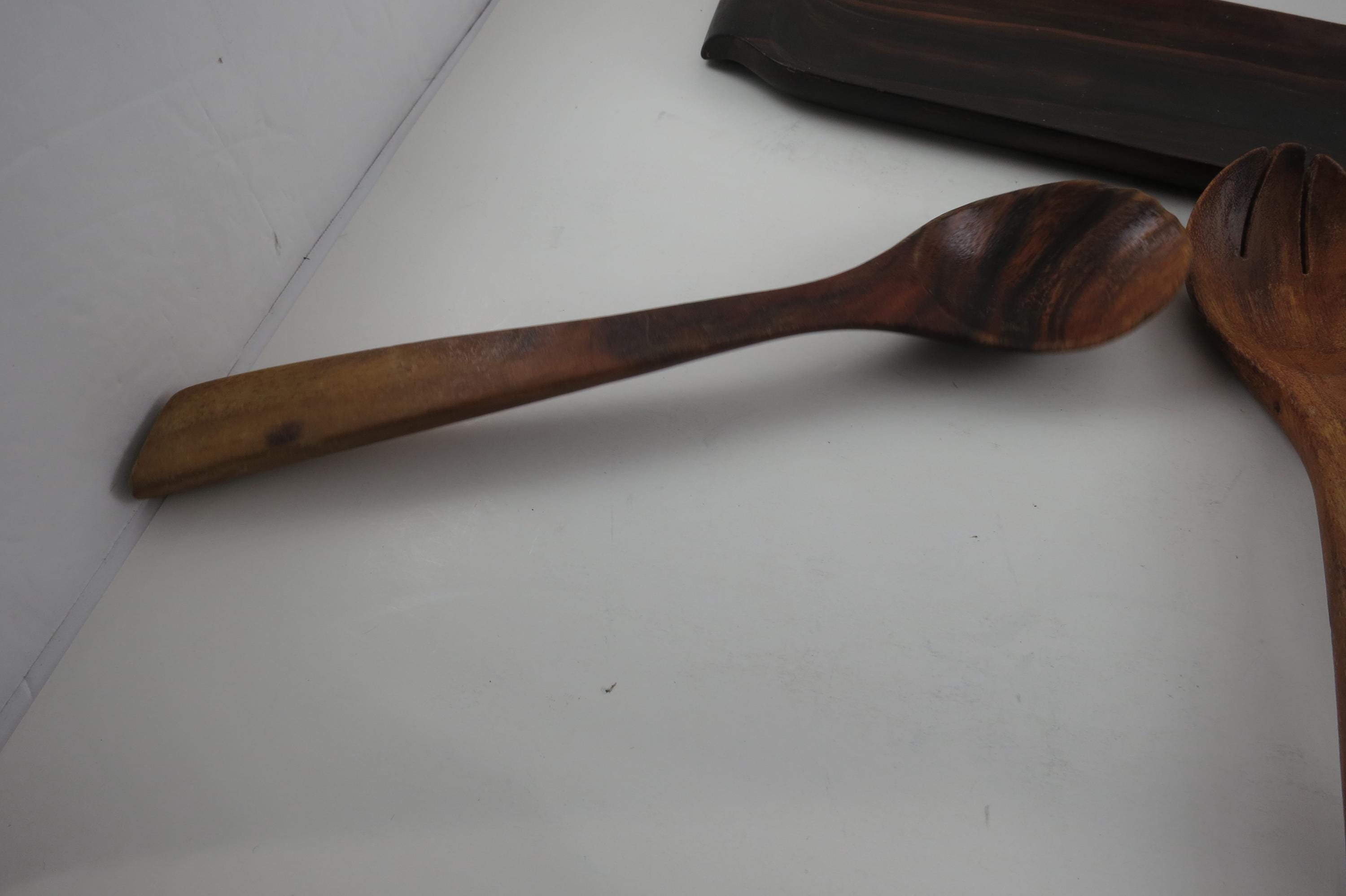 Vintage Monkey Pod Wood Set of 5 Pieces Spoons Nut Shaped Dish Long Tray.