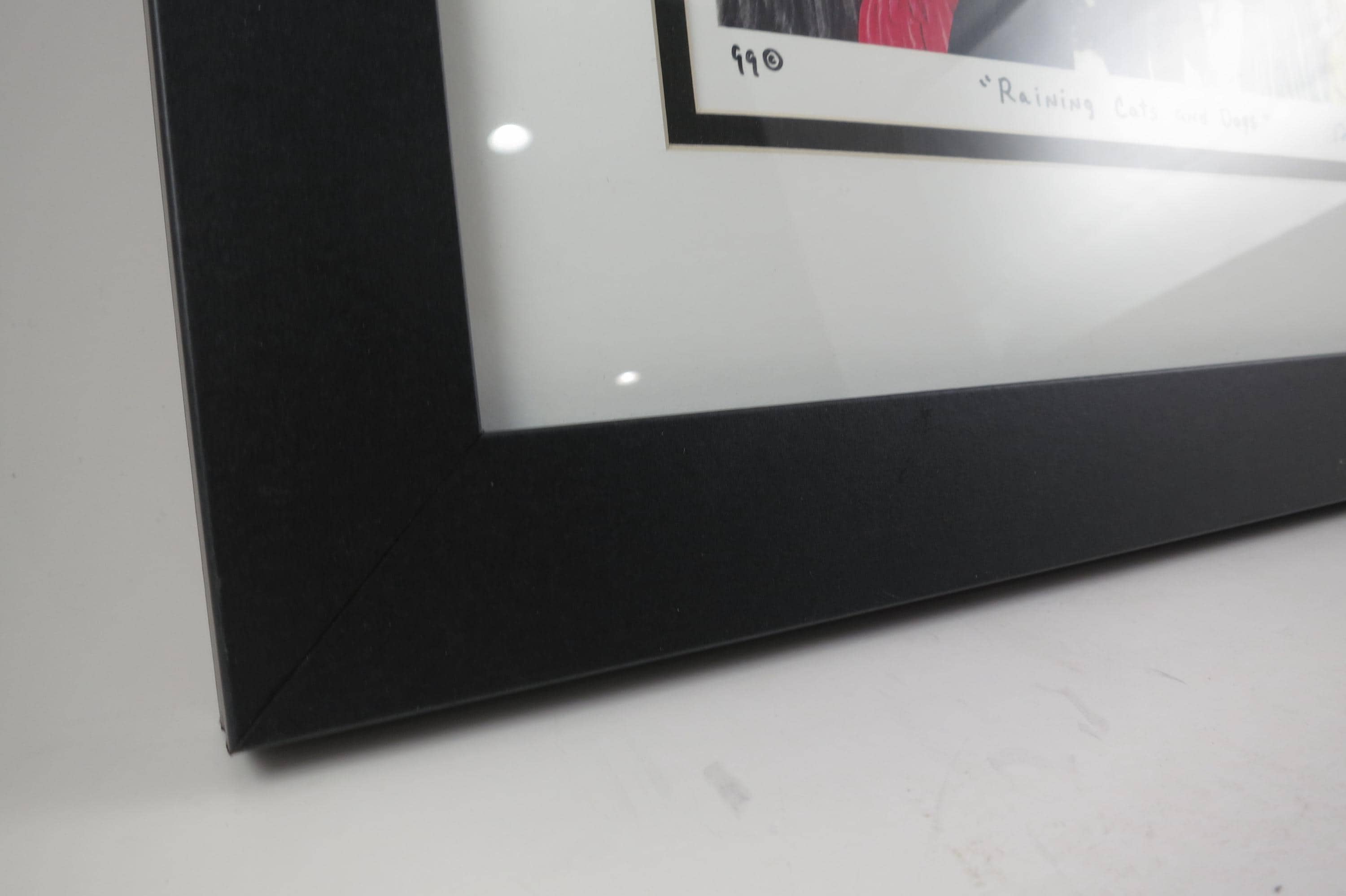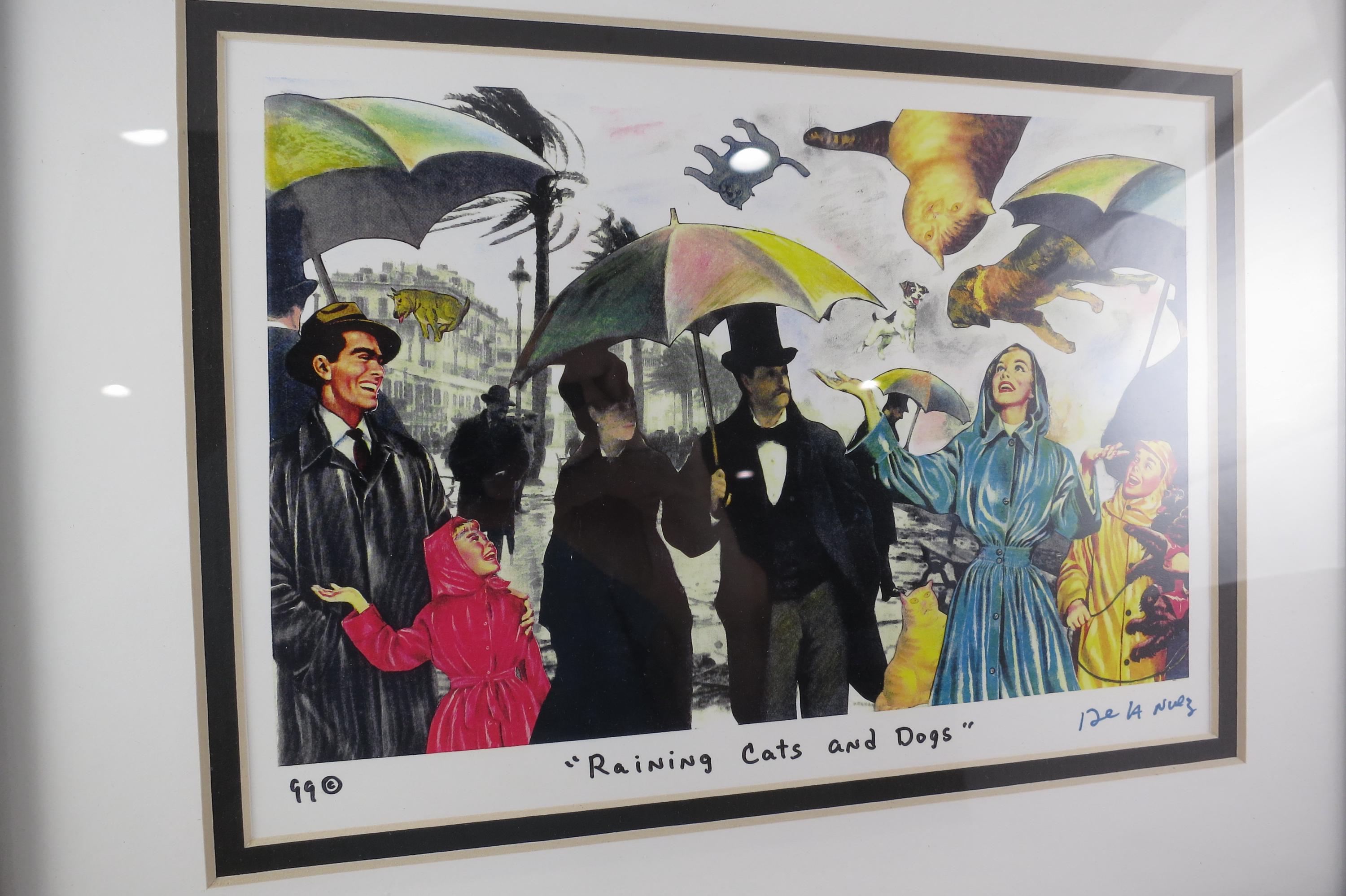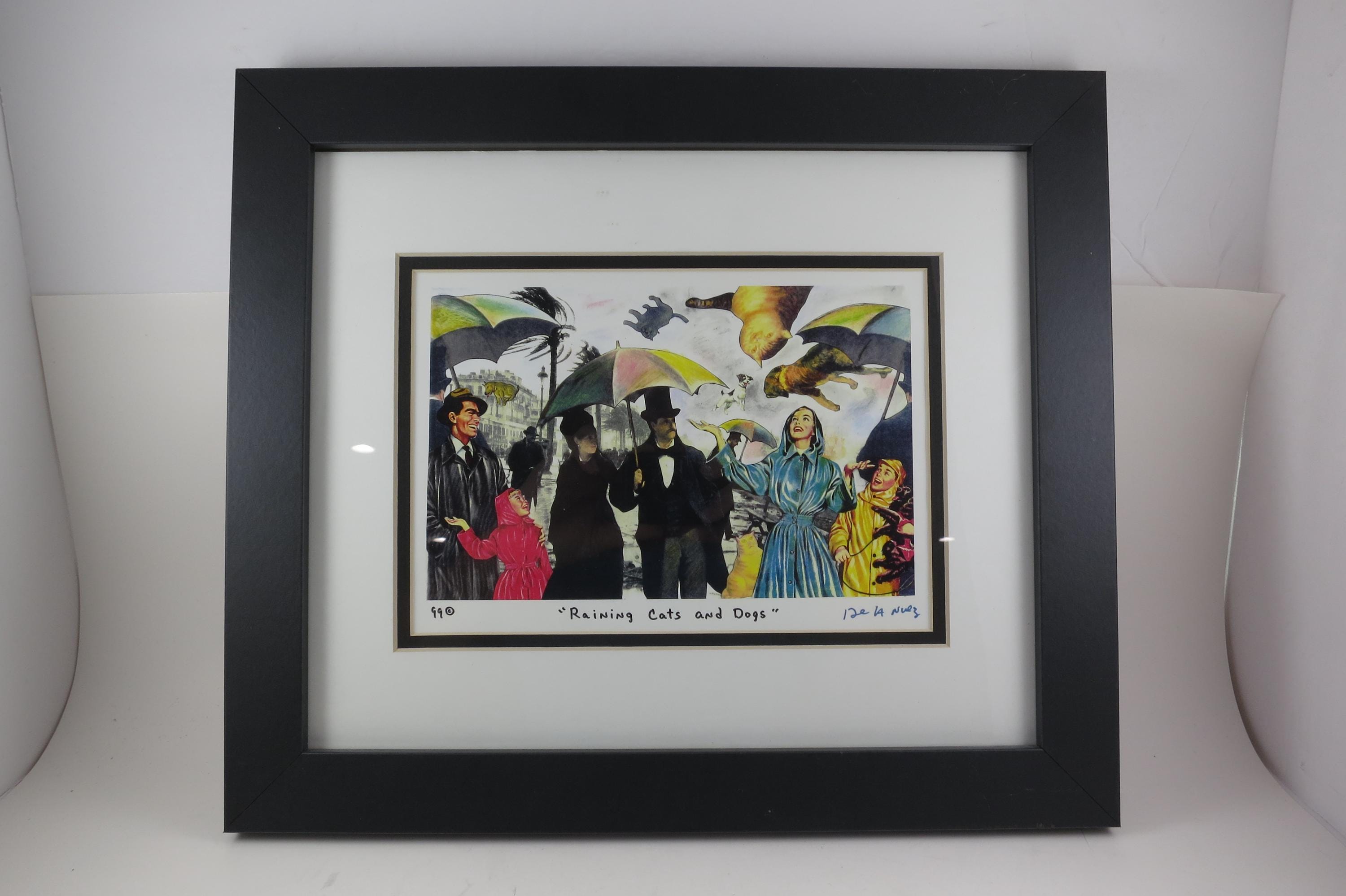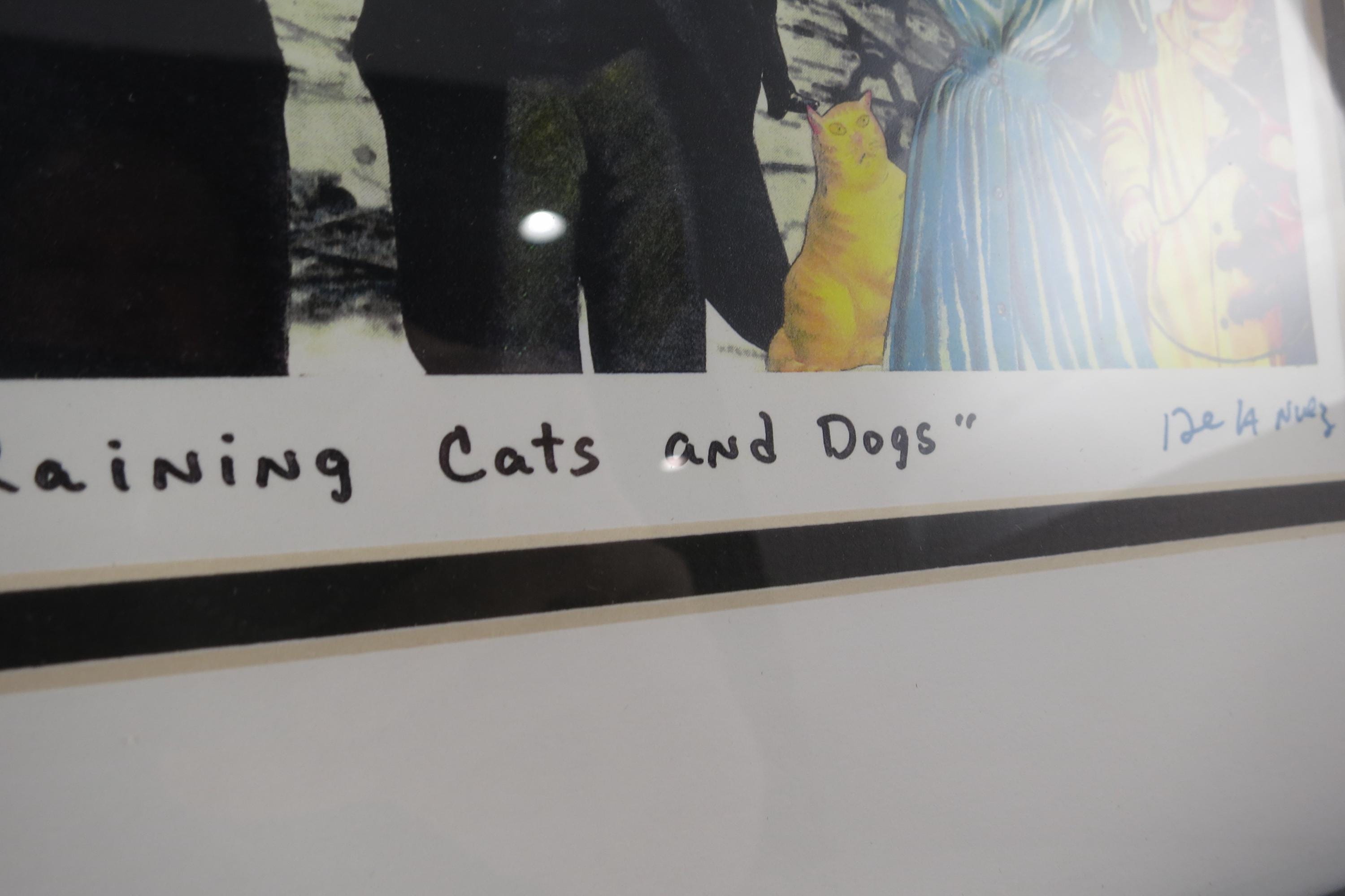 1999 Raining Cats and Dogs Nelson De La Nuez Artist Signed and Framed Litho 14x12.