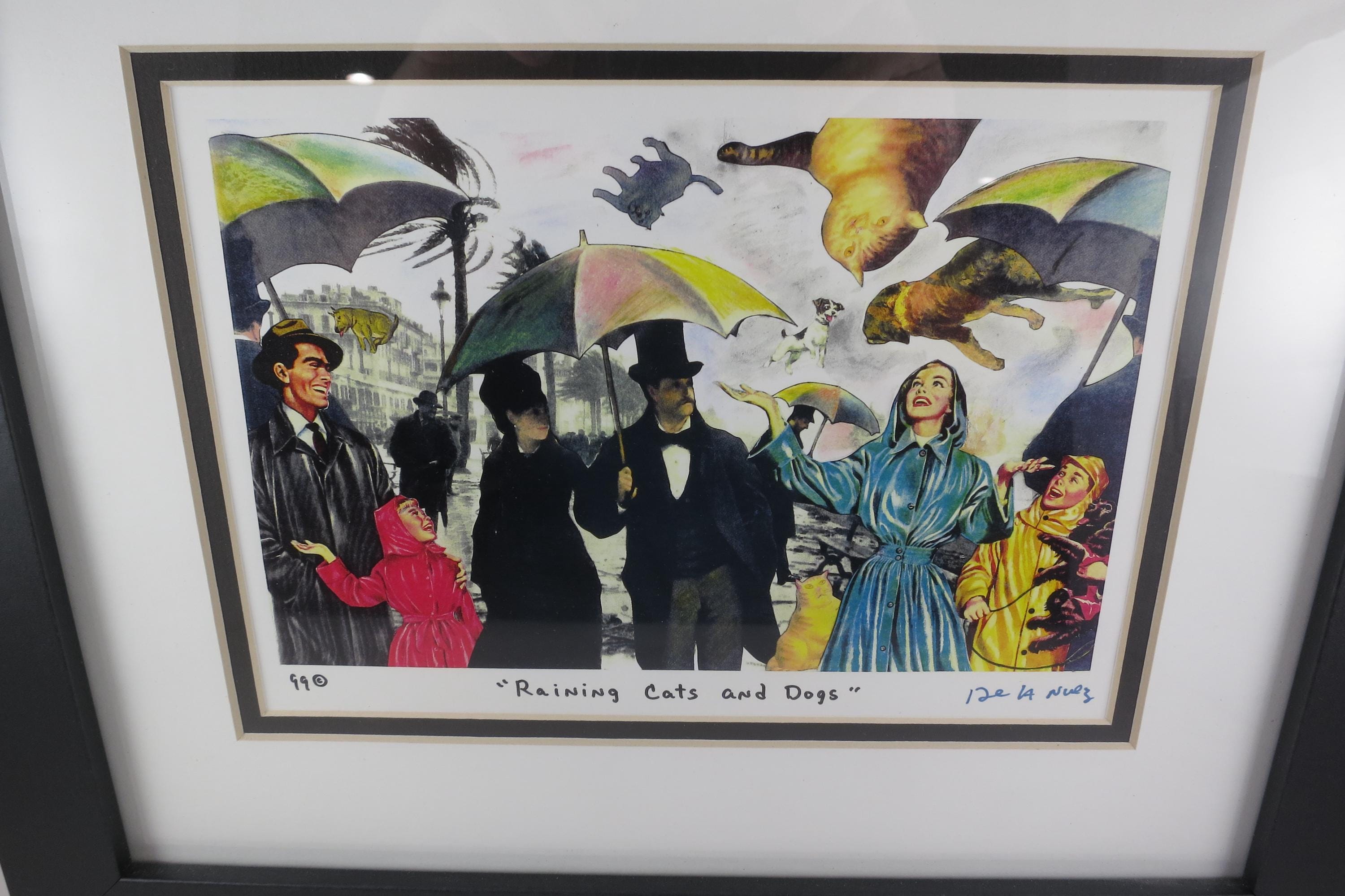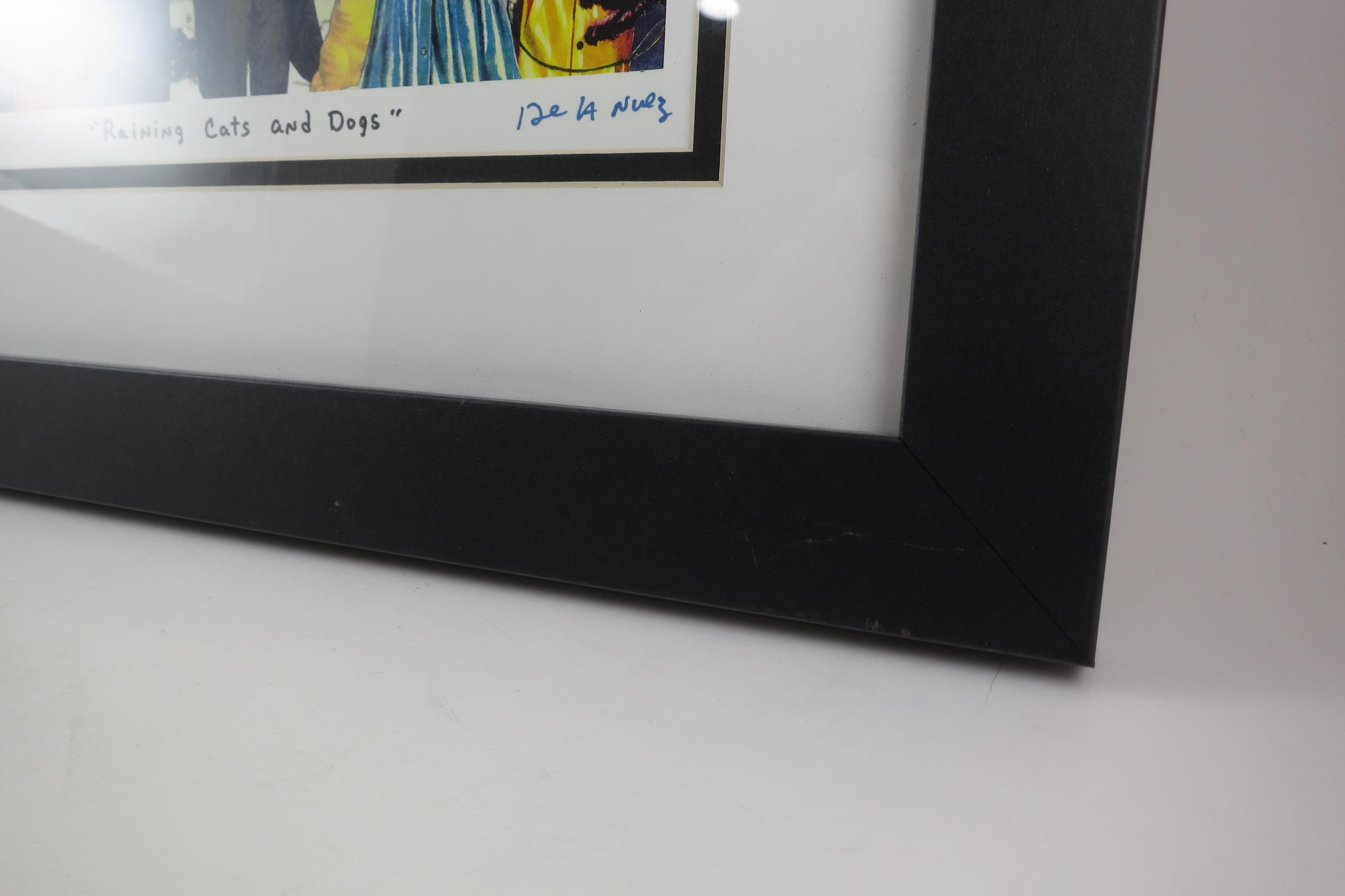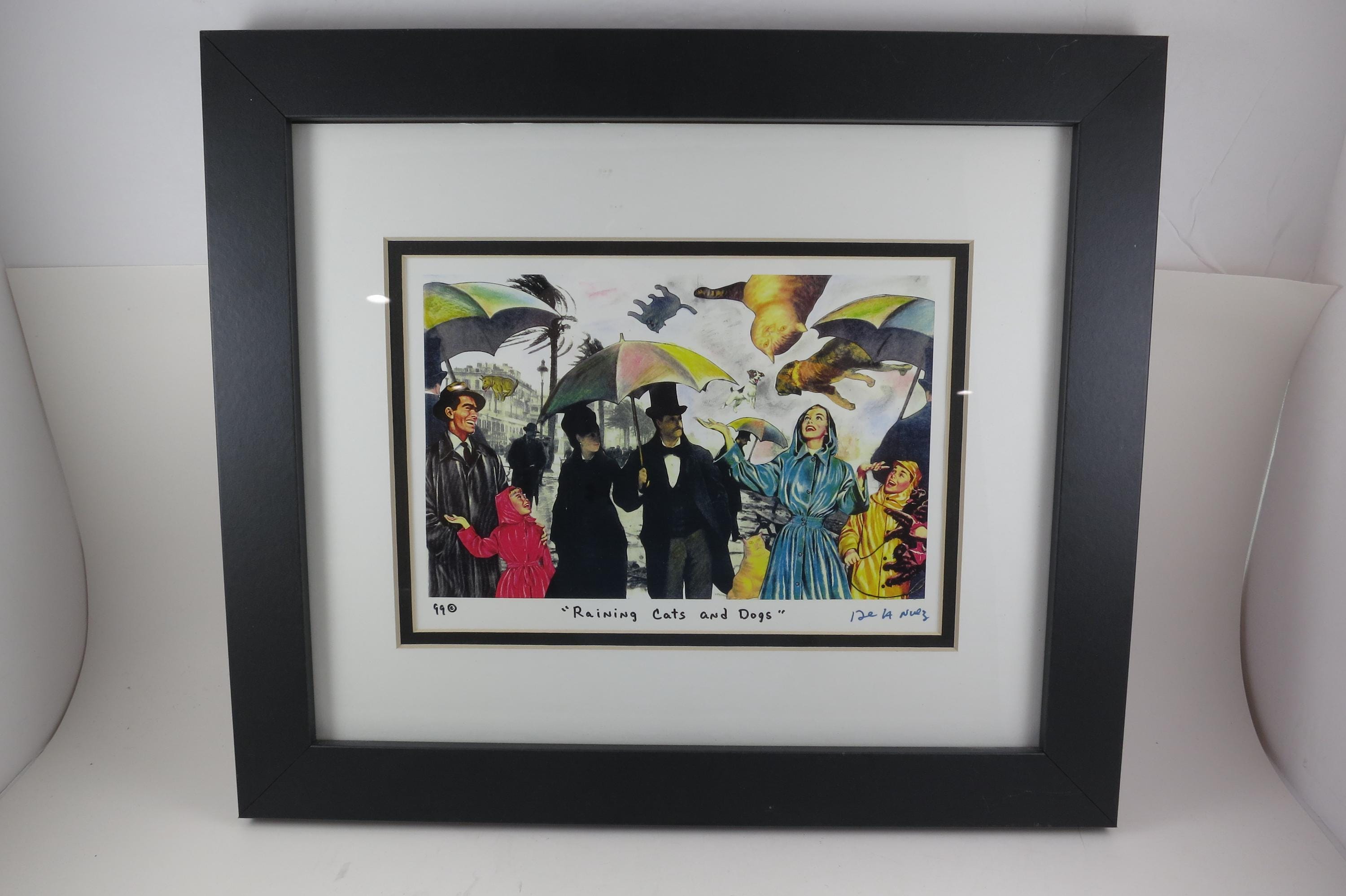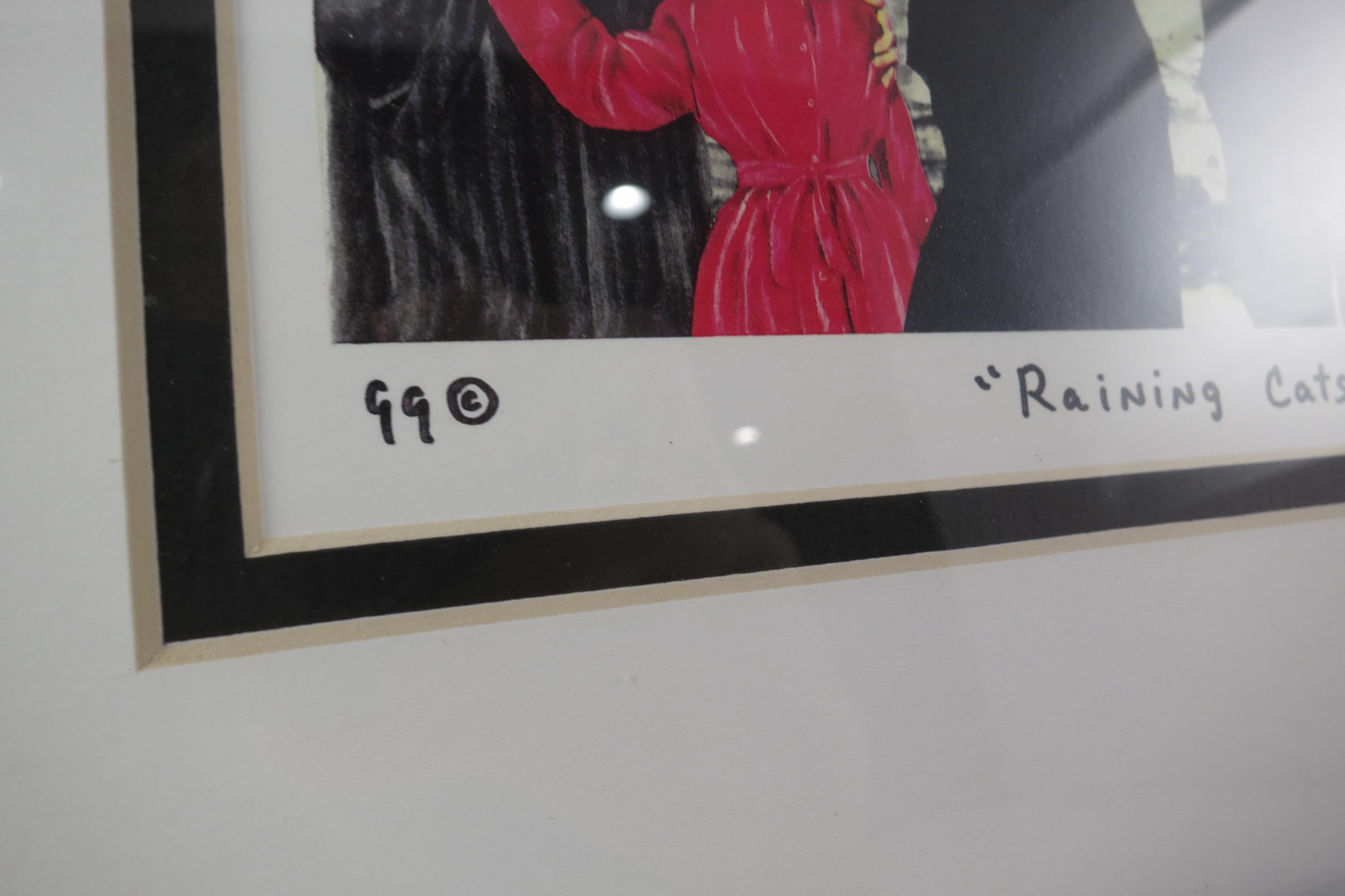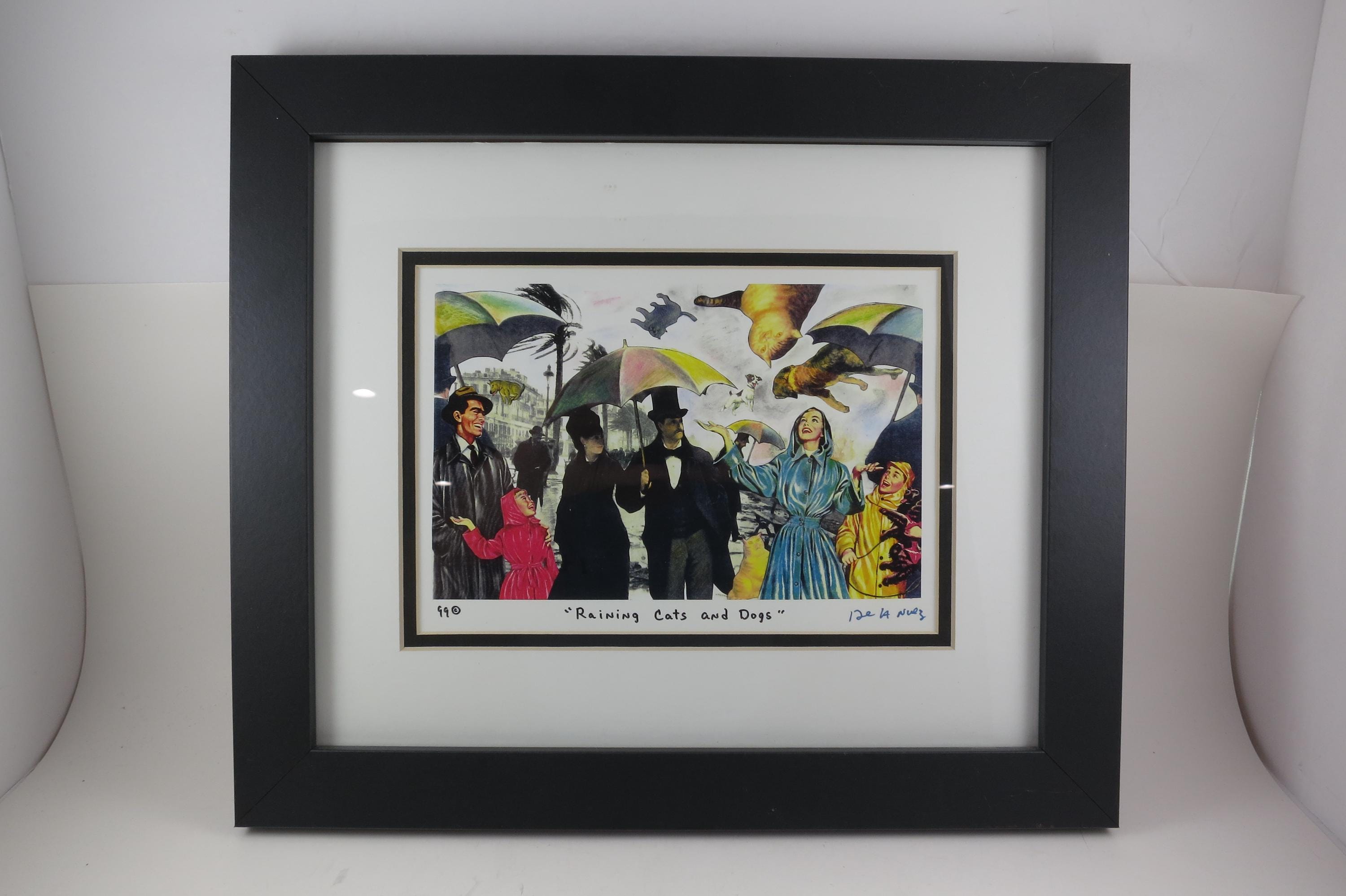1999 Raining Cats and Dogs Nelson De La Nuez Artist Signed and Framed Litho 14x12.