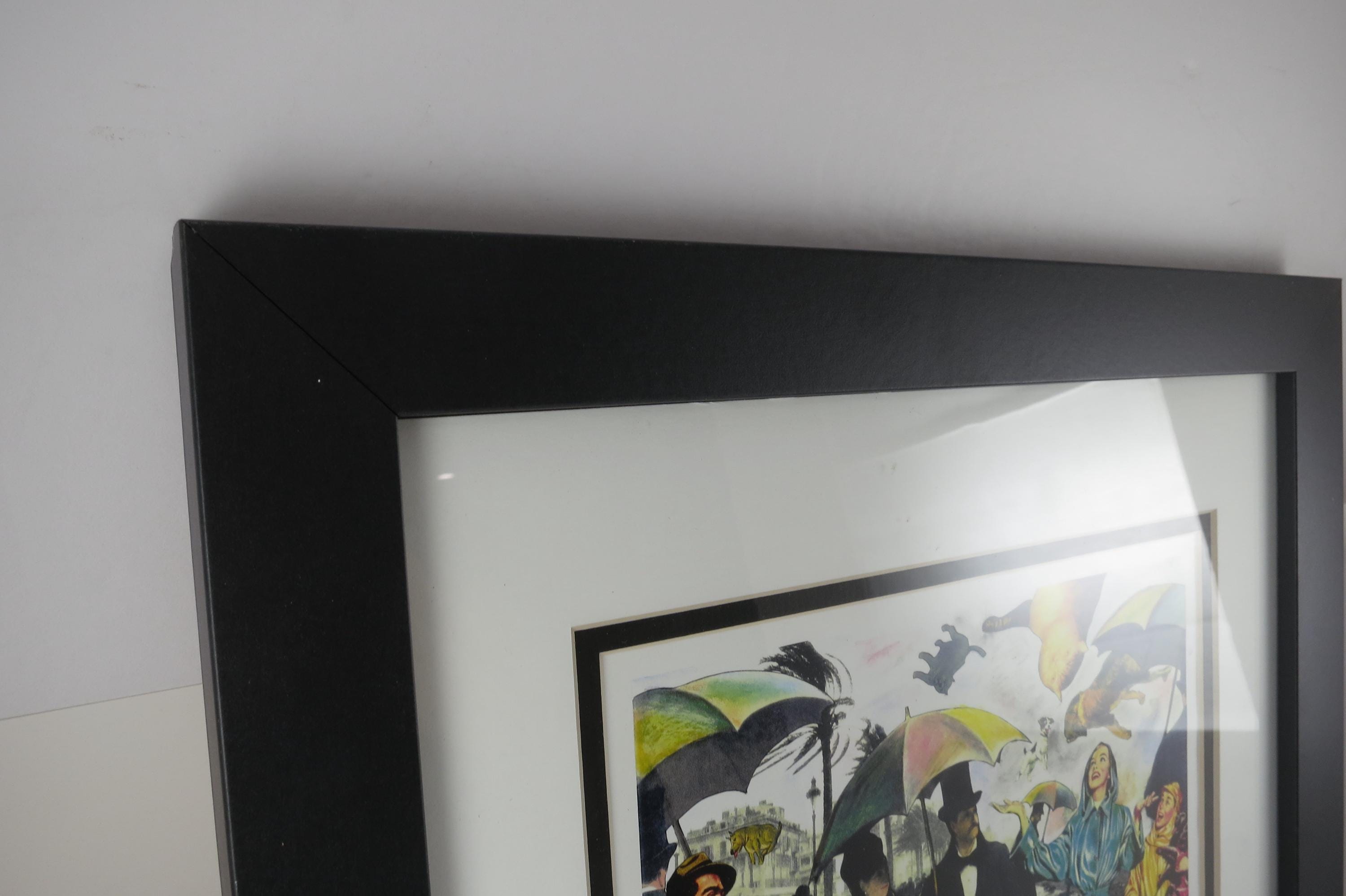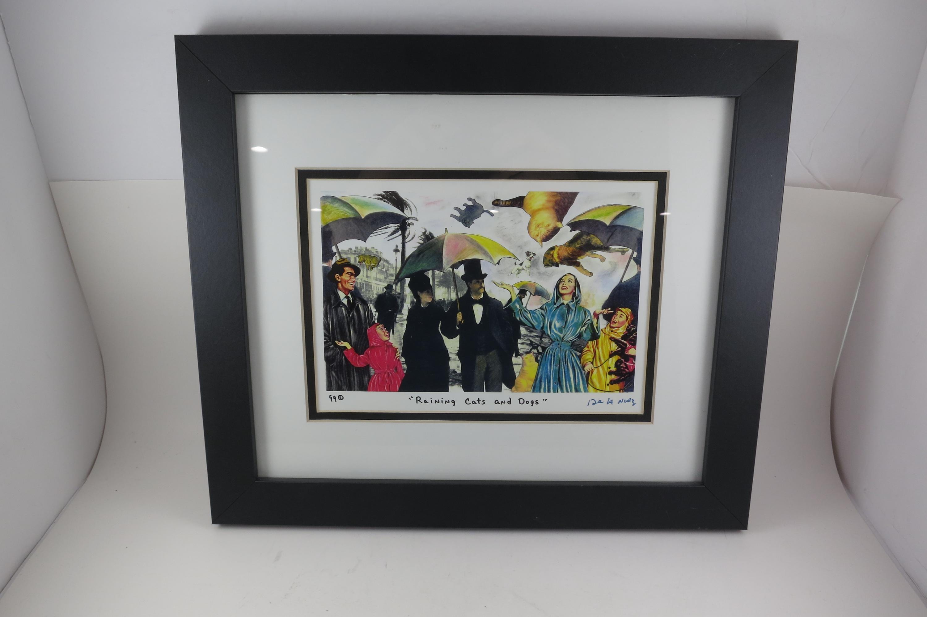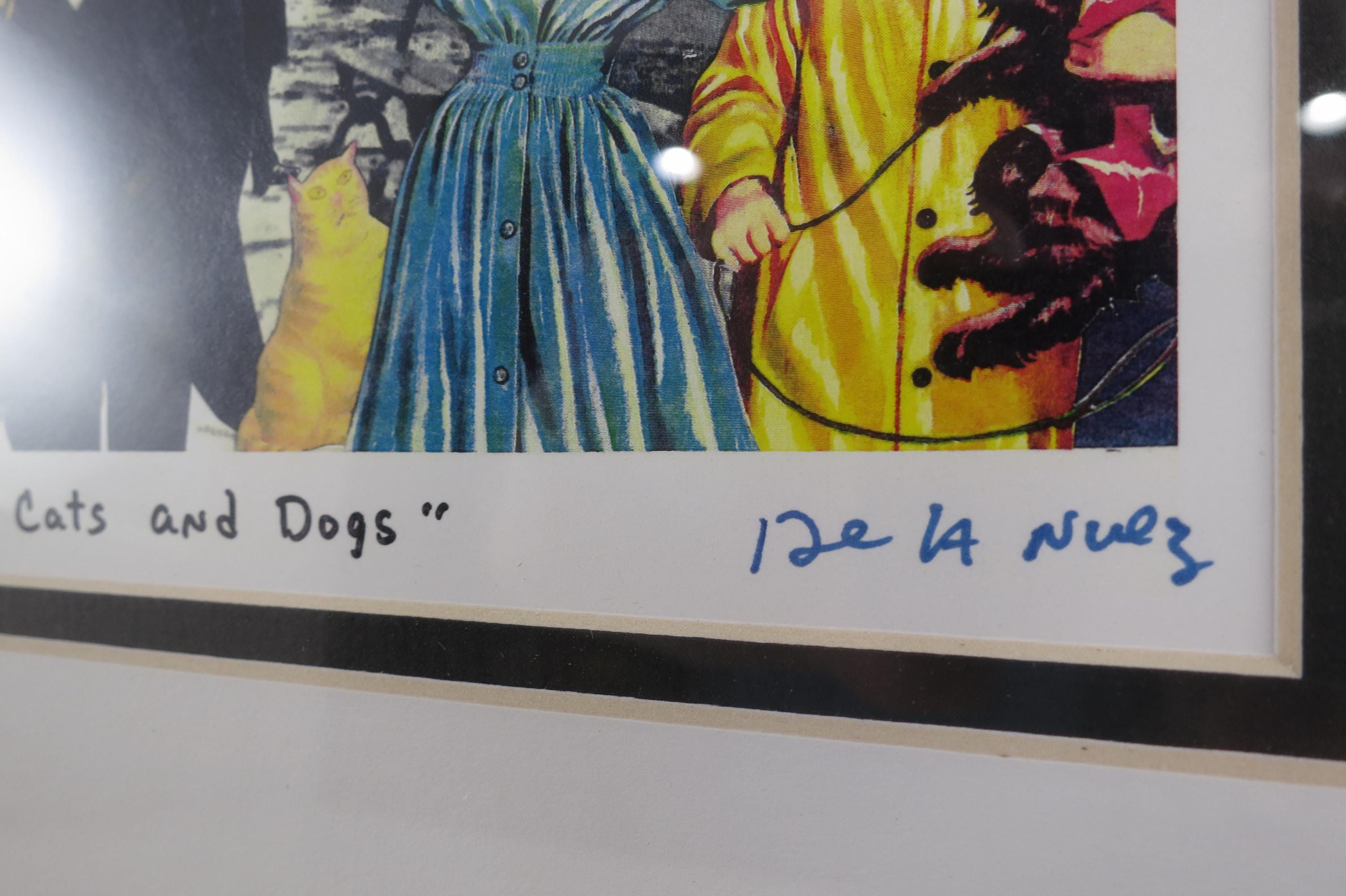 Signed Nelson De La Nuez Lithograph "Raining Cats and Dogs" Framed Art (14x12)