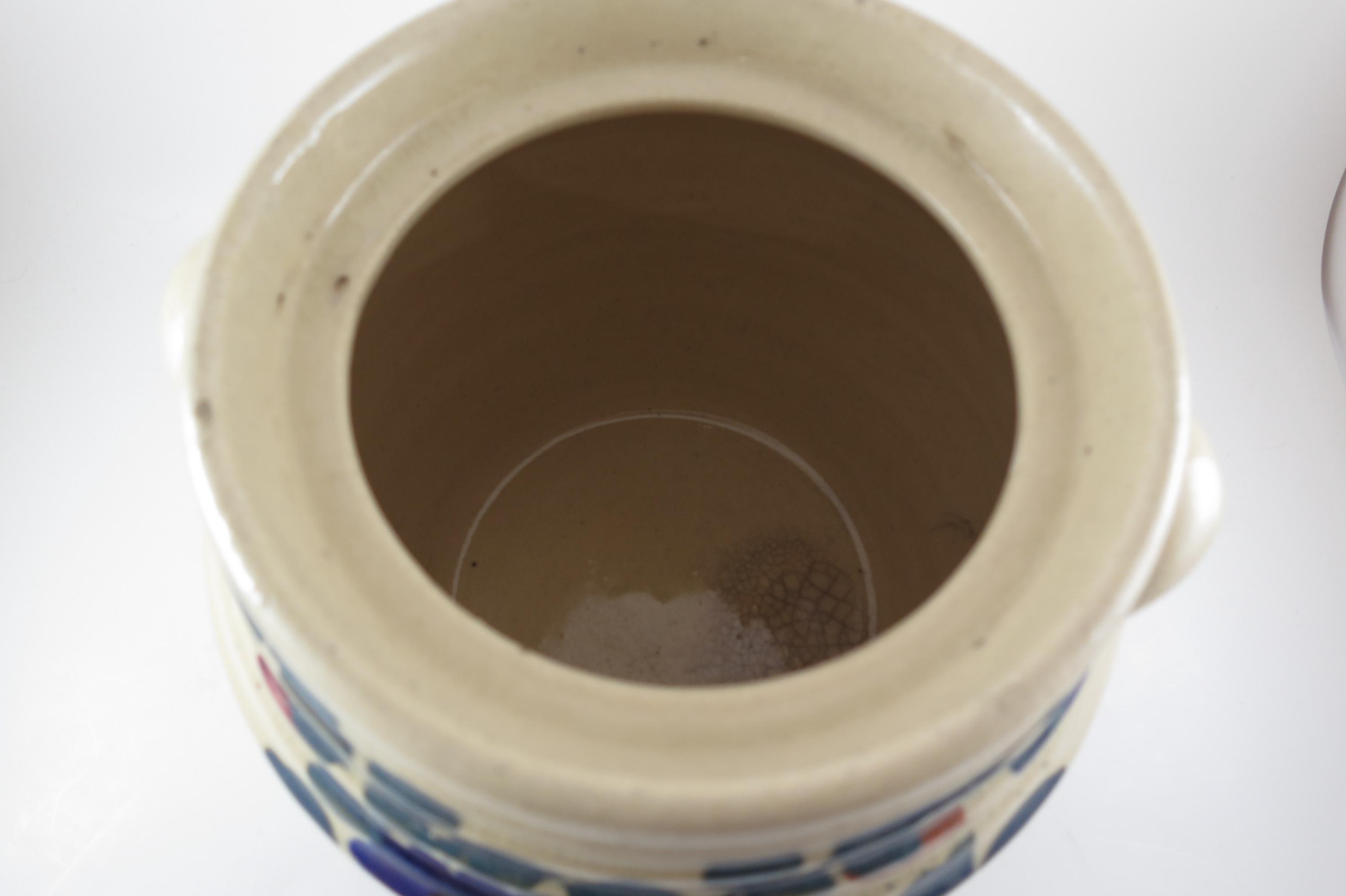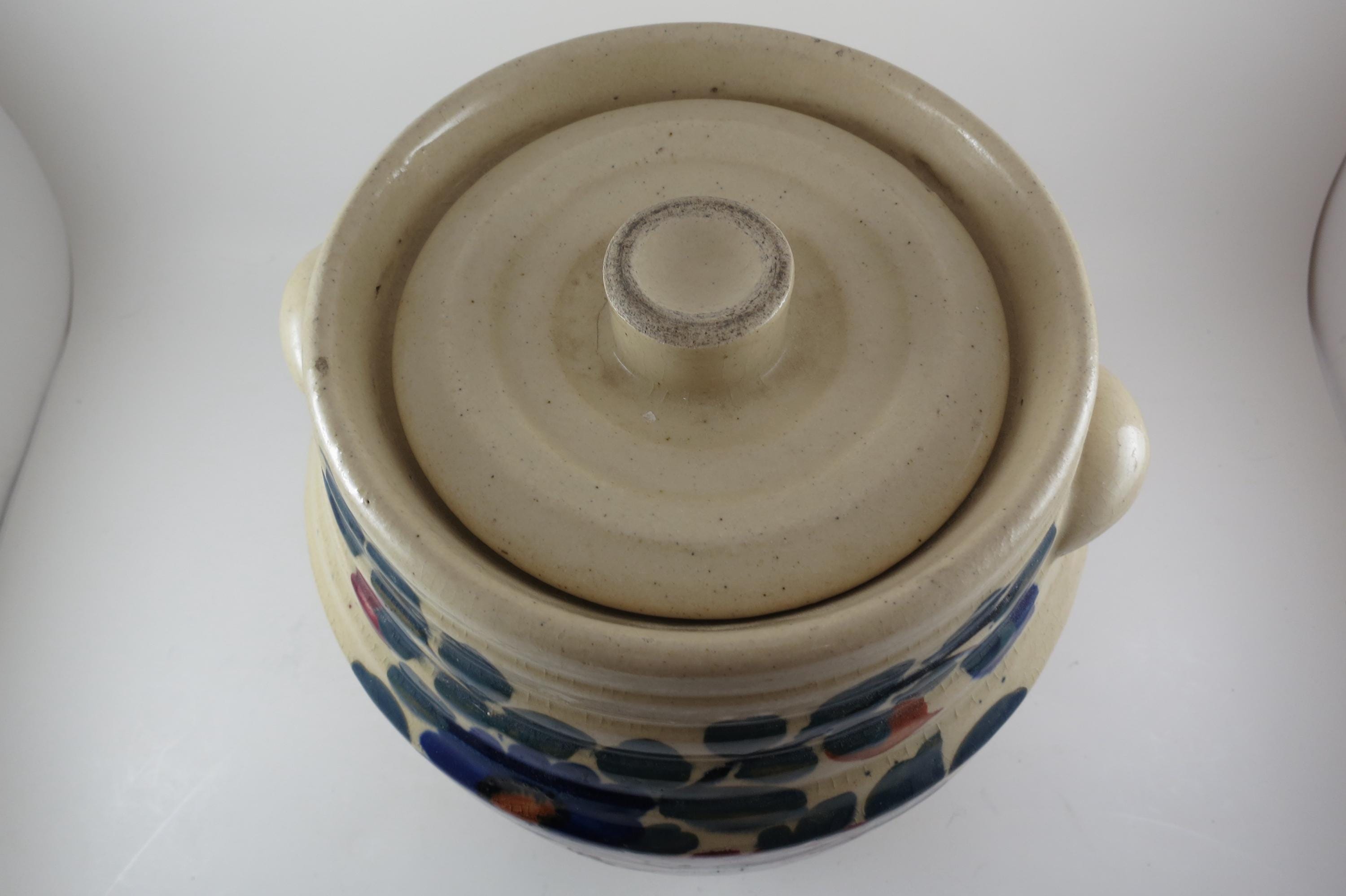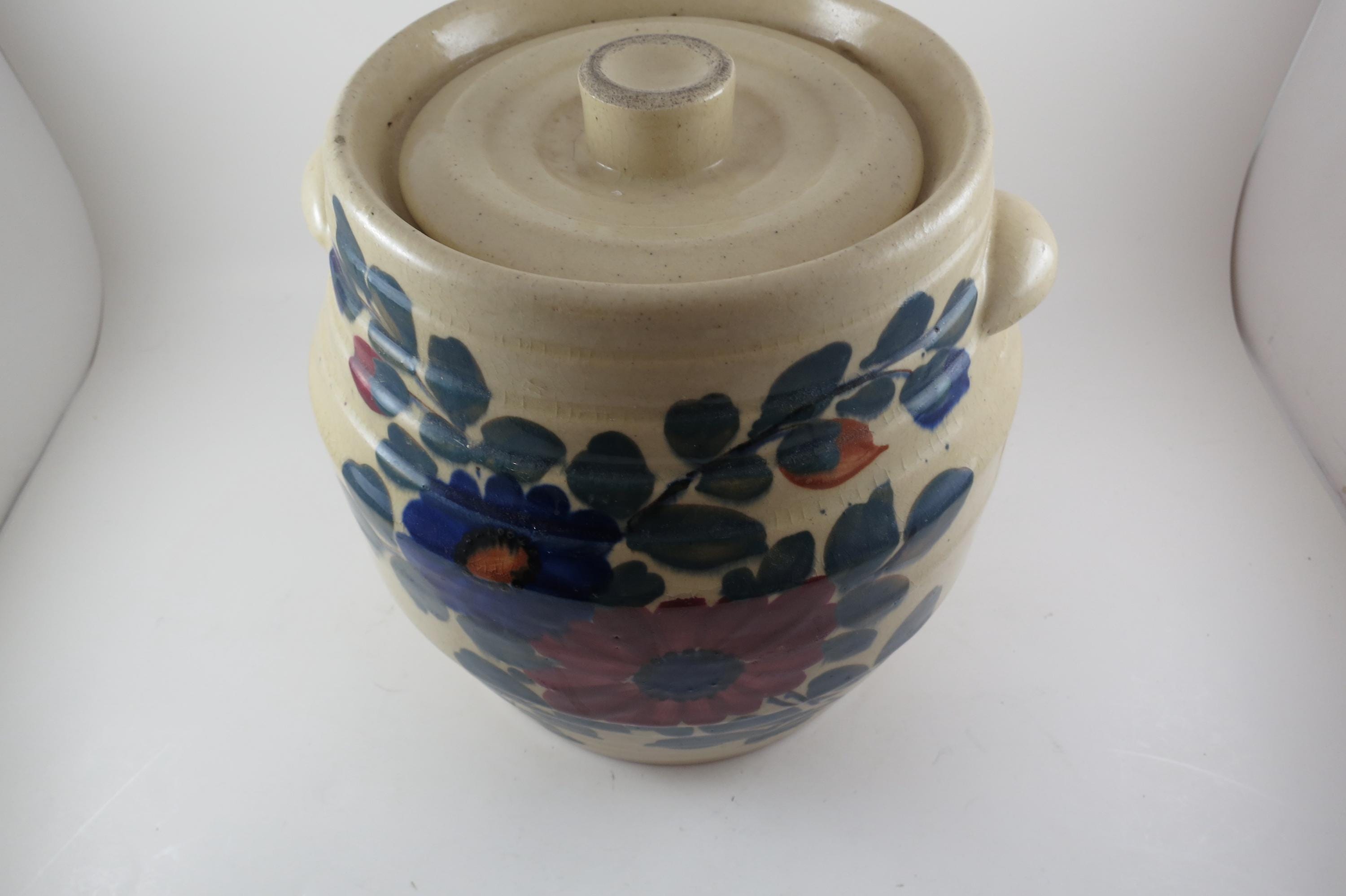Vintage Large Pottery Crock/Jar with Lid Cookies Hand Painted Double Mini Handles