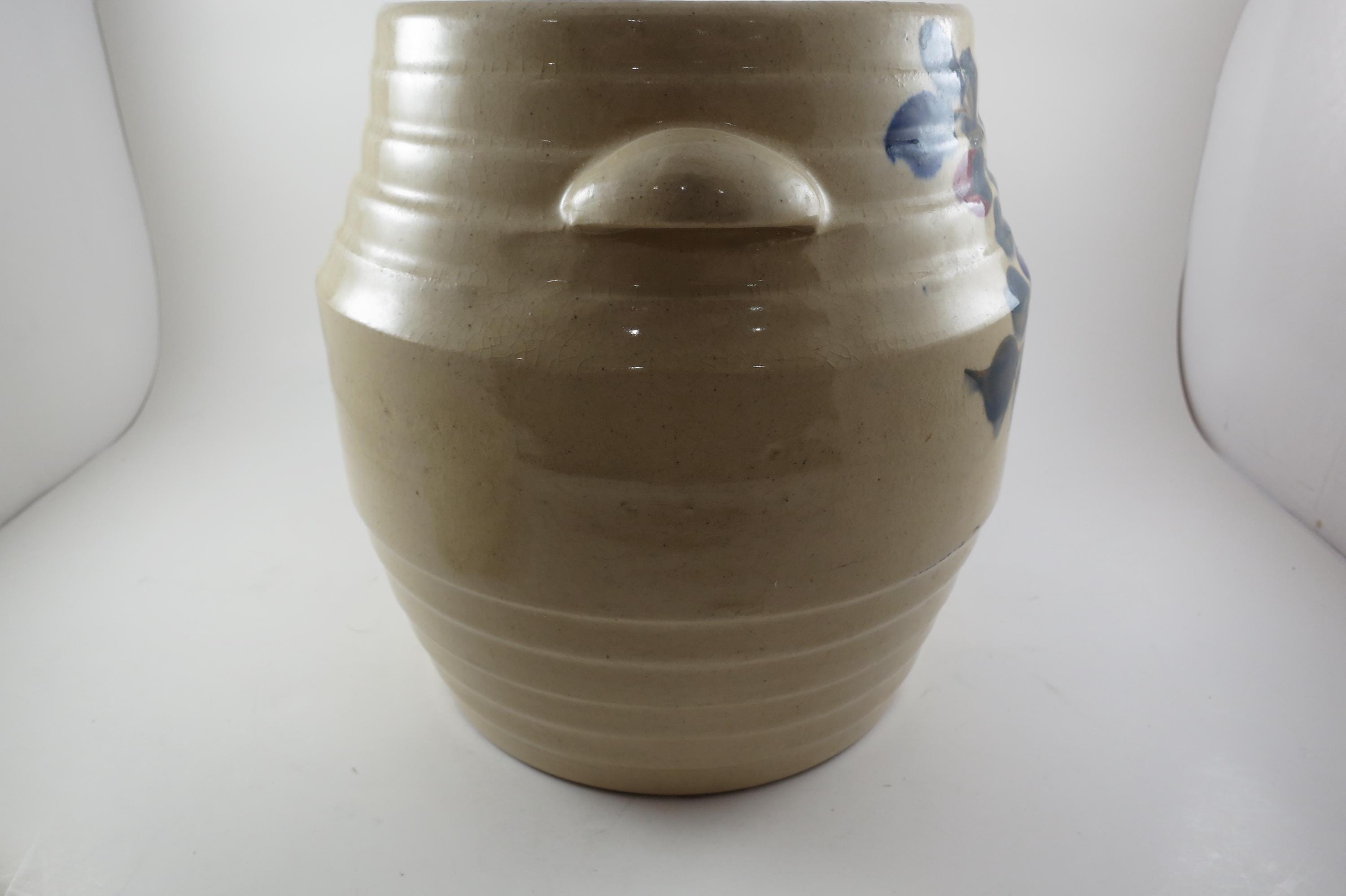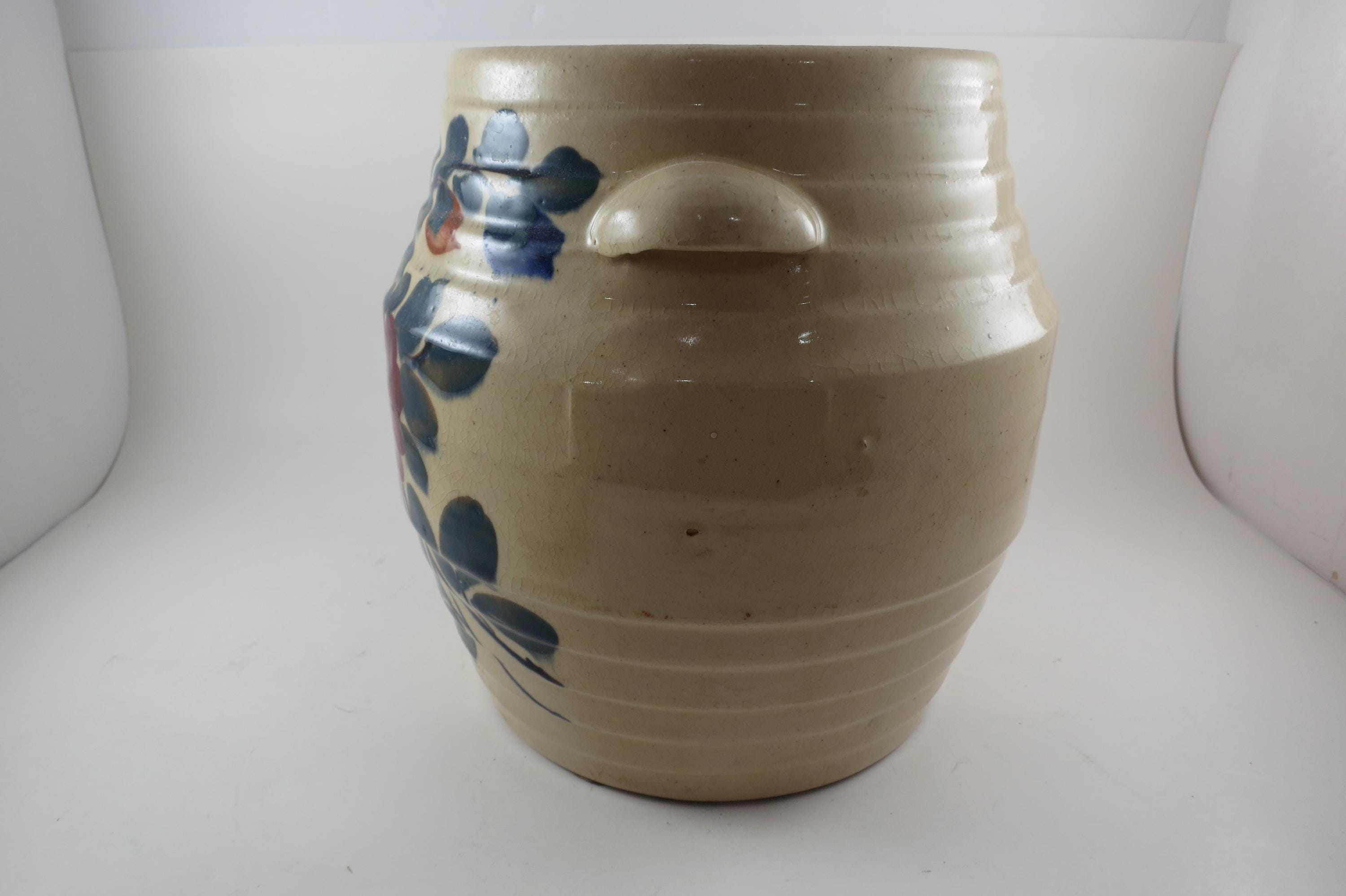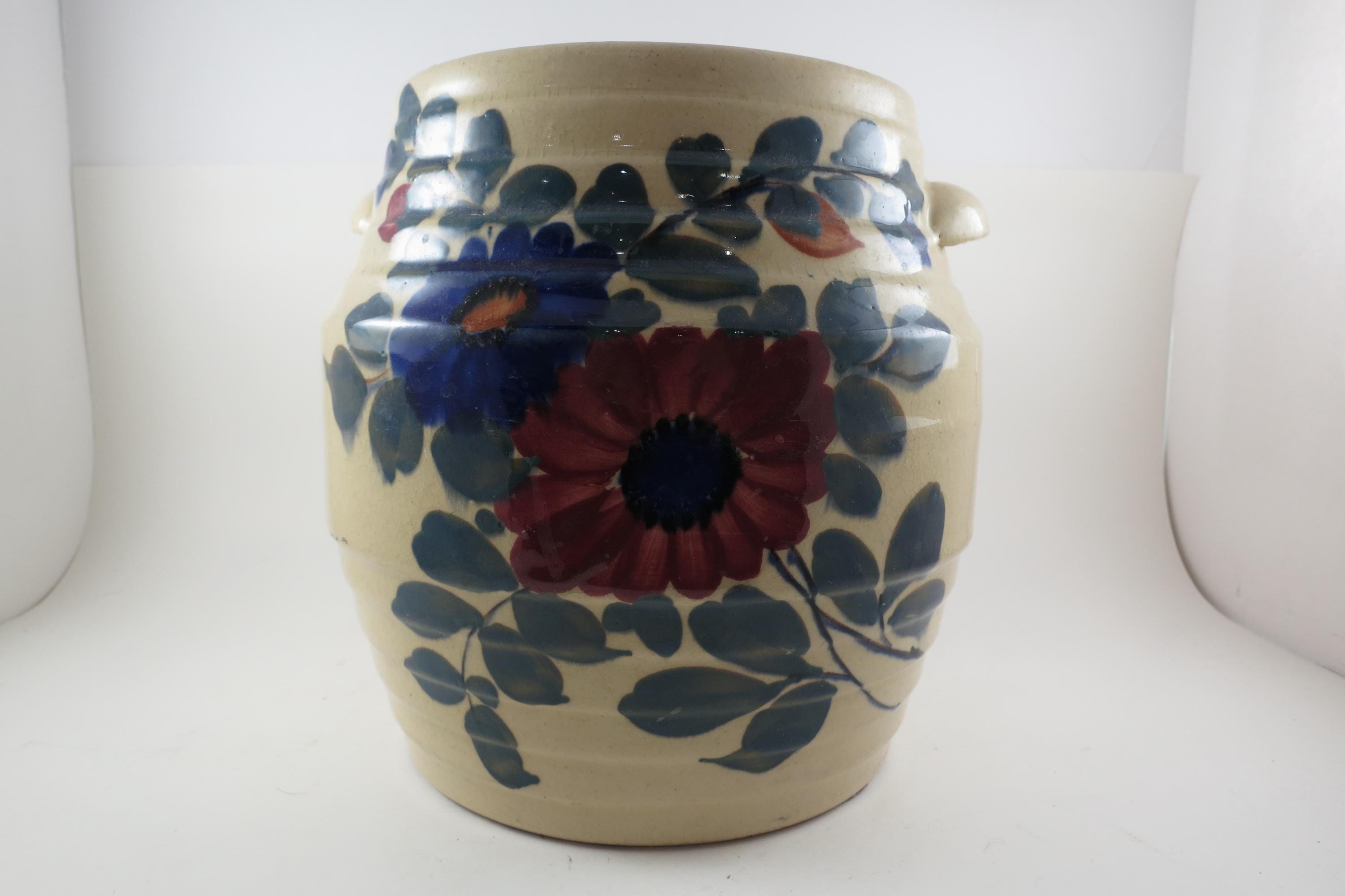 Vintage Large Pottery Crock/Jar with Lid Cookies Hand Painted Double Mini Handles.