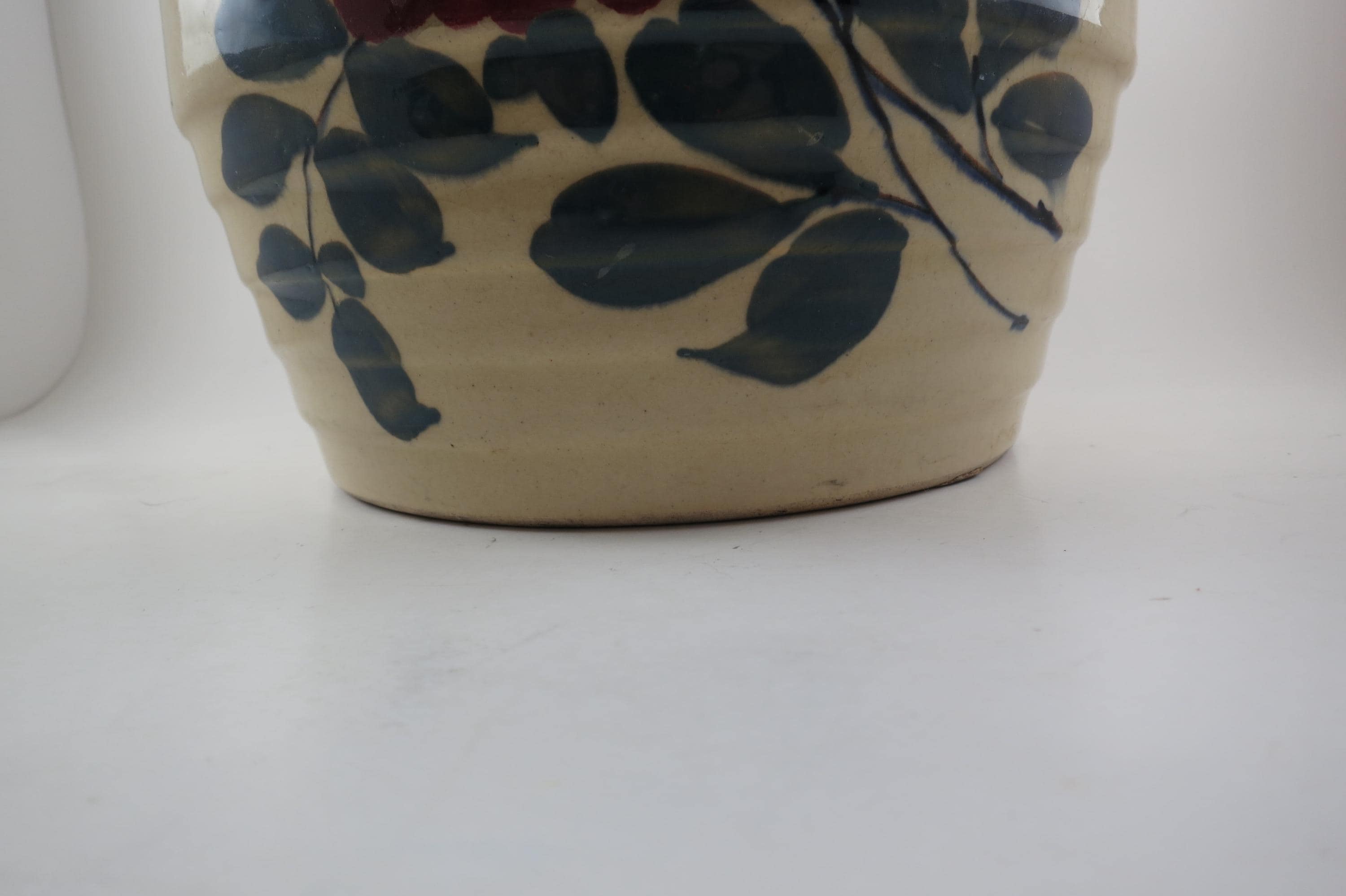Beautiful old jar someone did a great job painting! Has red and purple flowers alongside the green leaves. Has the original lid and a little mini handle on each side. Measures 8 1/2 inches tall and 8 inches wide. Ready to display or use in a new home.