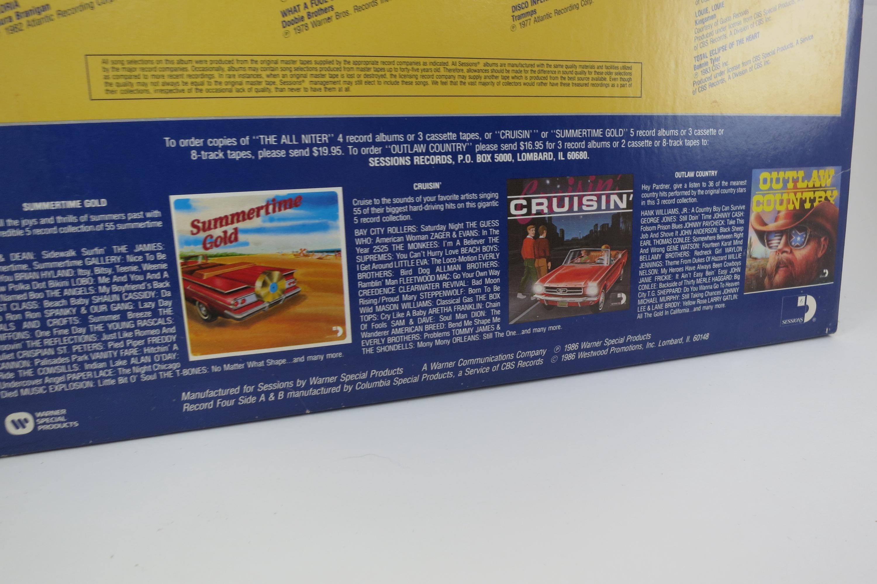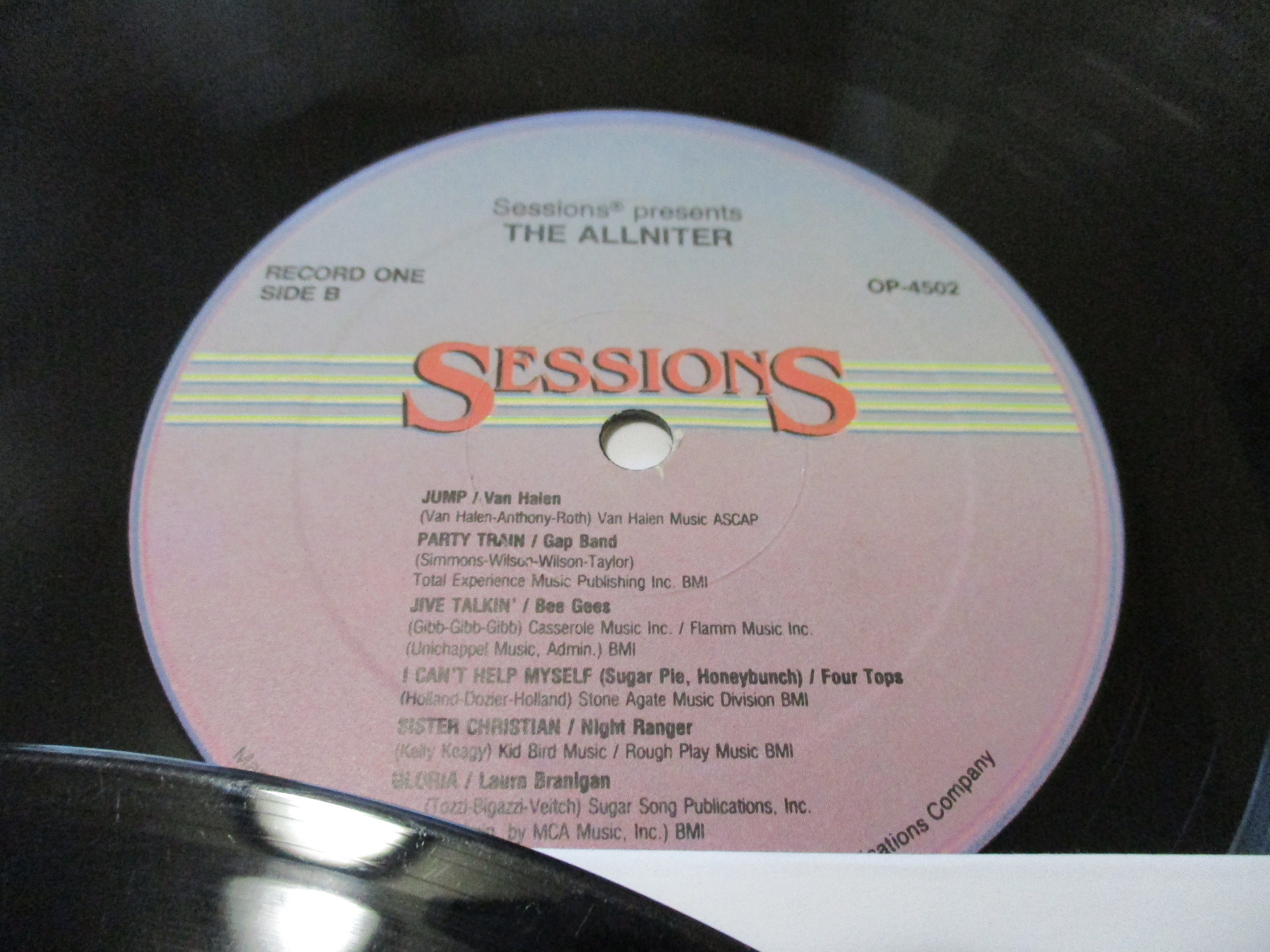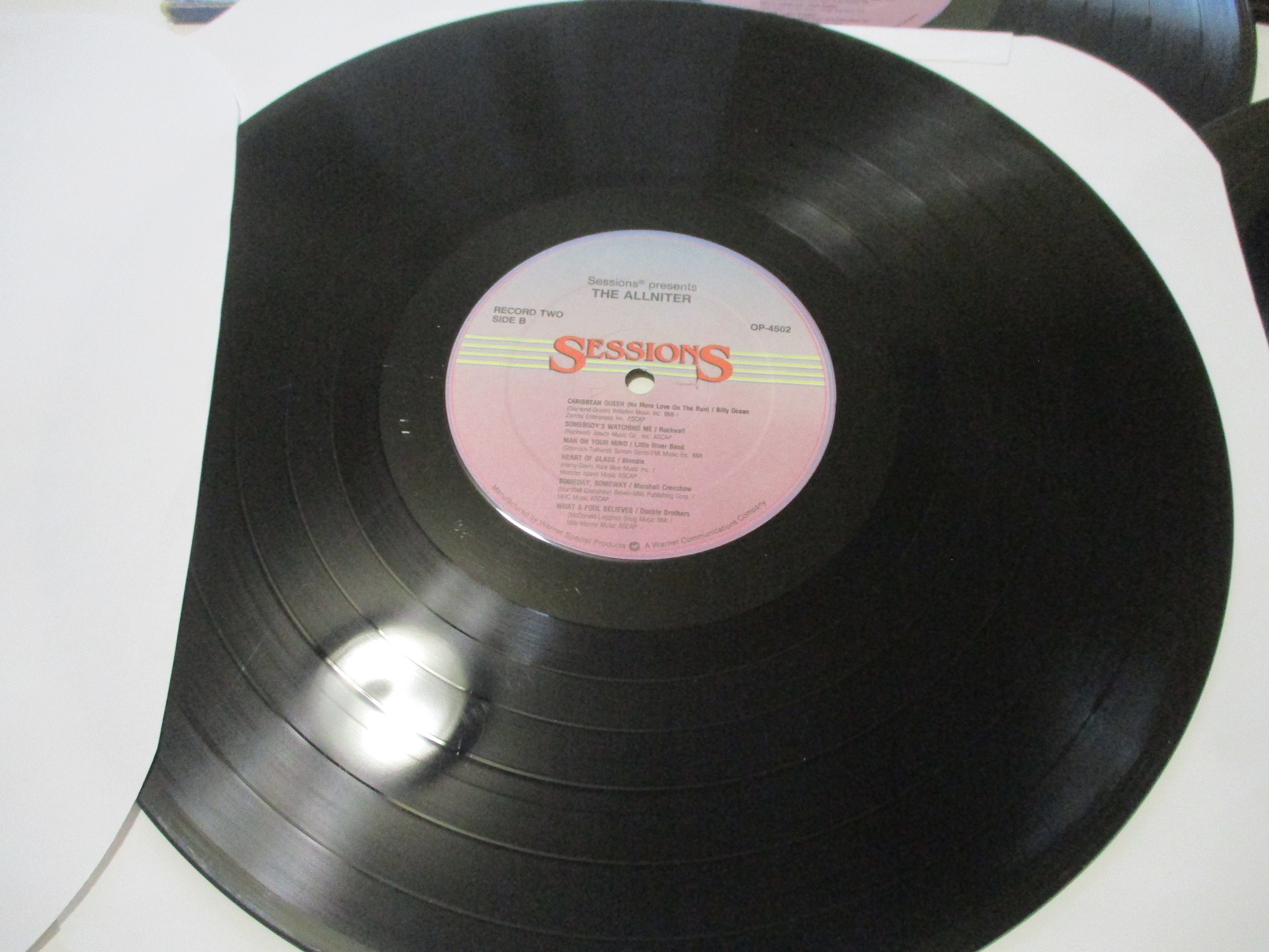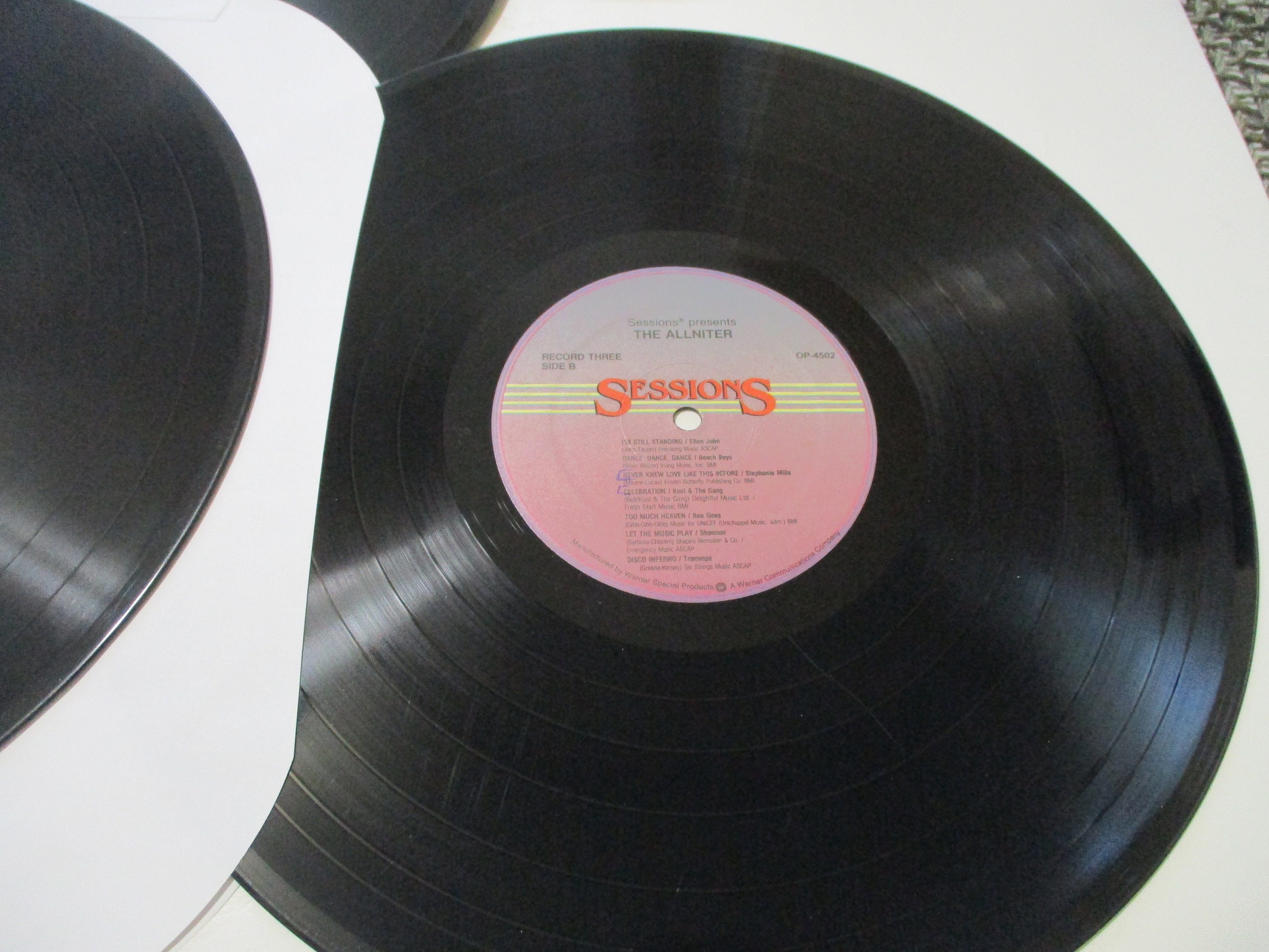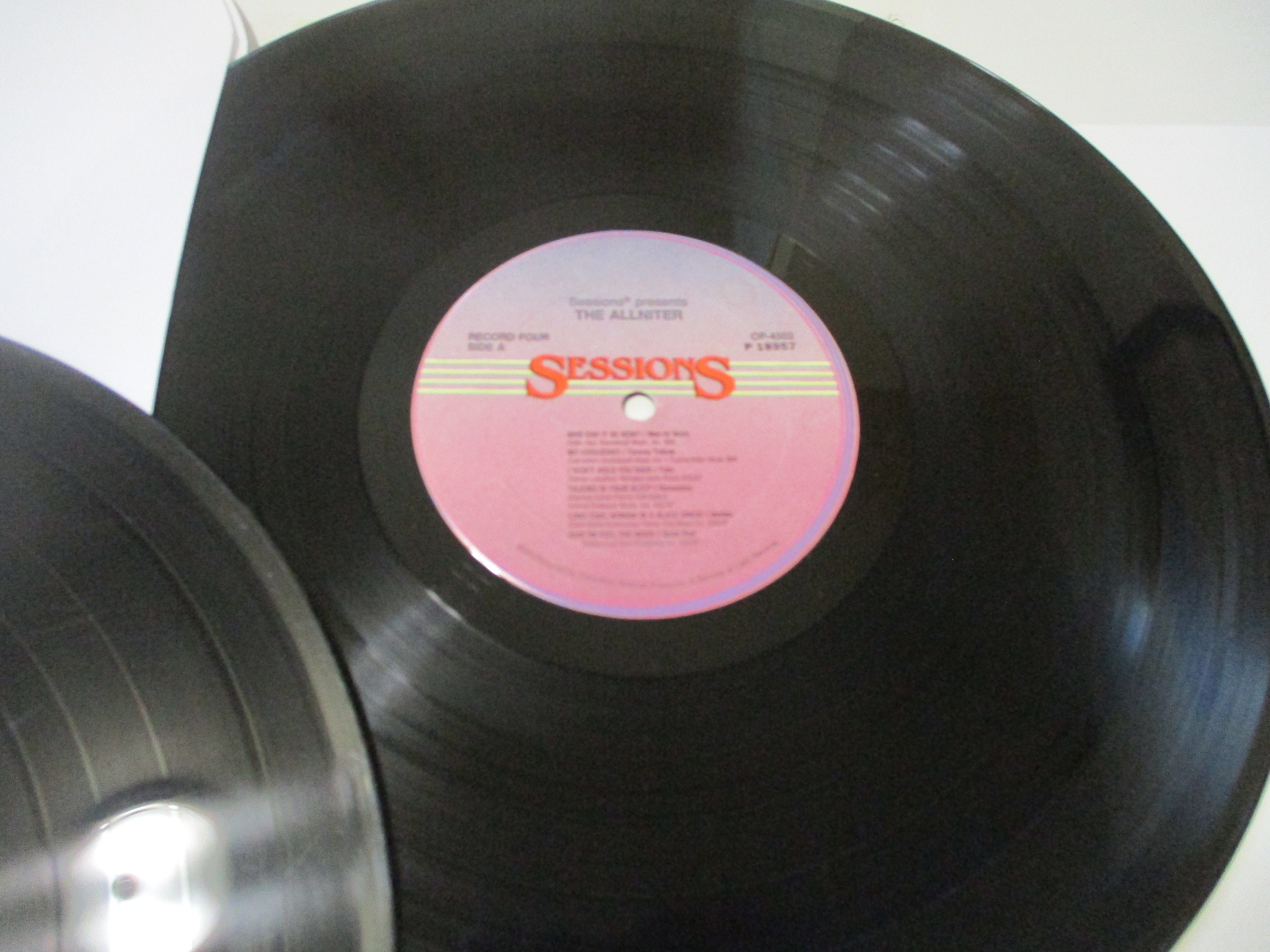 Vintage 1985 Vinyl LP Record Set The Allniter Various Artists Greatest Hits Four Record Set Excellent Condition. Original cover is in excellent condition and includes all four inner paper sleeves. Record 1 is very good with light marks. Record 2 and 3 are excellent. Record 4 is very good plus. Tracks are as follows