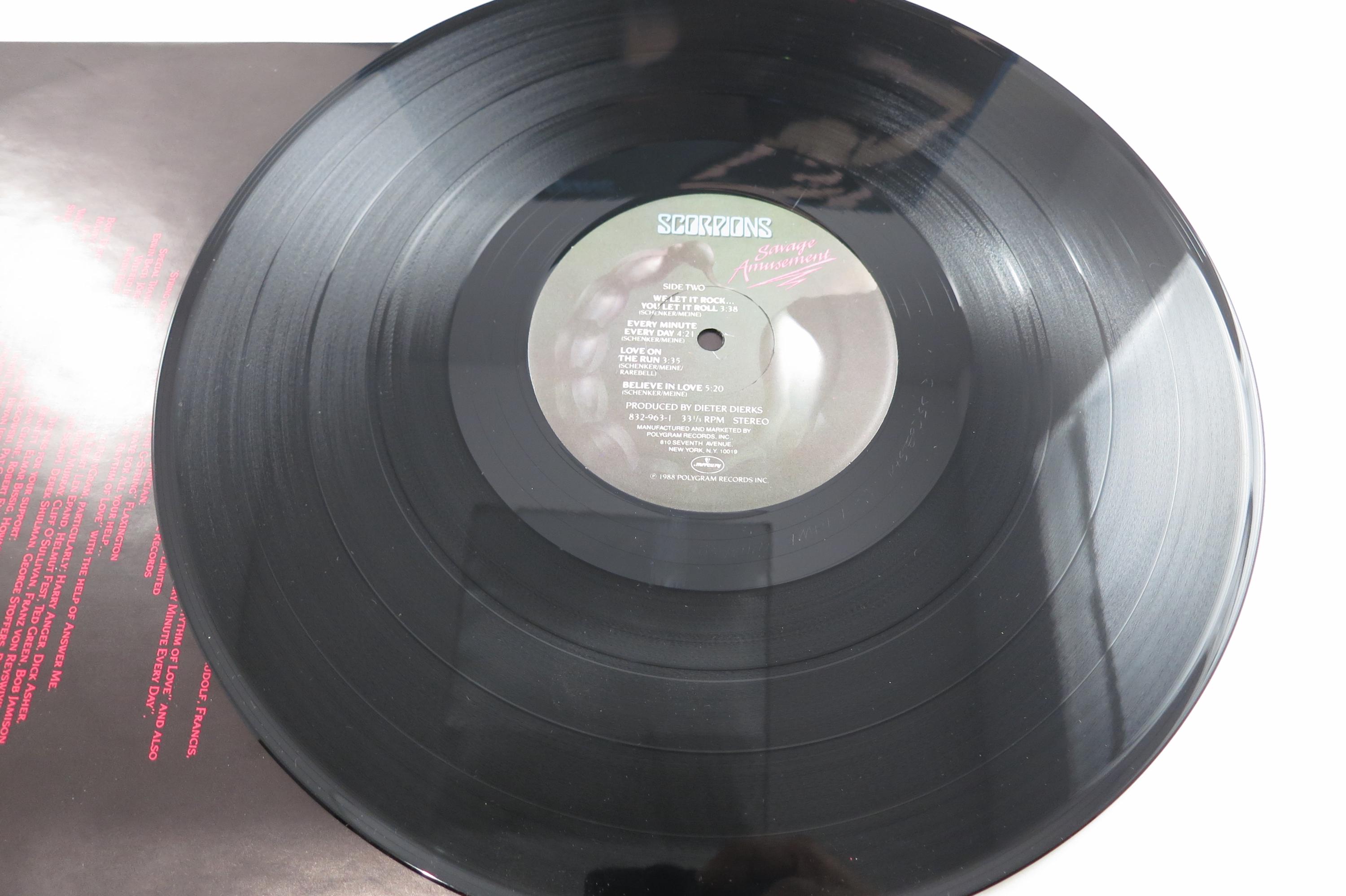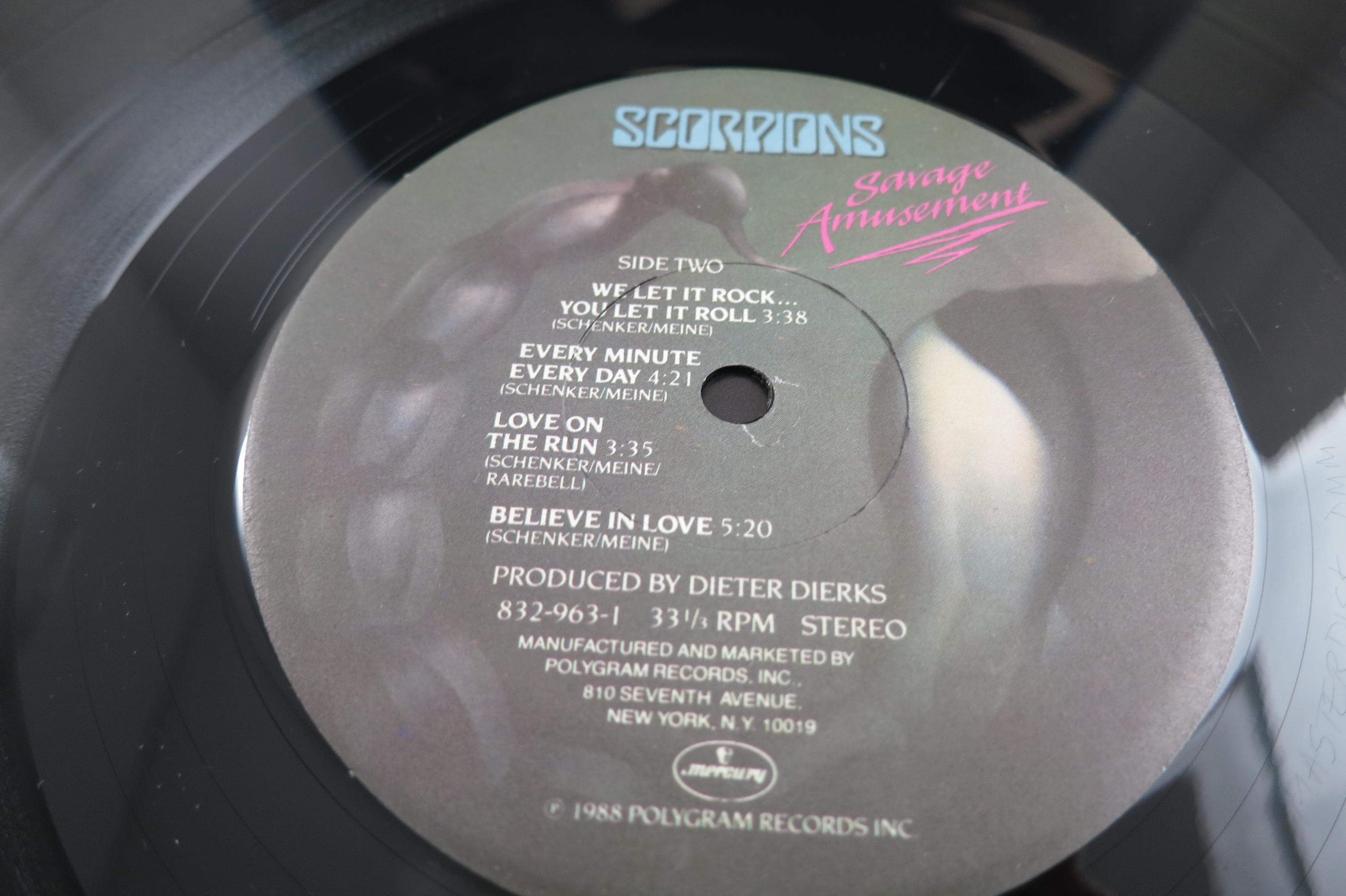 Vintage 1988 Vinyl LP Record Savage Amusement Scorpions Excellent Plus Condition. Original cover is in excellent plus condition and includes the original inner paper sleeve. Record is excellent plus as well. A NICE Copy!! Tracks are as follows