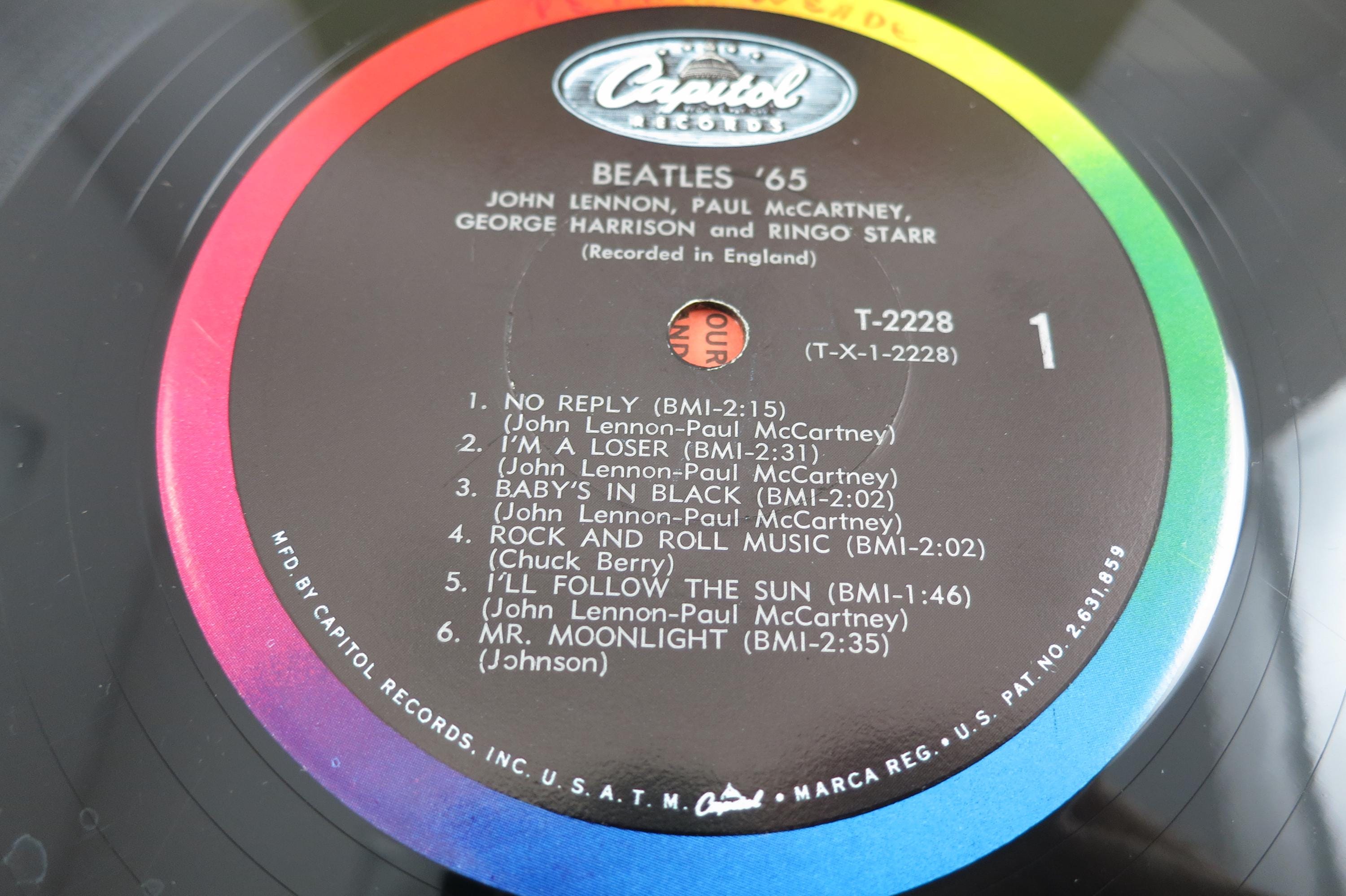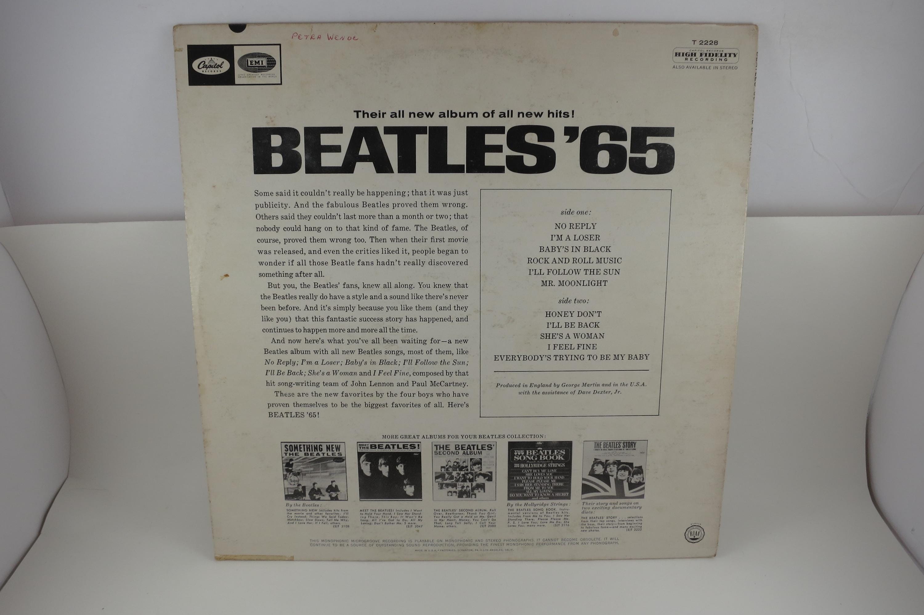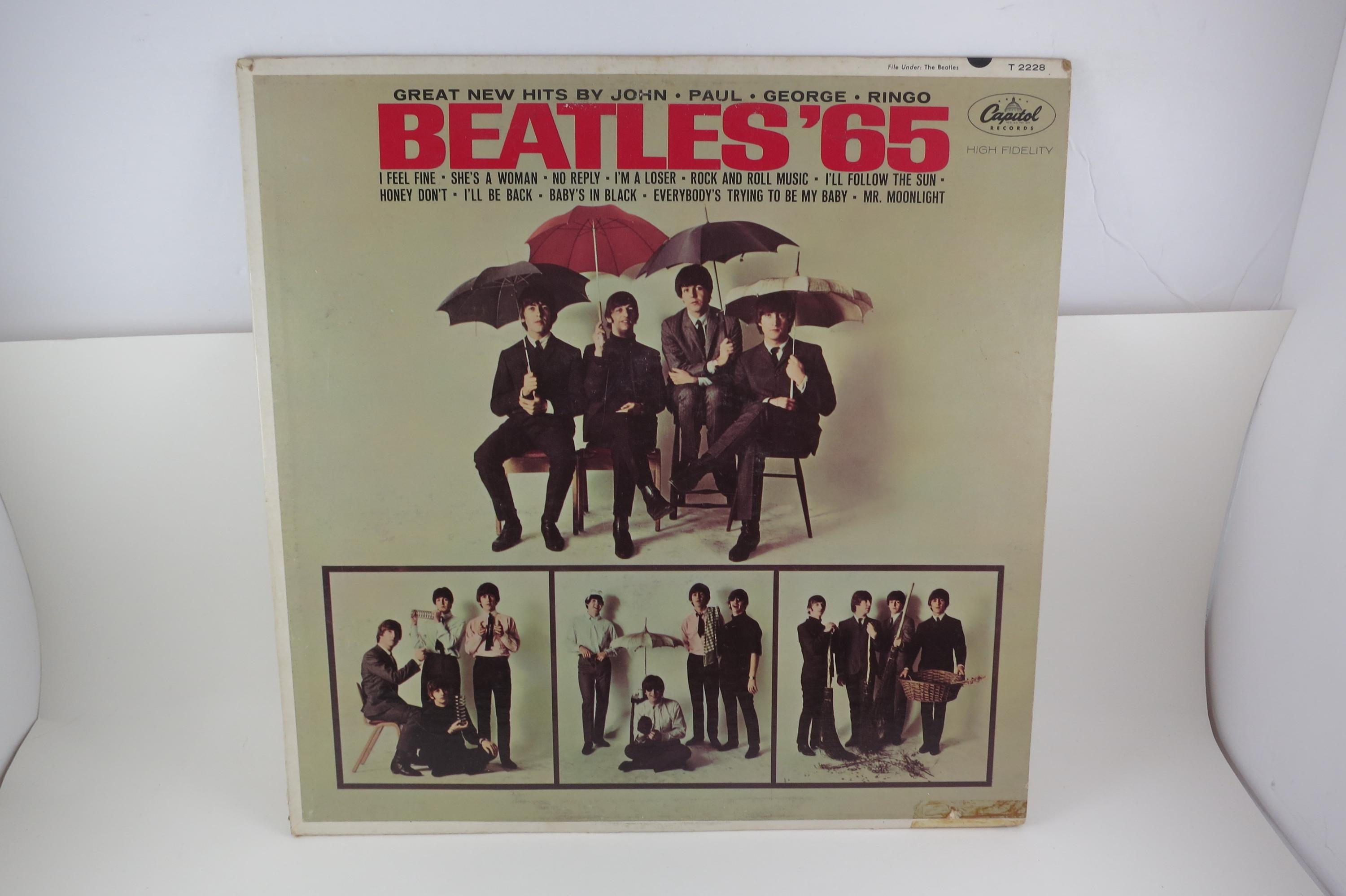 1964 Vinyl LP Record Beatles 65 The Beatles Excellent Condition Mono Version. Original cover is in excellent condition, and the record is excellent. This is the original 1964 version with the black label and color band. Perfect gift or addition to any collection. Record is in great condition and plays perfectly. Original cover is in excellent condition as well. To fault it for anything, there is a small seam split on the bottom that someone put tape on years ago. Aside from that, this is a beautiful piece!! This is an original First US Pressing of this album, hard to find!! Tracks are as follows