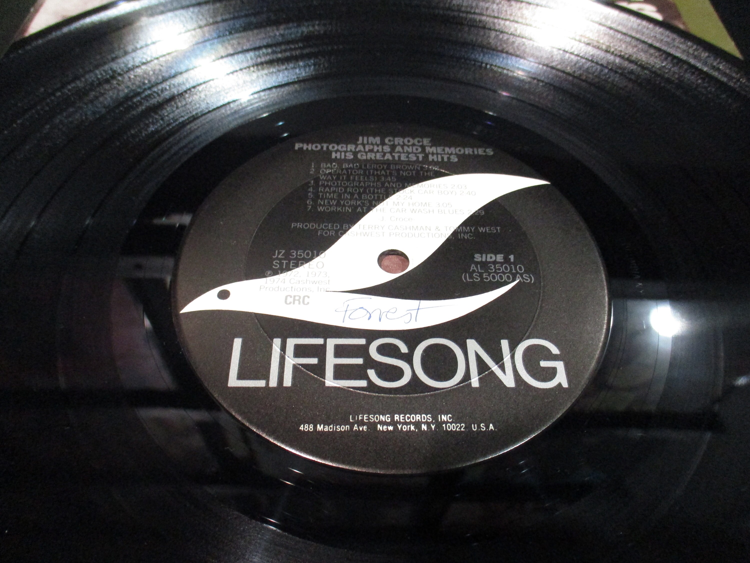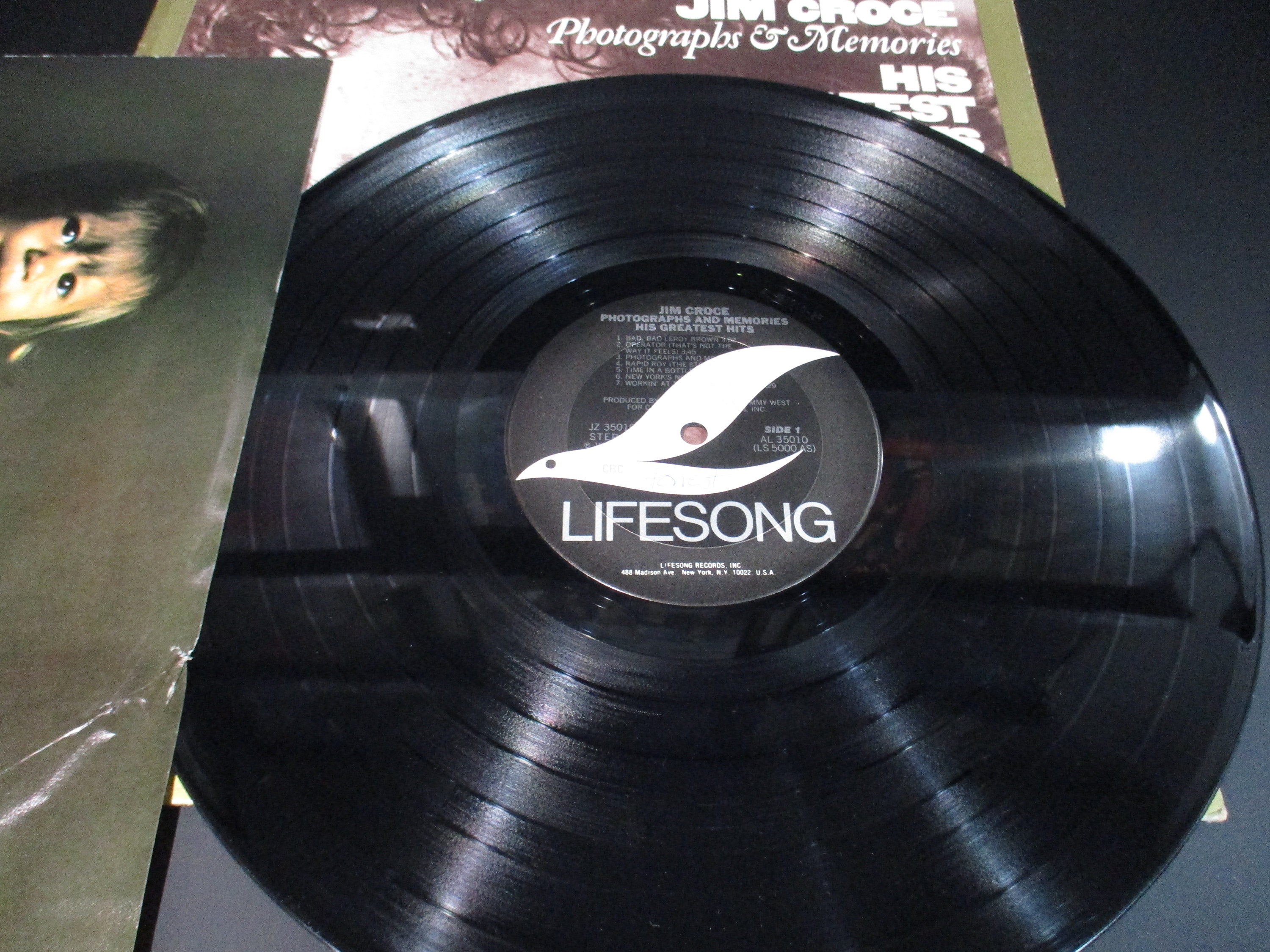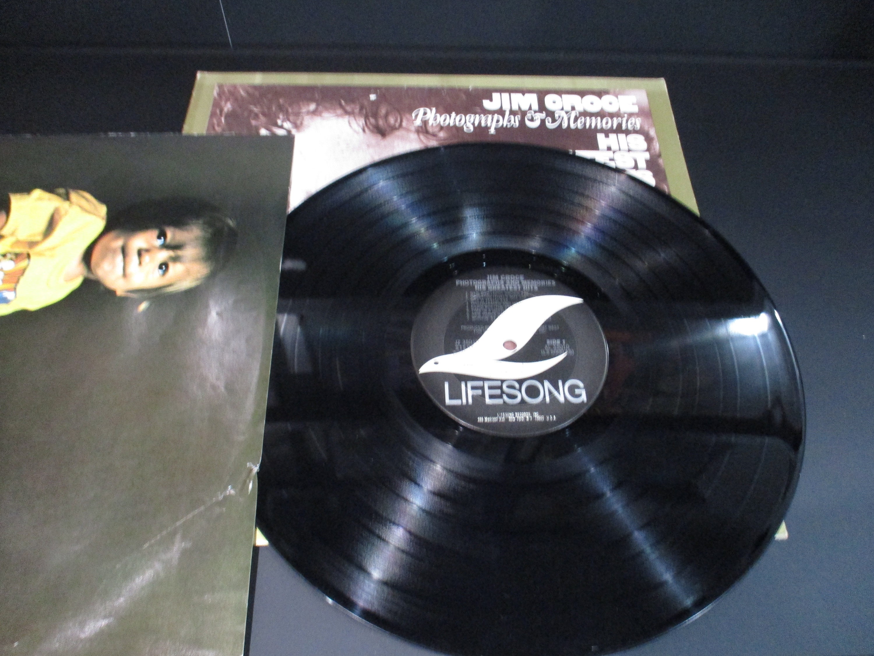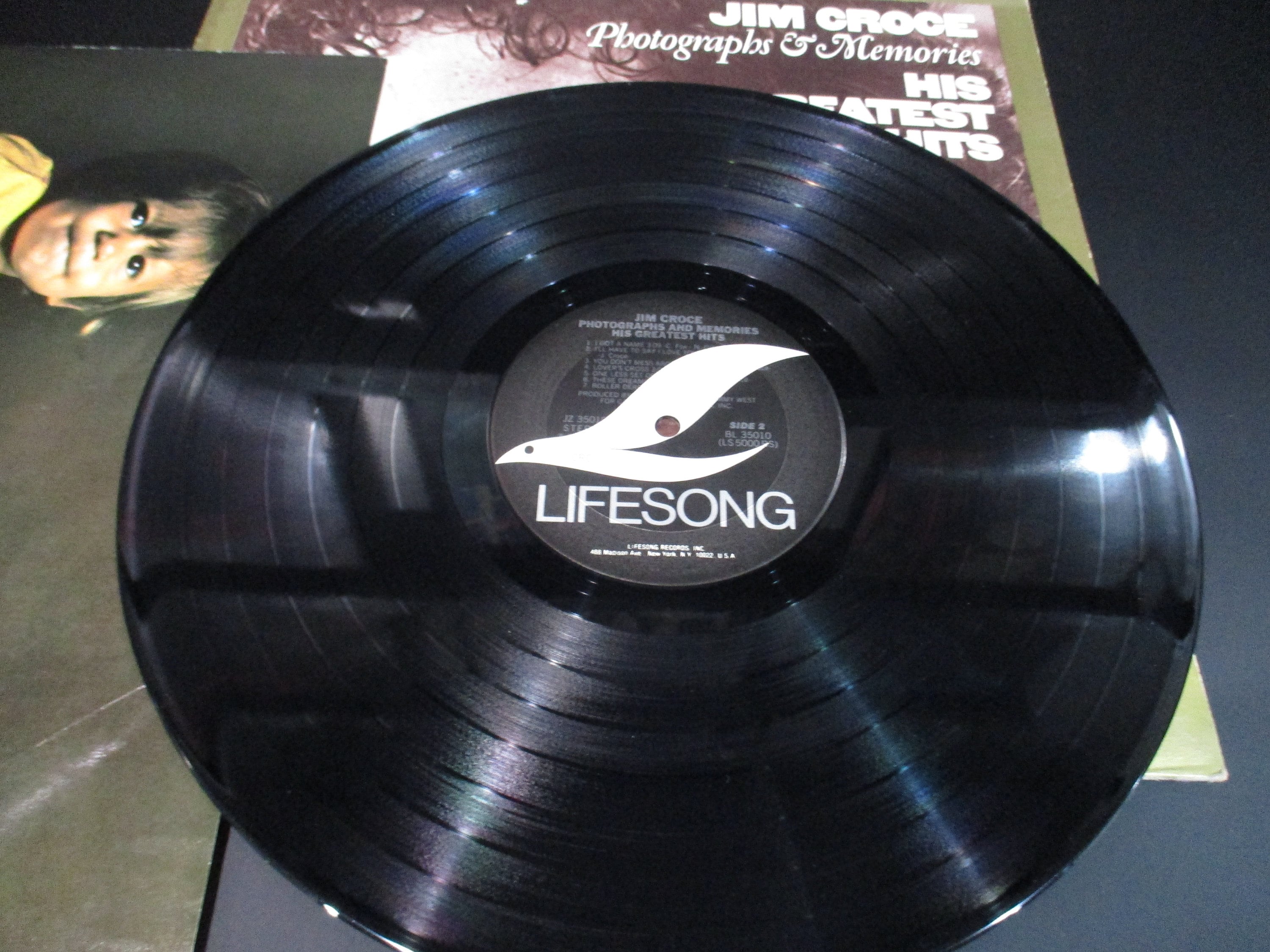 Vintage 1974 LP Record Jim Croce Photographs & Memories His Greatest Hits. Original cover is very good and includes the original inner paper sleeve. Cover has a crease bottom right. Record is Near Mint. Tracks are as follows