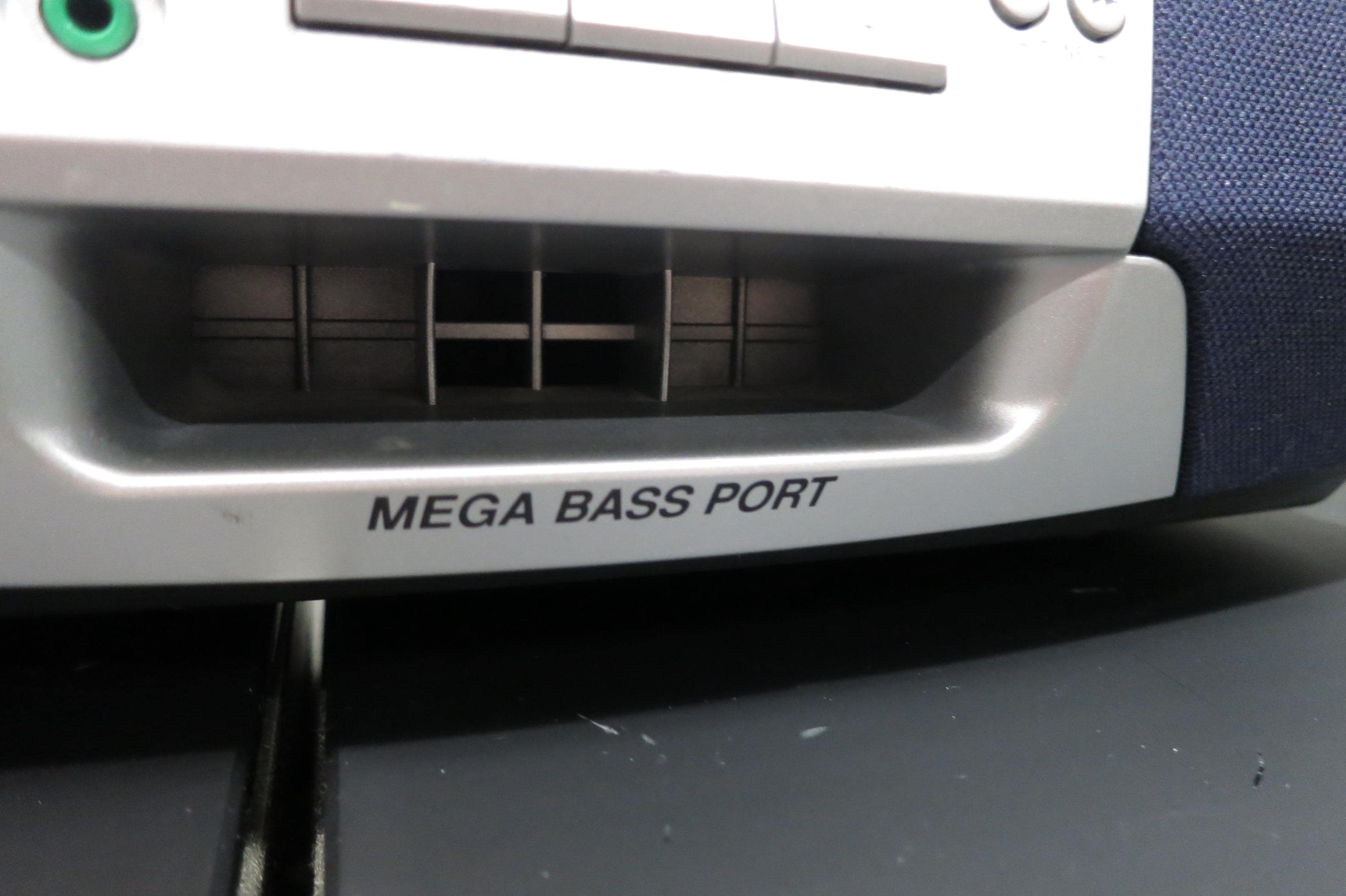 Features a digital tuner, black digital Display, Mega Bass, Carrying Handle, sound equalizer, Mono and Stereo Mode and headphone input, as well as the original remote control. Measures 16 inches wide, 8 inches deep and 6 inches tall. Very Nice Boom Box with great sound.