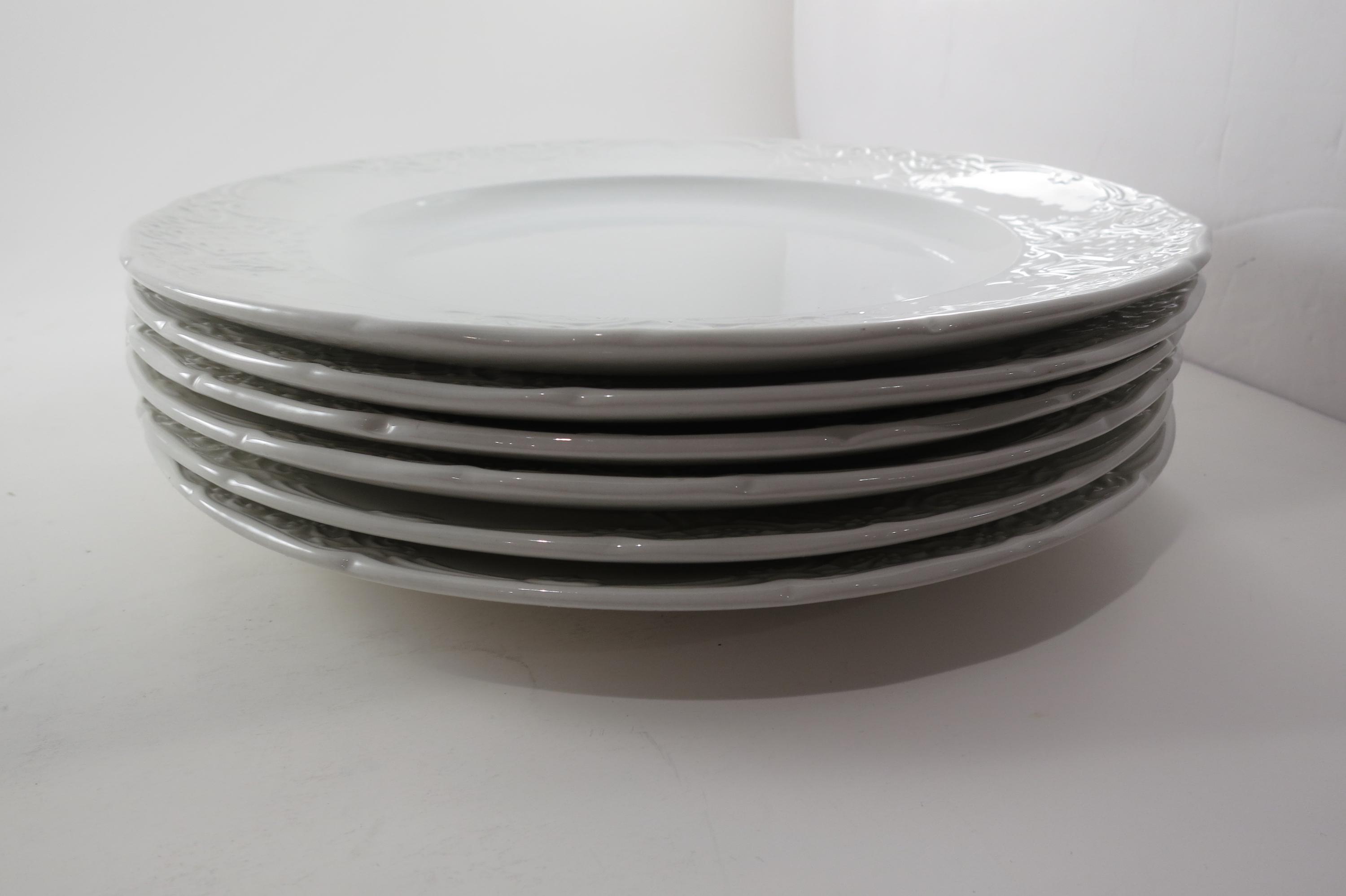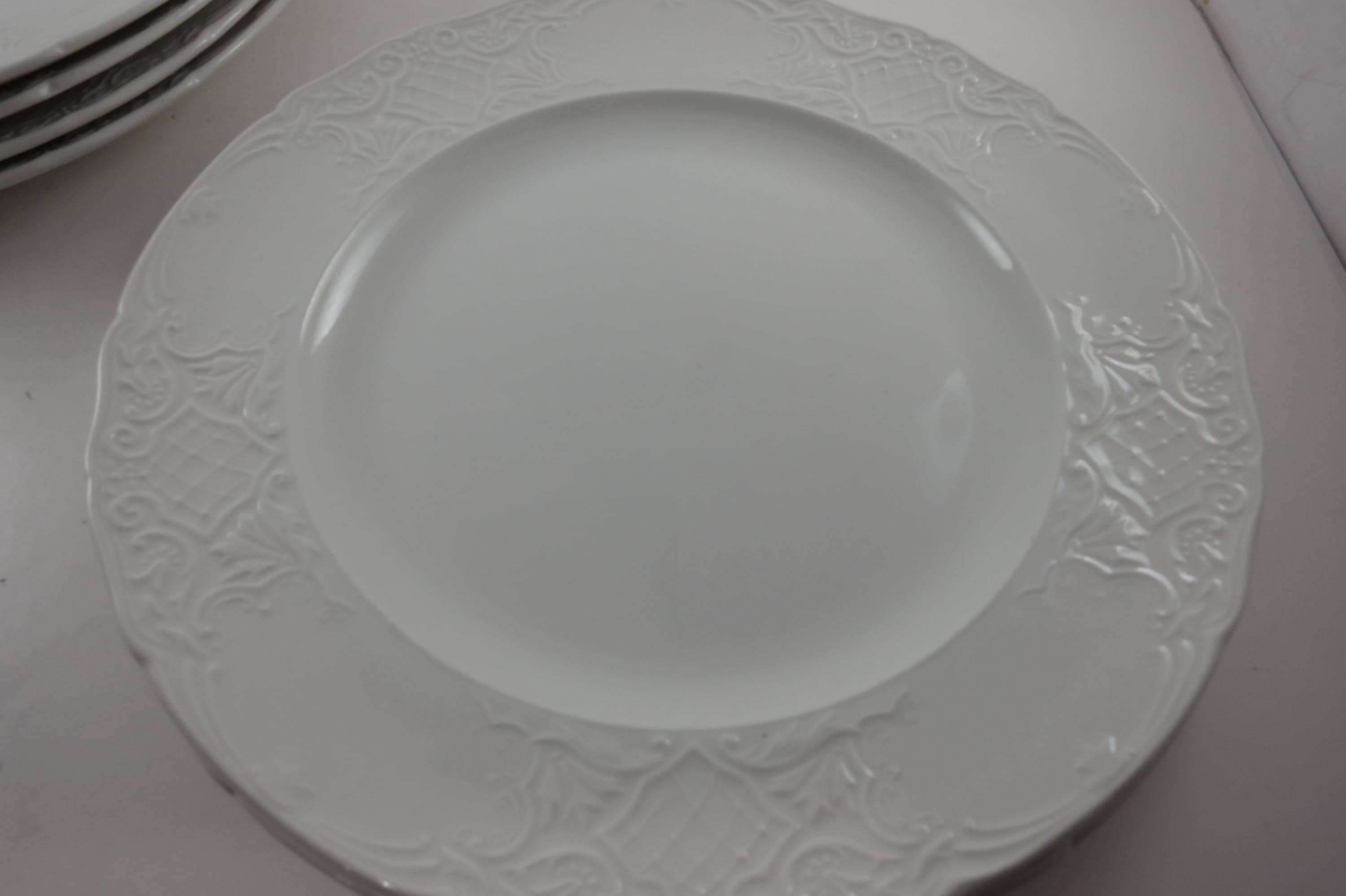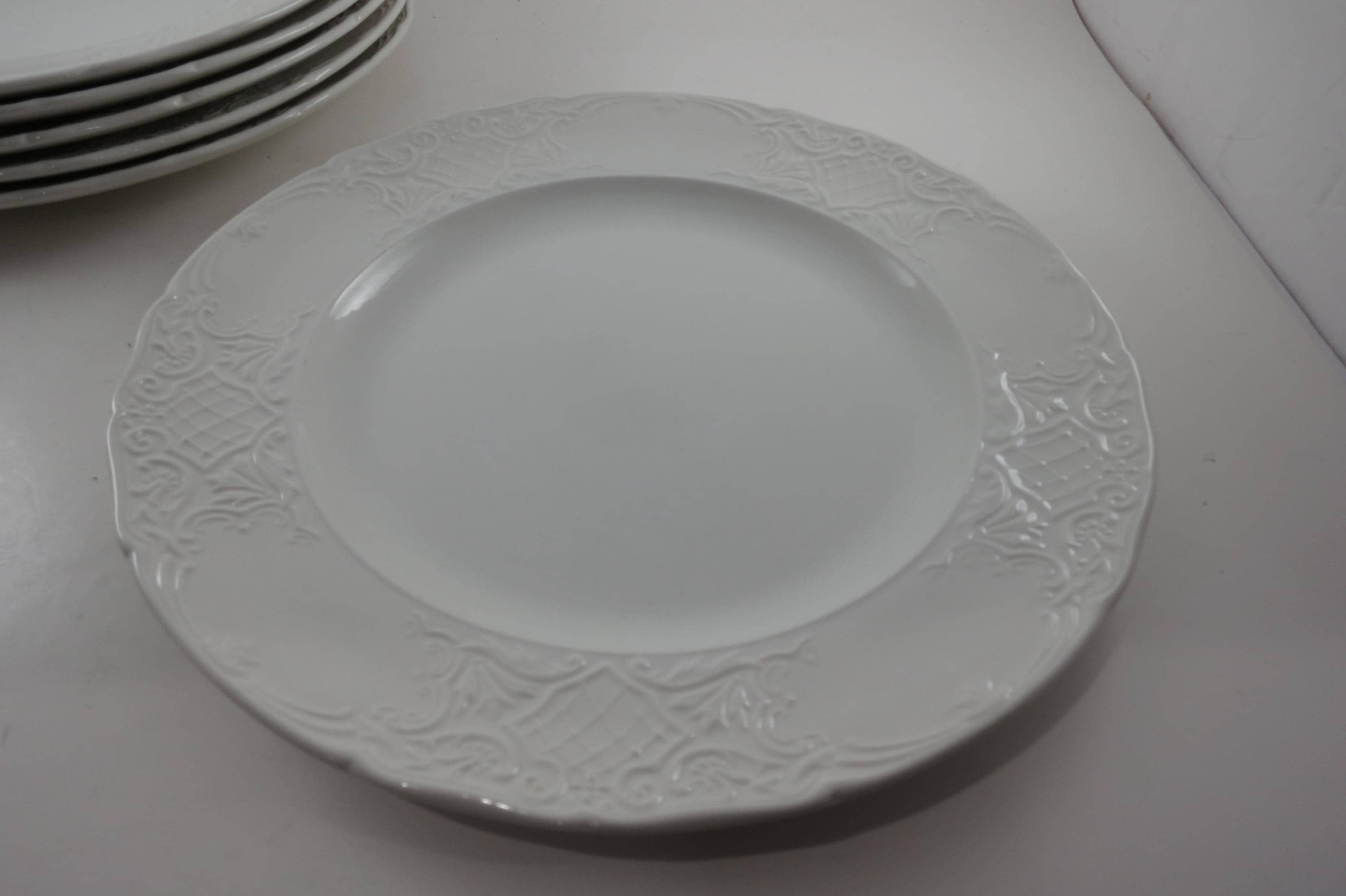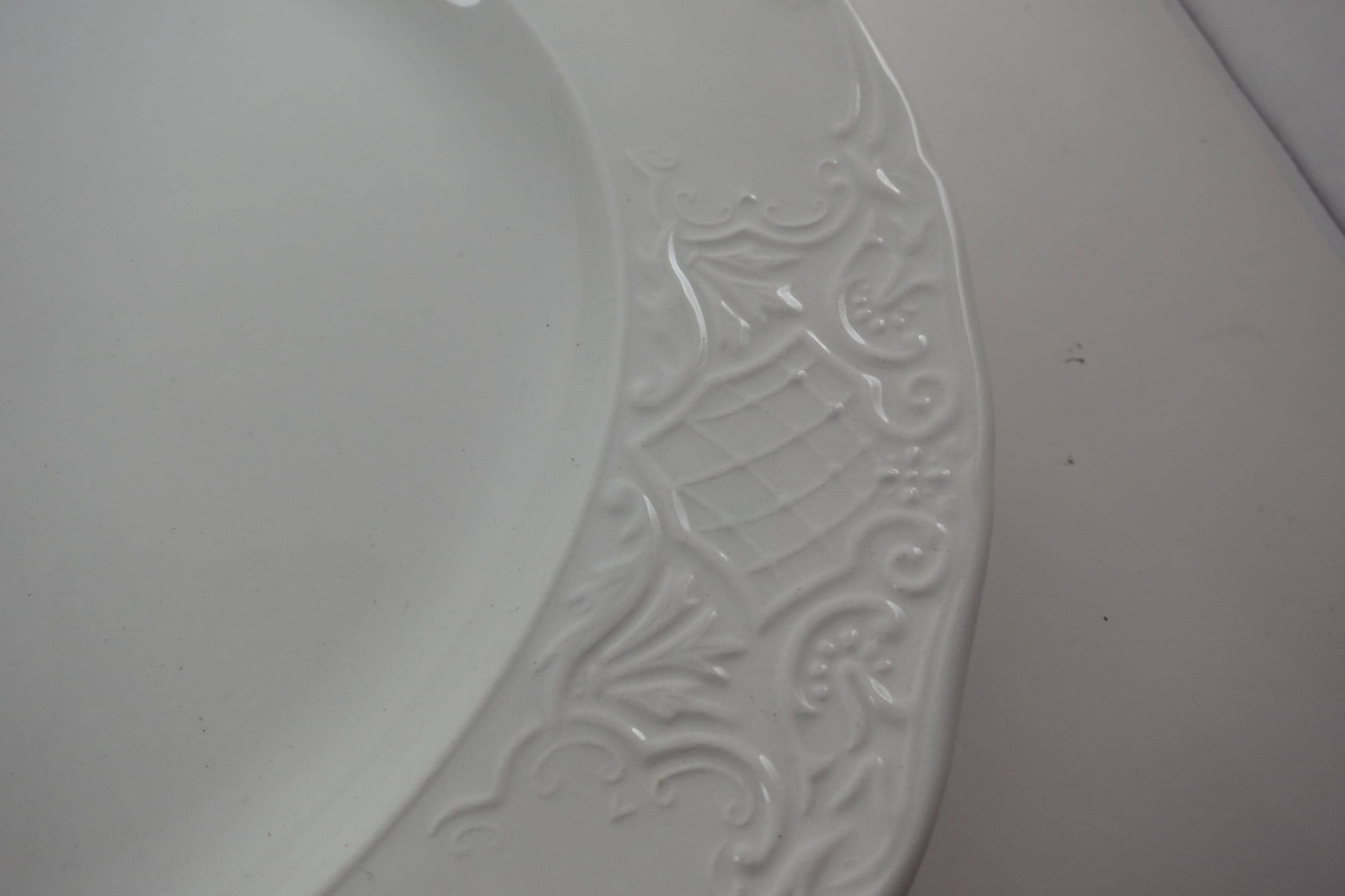 These beautiful plates have an embossed rim edge and are solid white. Made in England.