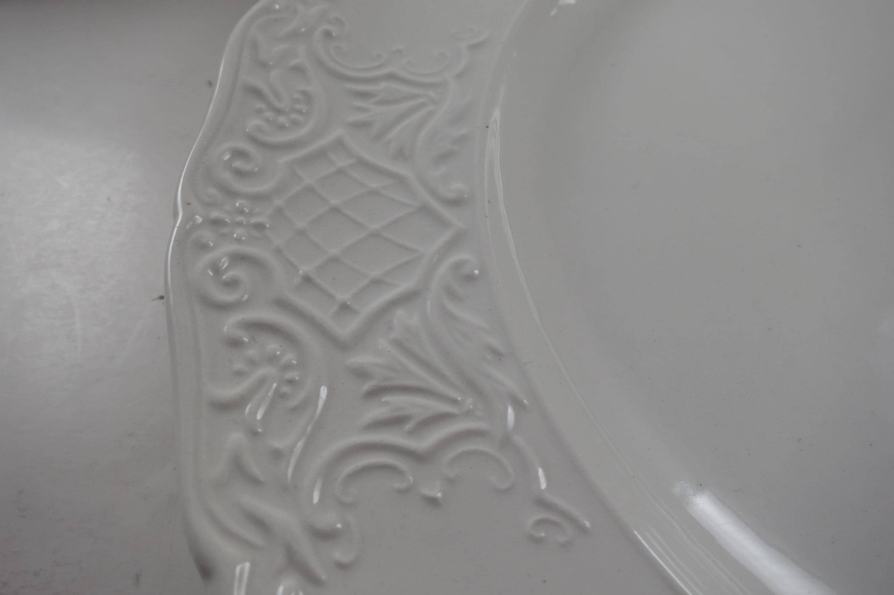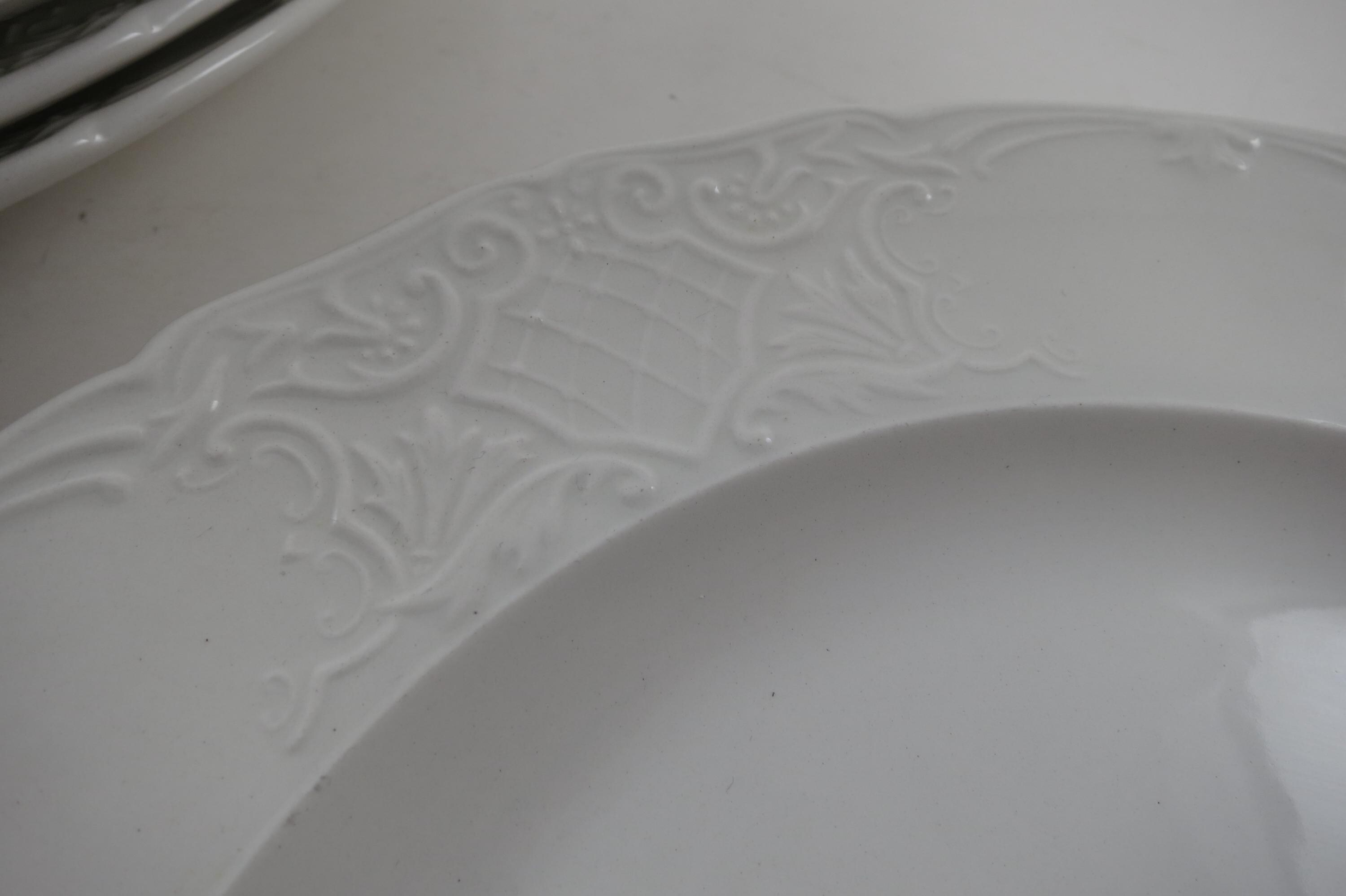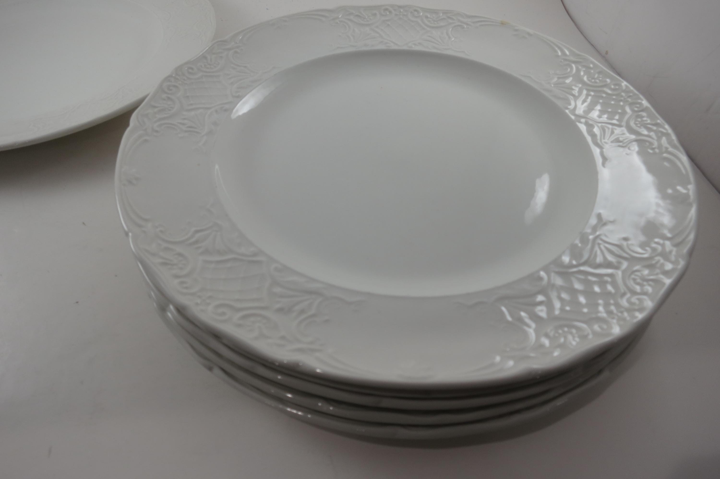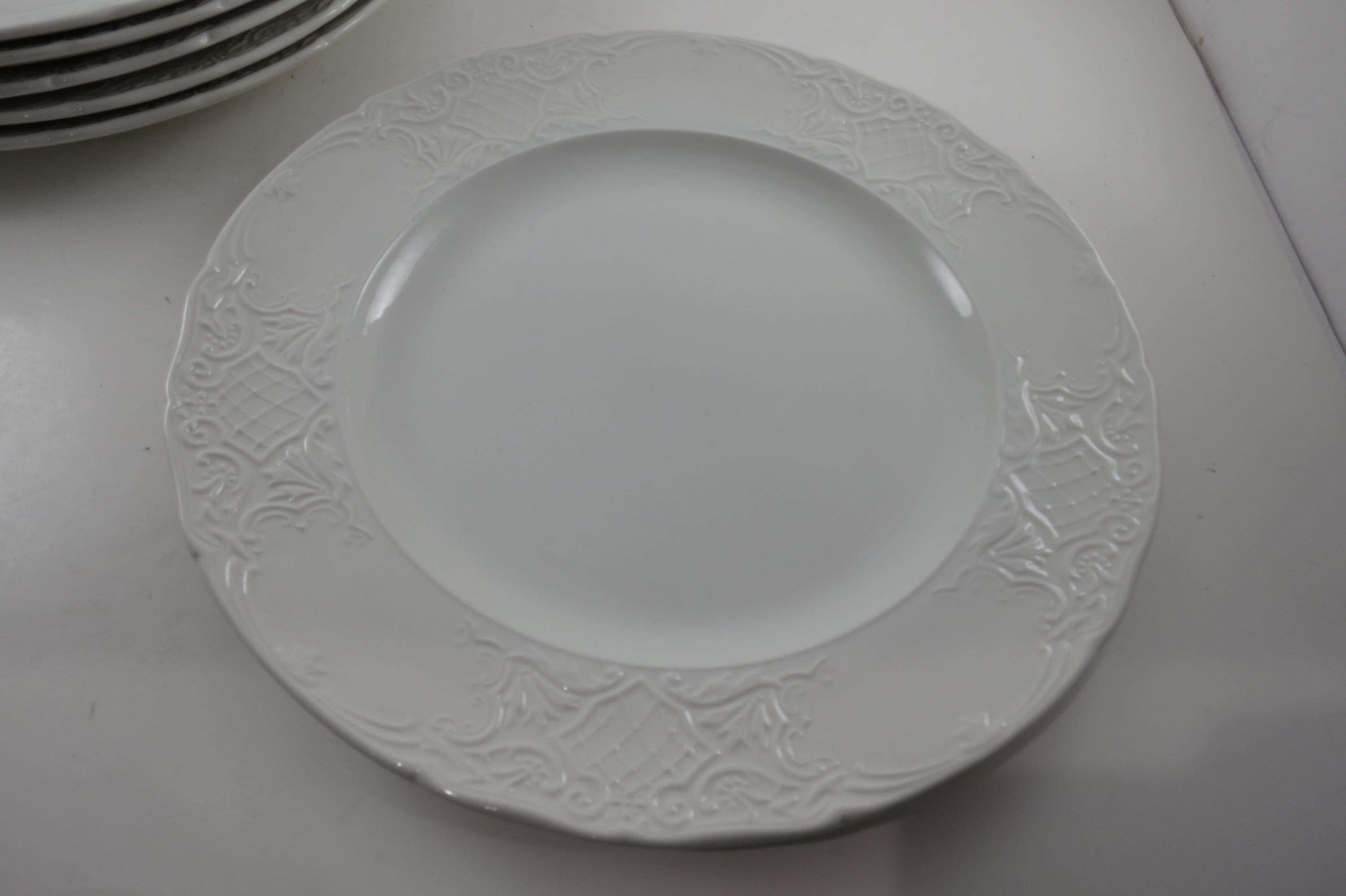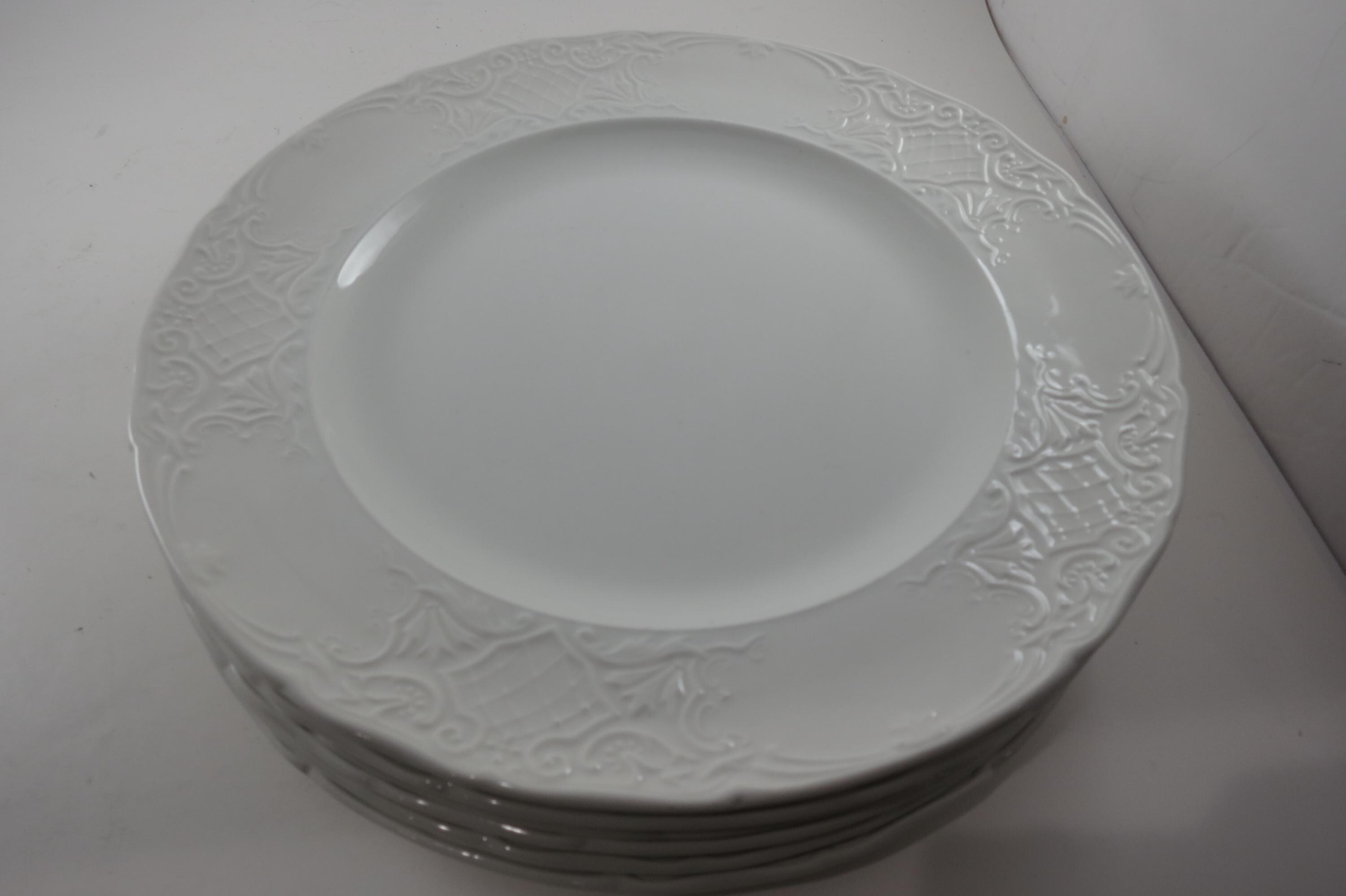 These beautiful plates have an embossed rim edge and are solid white. Made in England.