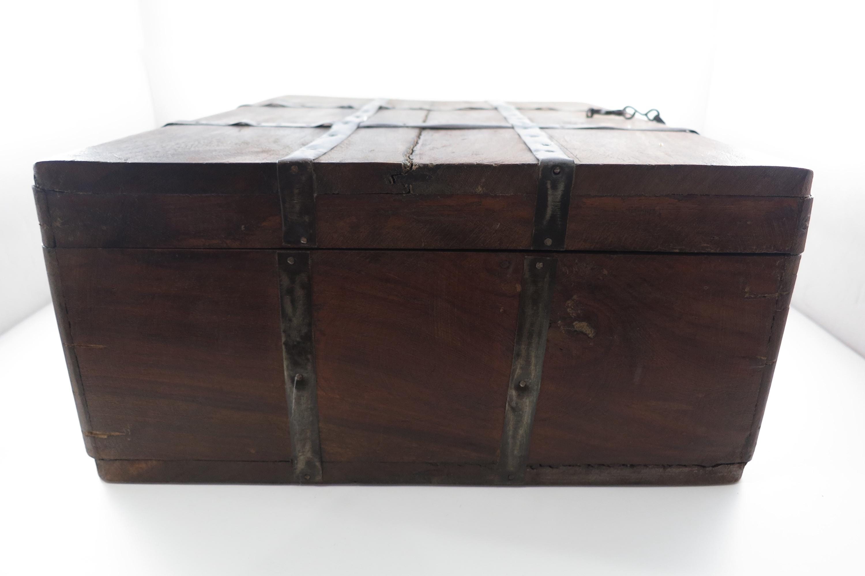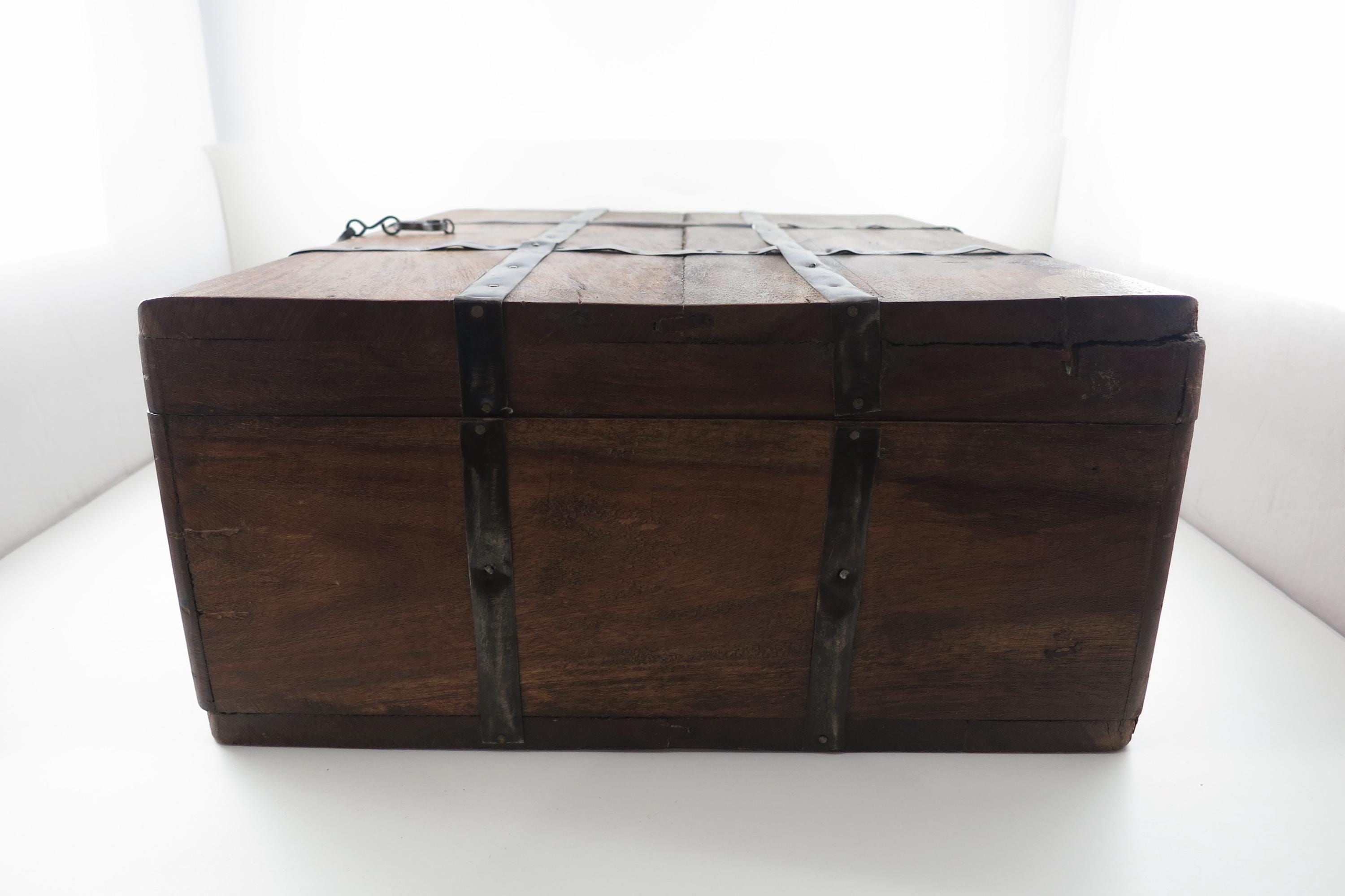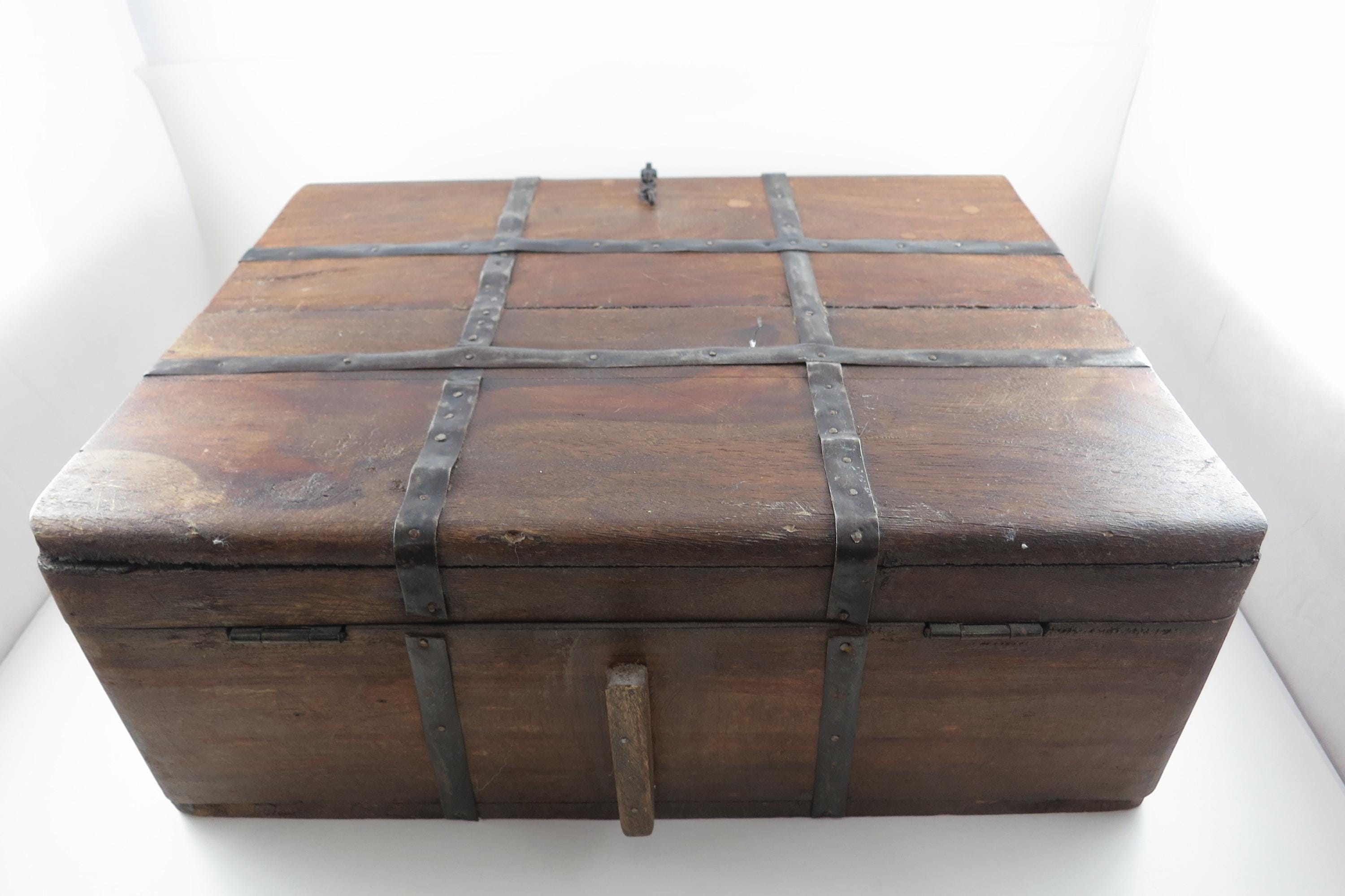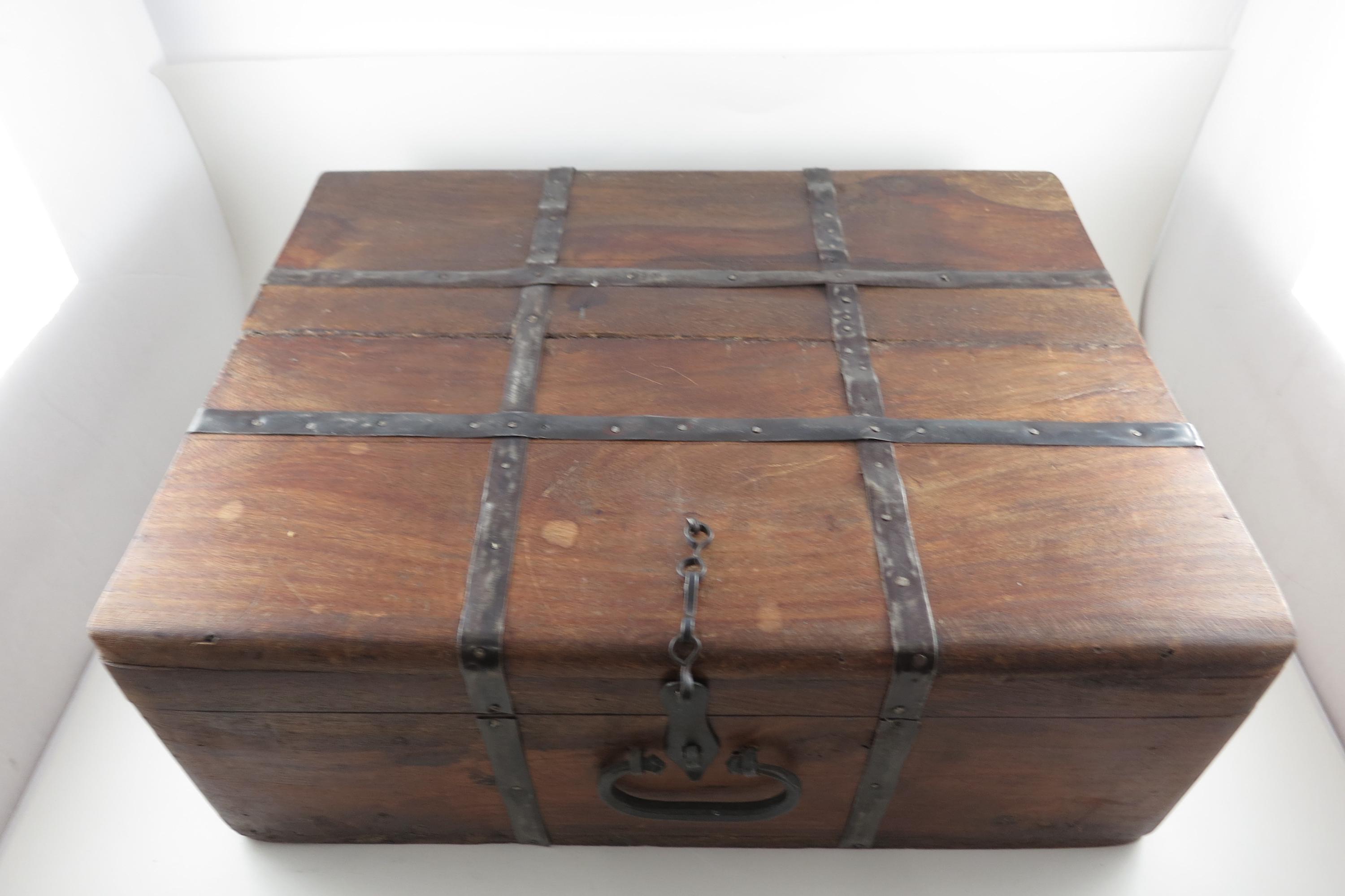 Antique Wooden Treasure Keepsake Storage Box with Metal Bands and Latch