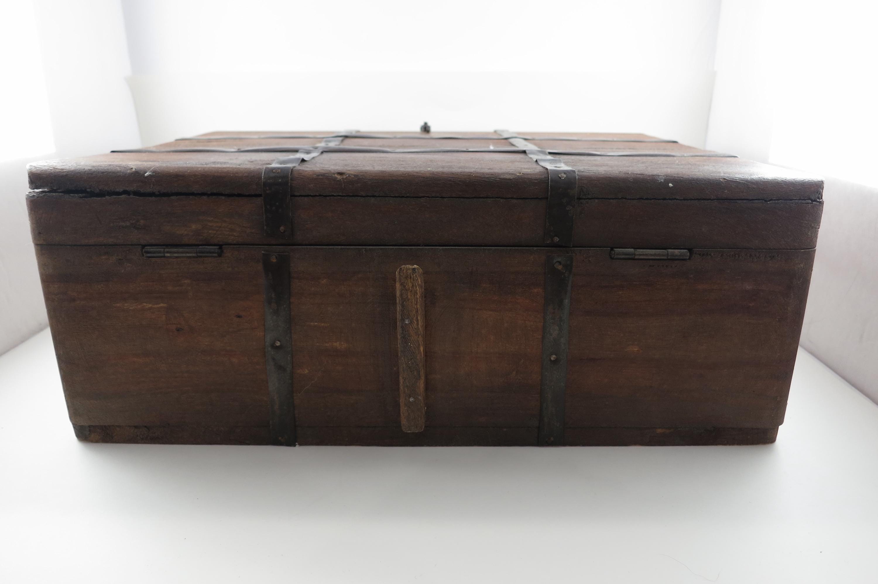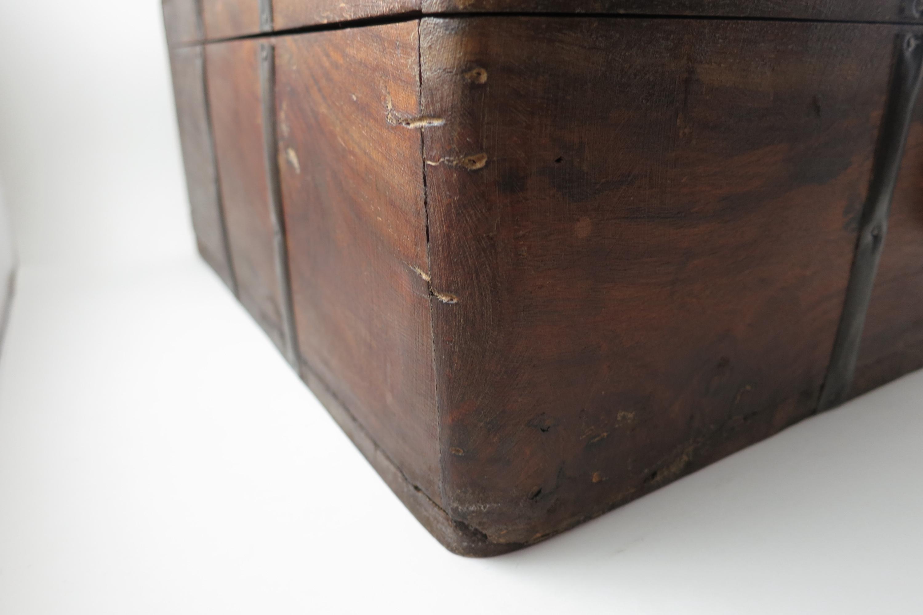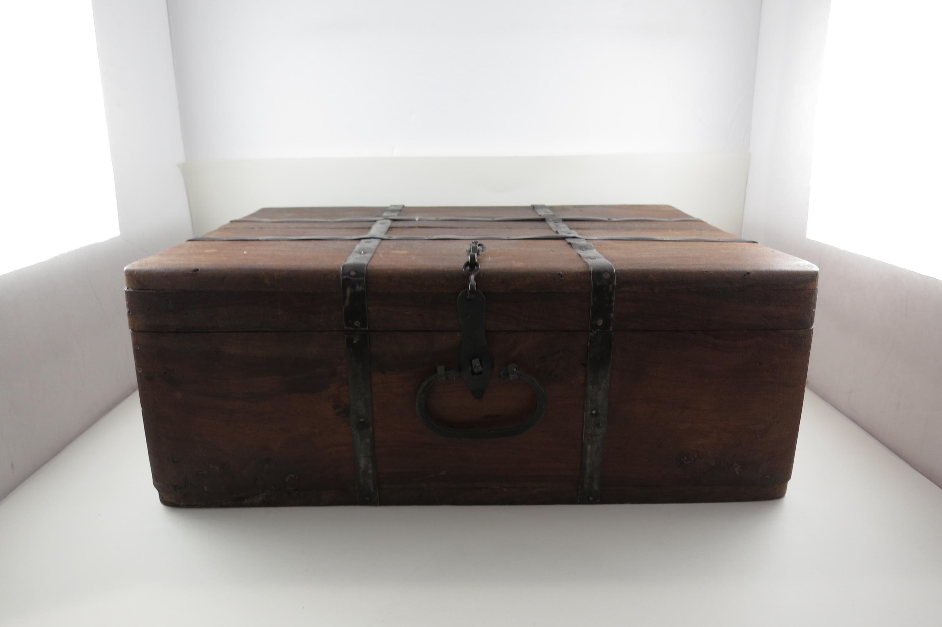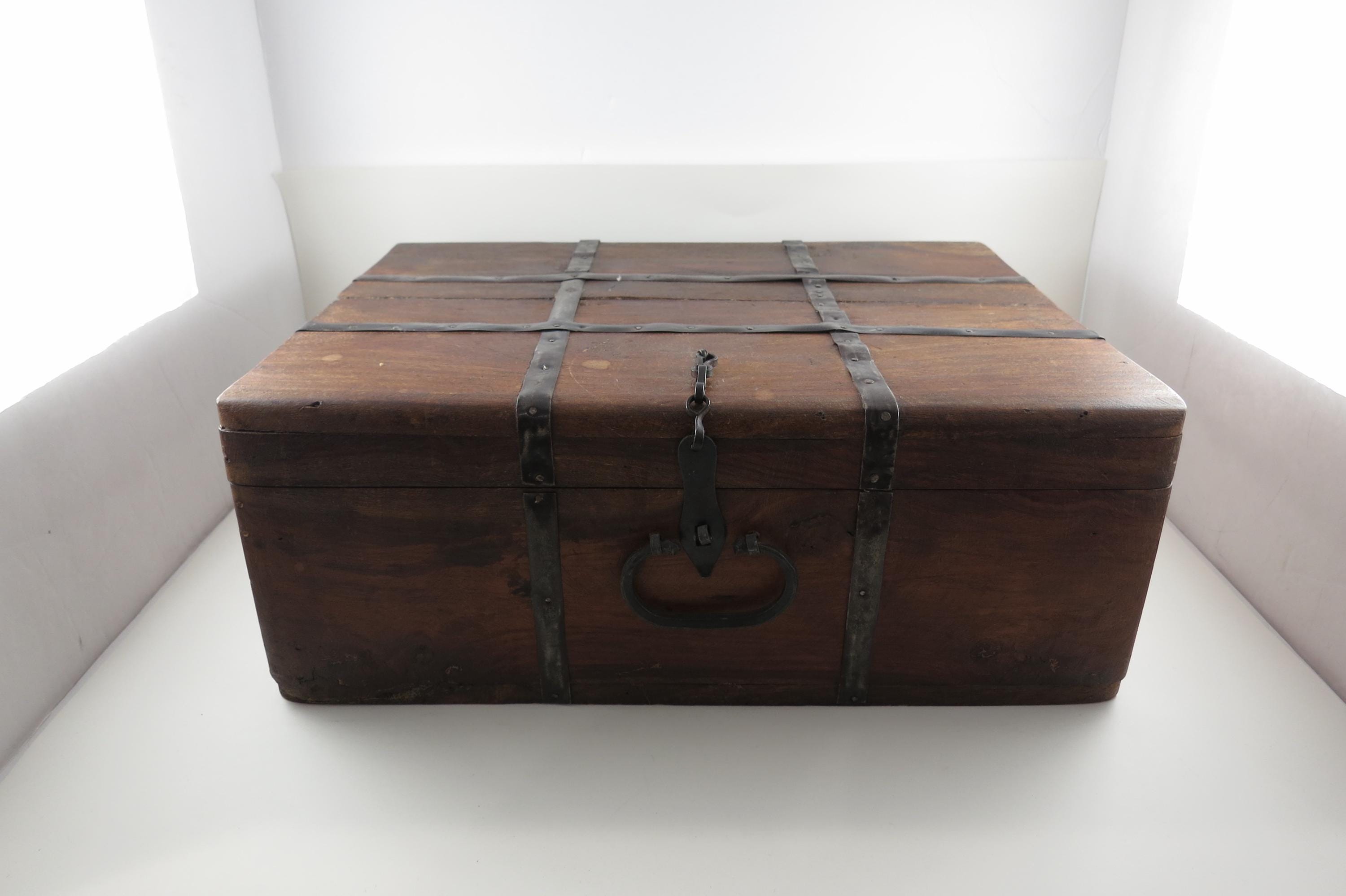 Antique Wooden Treasure Keepsake Storage Box with Metal Bands and Latch