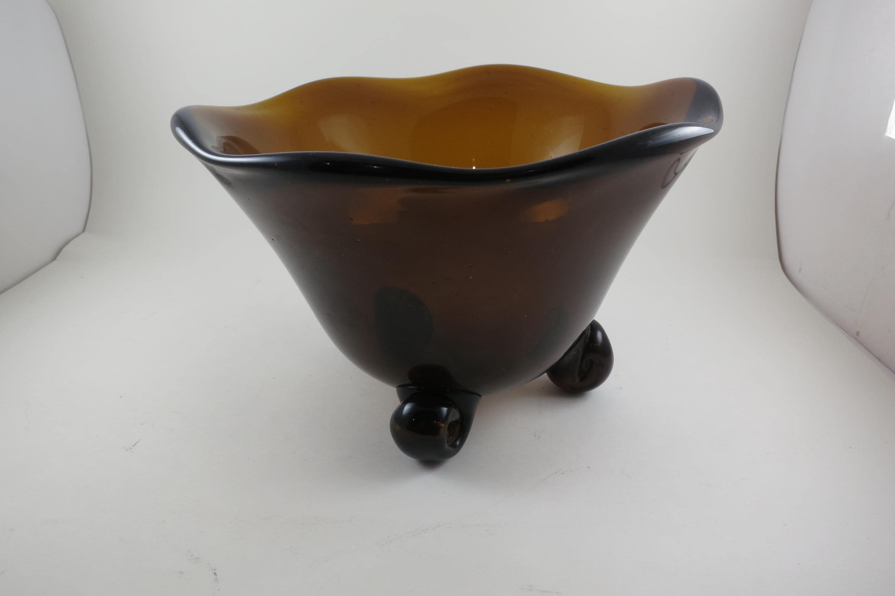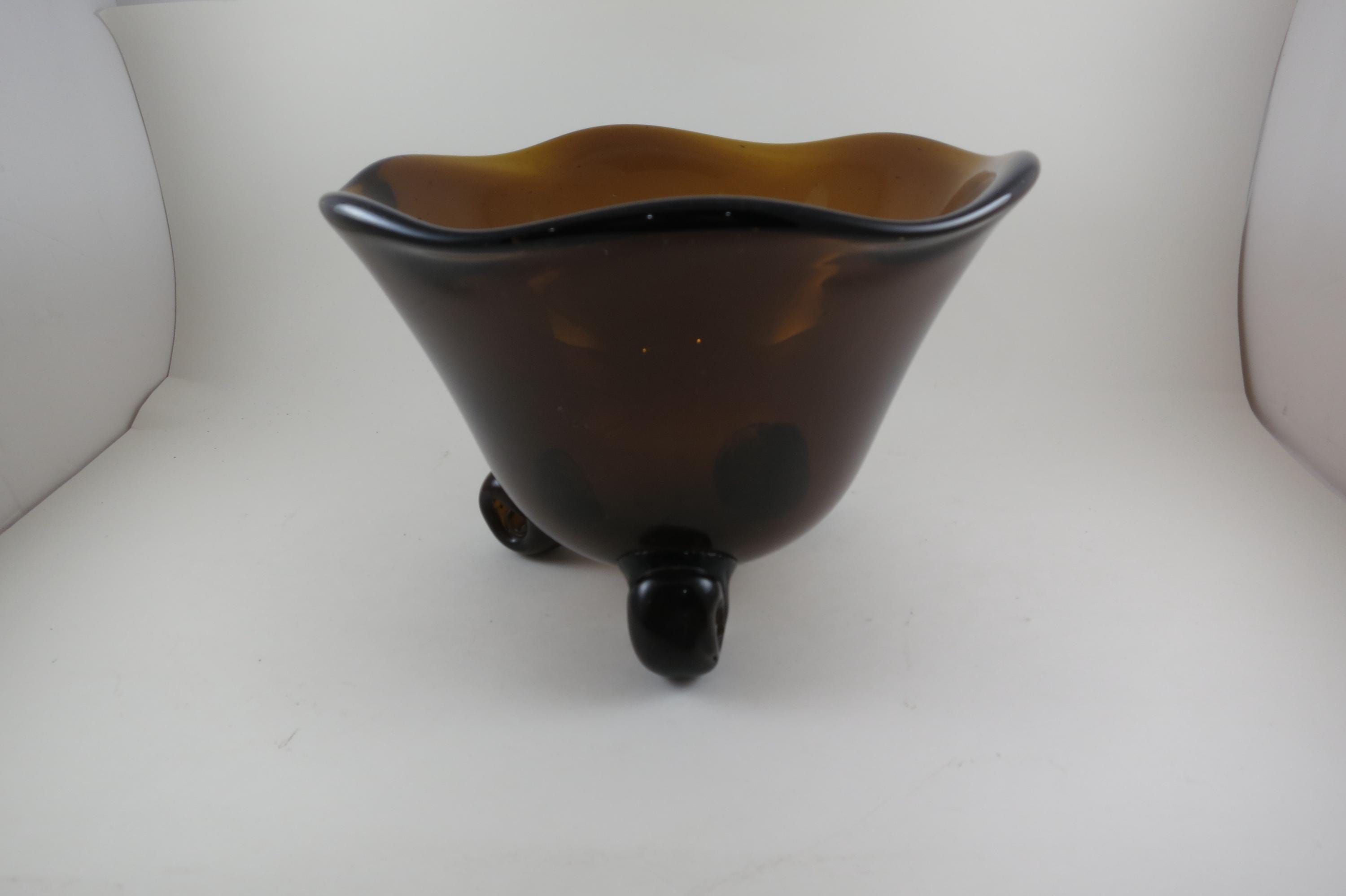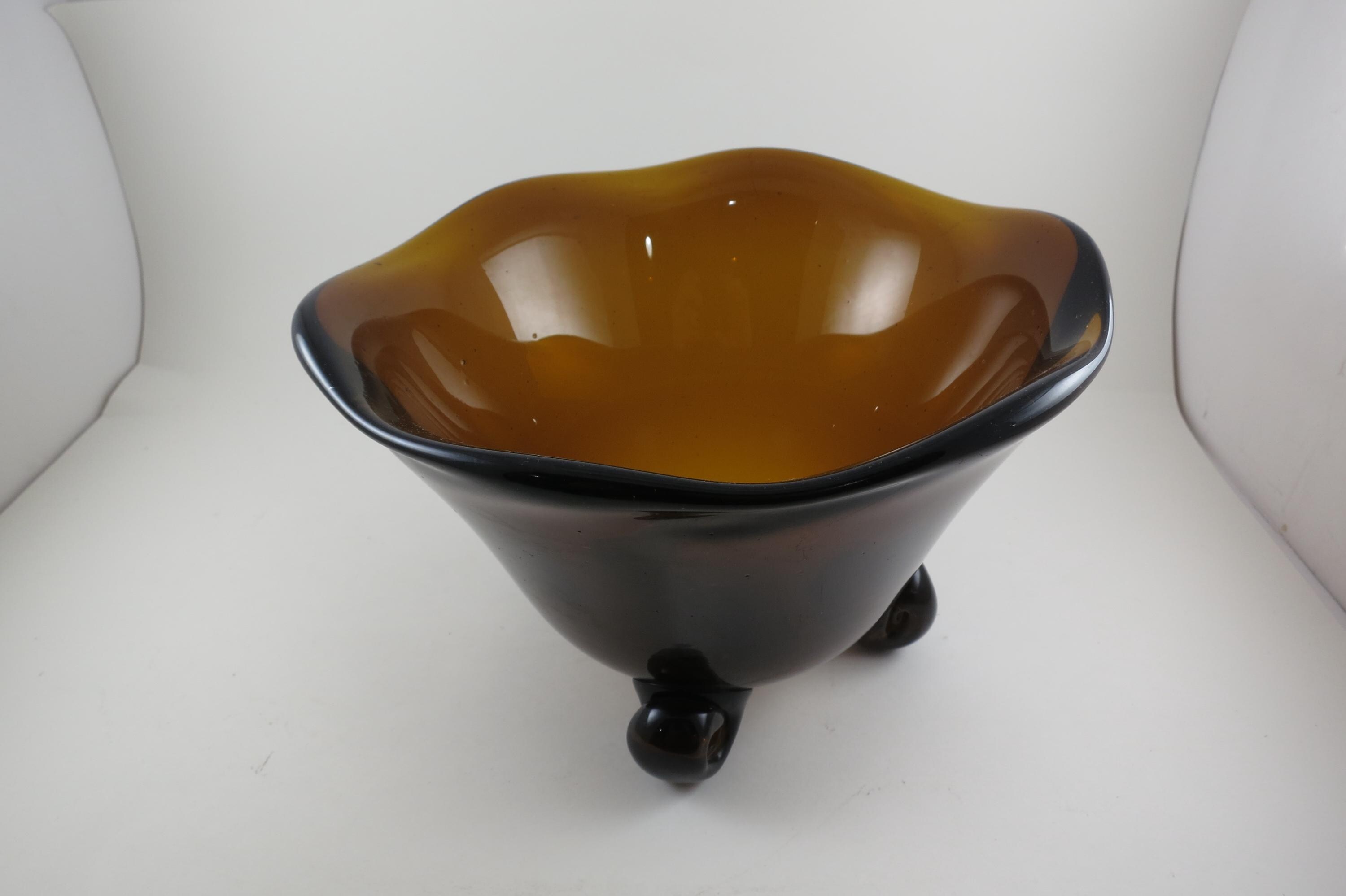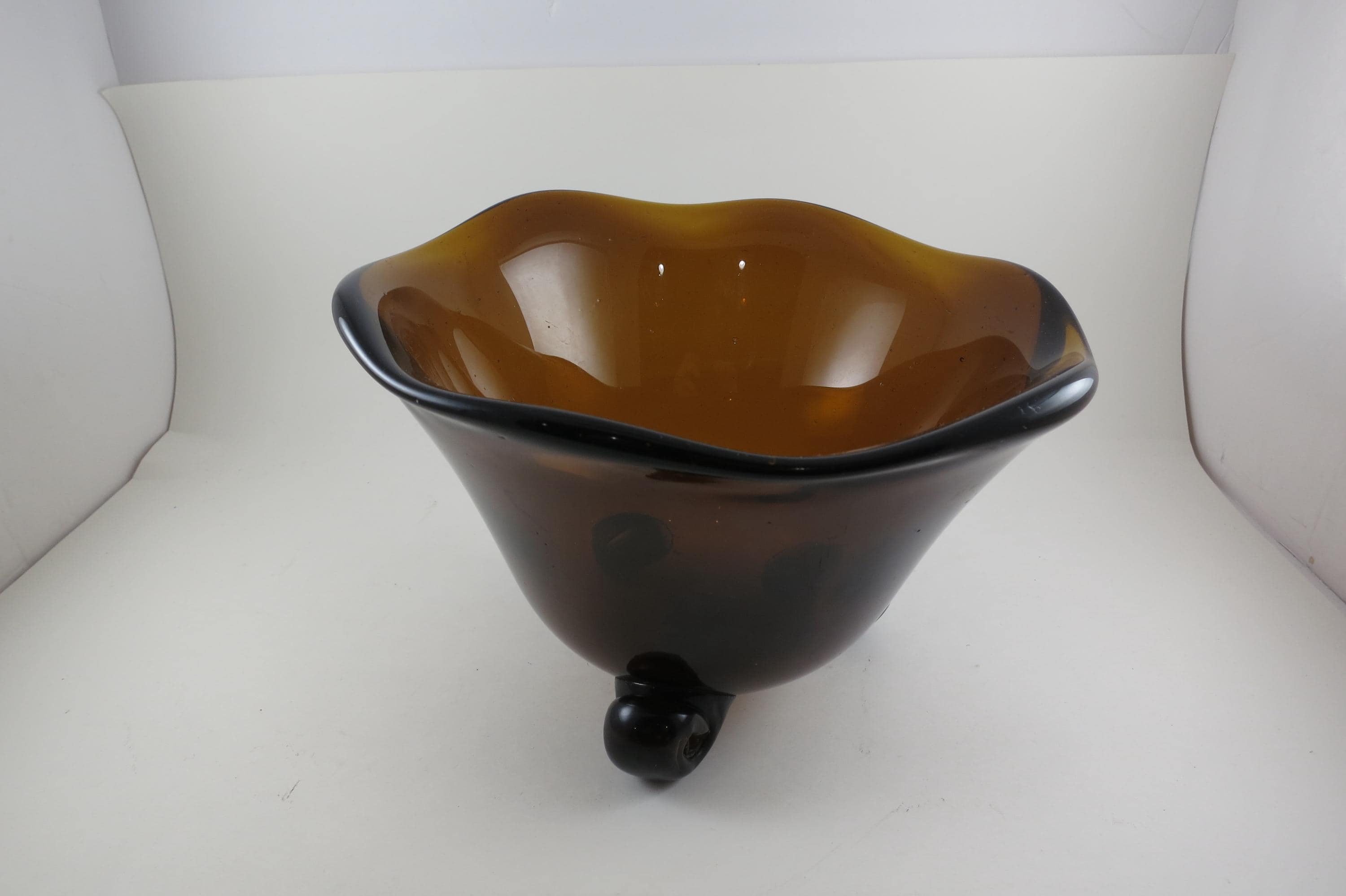 Vintage Hand Blown Amber Art Glass Heavy Tri Foot Bowl.