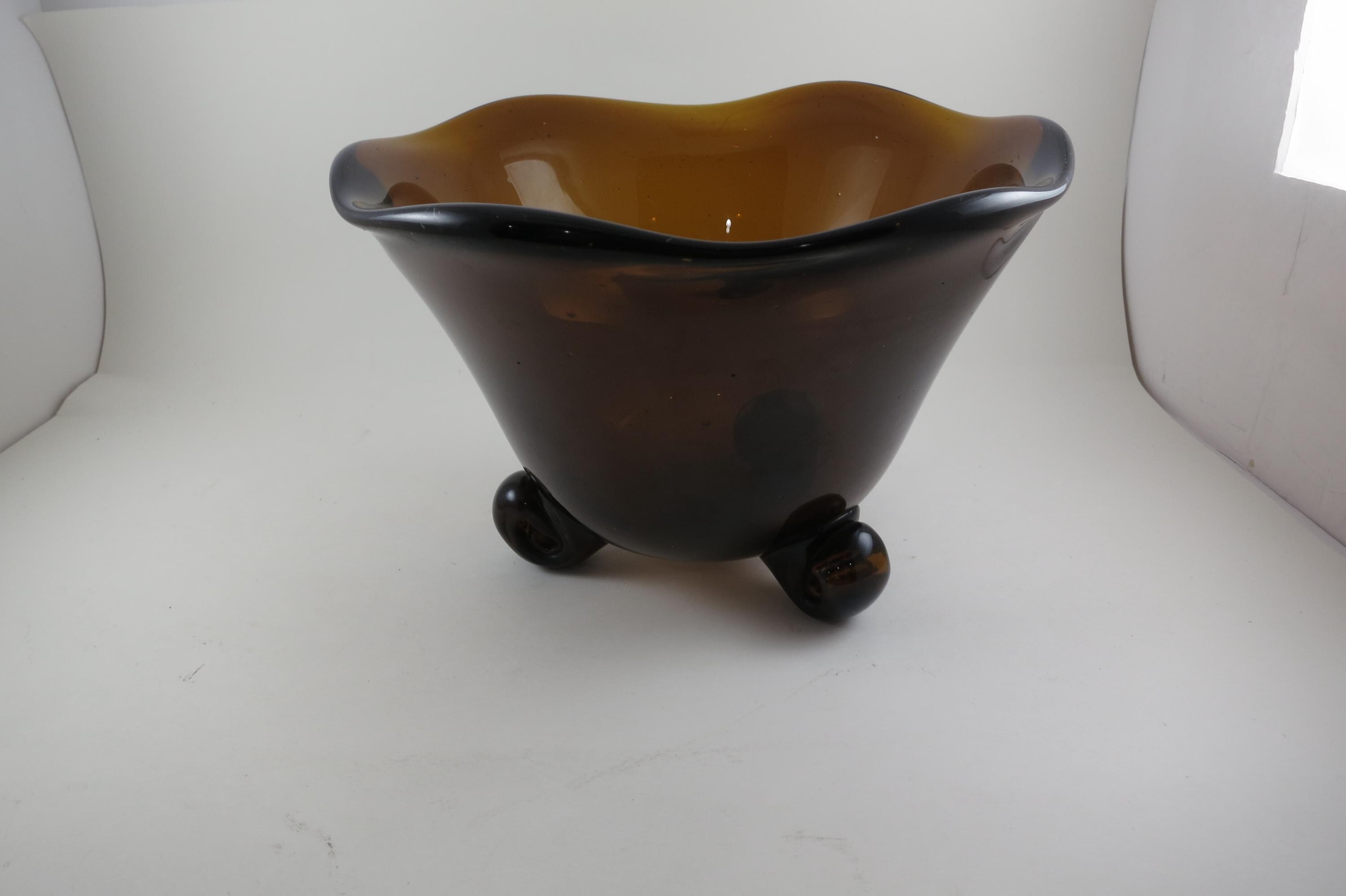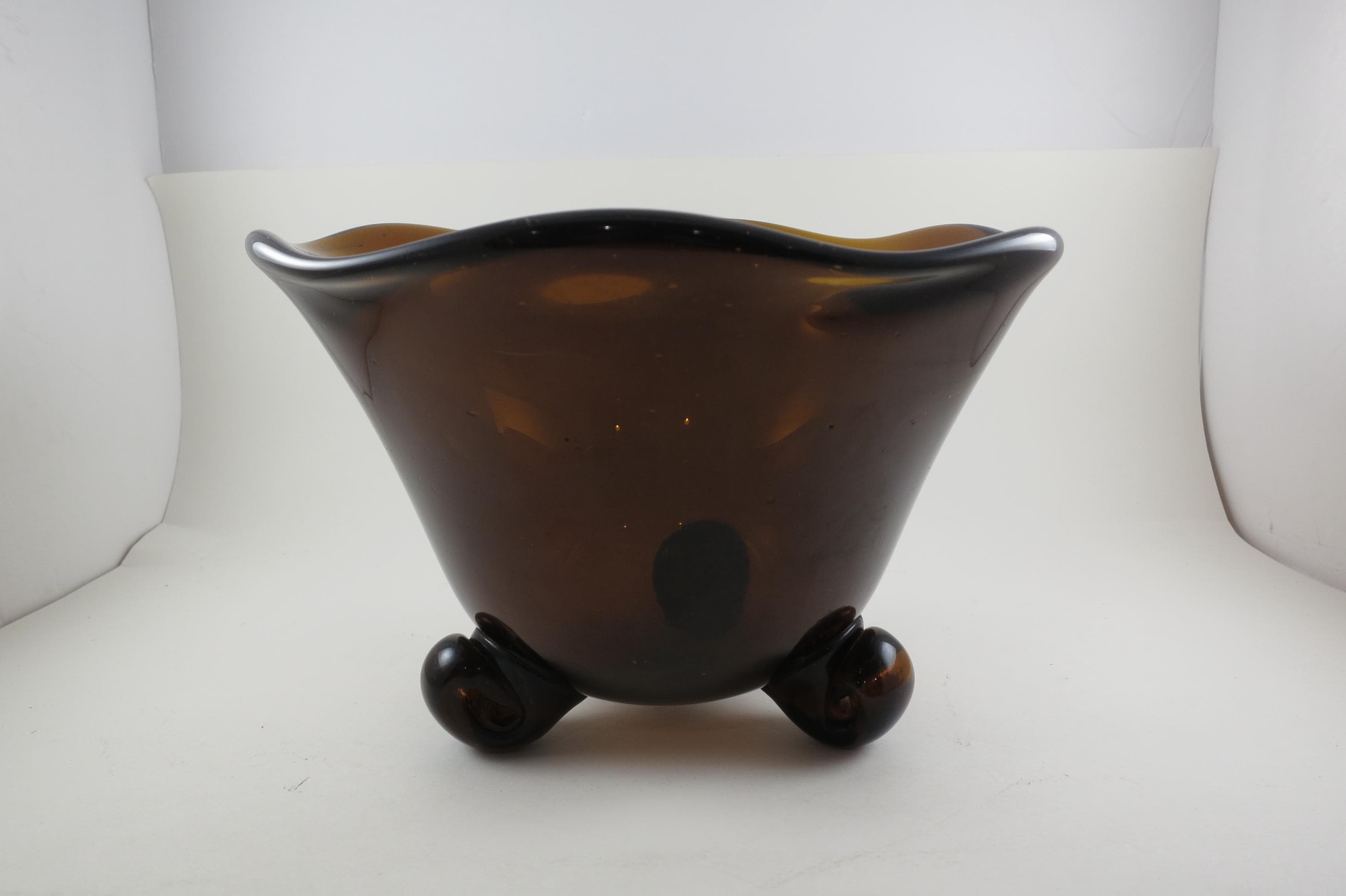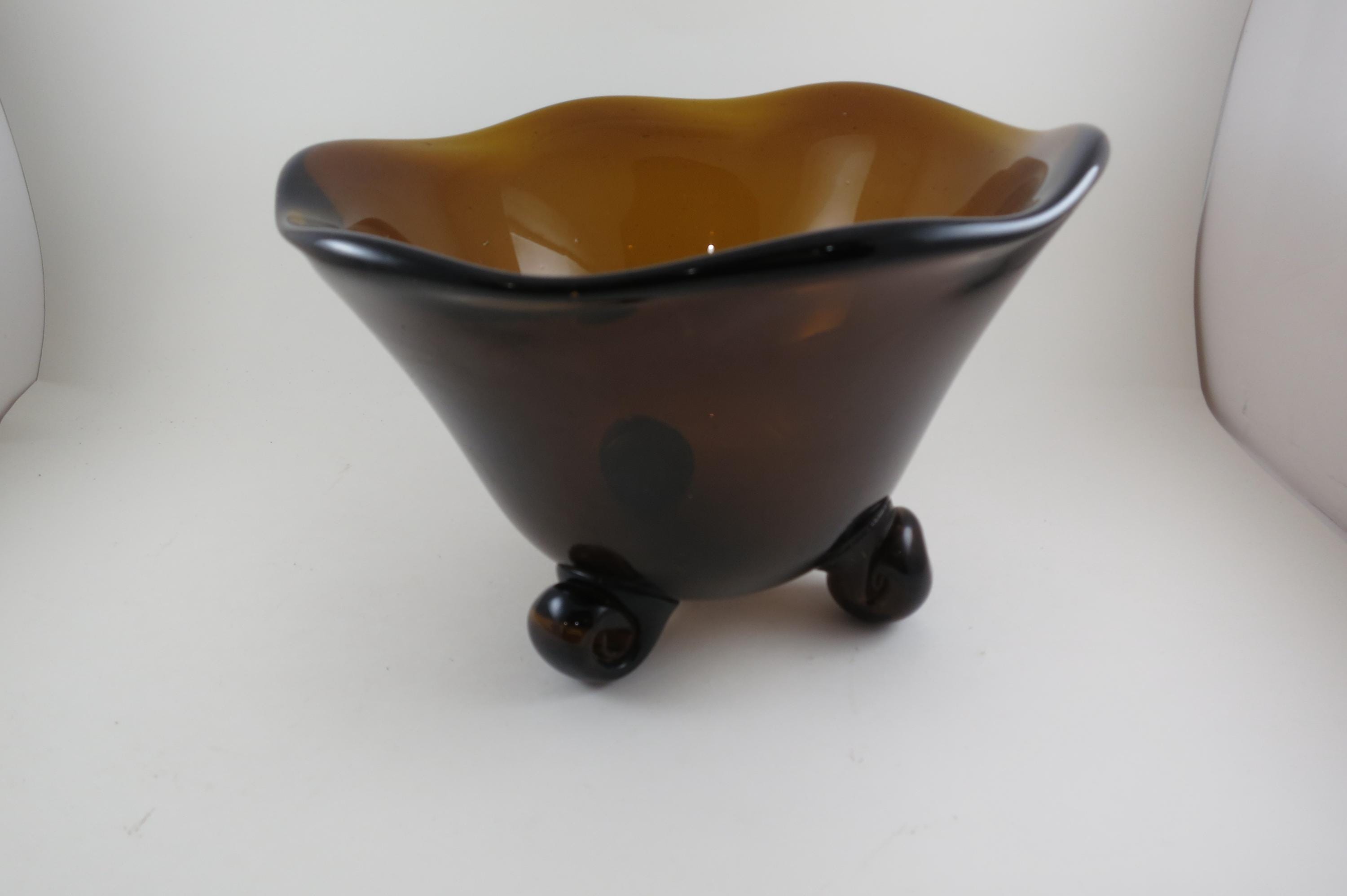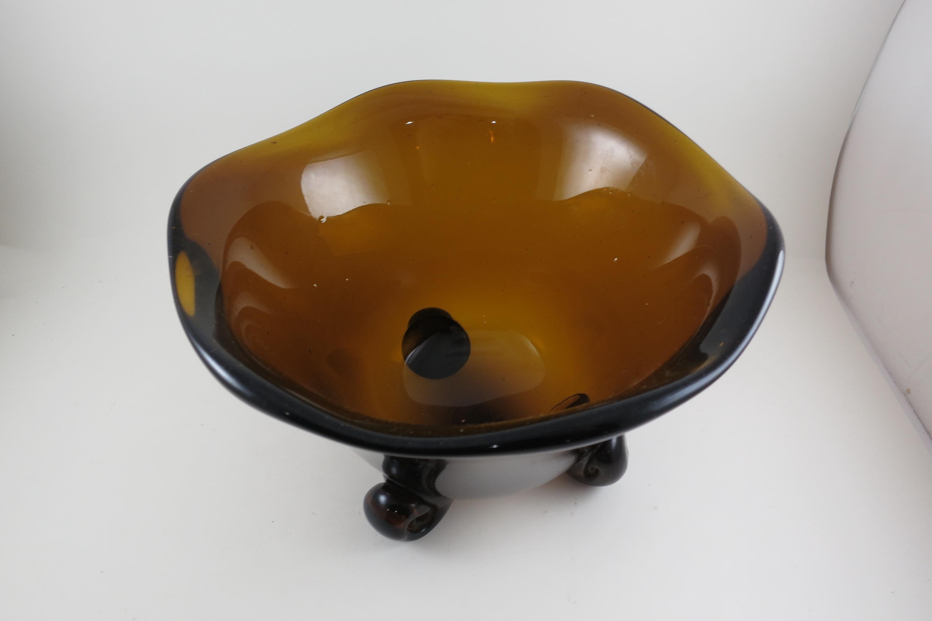 Vintage Hand Blown Amber Art Glass Heavy Tri Foot Bowl.