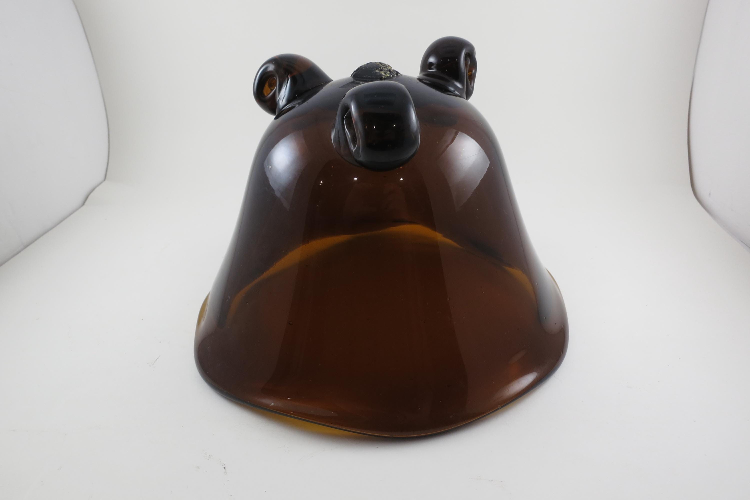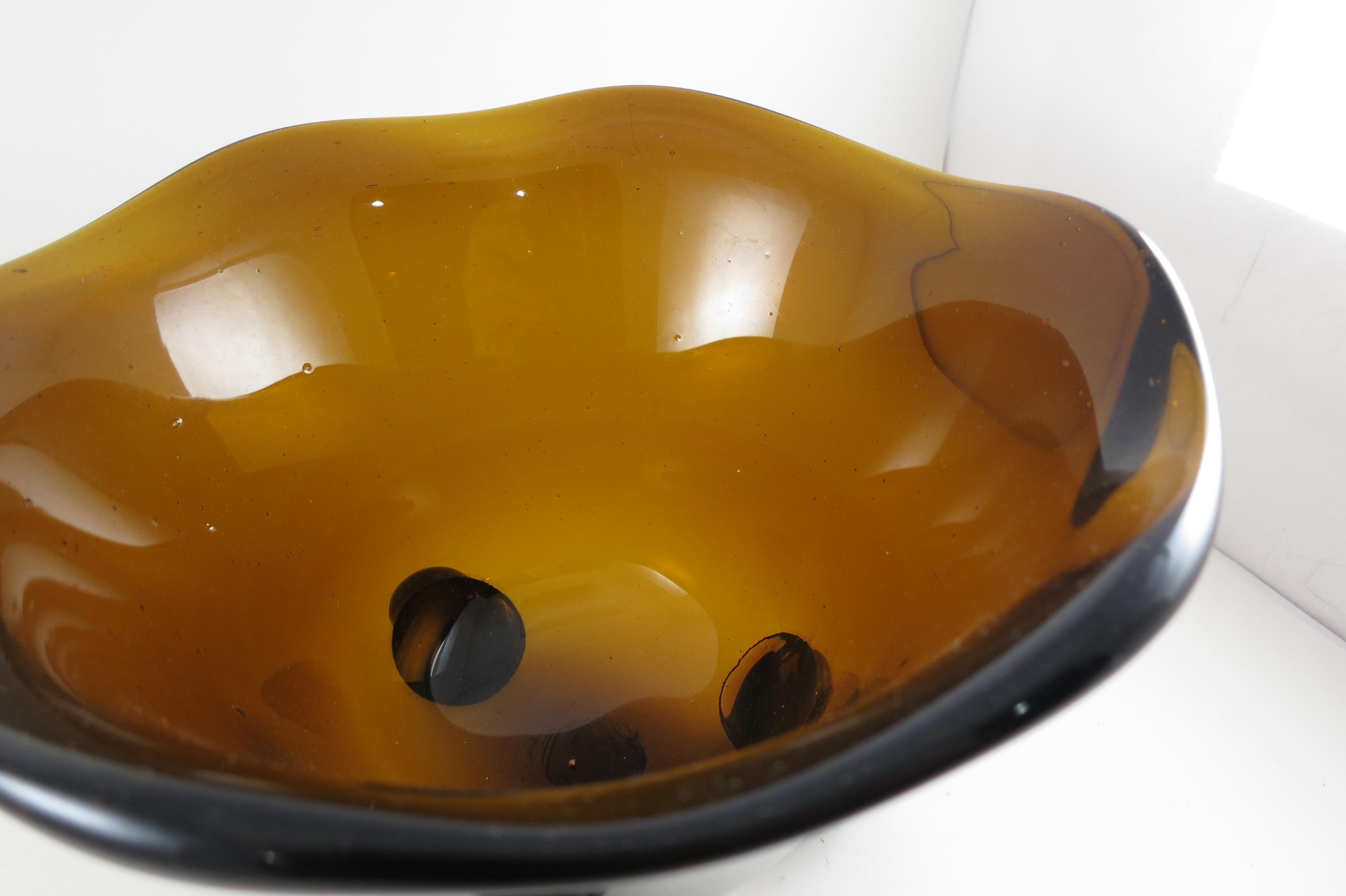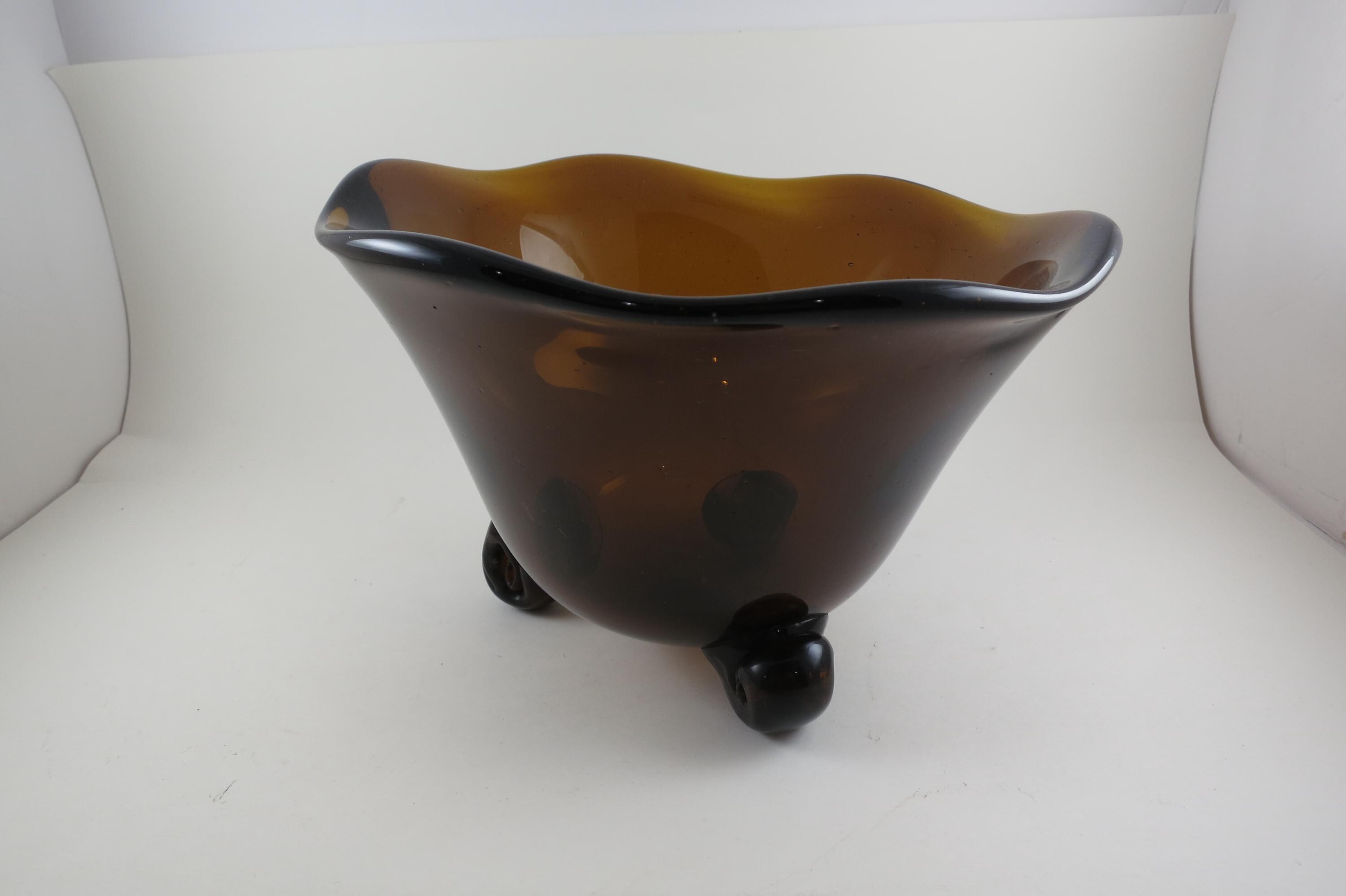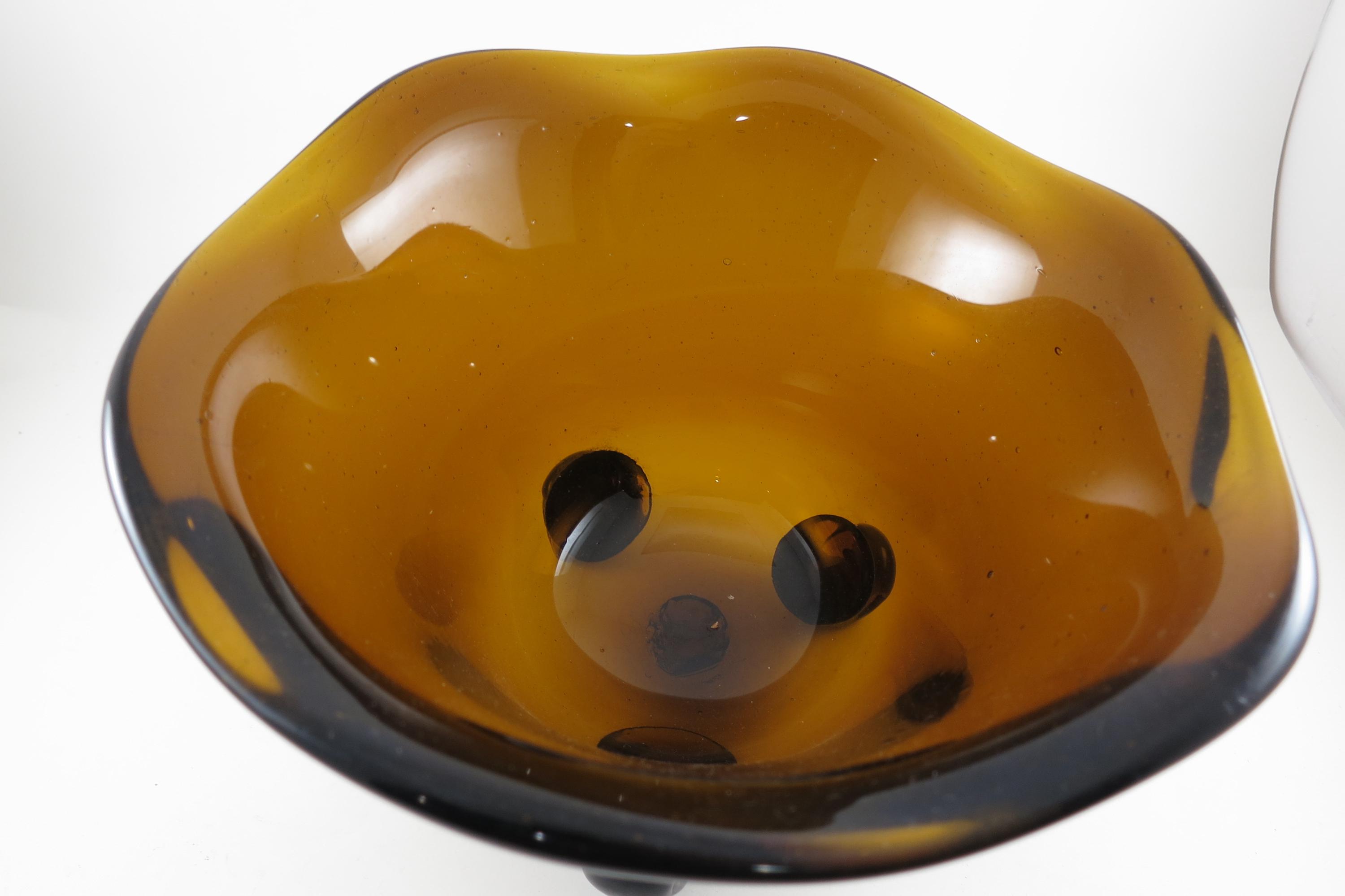 Vintage Hand Blown Amber Art Glass Heavy Tri Foot Bowl.