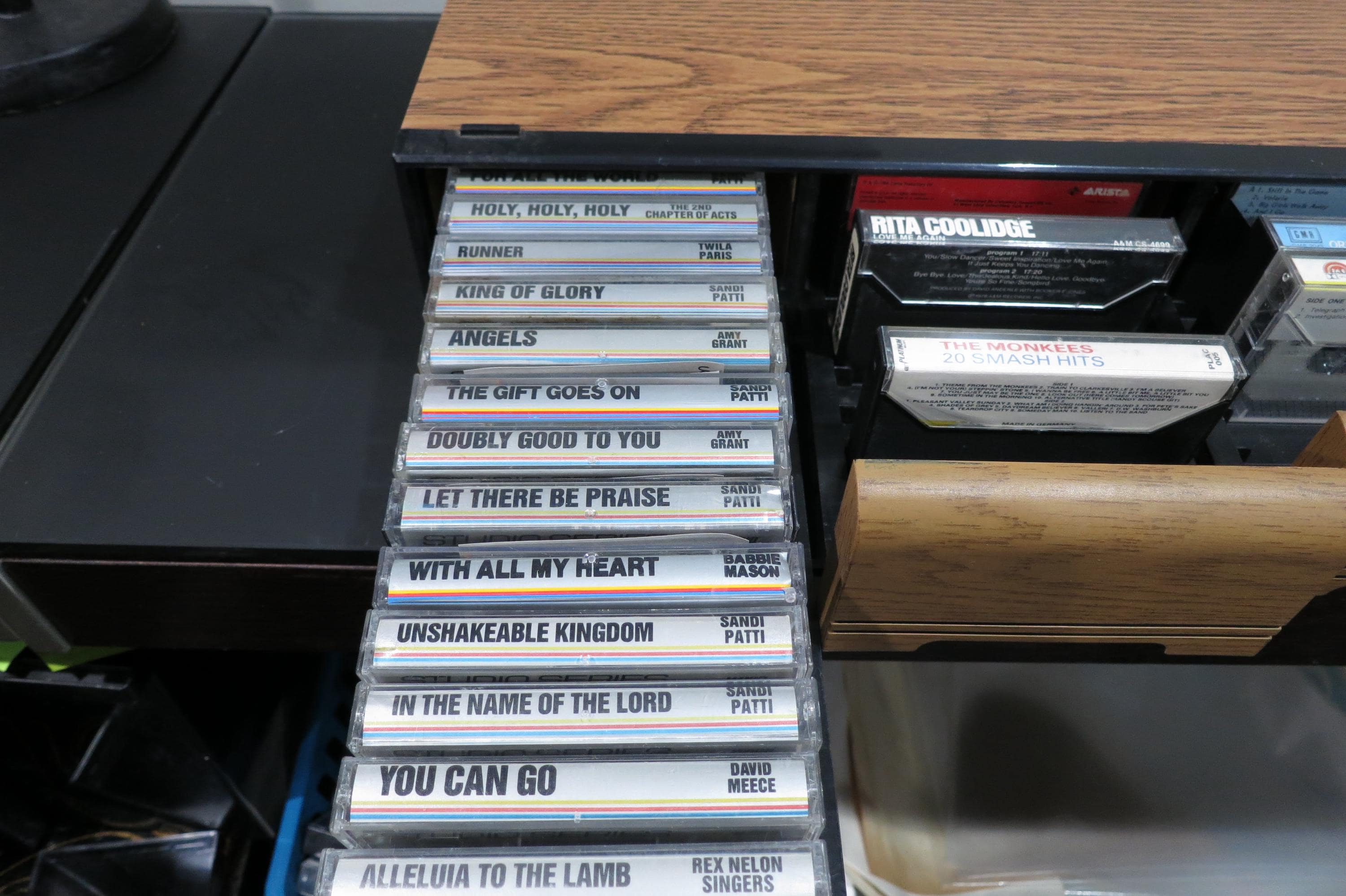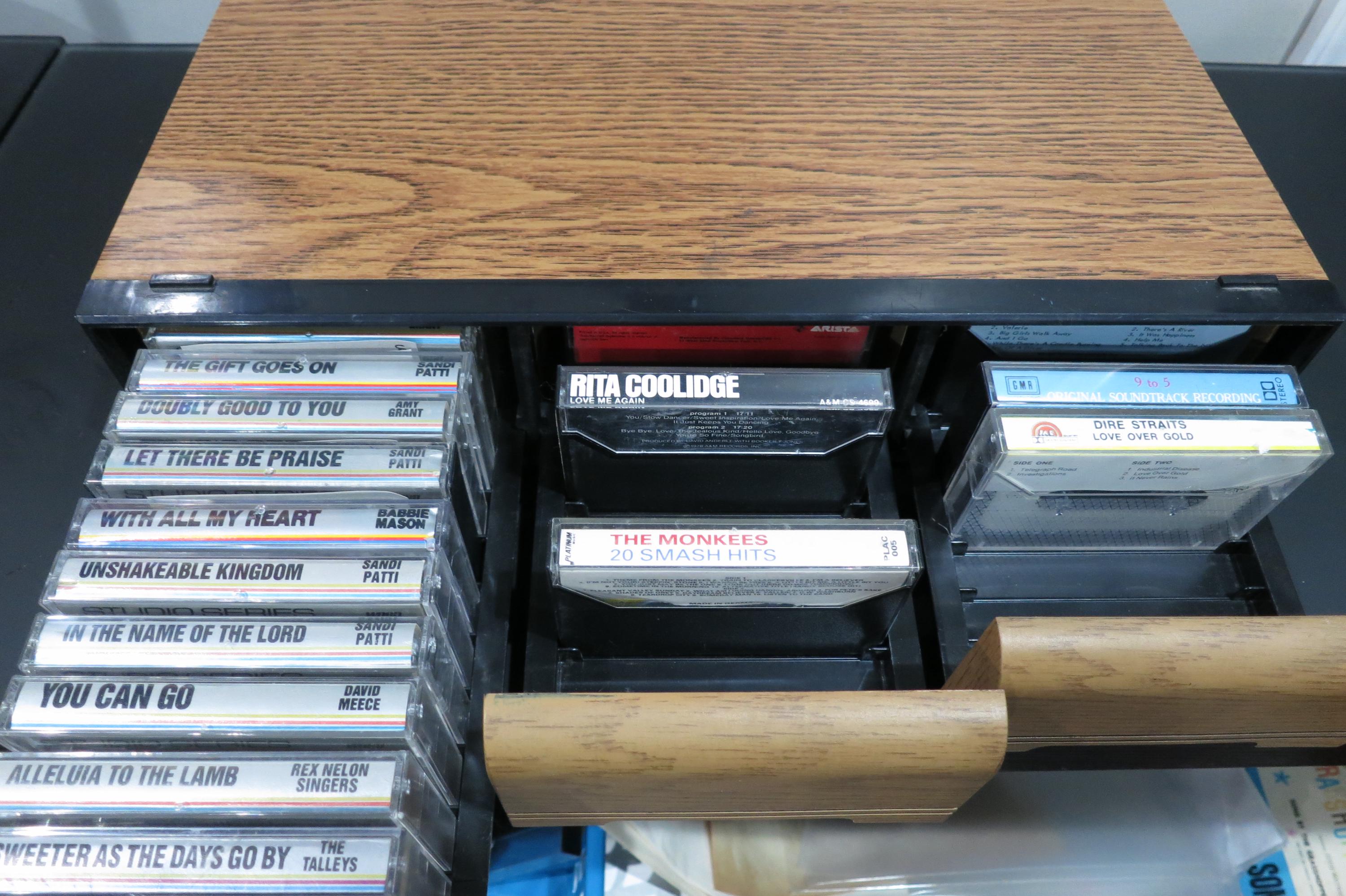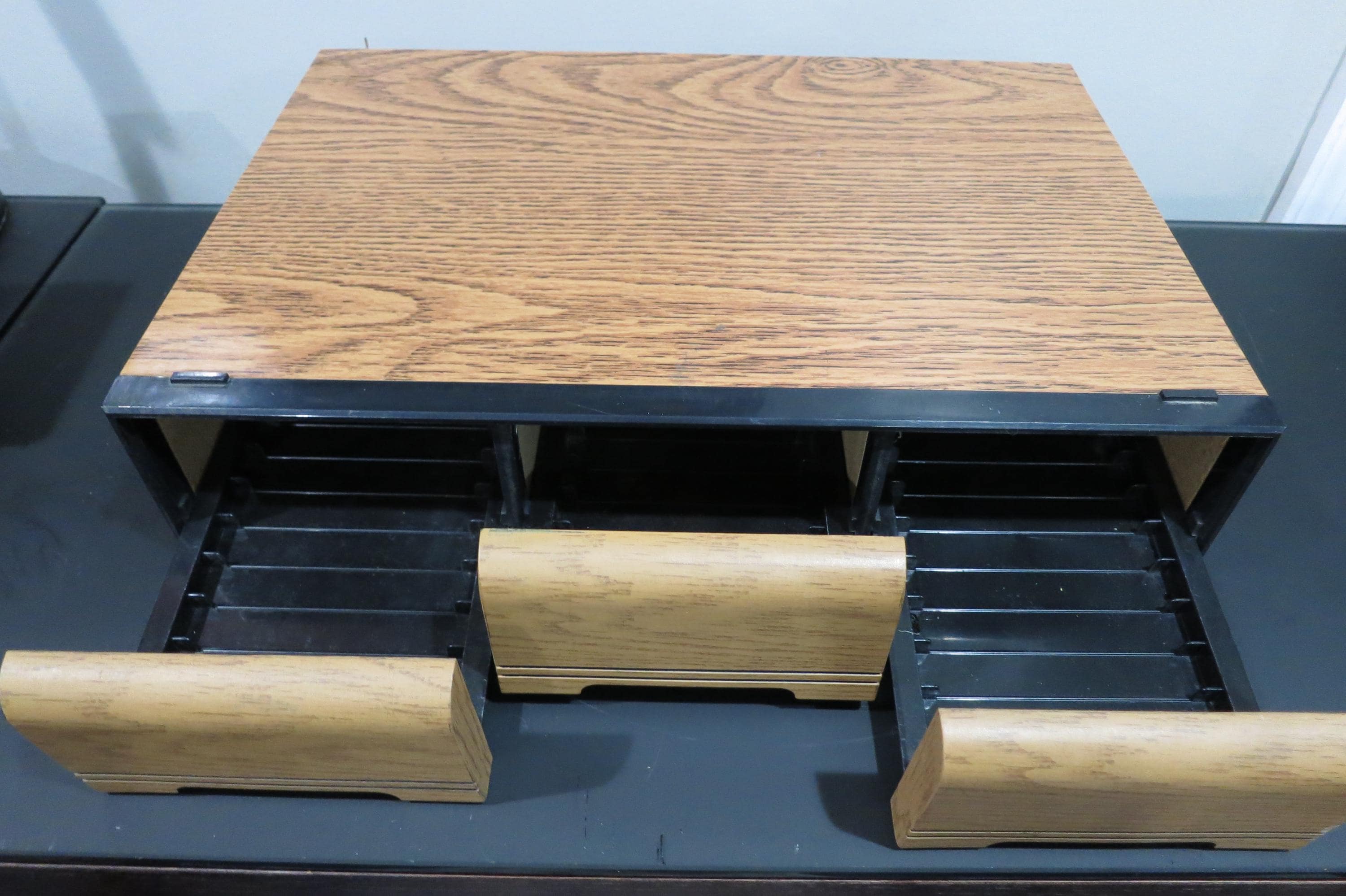 1980's Faux Wood Three Row Hard Cassette Holder Holds 42 Cassette Tapes Excellent Condition Home Storage. Has three pull out trays that each hold 14 Cassettes for a total of 42. This is the hard variety that is for home cassette storage. Measures 16 3/4 inches wide, 12 1/4 inches deep and 3 5/8 inches tall.