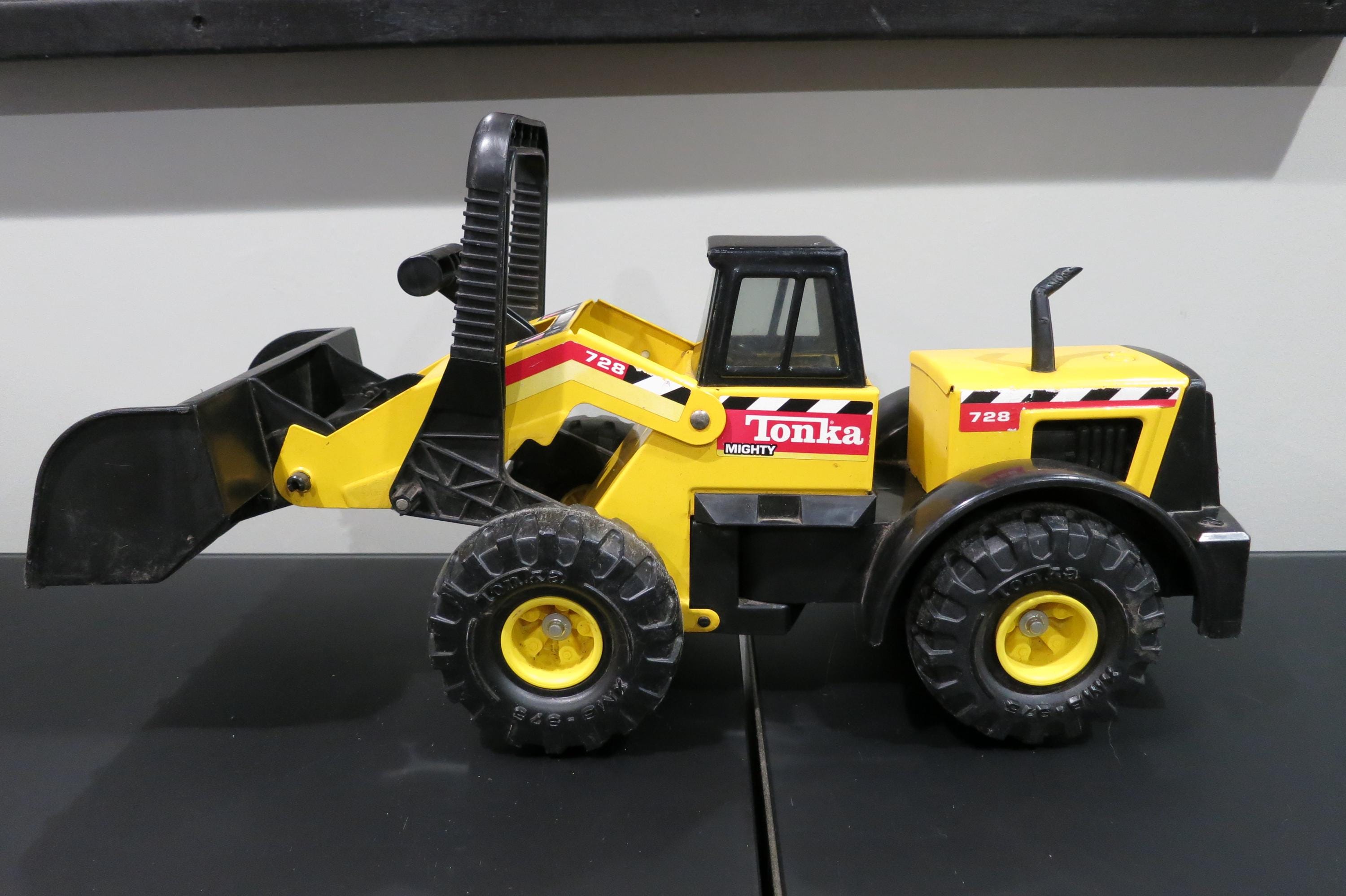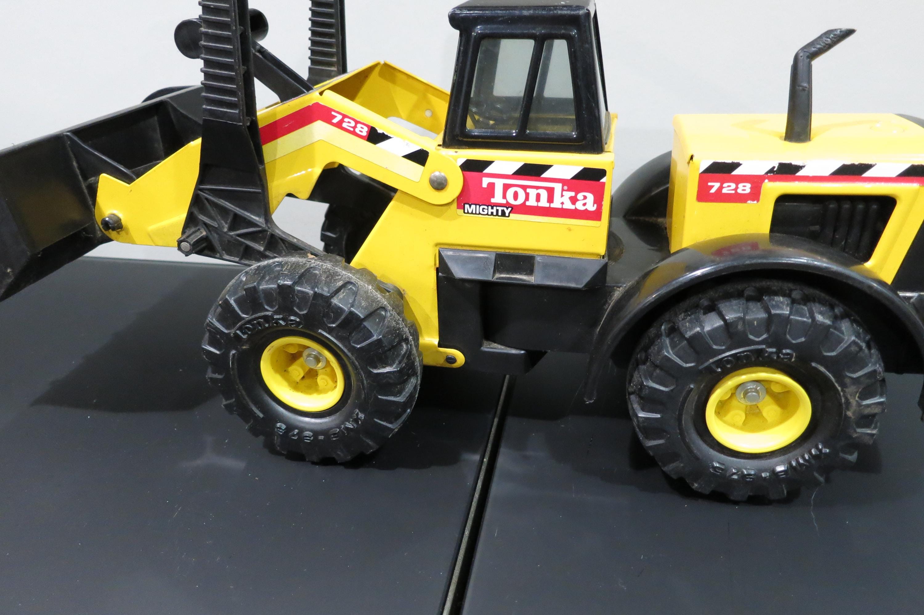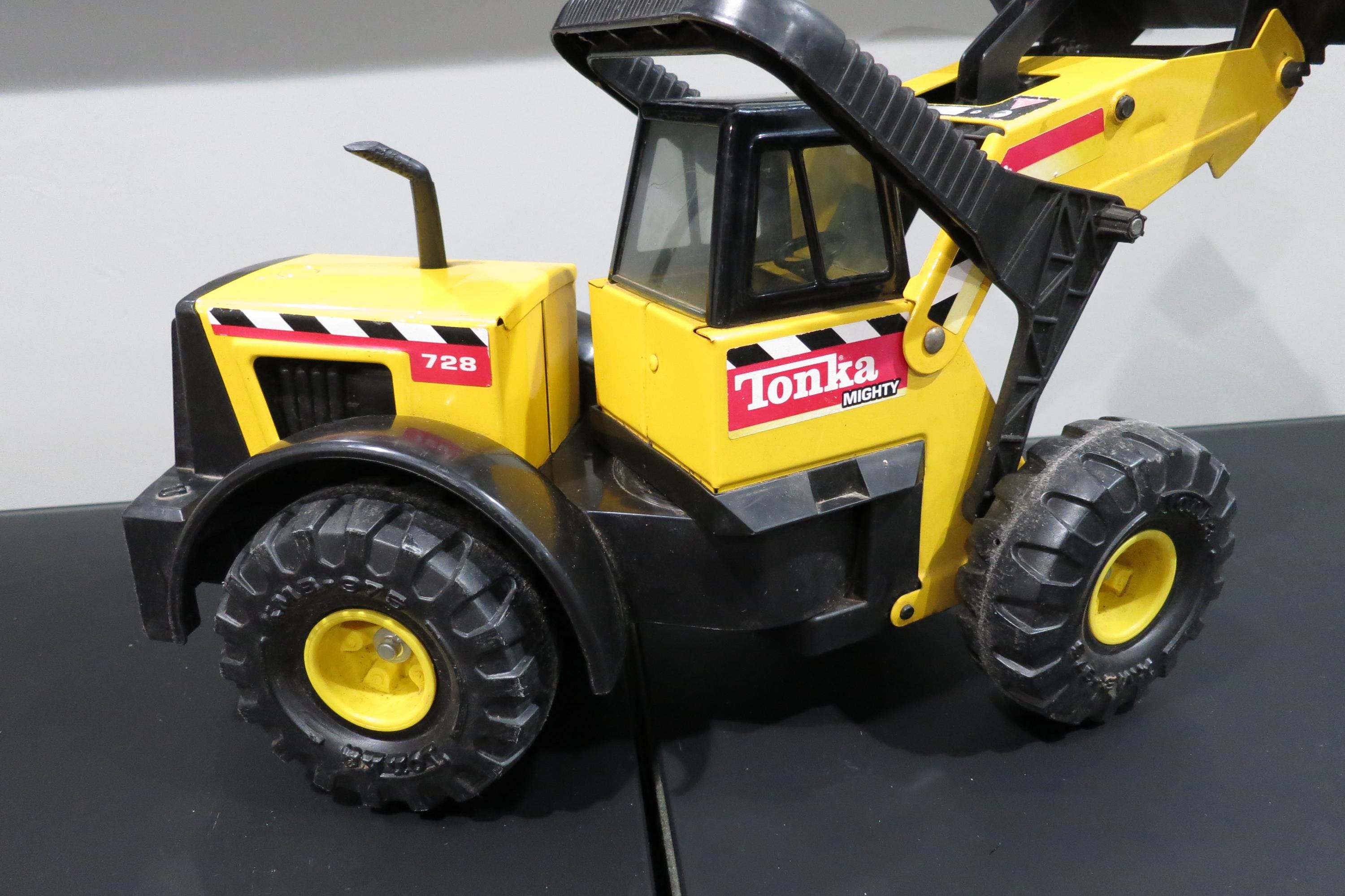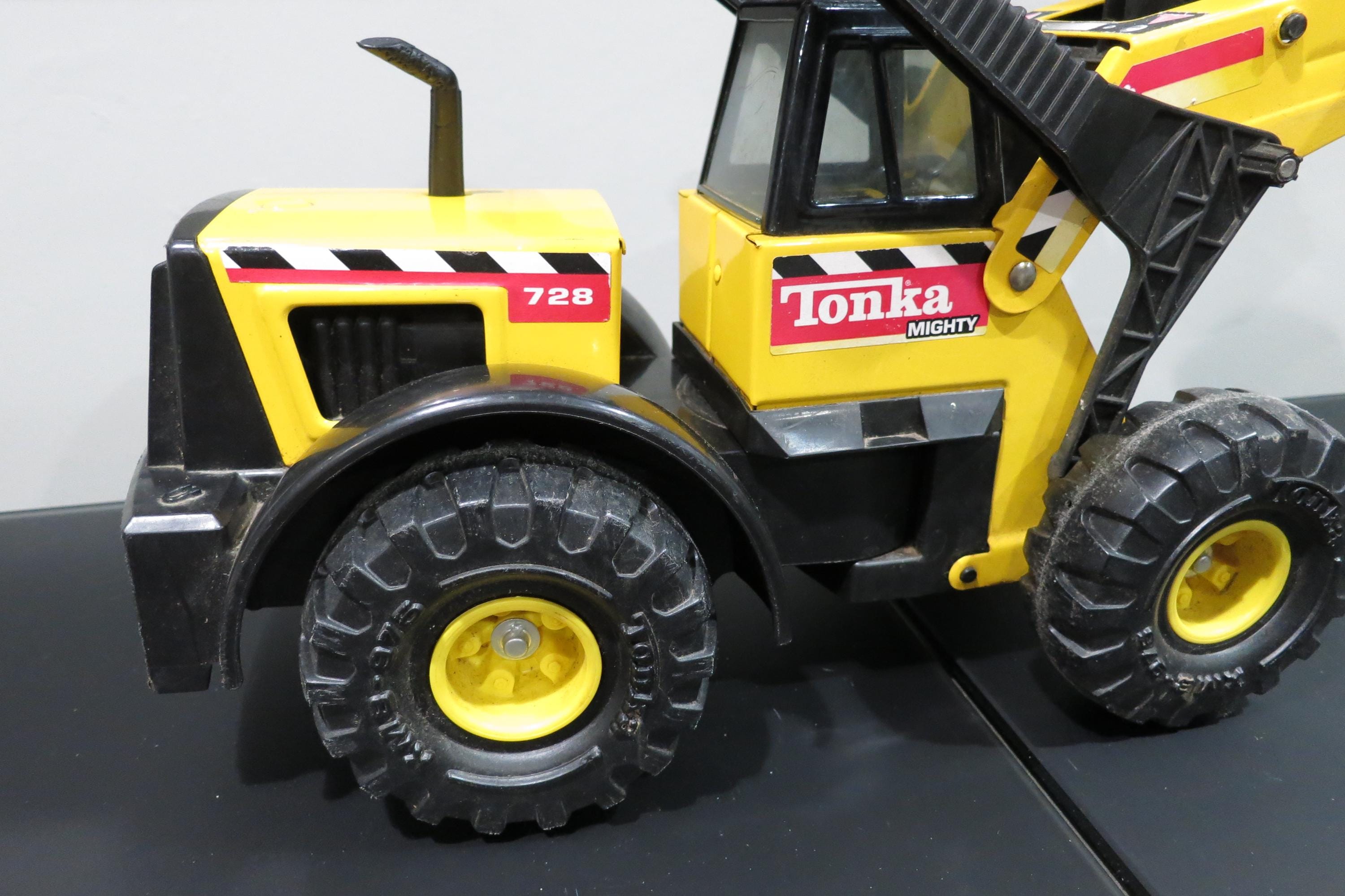 1999 Mighty Tonka Front End Loader 728 Pressed Steel Works Perfectly. Measures 22 1/4 inches long, 8 1/2 inches wide and 11 inches tall (at the smallest configuration) All the mechanics operate as they should. Original Paint and stickers, lightly played with, sold as shown, including the dirt! Great Gift!! We offer free shipping on all orders over 35 dollars. (Saves you lots, this is a big truck!!)