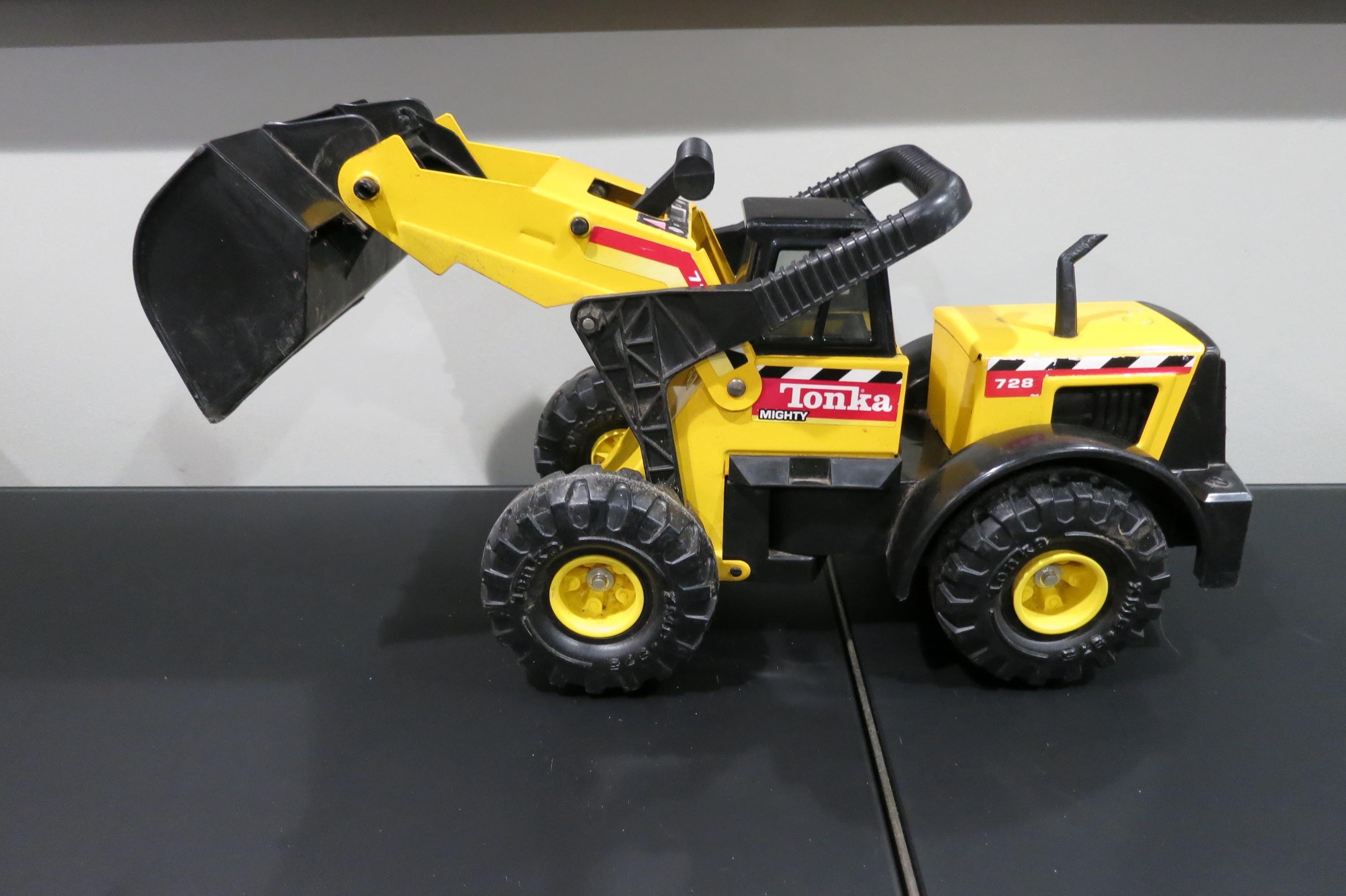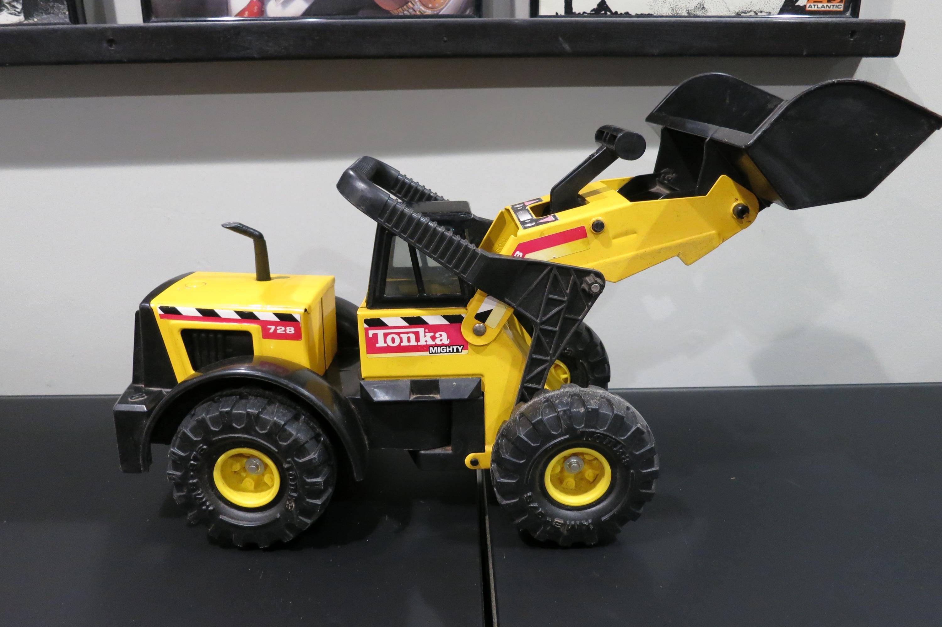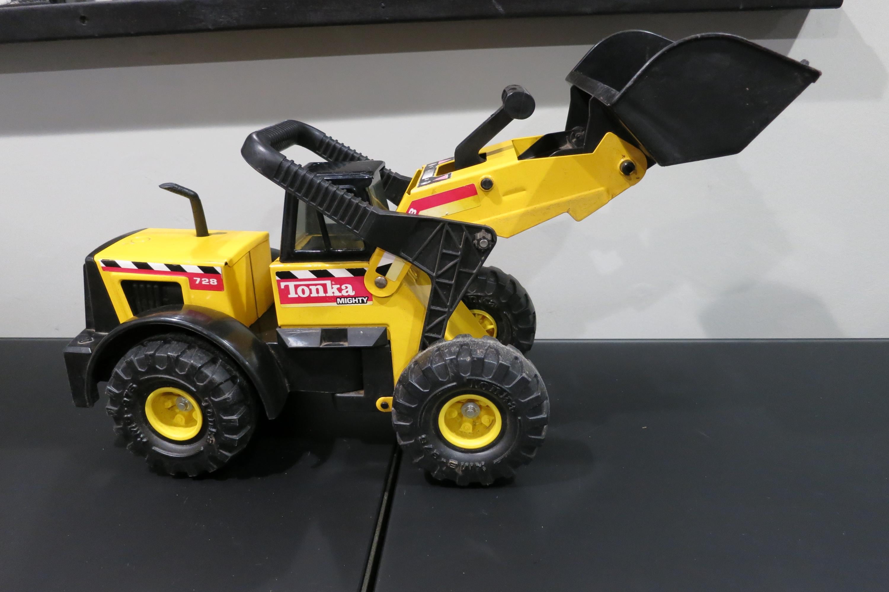 1999 Mighty Tonka Front End Loader 728 Pressed Steel Works Perfectly. Measures 22 1/4 inches long, 8 1/2 inches wide and 11 inches tall (at the smallest configuration) All the mechanics operate as they should. Original Paint and stickers, lightly played with, sold as shown, including the dirt! Great Gift!! We offer free shipping on all orders over 35 dollars. (Saves you lots, this is a big truck!!)