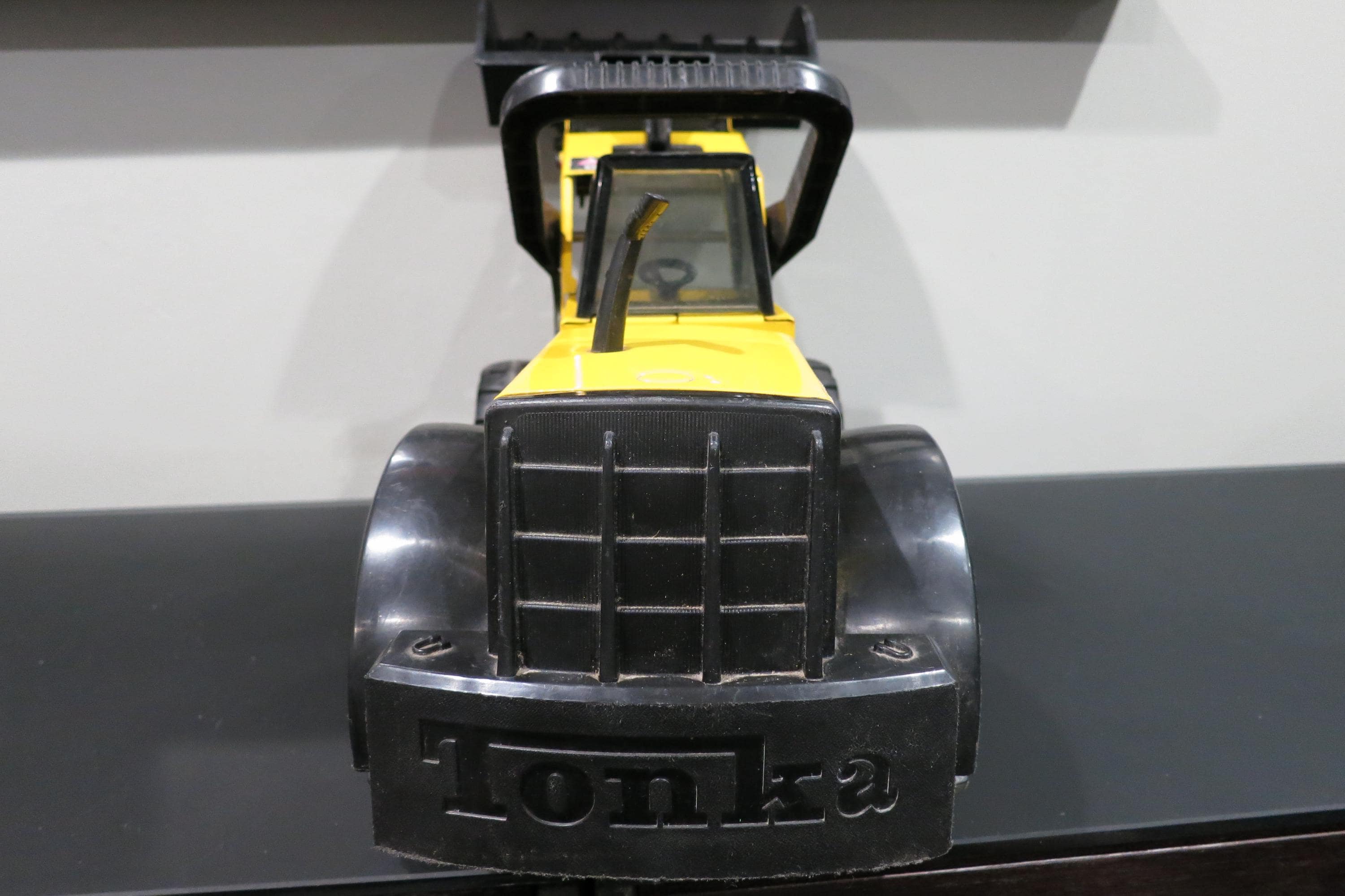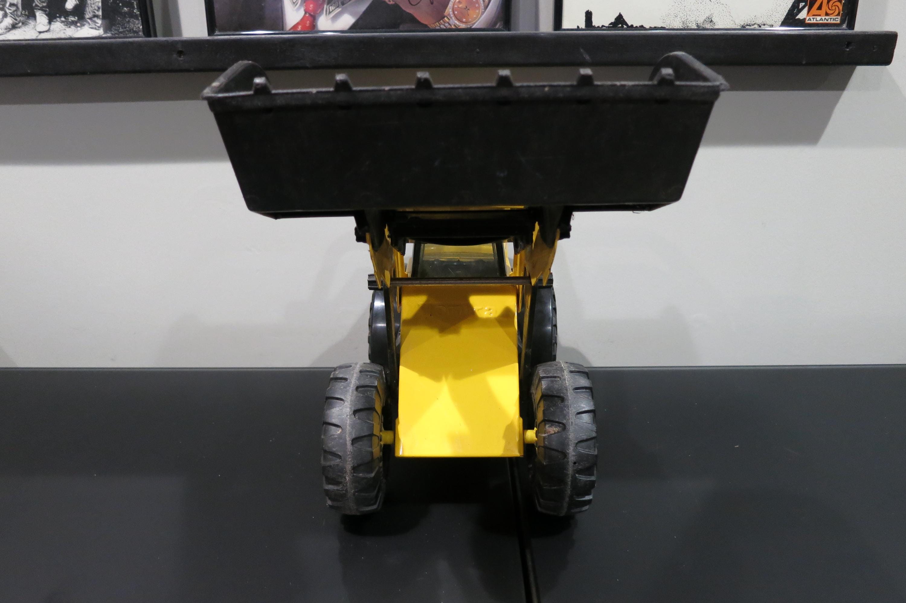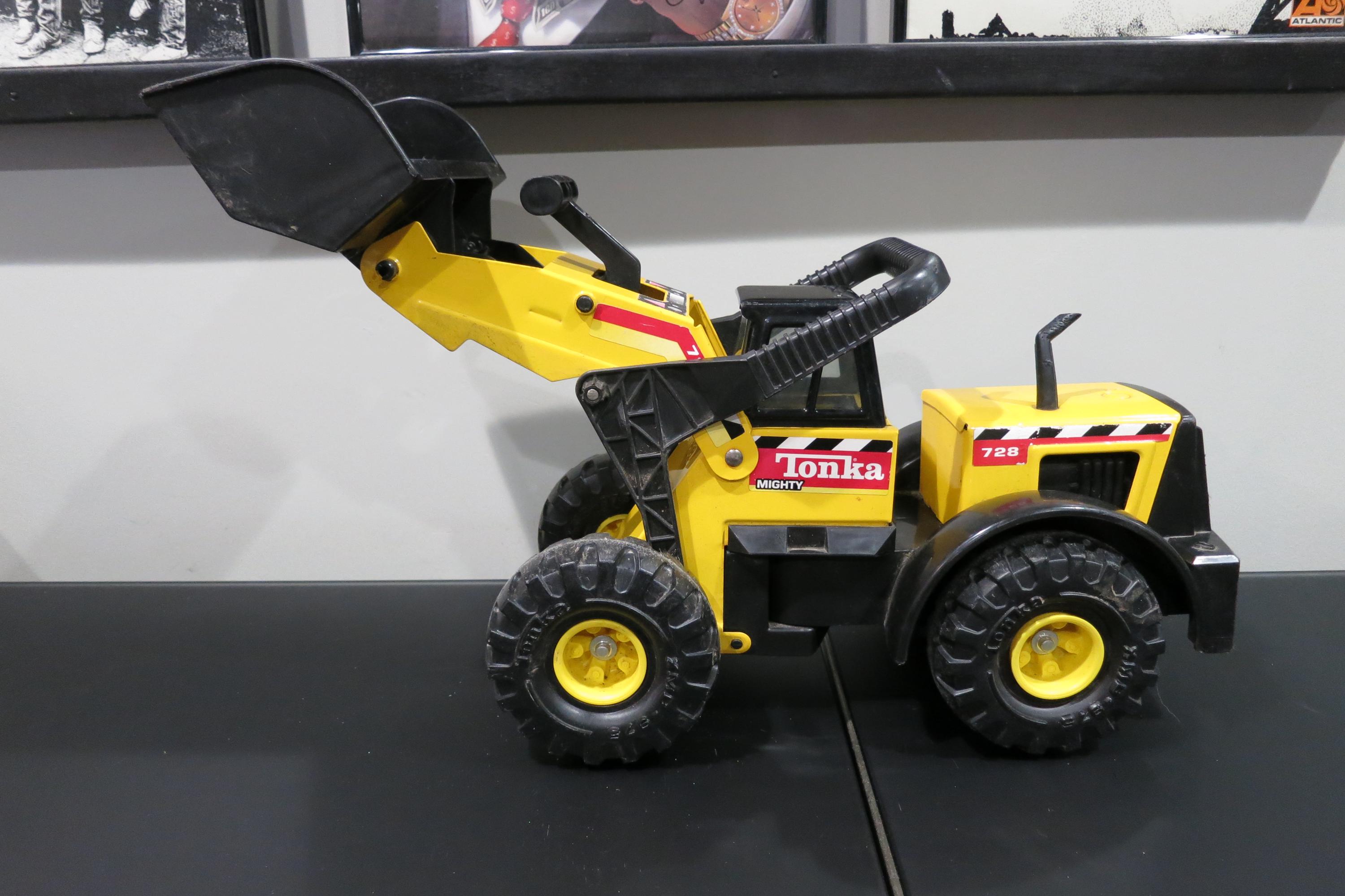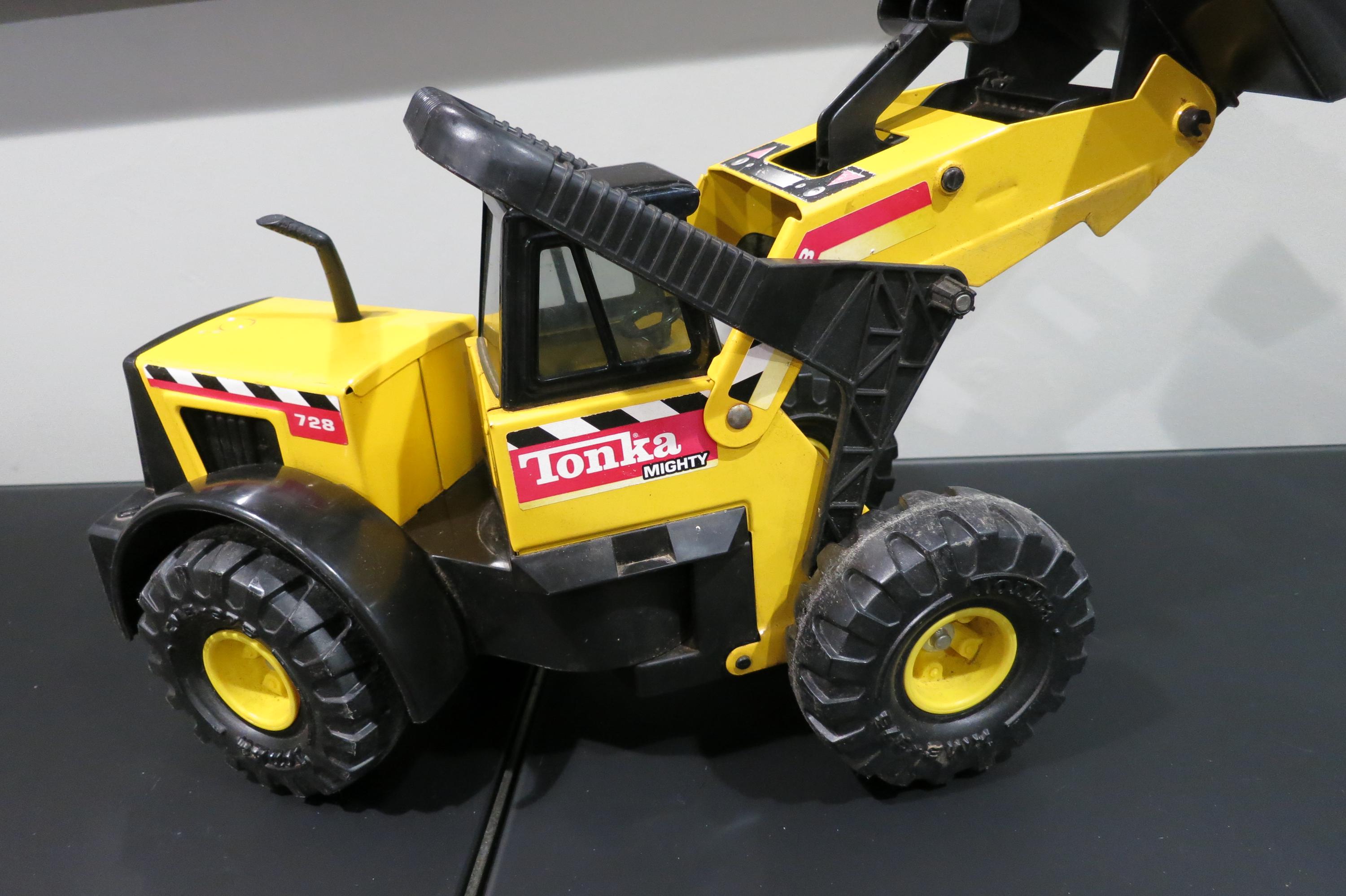 1999 Mighty Tonka Front End Loader 728 Pressed Steel Works Perfectly. Measures 22 1/4 inches long, 8 1/2 inches wide and 11 inches tall (at the smallest configuration) All the mechanics operate as they should. Original Paint and stickers, lightly played with, sold as shown, including the dirt! Great Gift!! We offer free shipping on all orders over 35 dollars. (Saves you lots, this is a big truck!!)