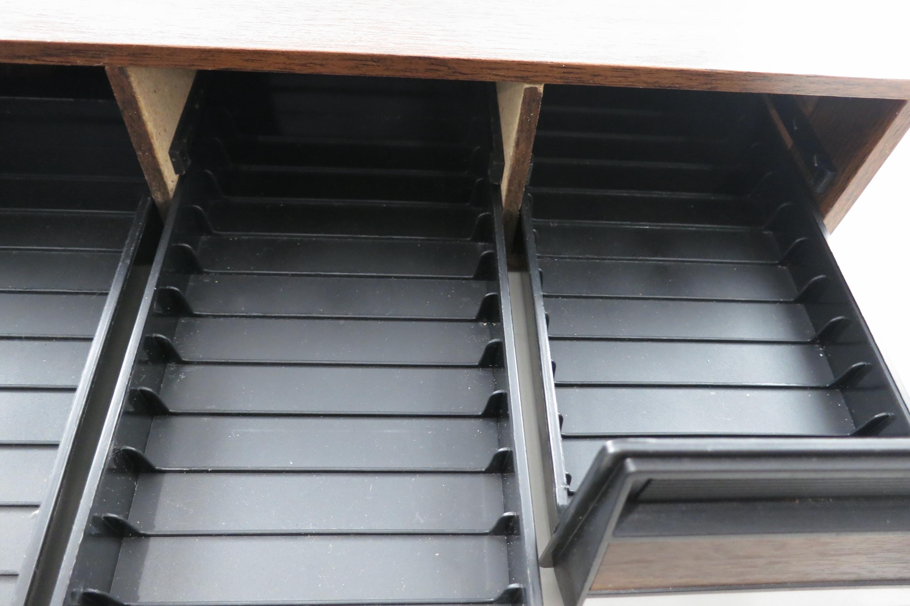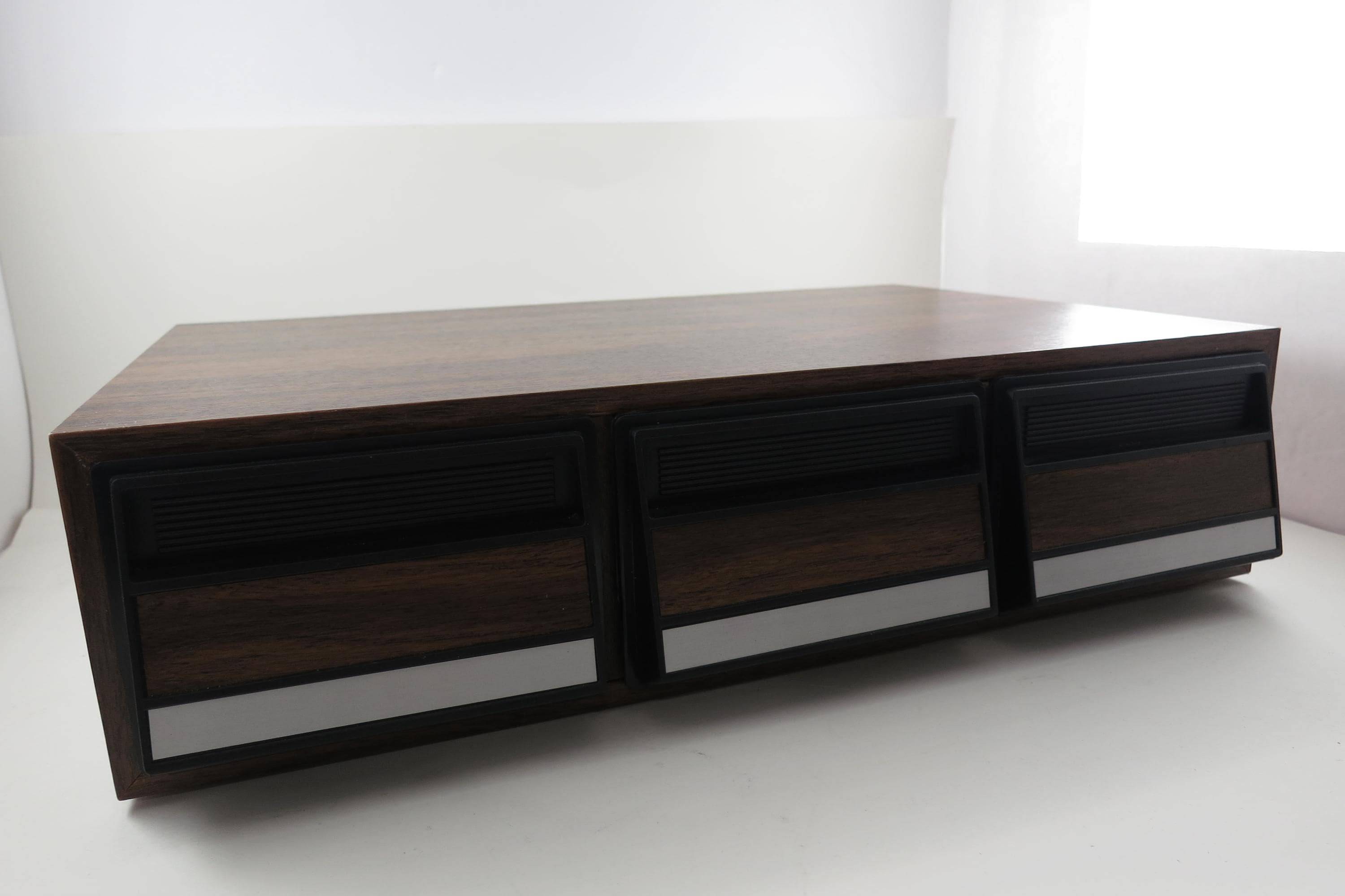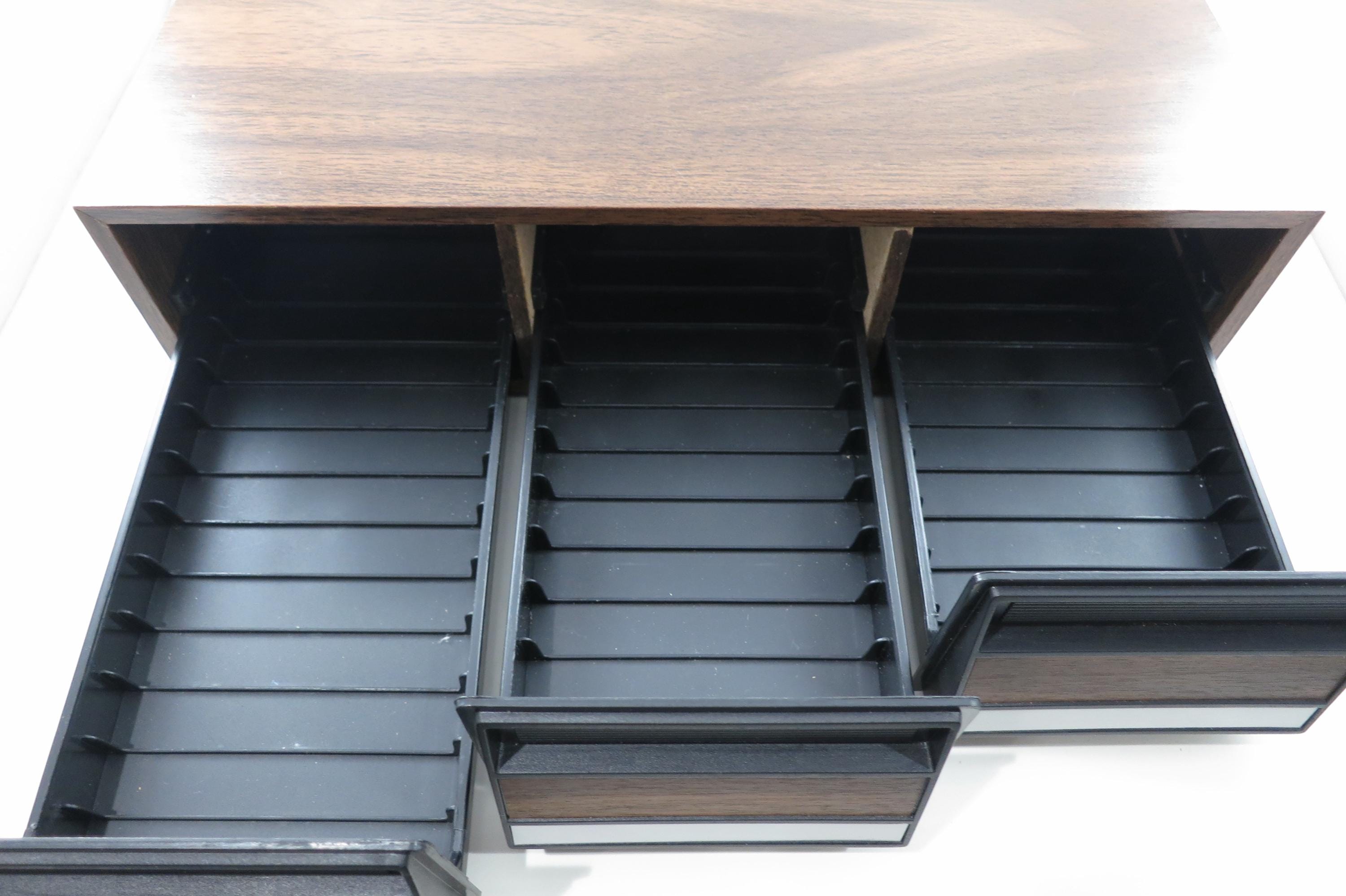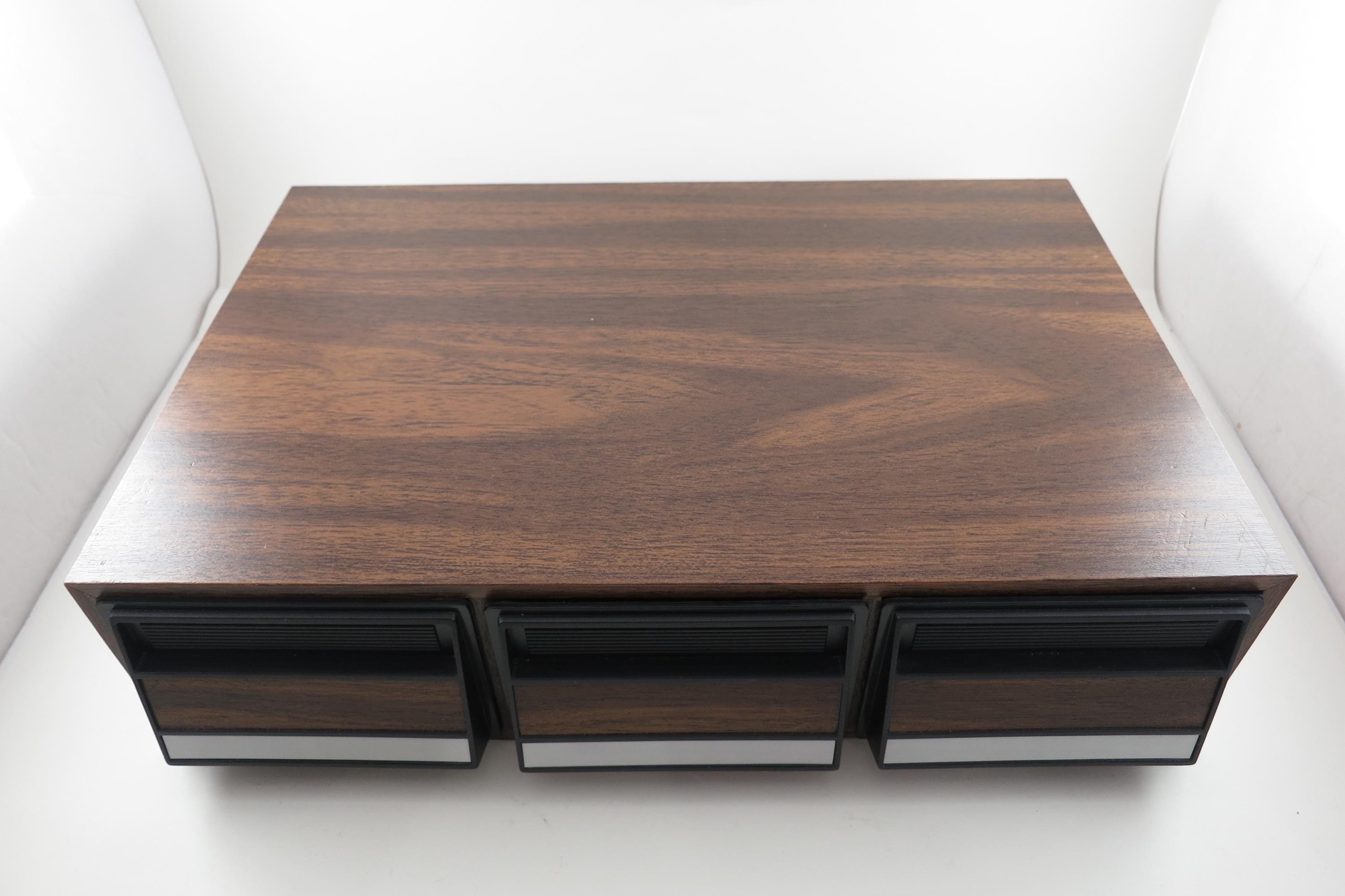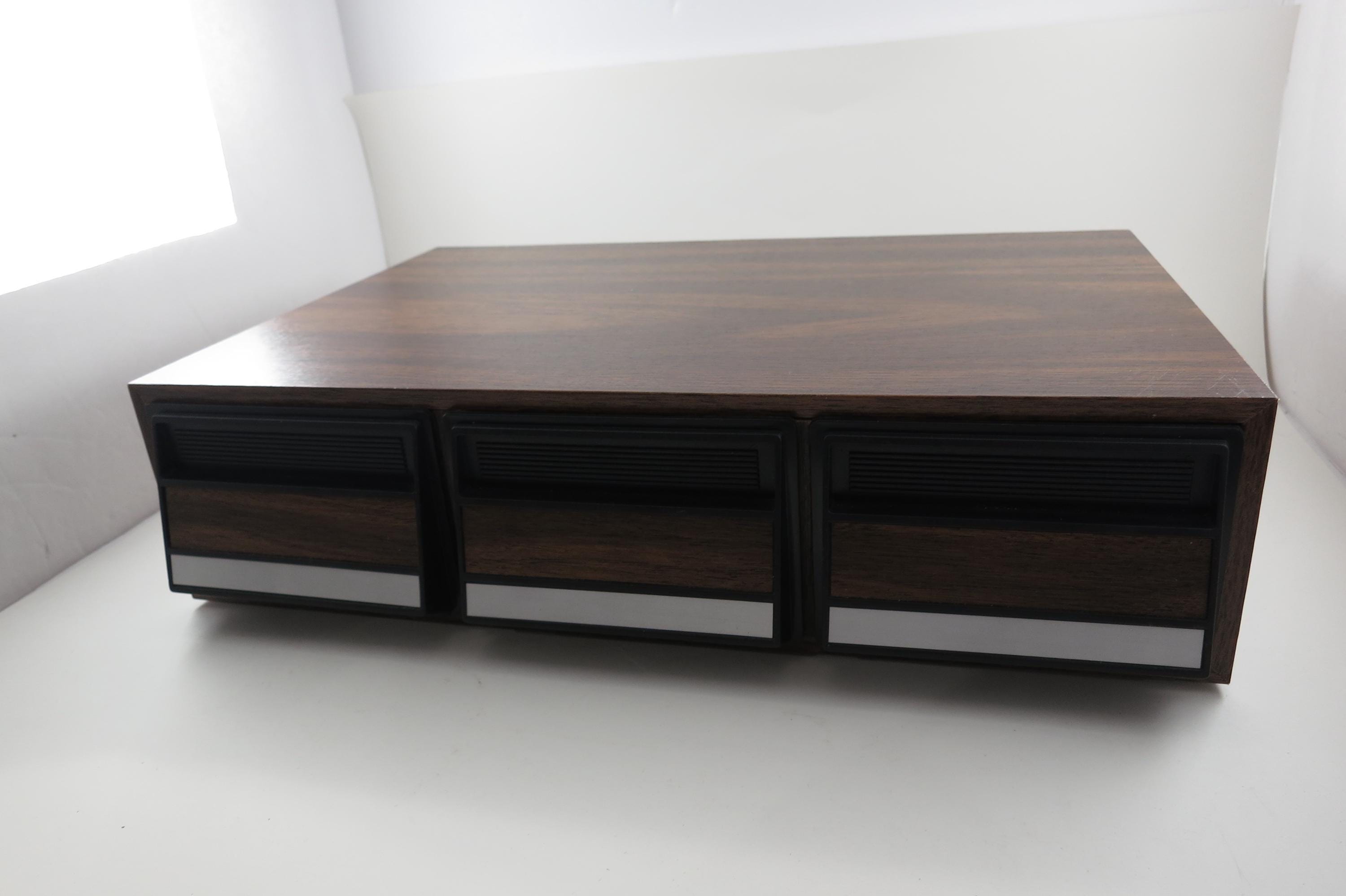 1980's Faux Wood Three Row Hard Cassette Holder Holds 36 Tapes Excellent Condition. Has three pull out trays that each hold 12 Cassettes for a total of 36. This is the hard variety that is for home cassette storage. This is one of the nicer versions of the cassette case, where each Cassette sits in a divided individual space.