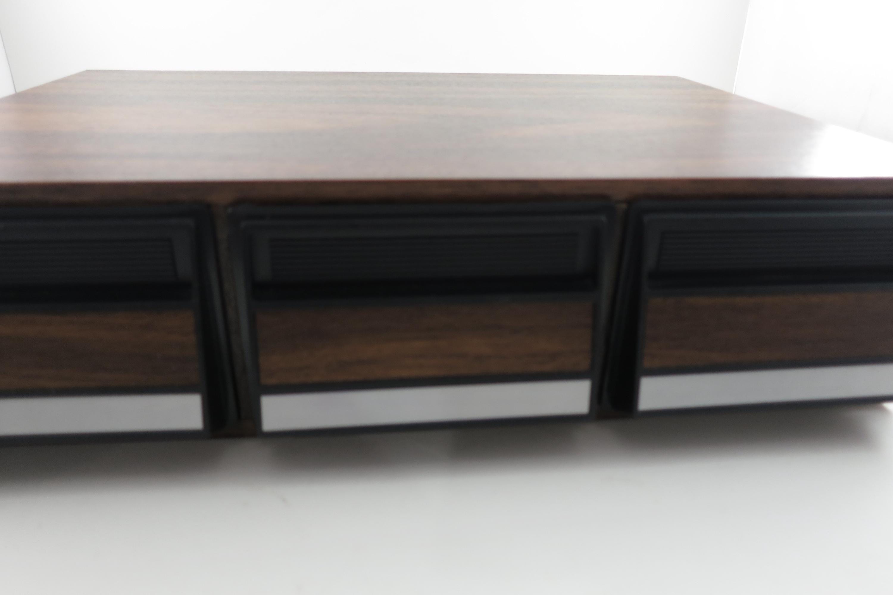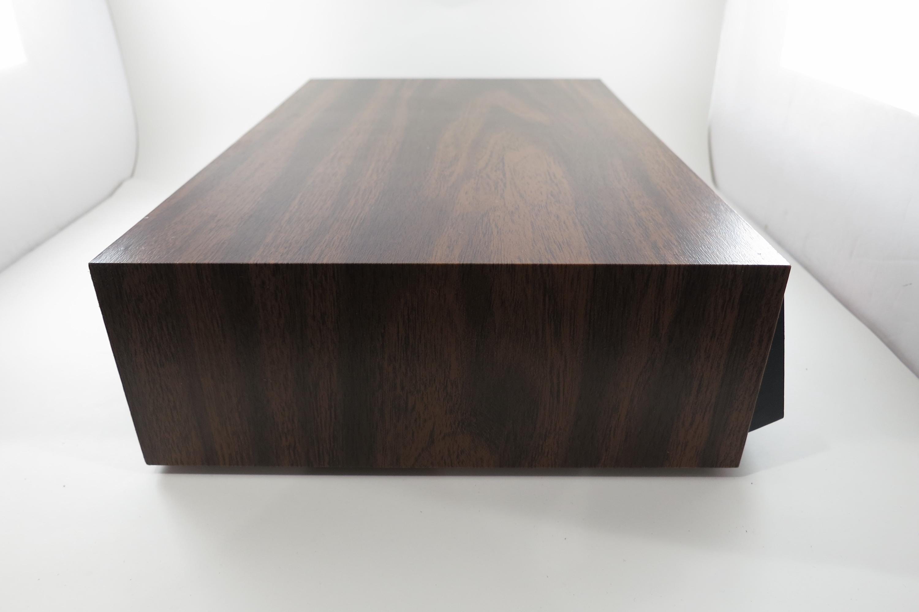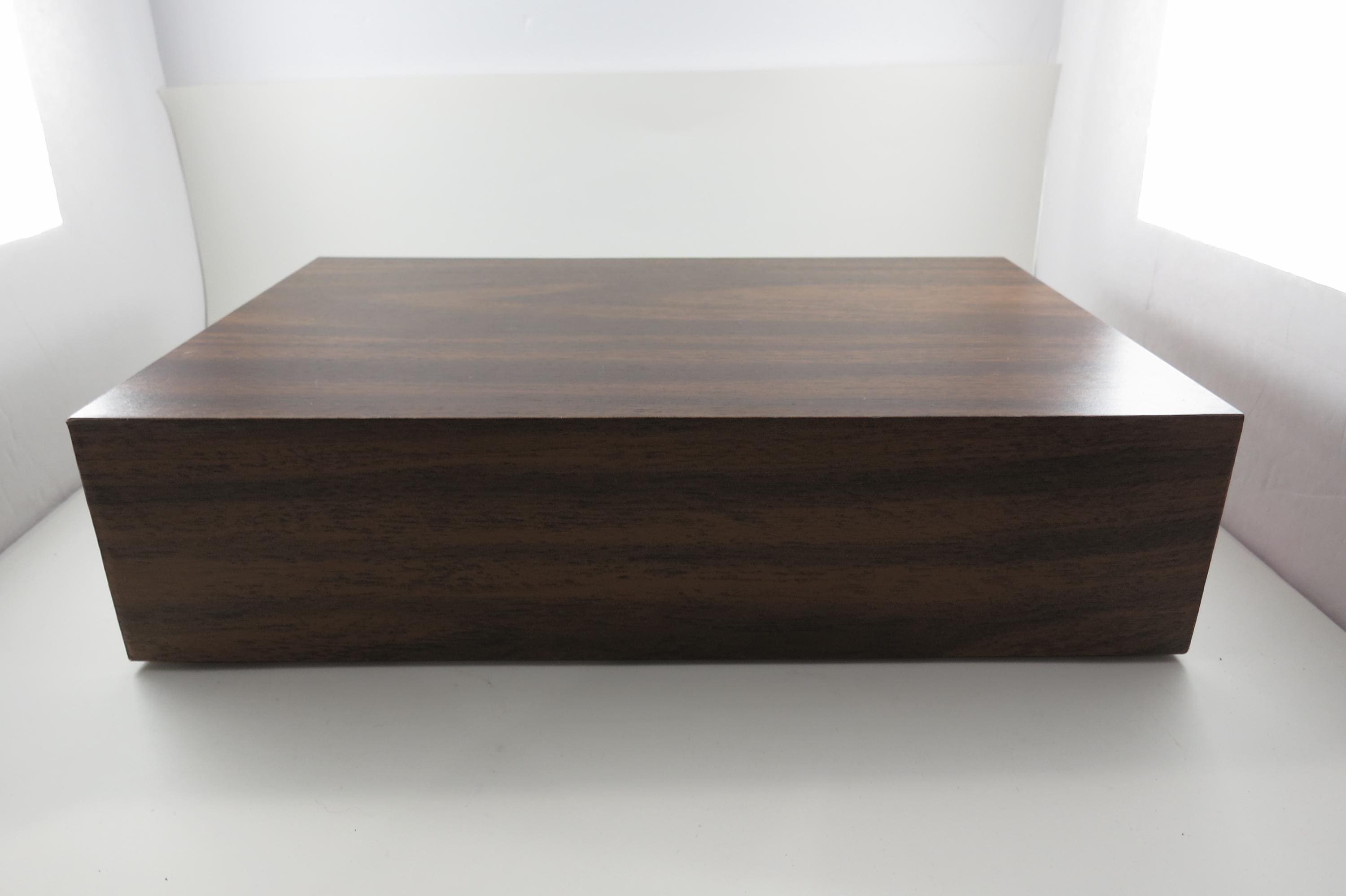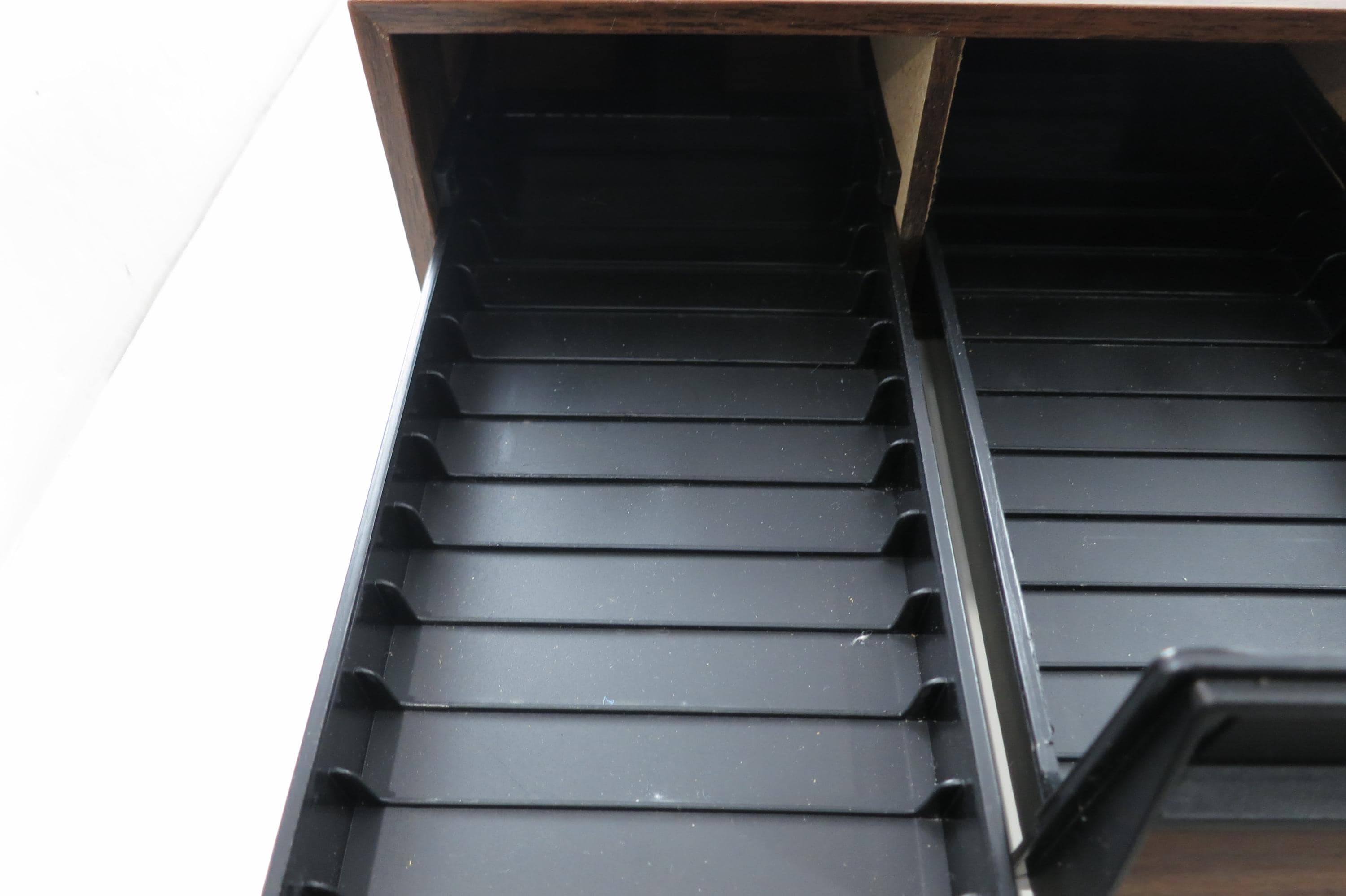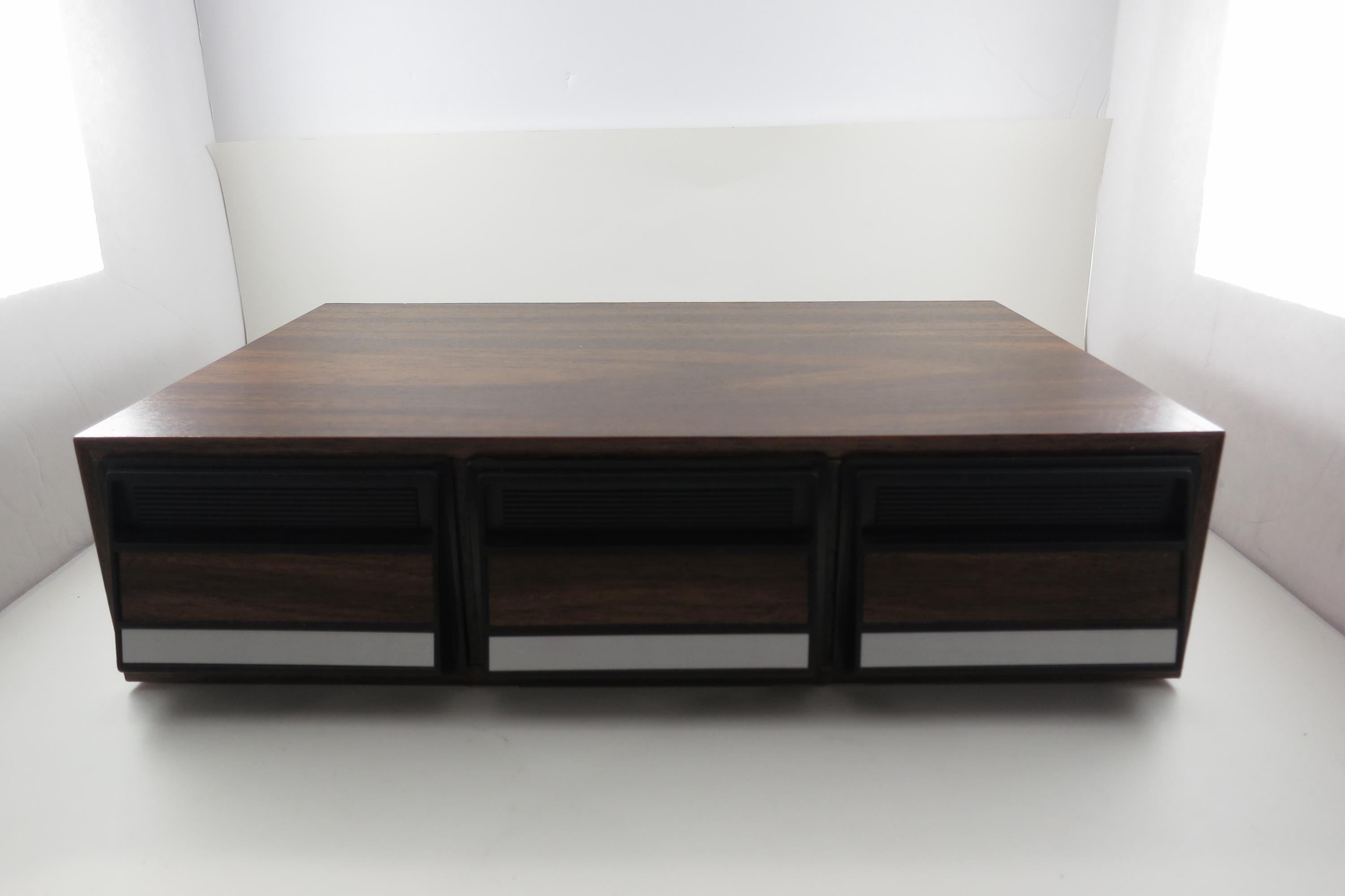 1980's Faux Wood Three Row Hard Cassette Holder Holds 36 Tapes Excellent Condition. Has three pull out trays that each hold 12 Cassettes for a total of 36. This is the hard variety that is for home cassette storage. This is one of the nicer versions of the cassette case, where each Cassette sits in a divided individual space.