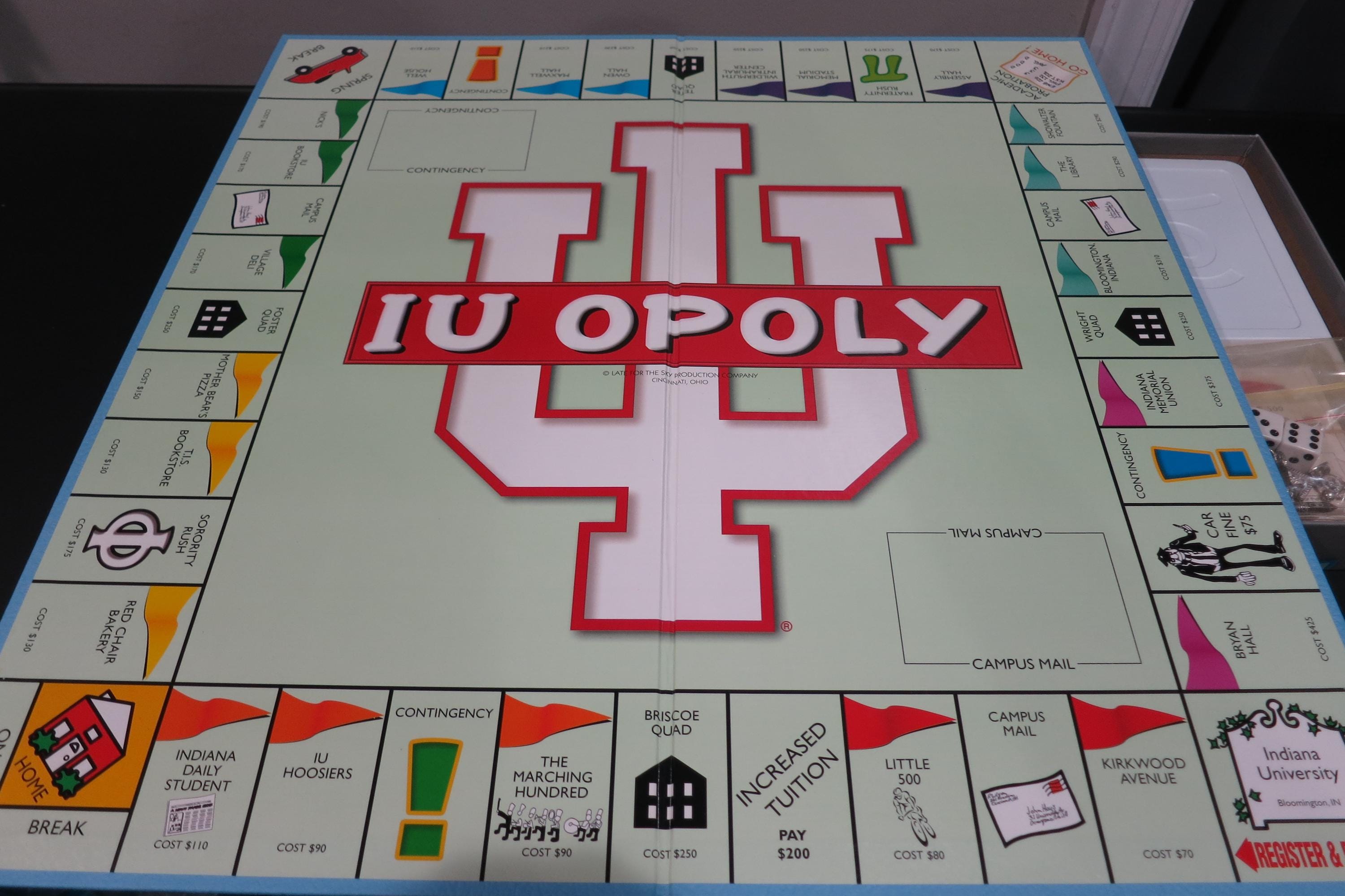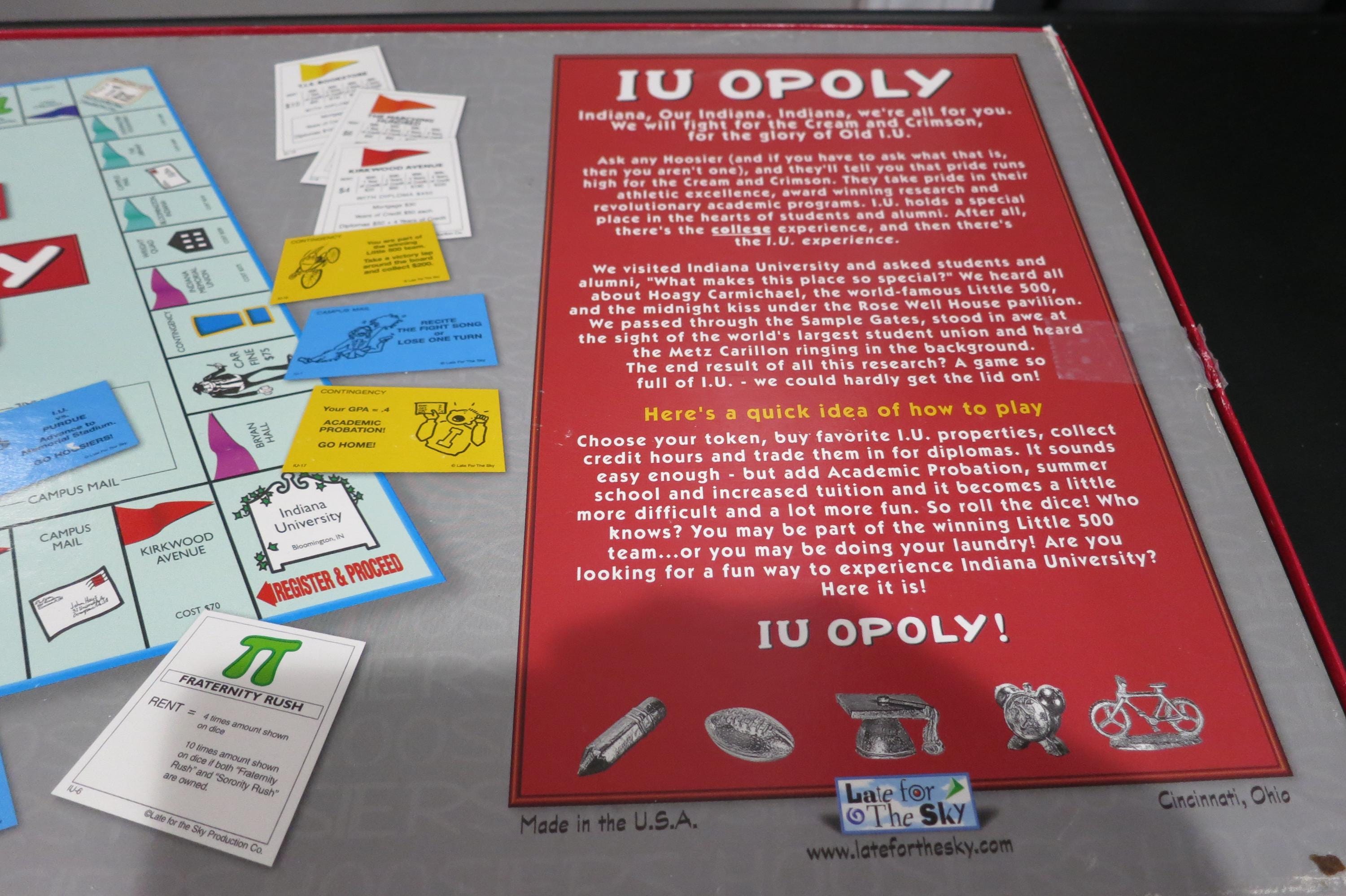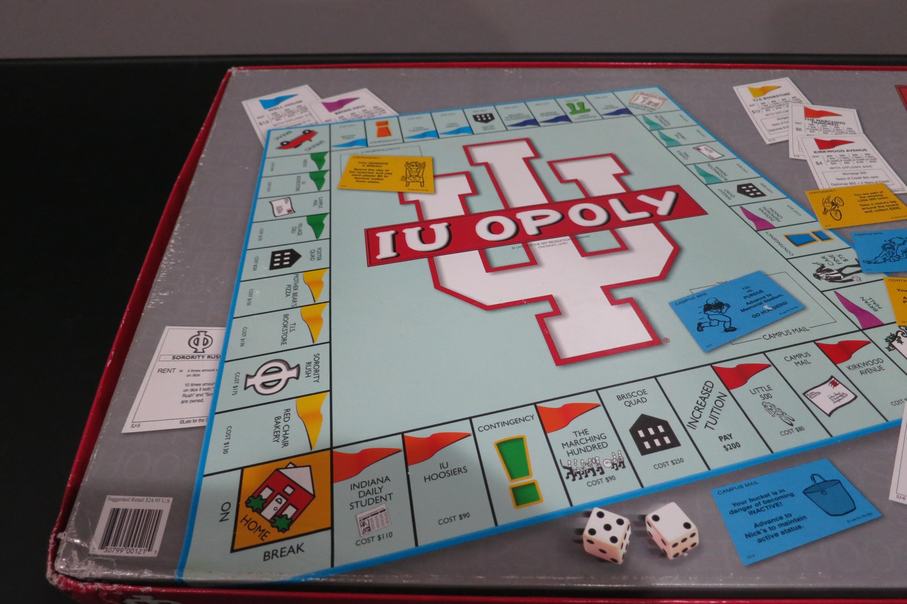 Vintage 1998 IU-opoly Board Game - University of Indiana Monopoly. 100% Complete Excellent Condition. Great game, just like Monopoly only themed to the university of Indiana Hoosiers. (Congrats on your brand new Natty!!). Box shows light corner wear. Game looks like it was never played. Perfect for Indiana Fans, Students or Alumni.