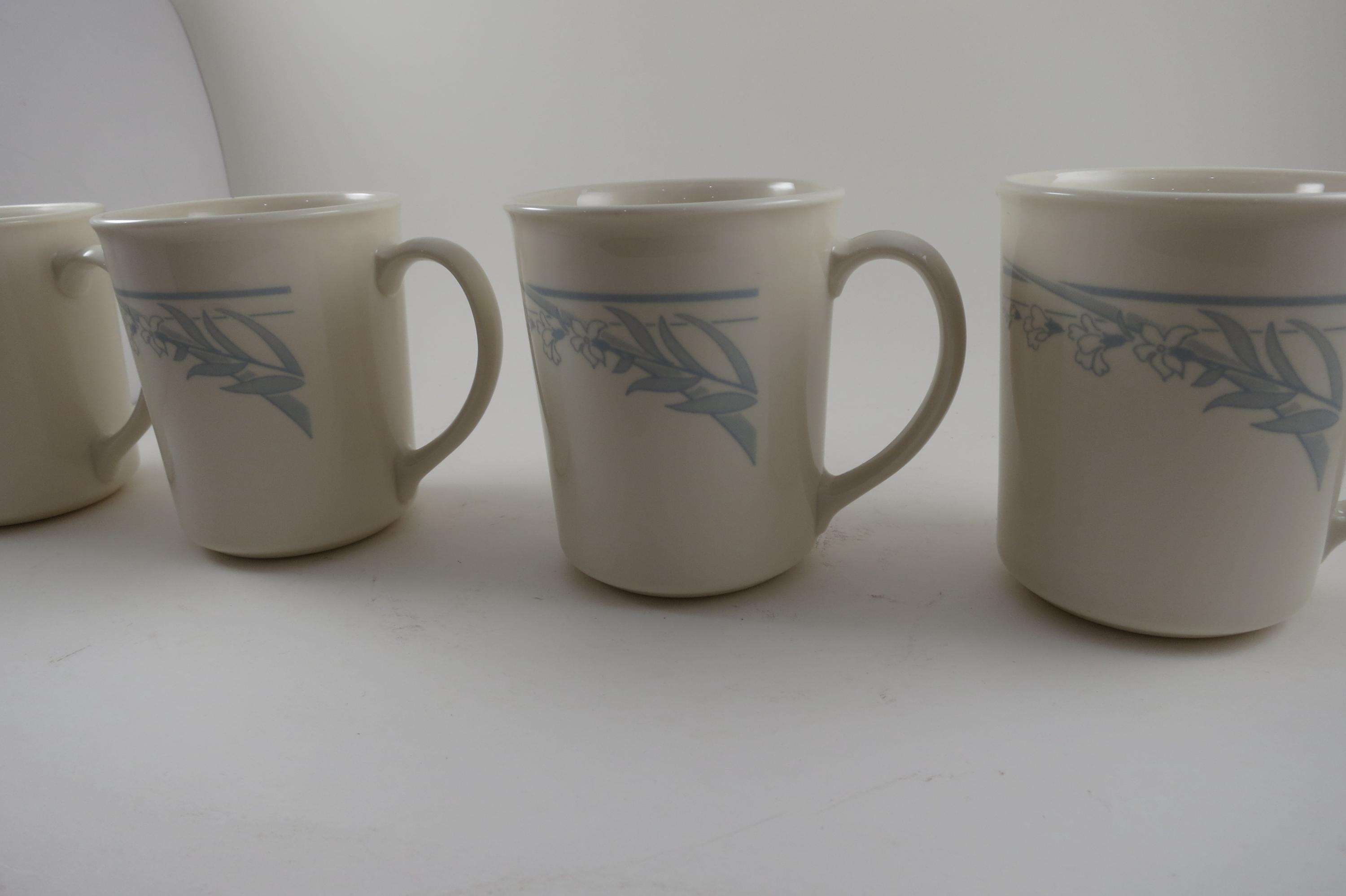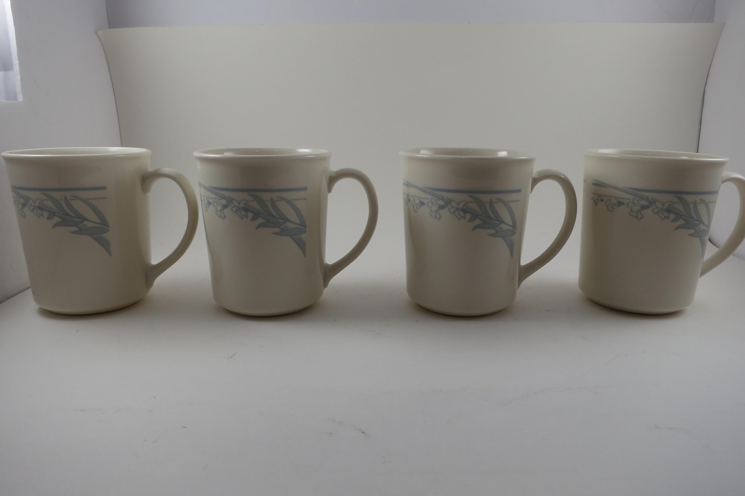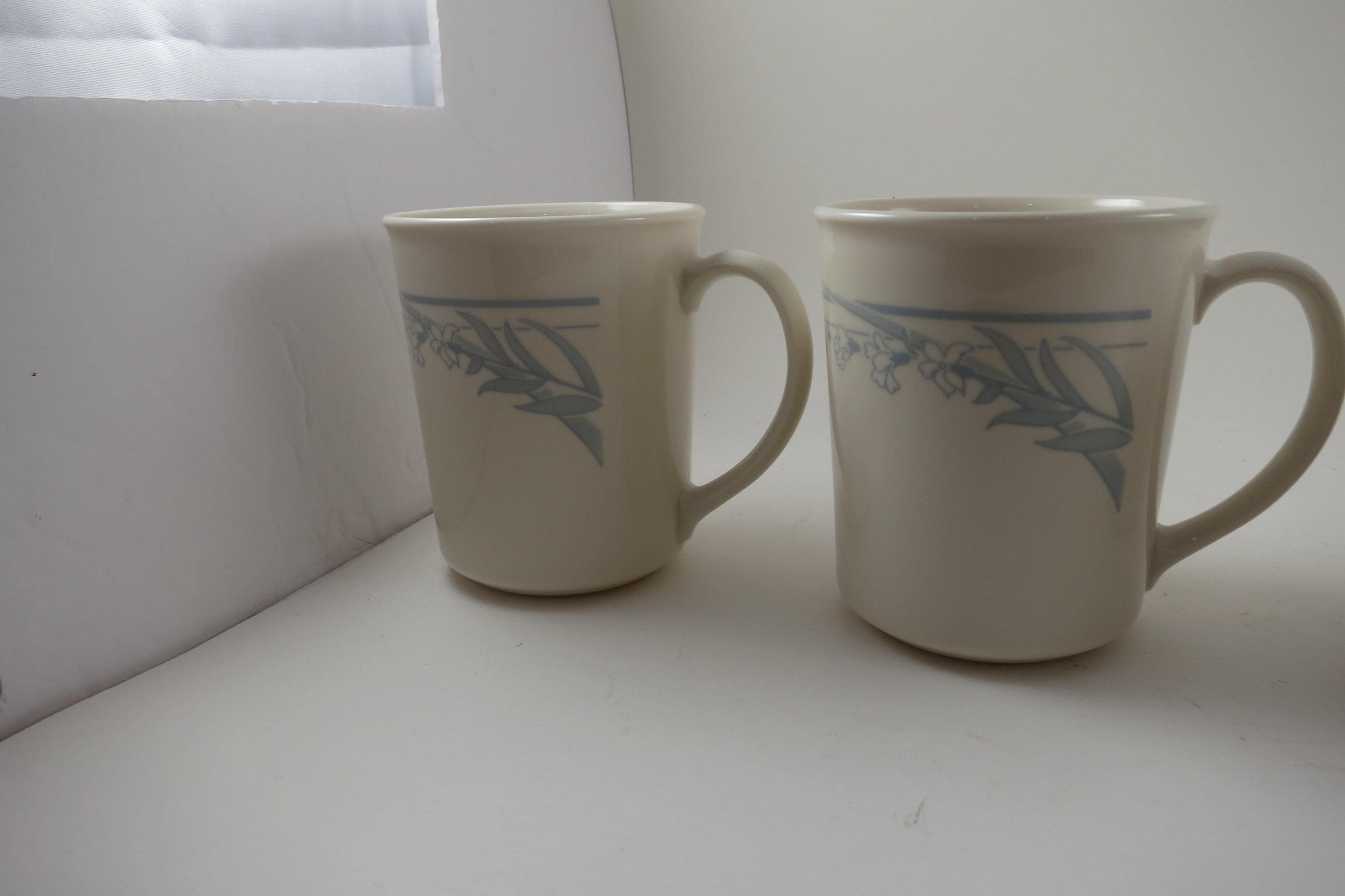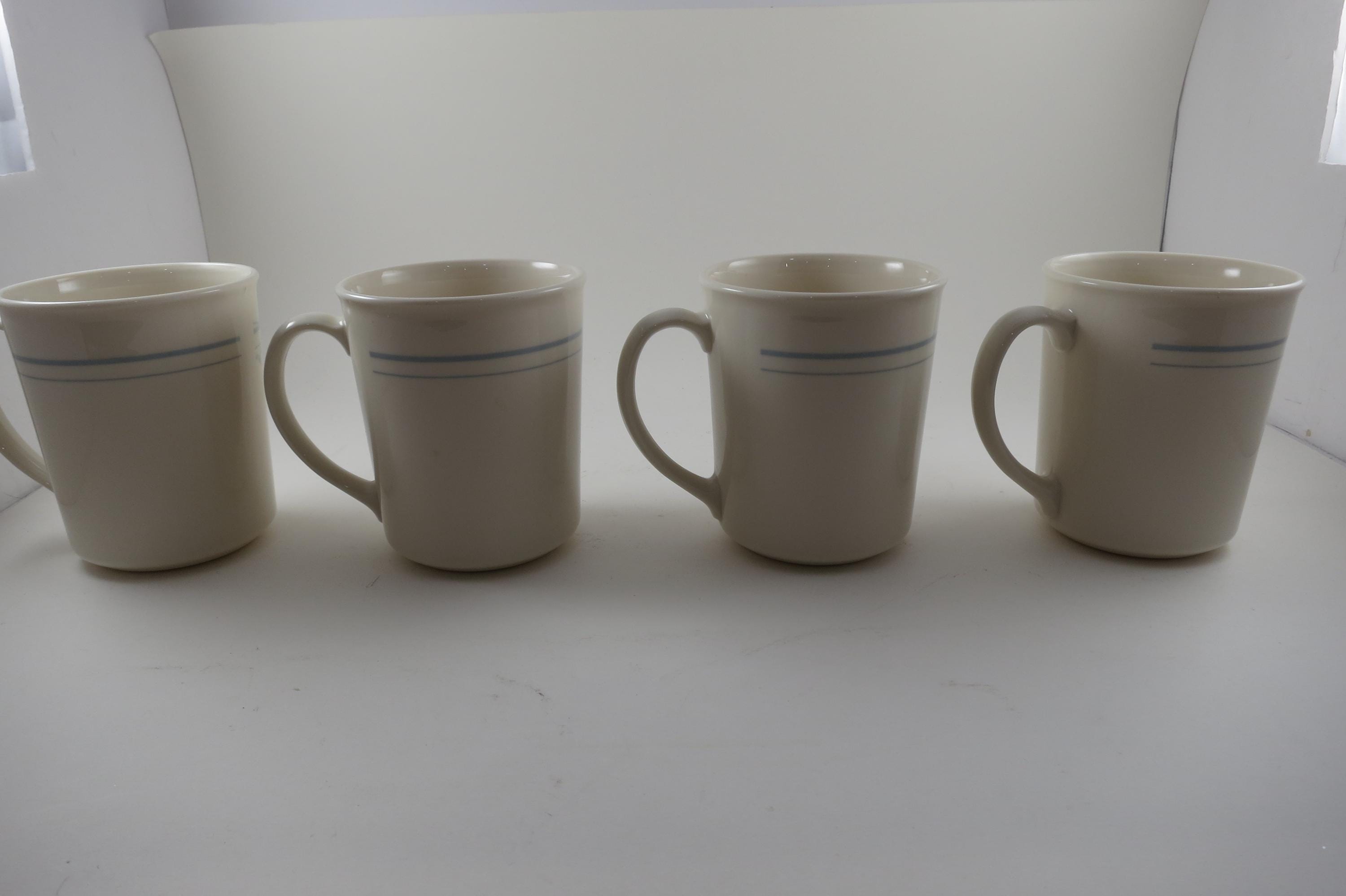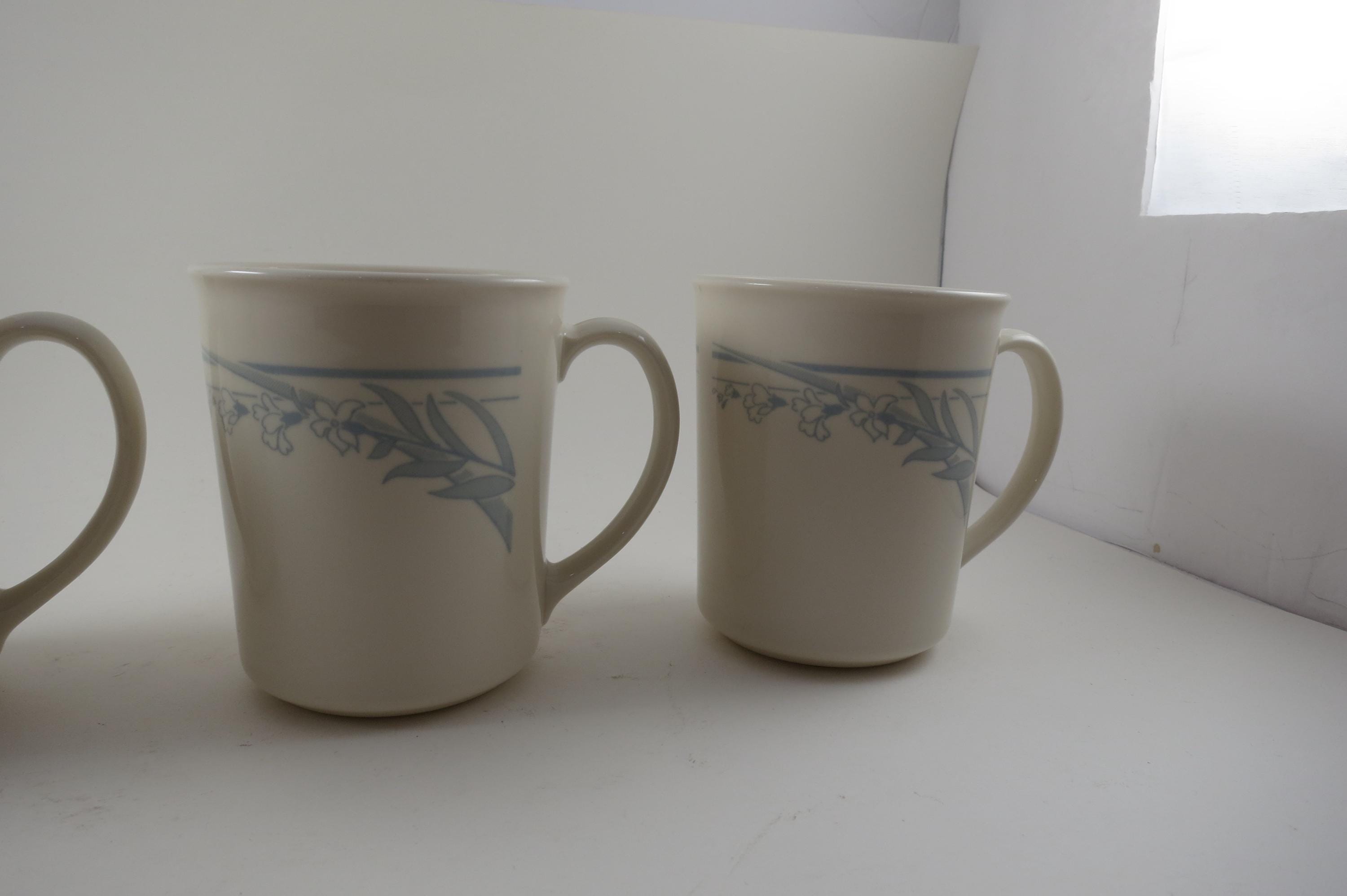 Vintage Corelle Coffee Mugs: Blue Lily Pattern, Set of 4. No chips, cracks or damages. All four are in excellent condition. These cups measure 3 3/4 inches tall.