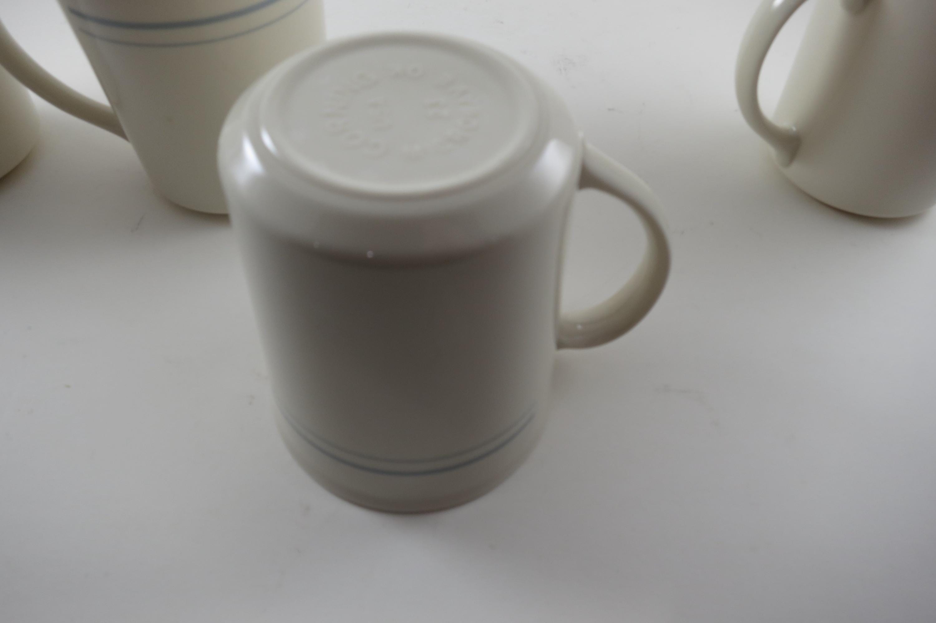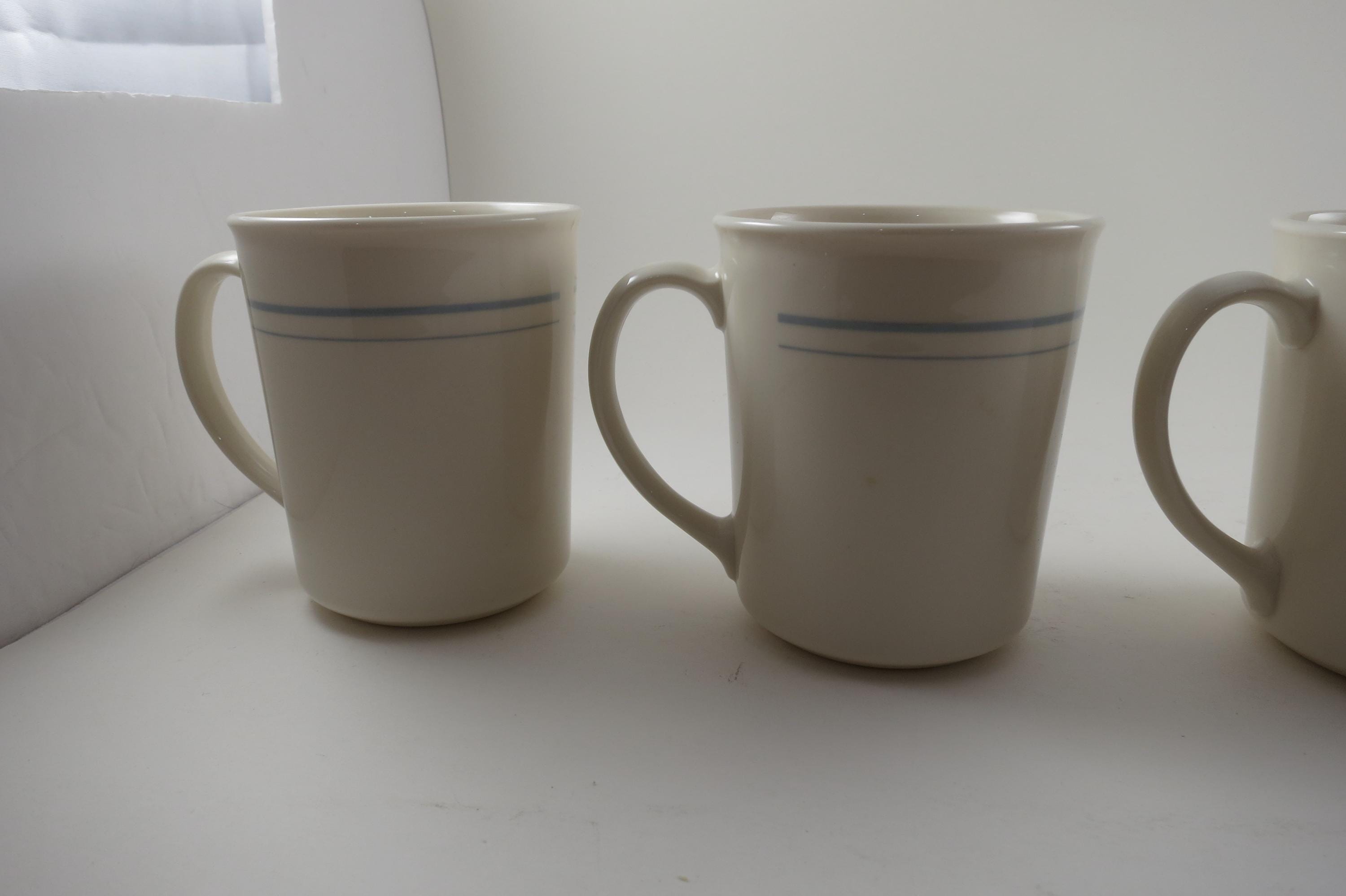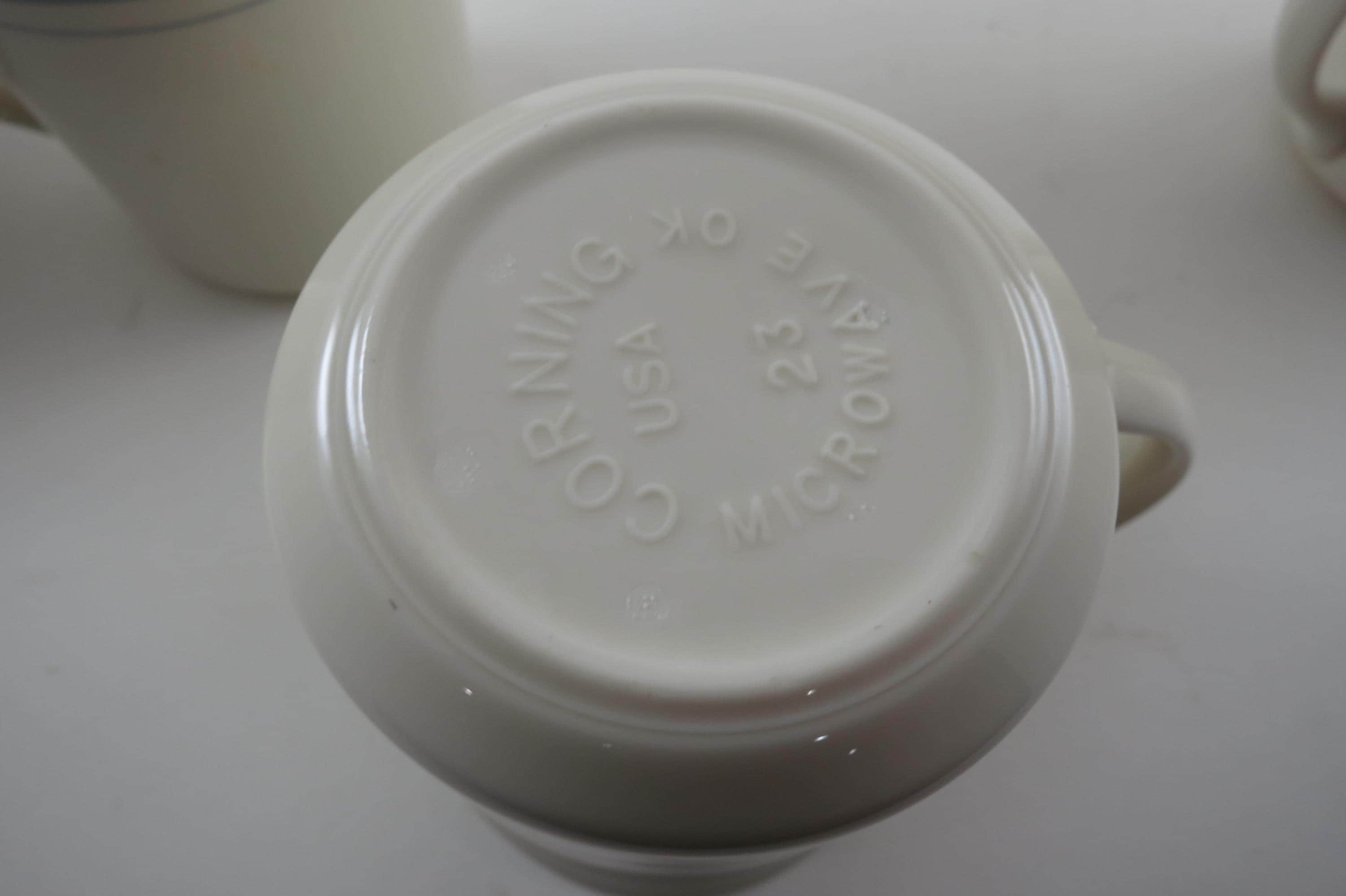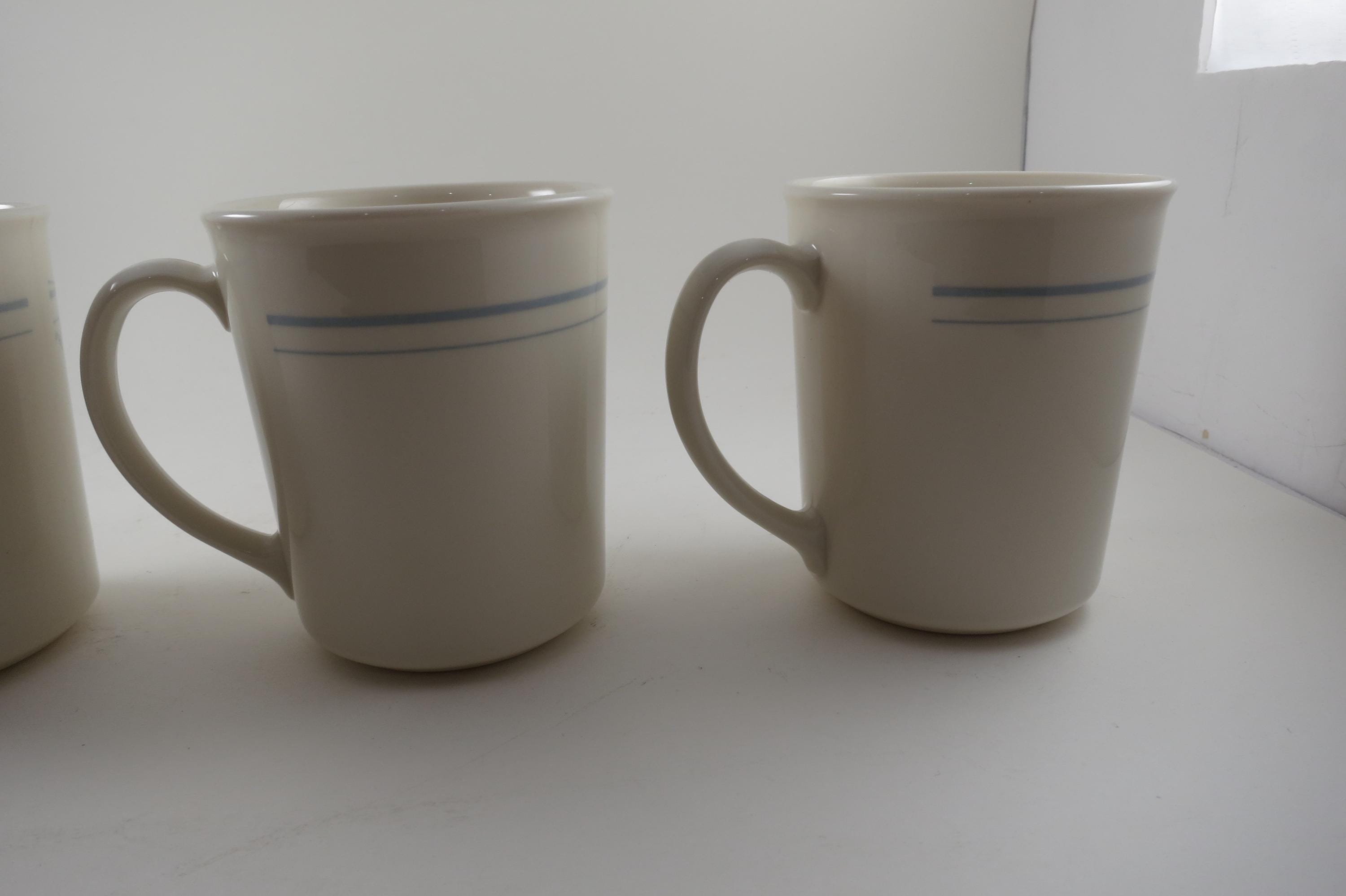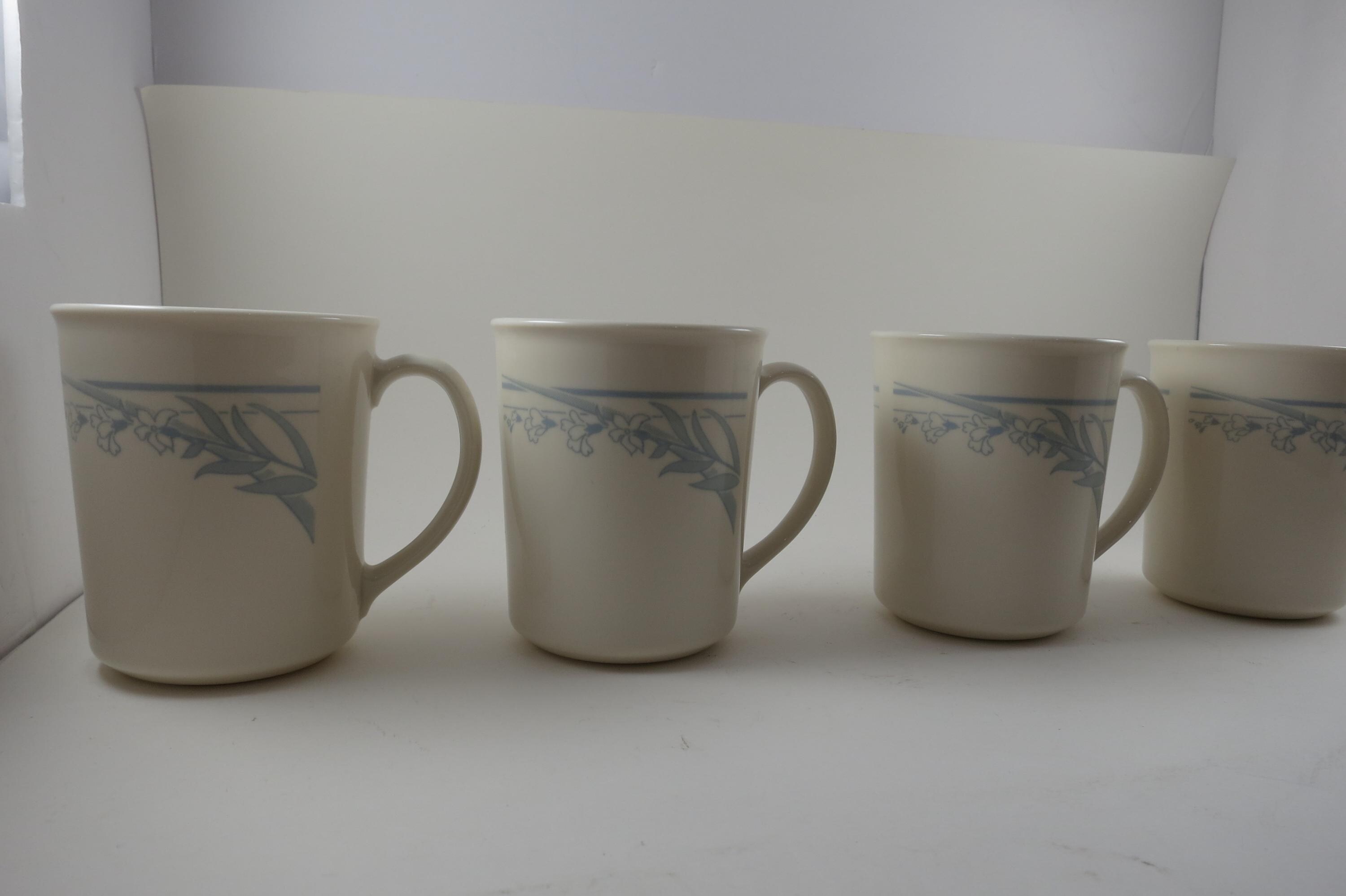 Vintage Corelle Coffee Mugs: Blue Lily Pattern, Set of 4. No chips, cracks or damages. All four are in excellent condition. These cups measure 3 3/4 inches tall.