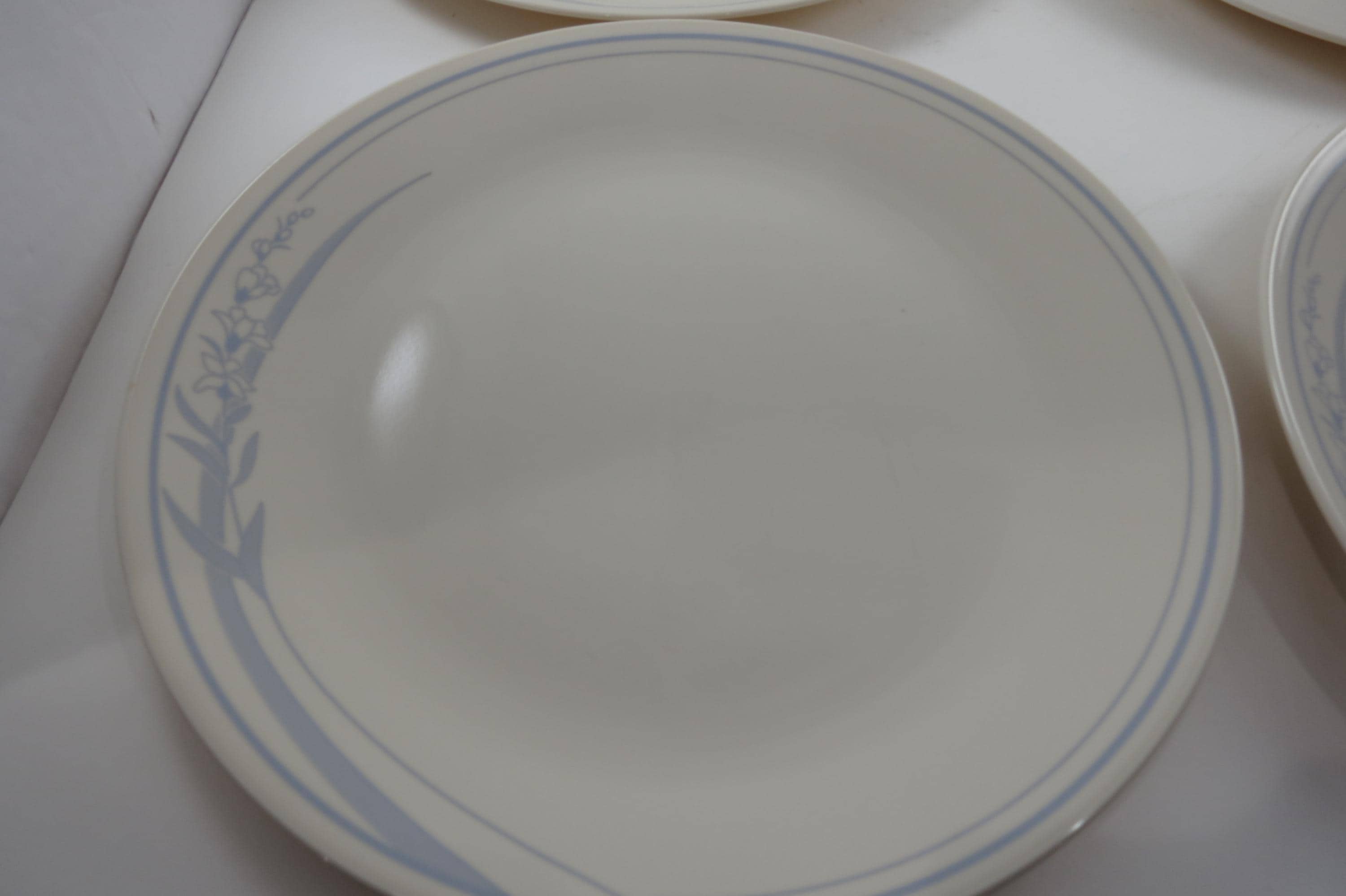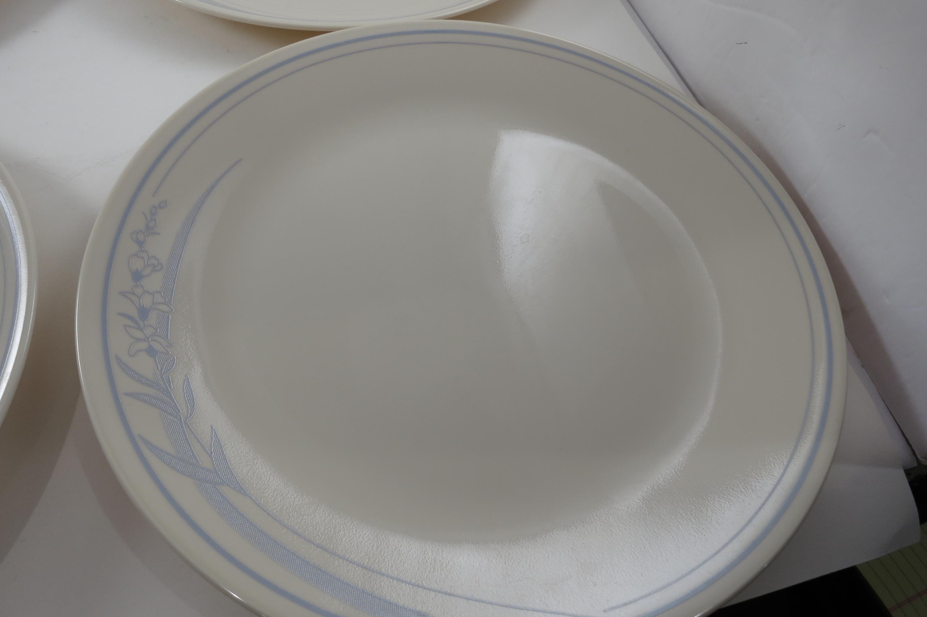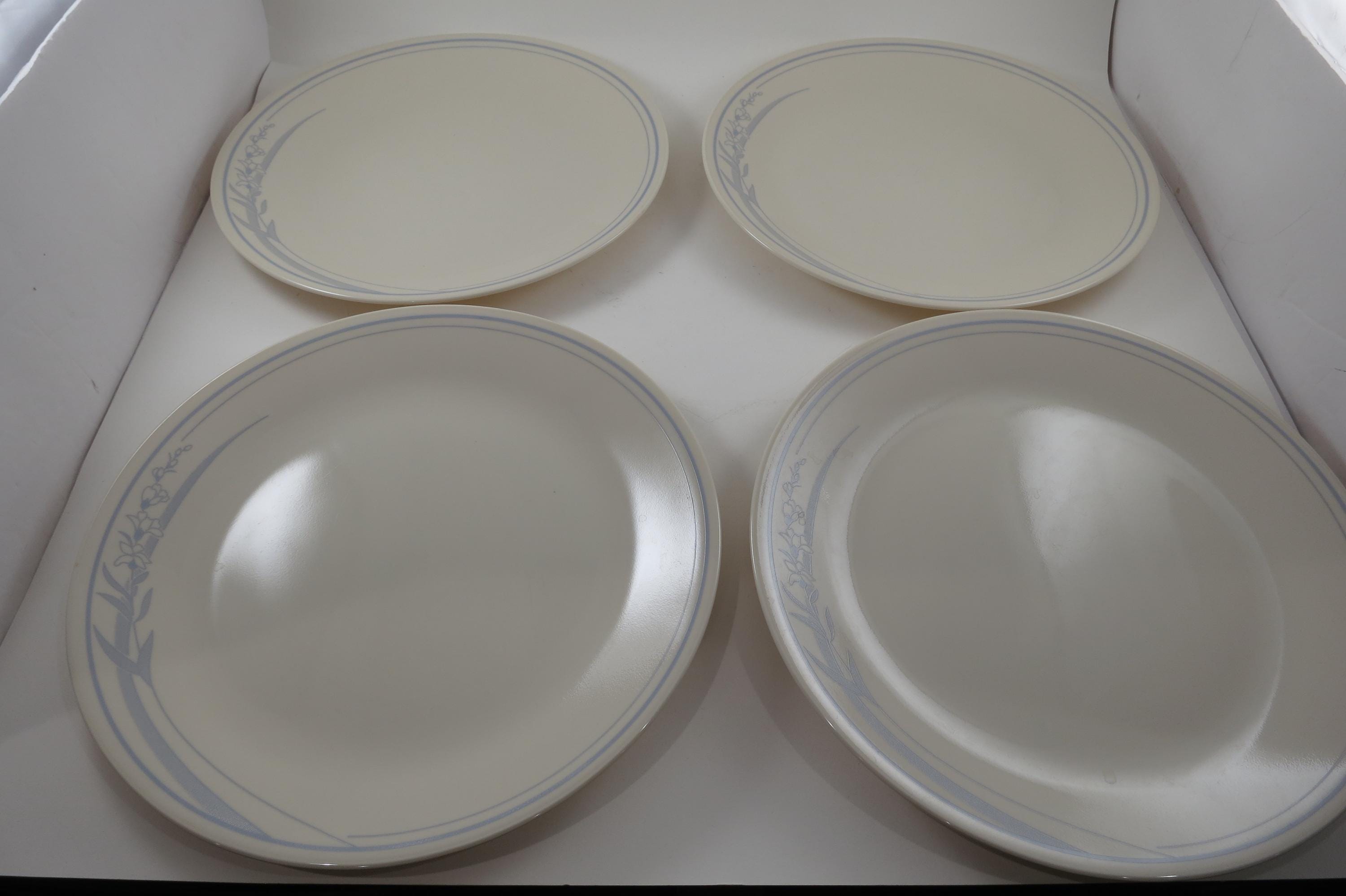 Vintage Corelle Dinner Plates: Blue Lily Pattern, Set of 4. No chips, cracks or damages. All four are in excellent condition. These dinner plates measure 10 1/4 inches.