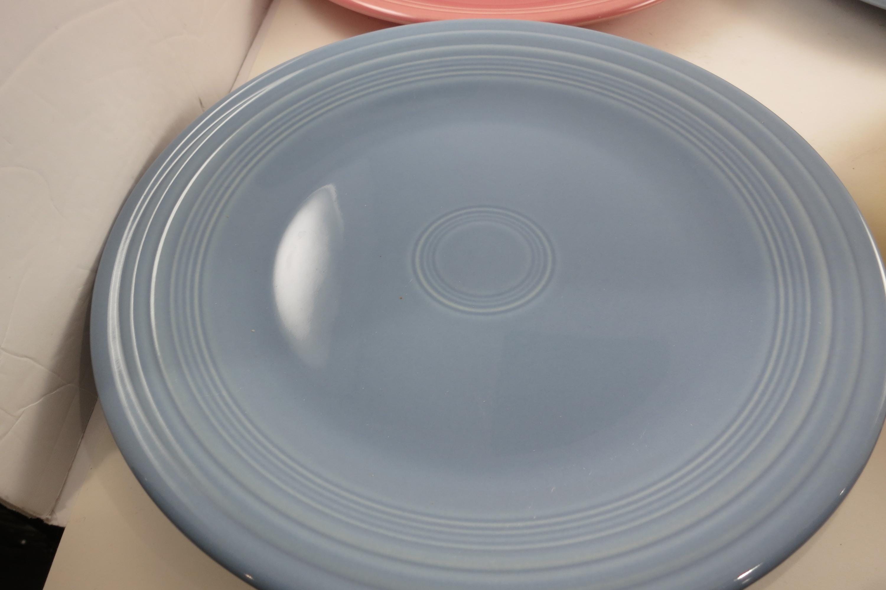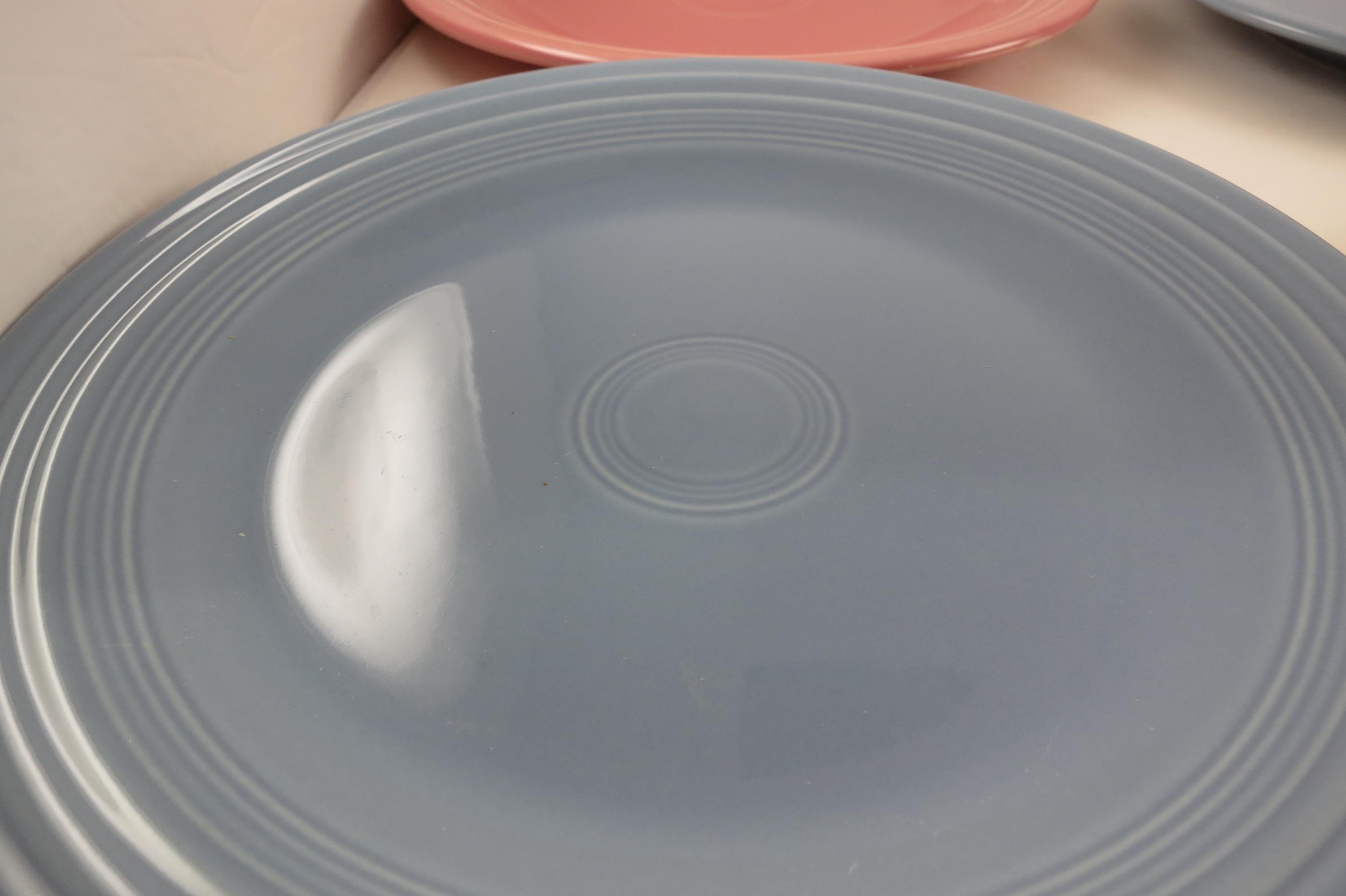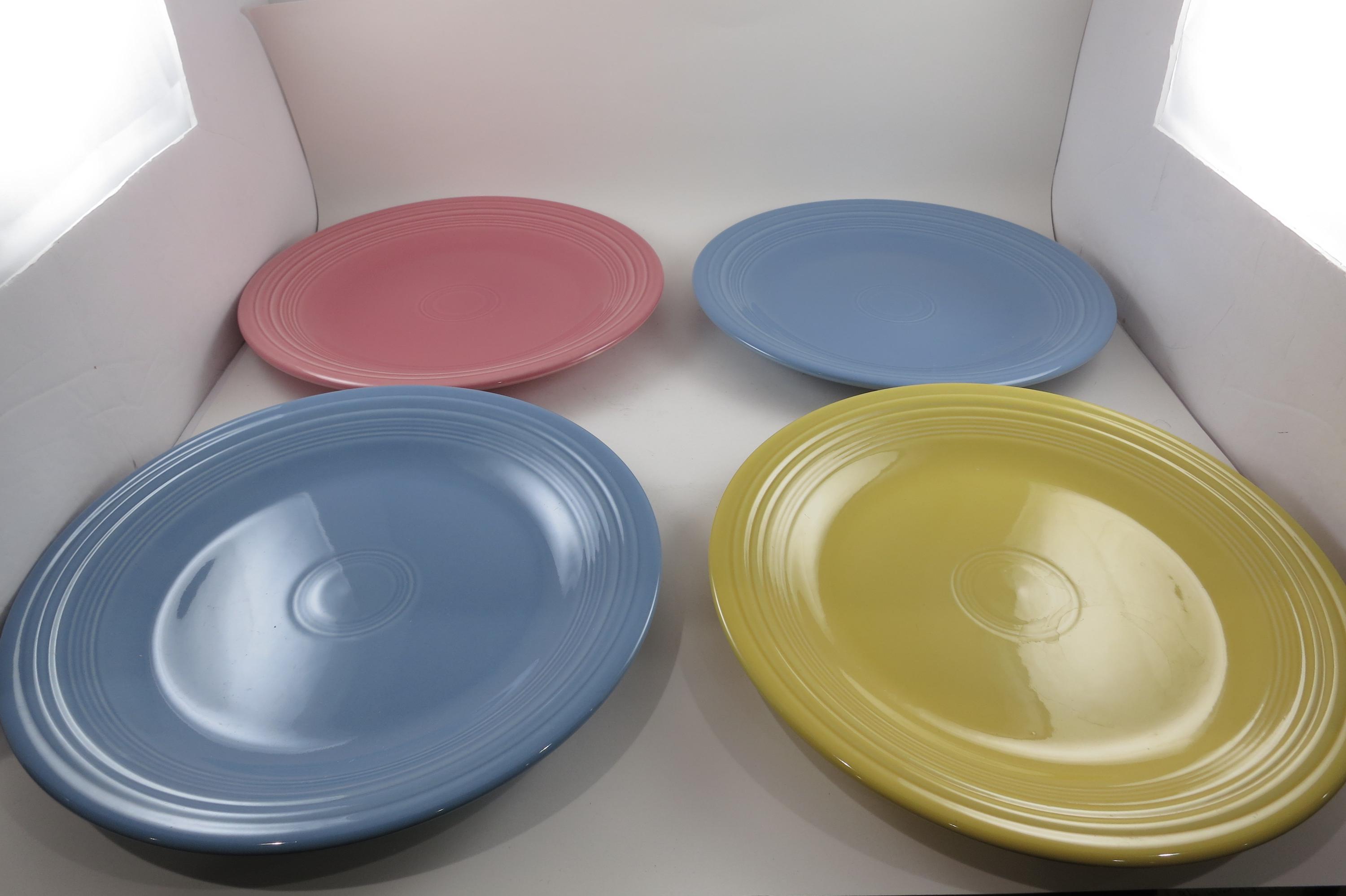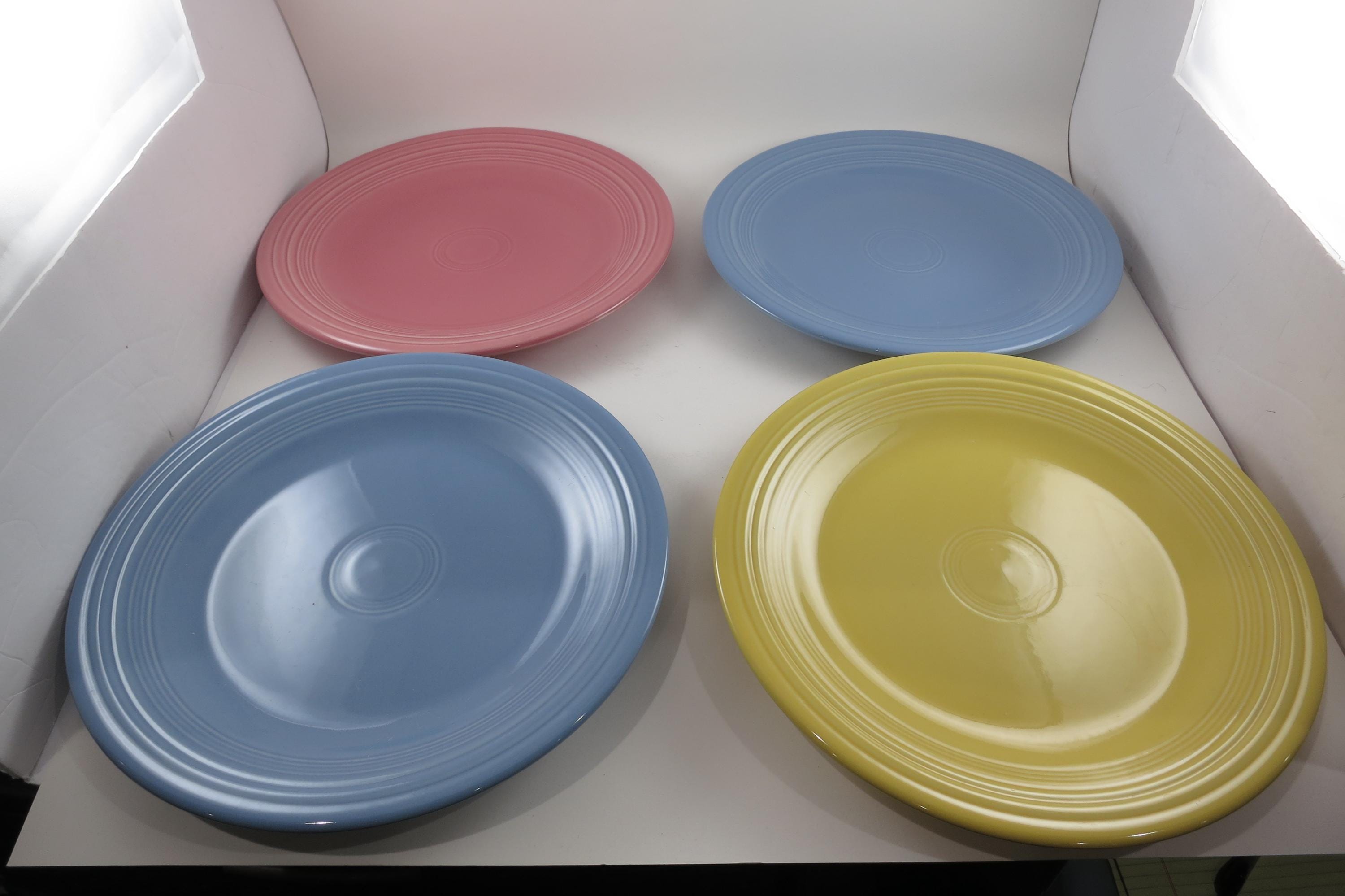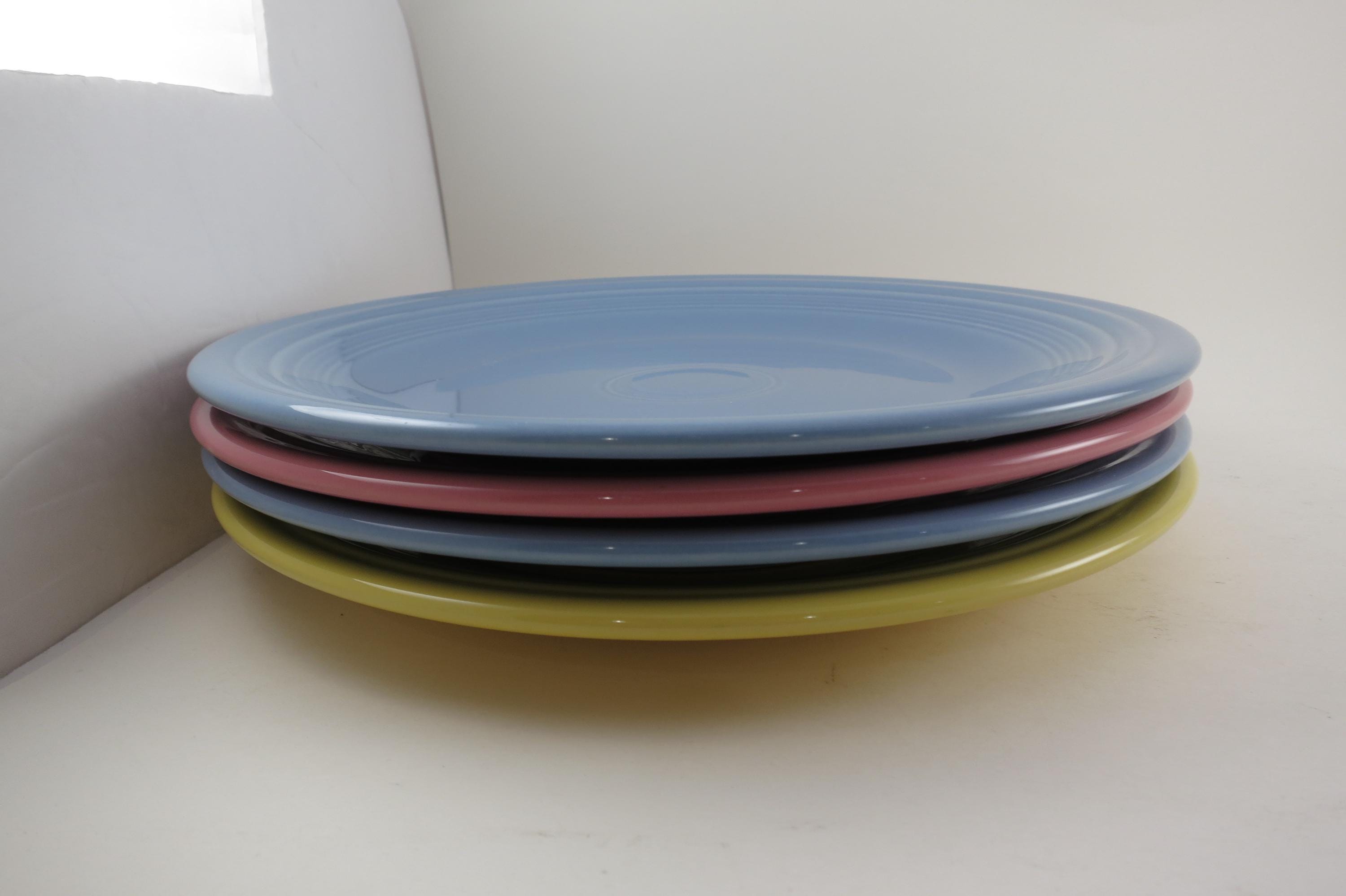 Set of Four Vintage Fiesta Ware 10 1/2 Inch Dinner Plates Blue Yellow Pink.