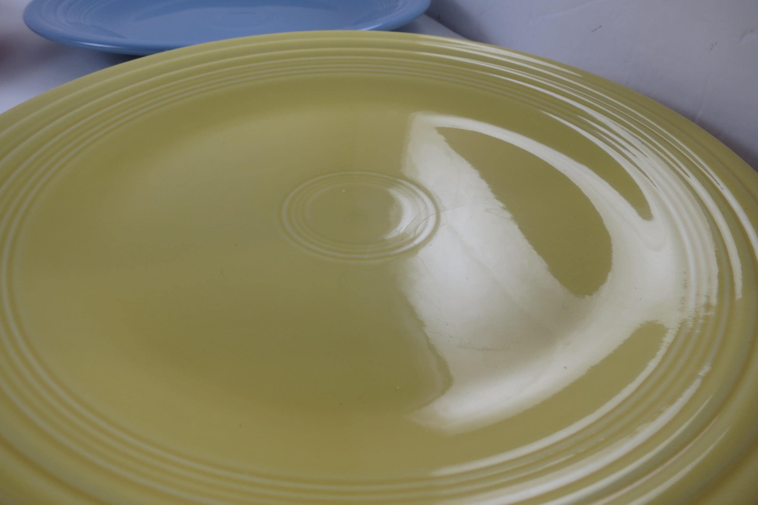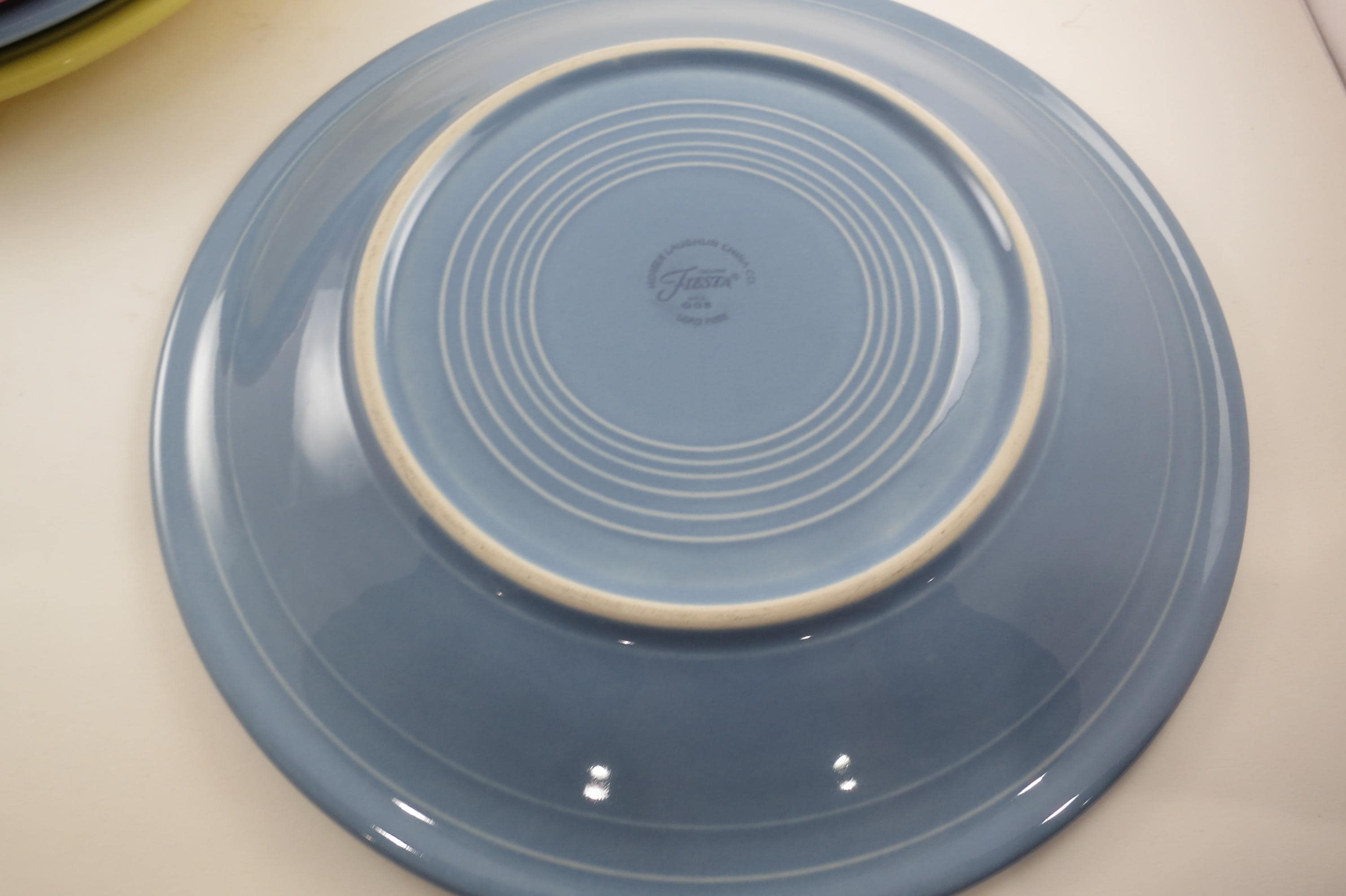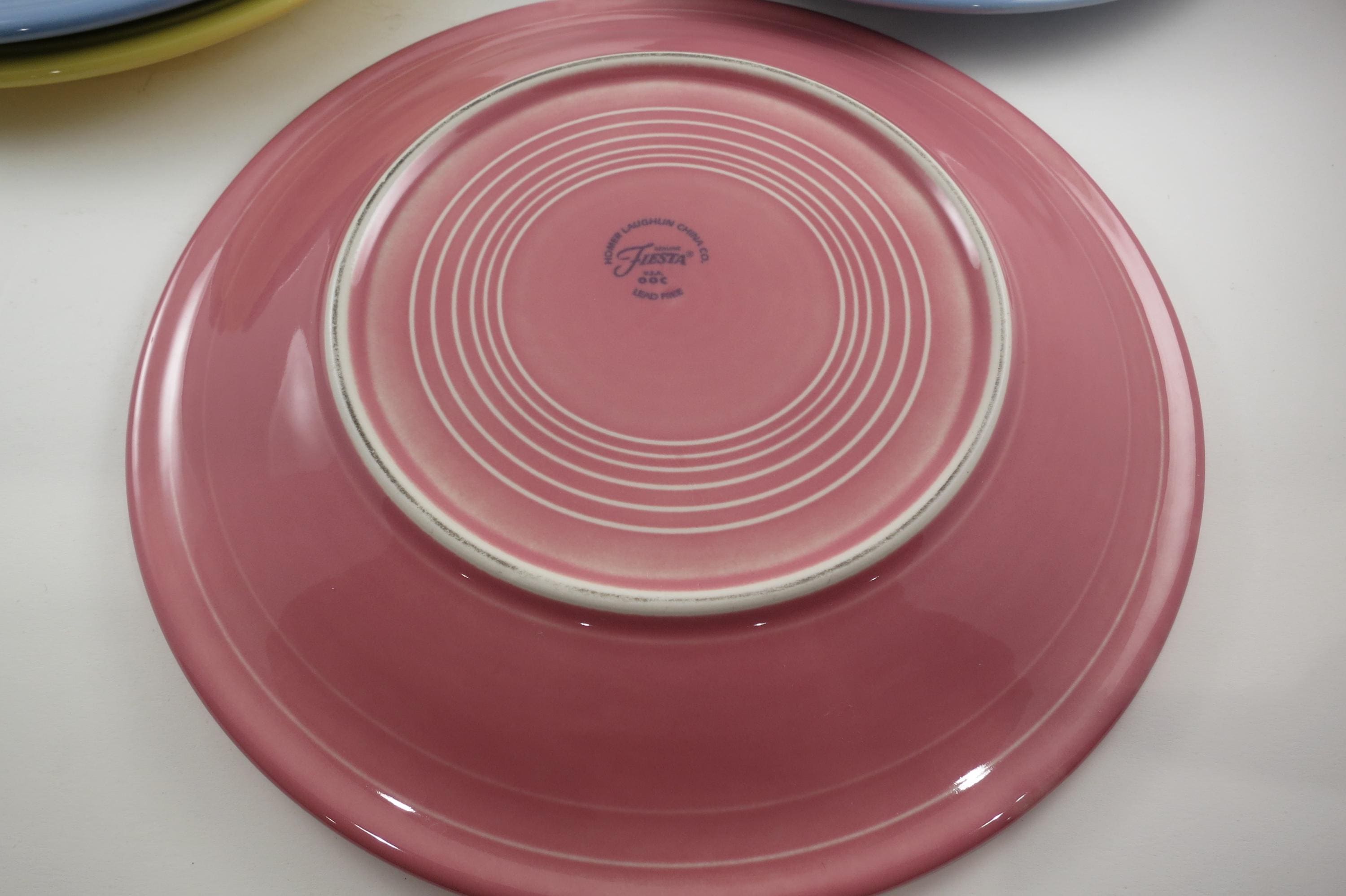 All four are in excellent condition with no chips, cracks or damages. Each measures 10 1/2 Inches in Diameter. Two blue, one yellow and one pink.