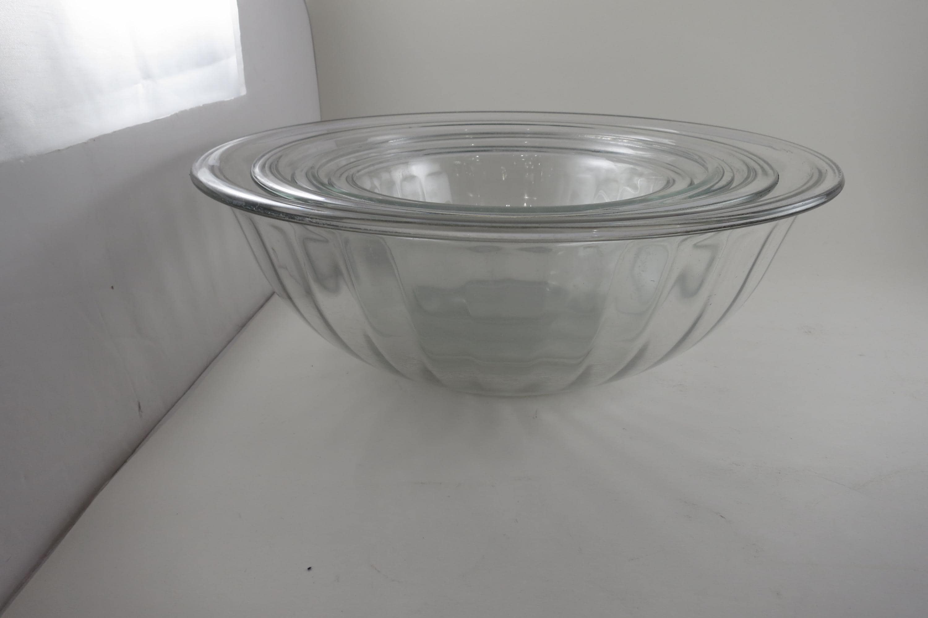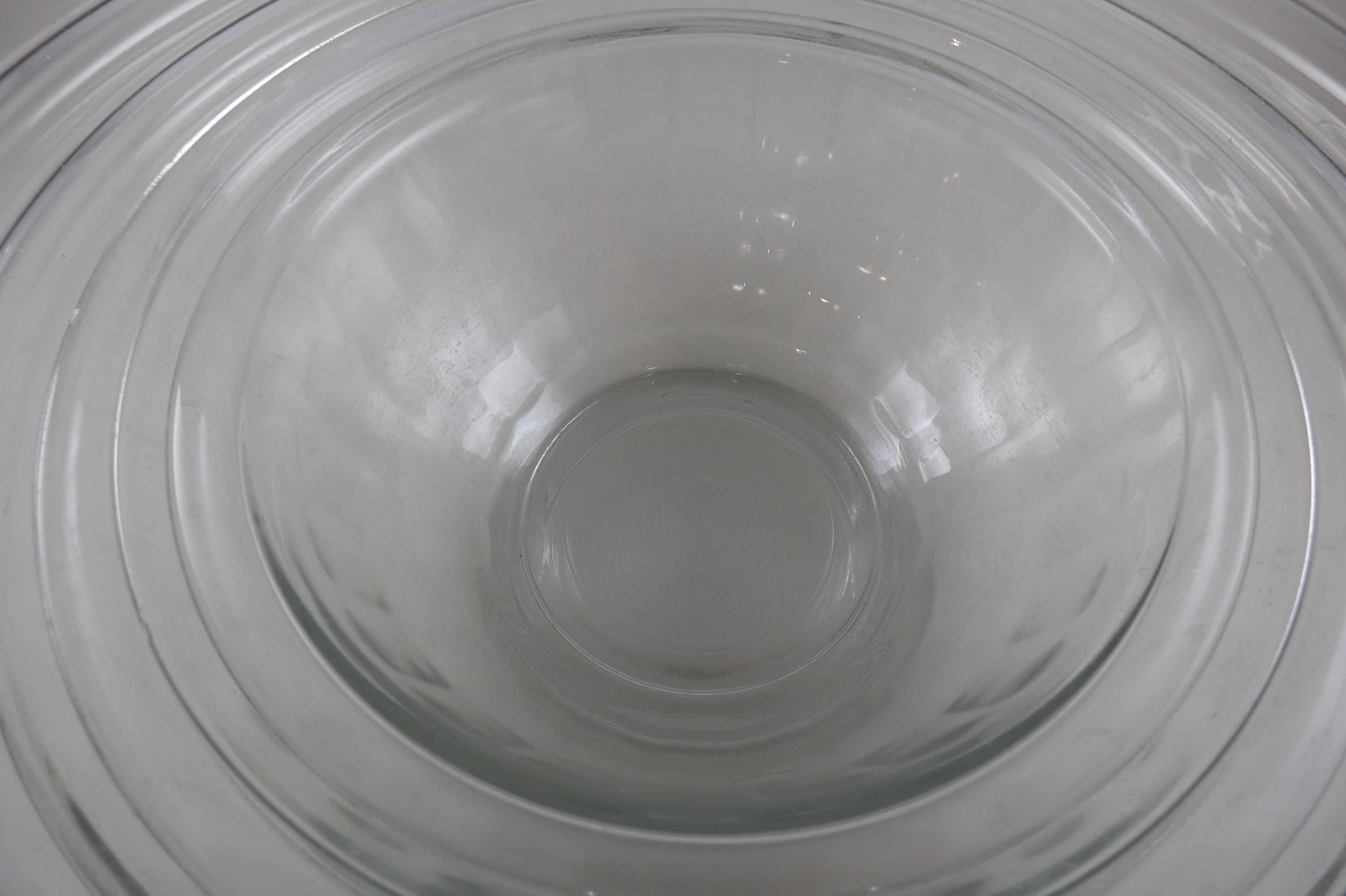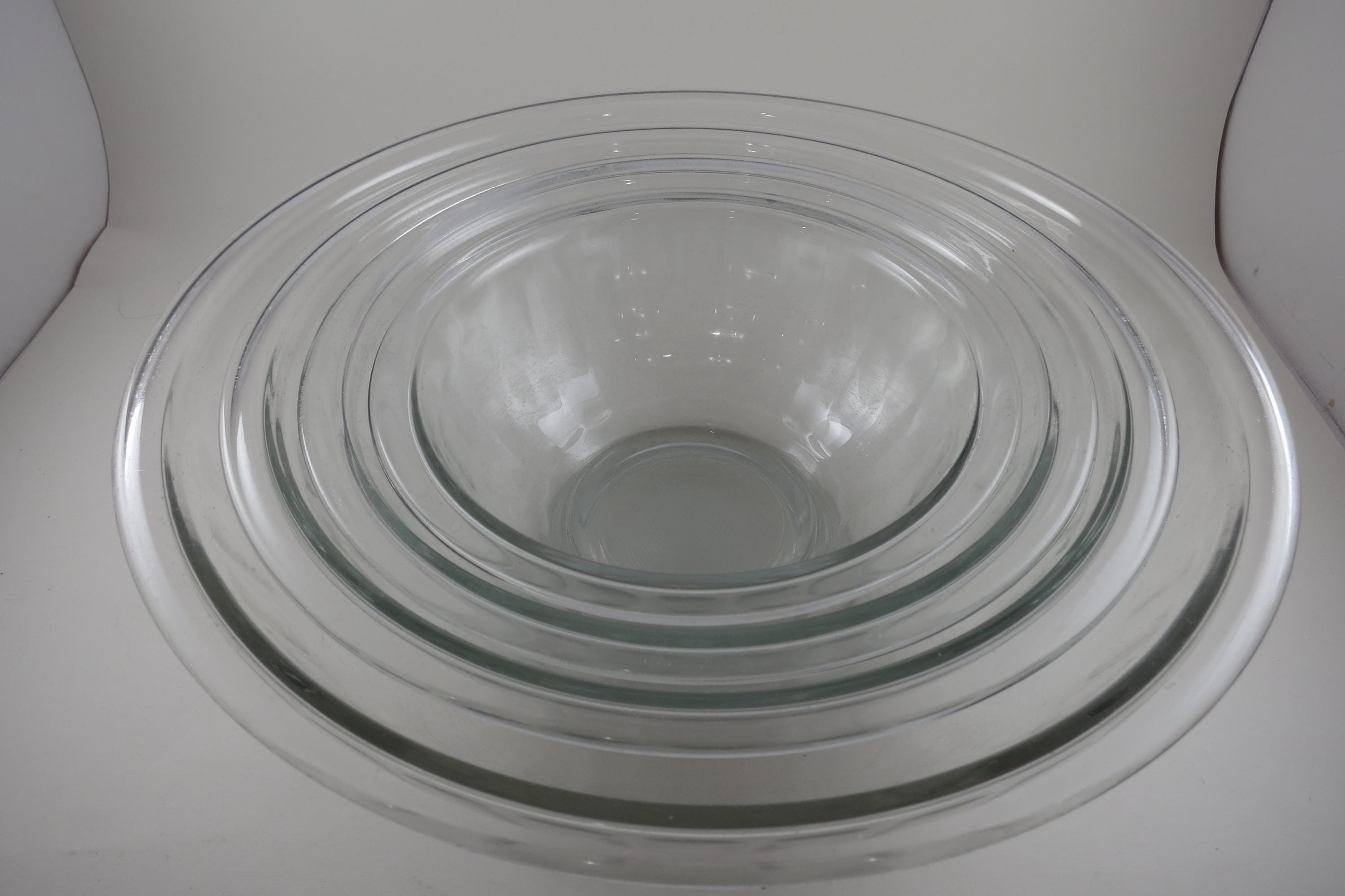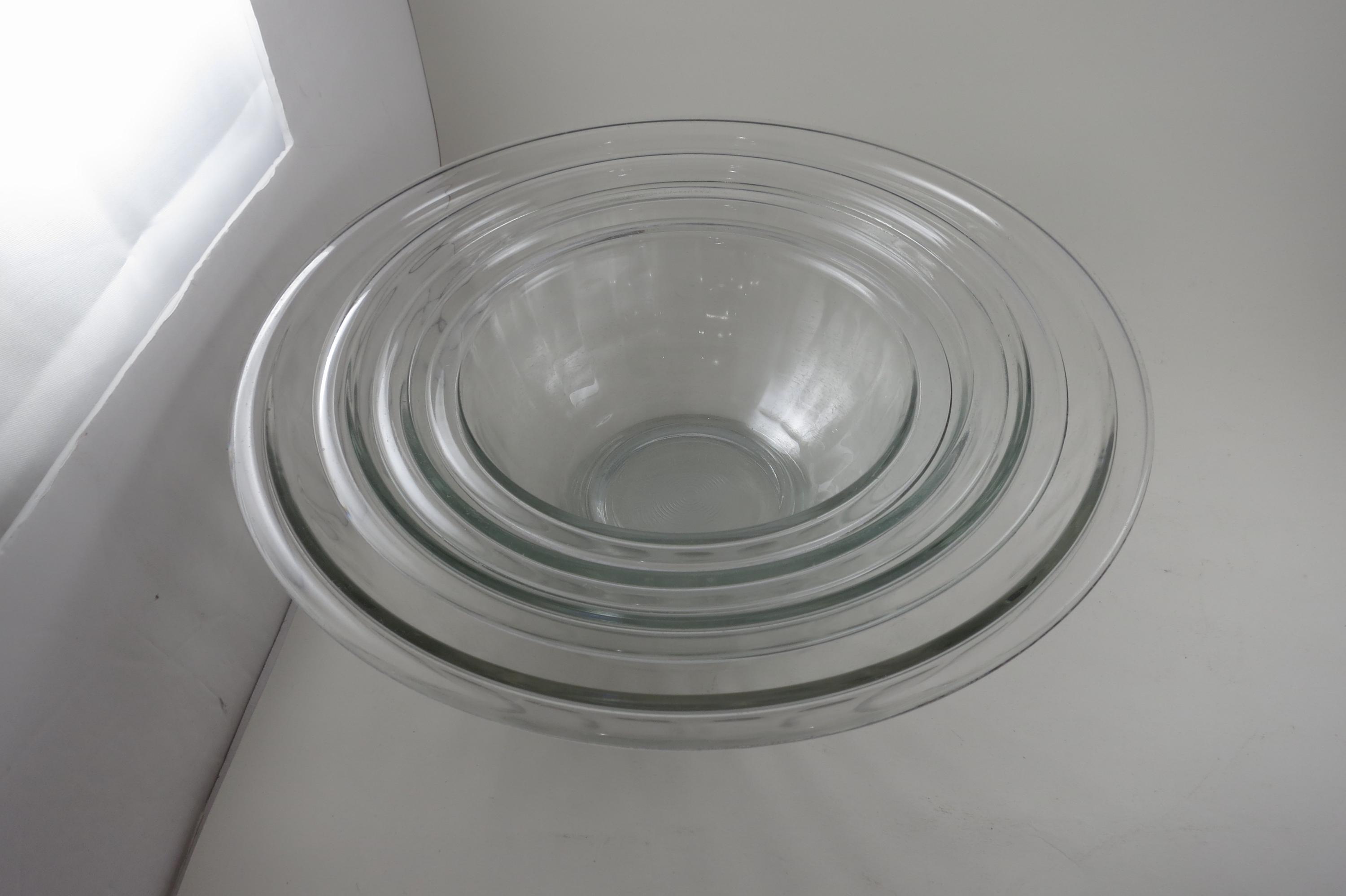 Vintage Pyrex Nesting Bowl Set: 4 Piece 322 323 325 326 Clear. Very Good and Excellent Original Condition Please Read Description. One each of 322 1 Liter, 323 1.5 Liter and 325 2.5 Liter and 326 4.0 Liter. These have been used and show wear. The 322 and 326 are in excellent condition. The 323 and 325 are more worn, but No chips, cracks or damages on any of them.