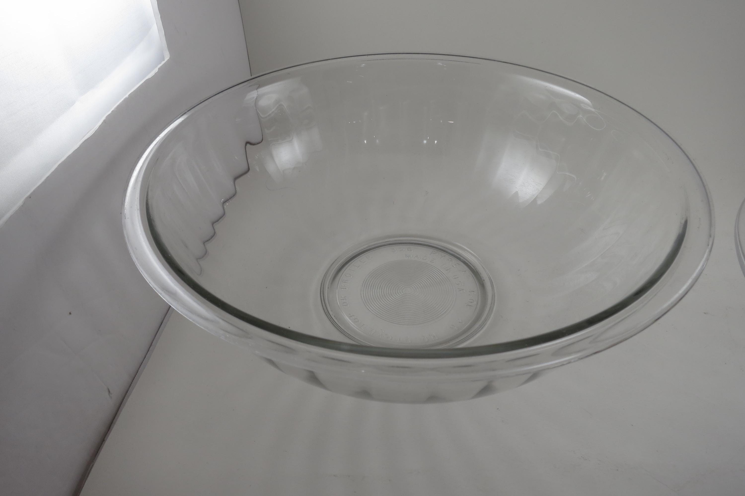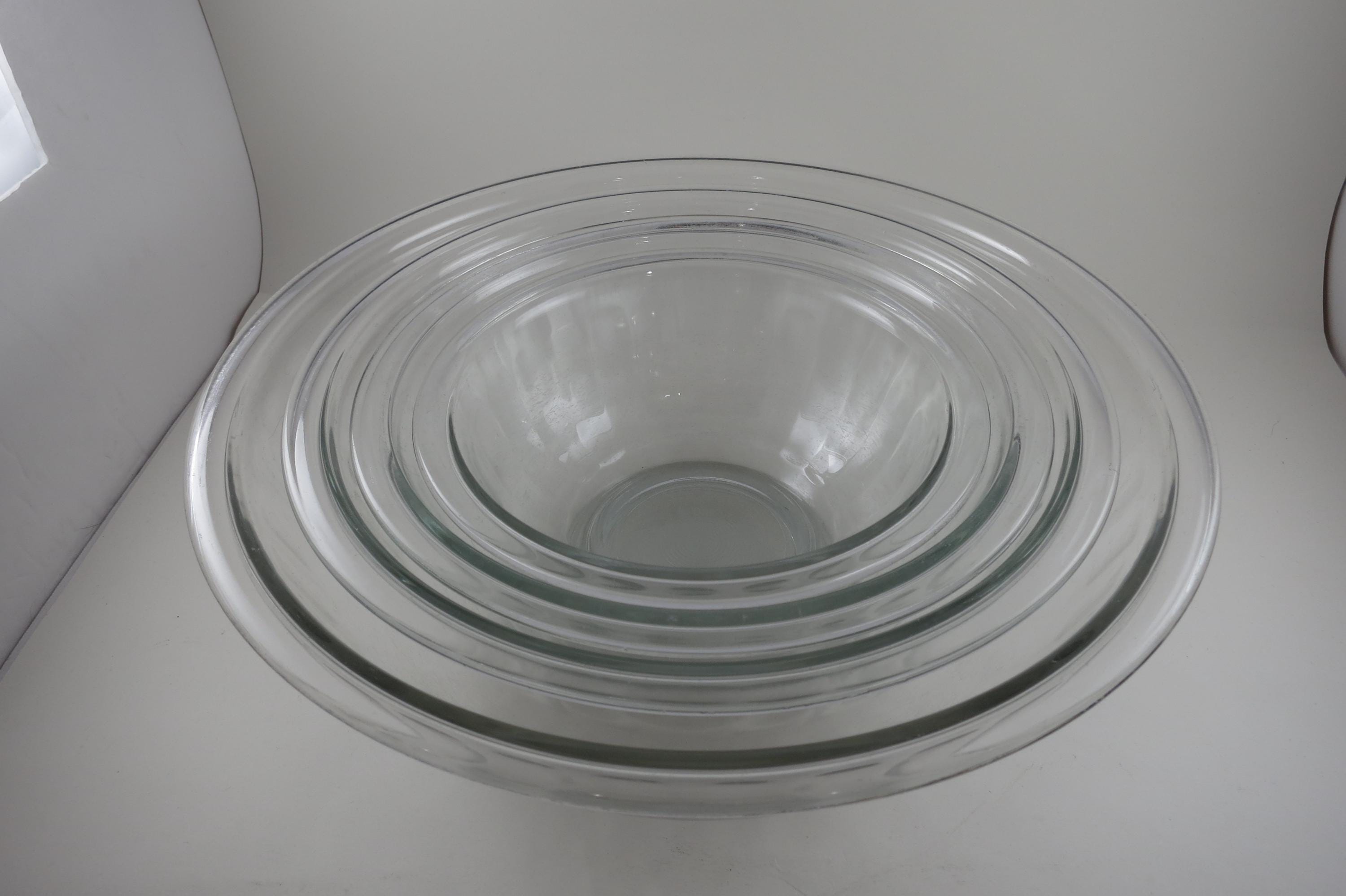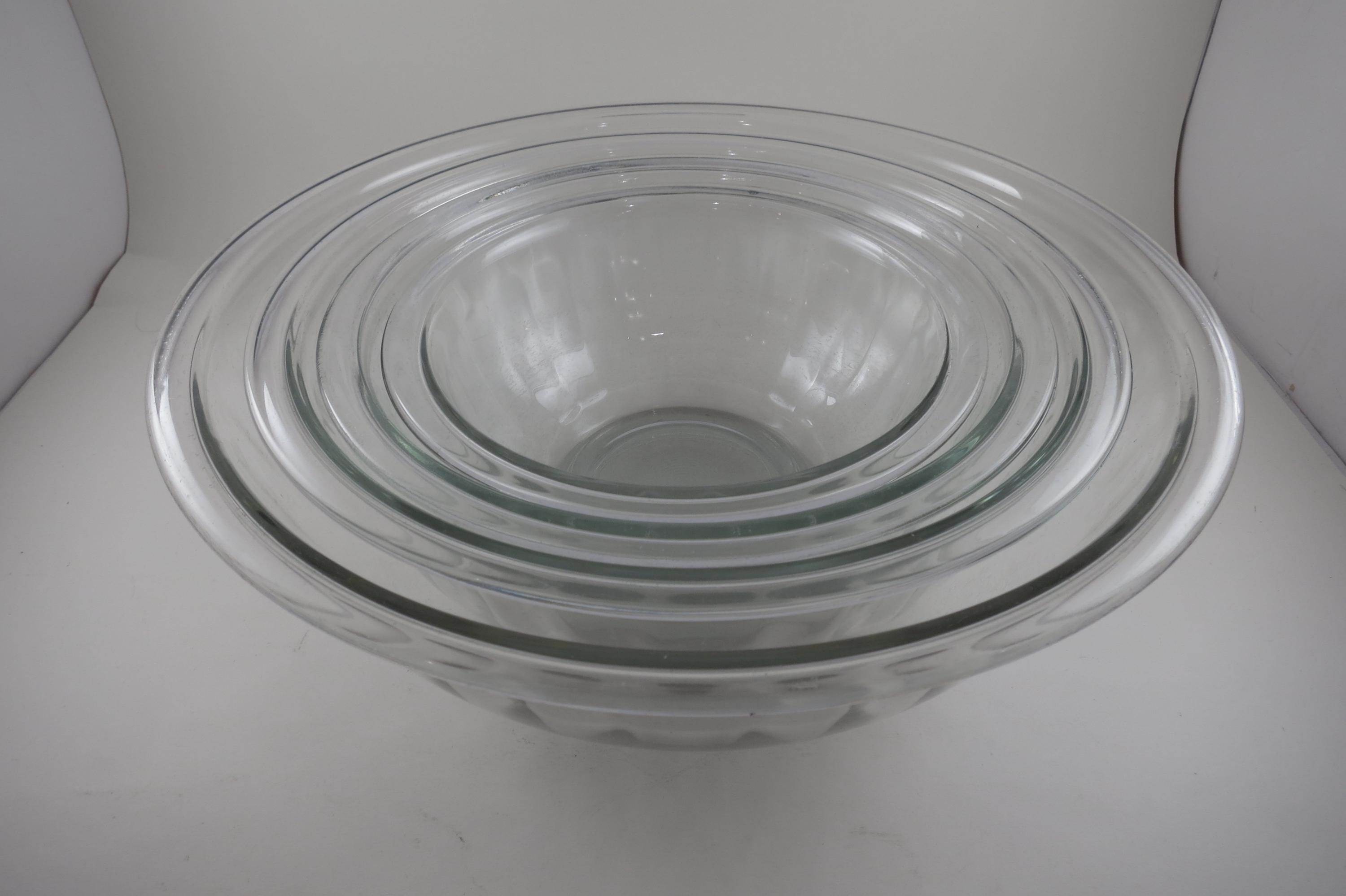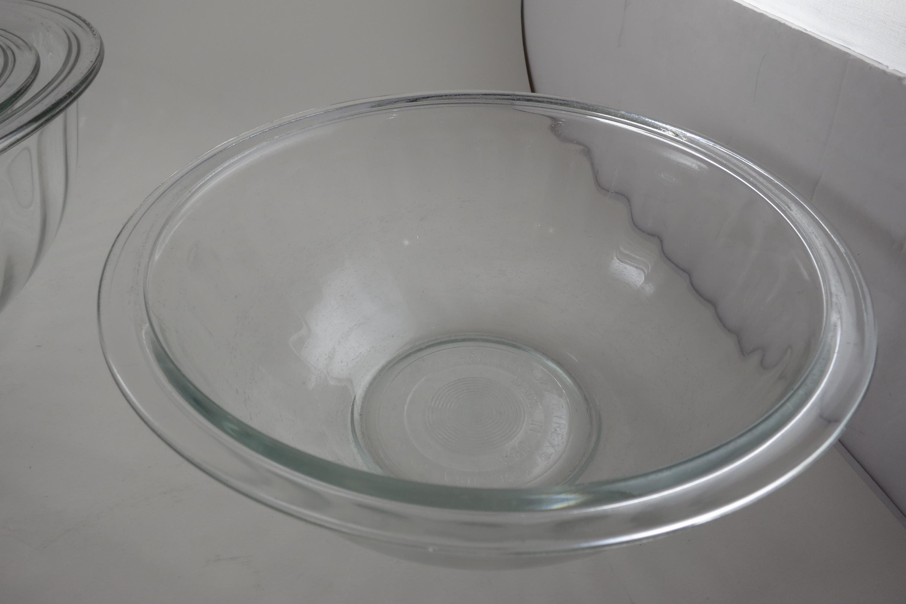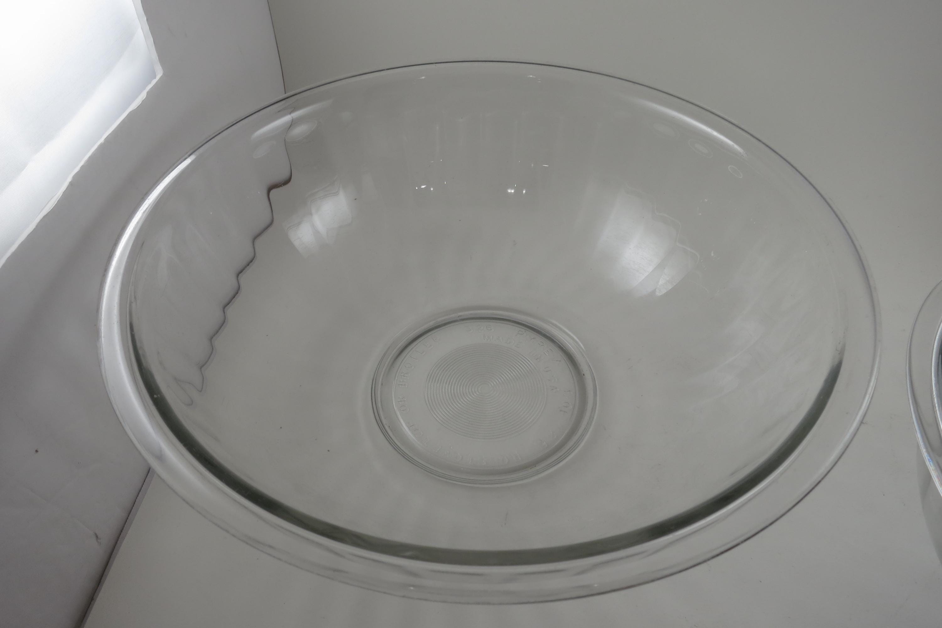 Vintage Pyrex Nesting Bowl Set: 4 Piece 322 323 325 326 Clear. Very Good and Excellent Original Condition Please Read Description. One each of 322 1 Liter, 323 1.5 Liter and 325 2.5 Liter and 326 4.0 Liter. These have been used and show wear. The 322 and 326 are in excellent condition. The 323 and 325 are more worn, but No chips, cracks or damages on any of them.