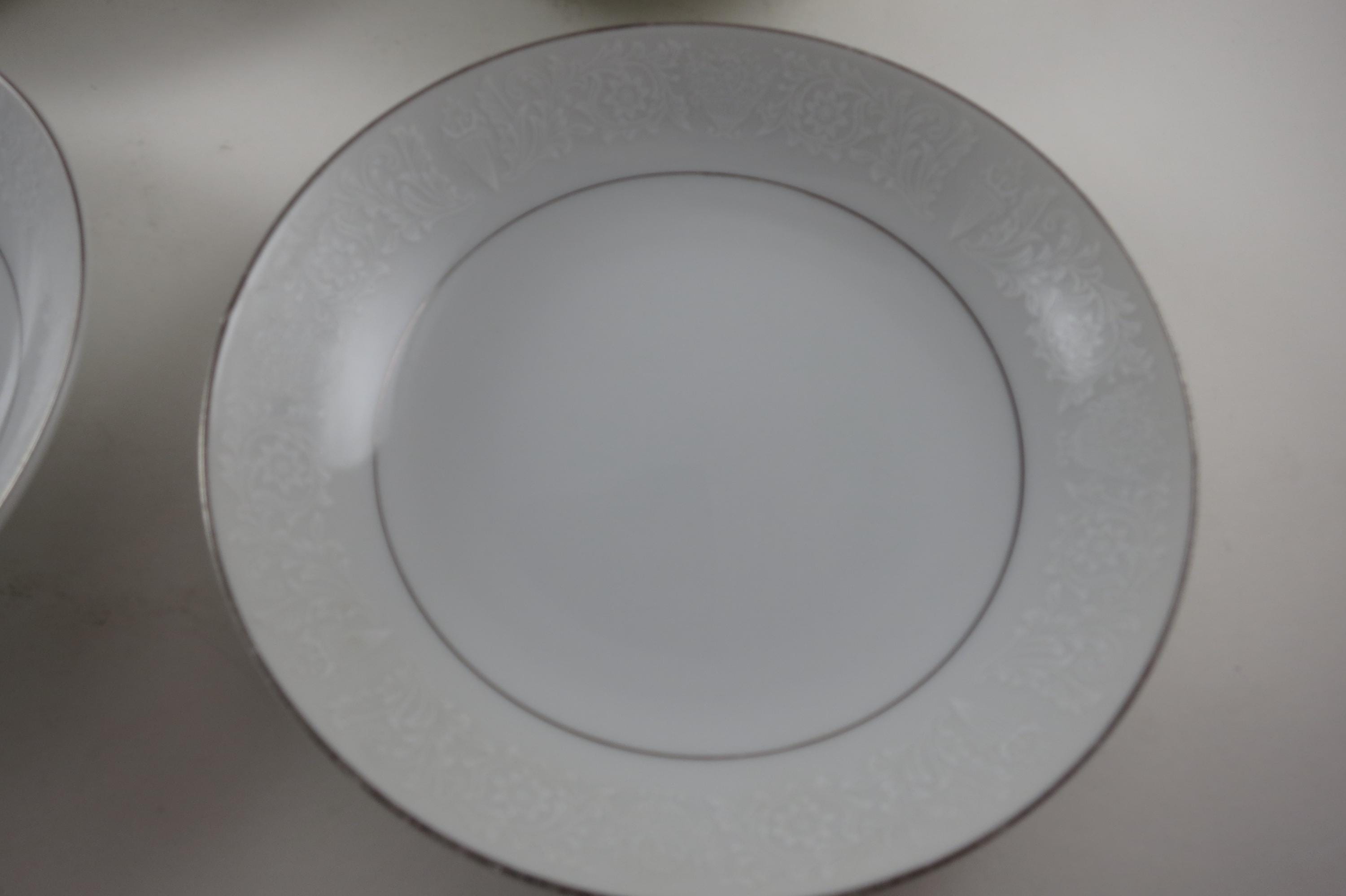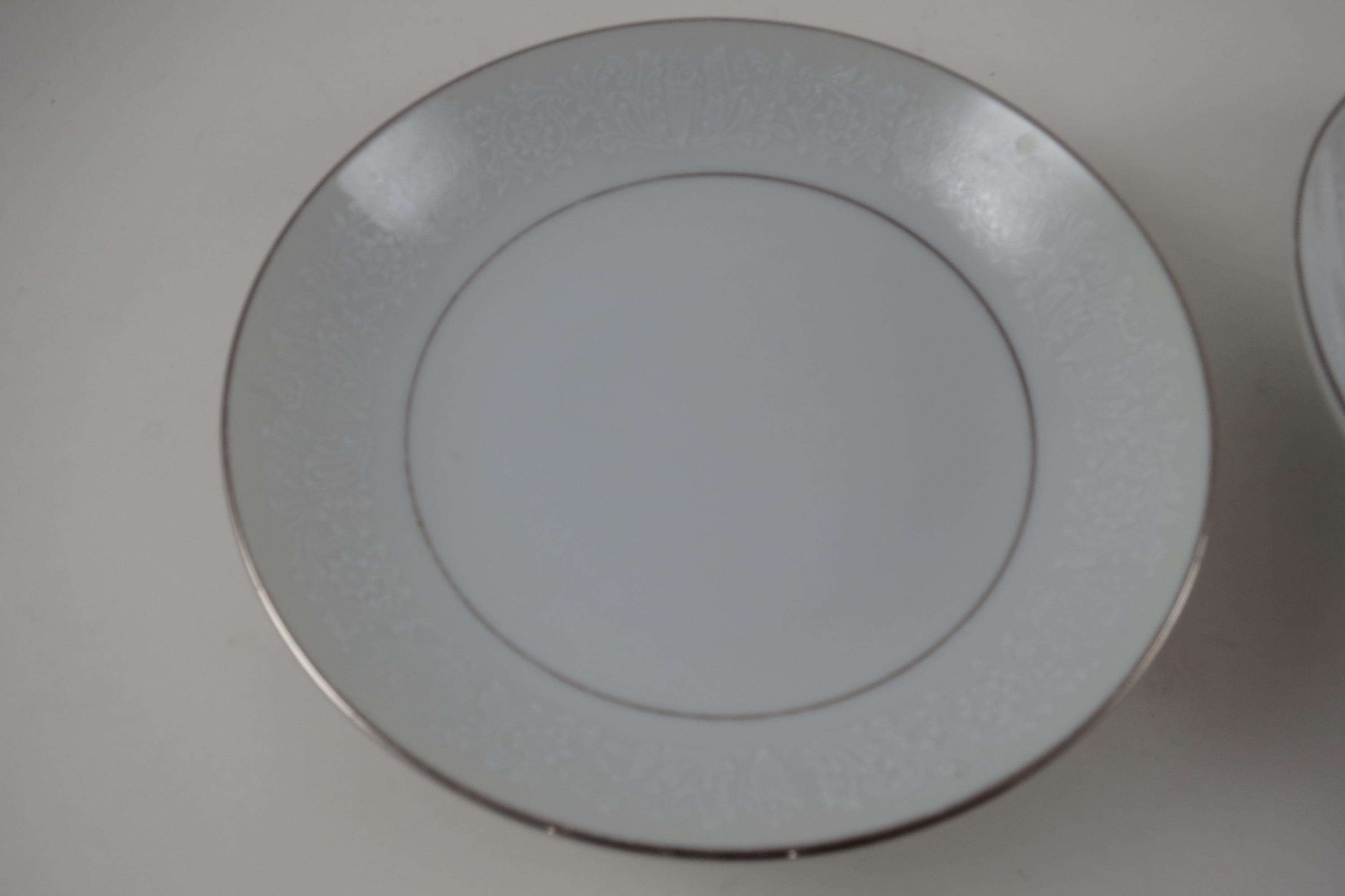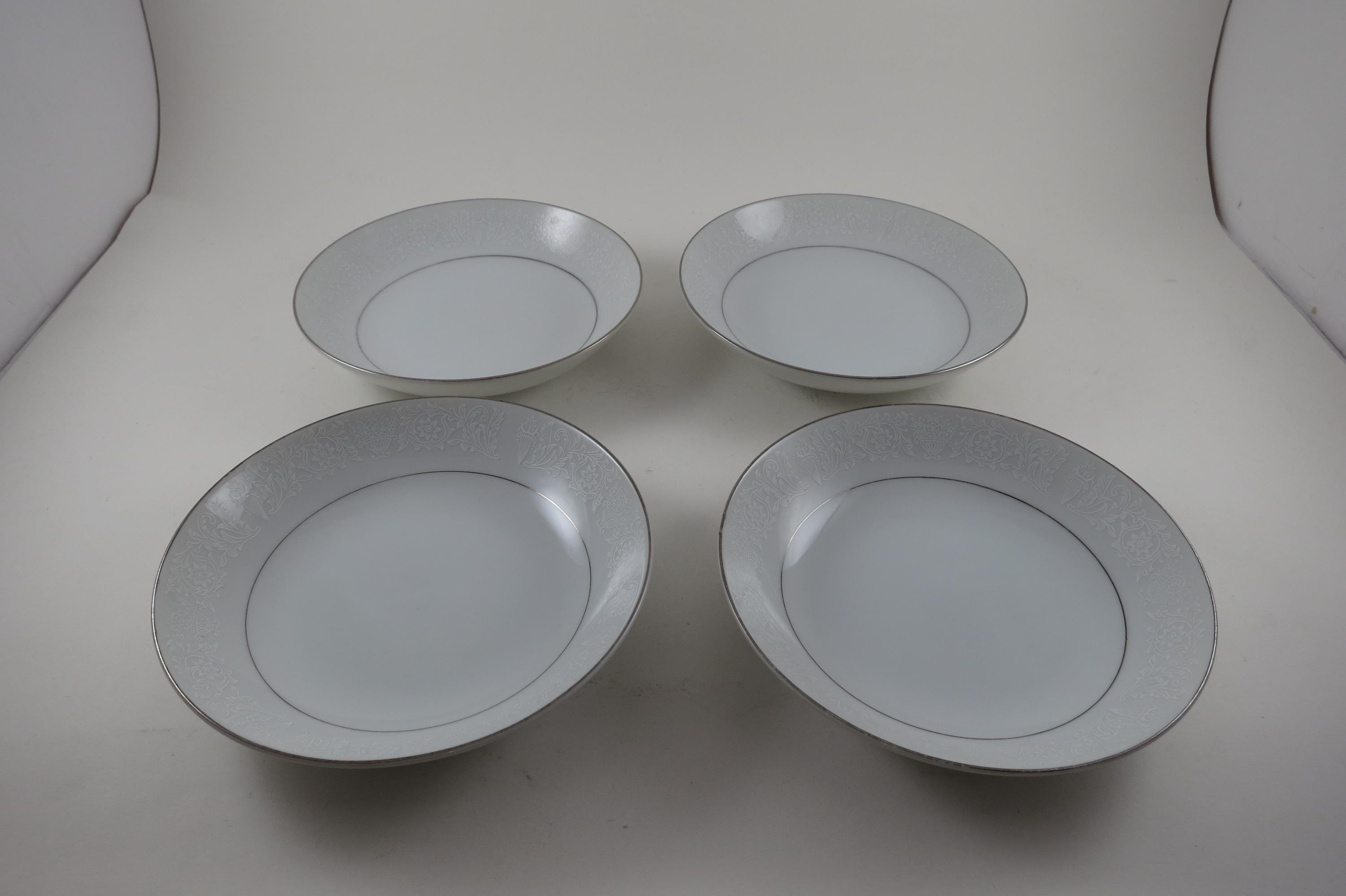 Vintage Crown Victoria Lovelace Fine China Set of 4 5 1/2 Inch Fruit Bowls. Beautiful White Background with white flowers and urns.