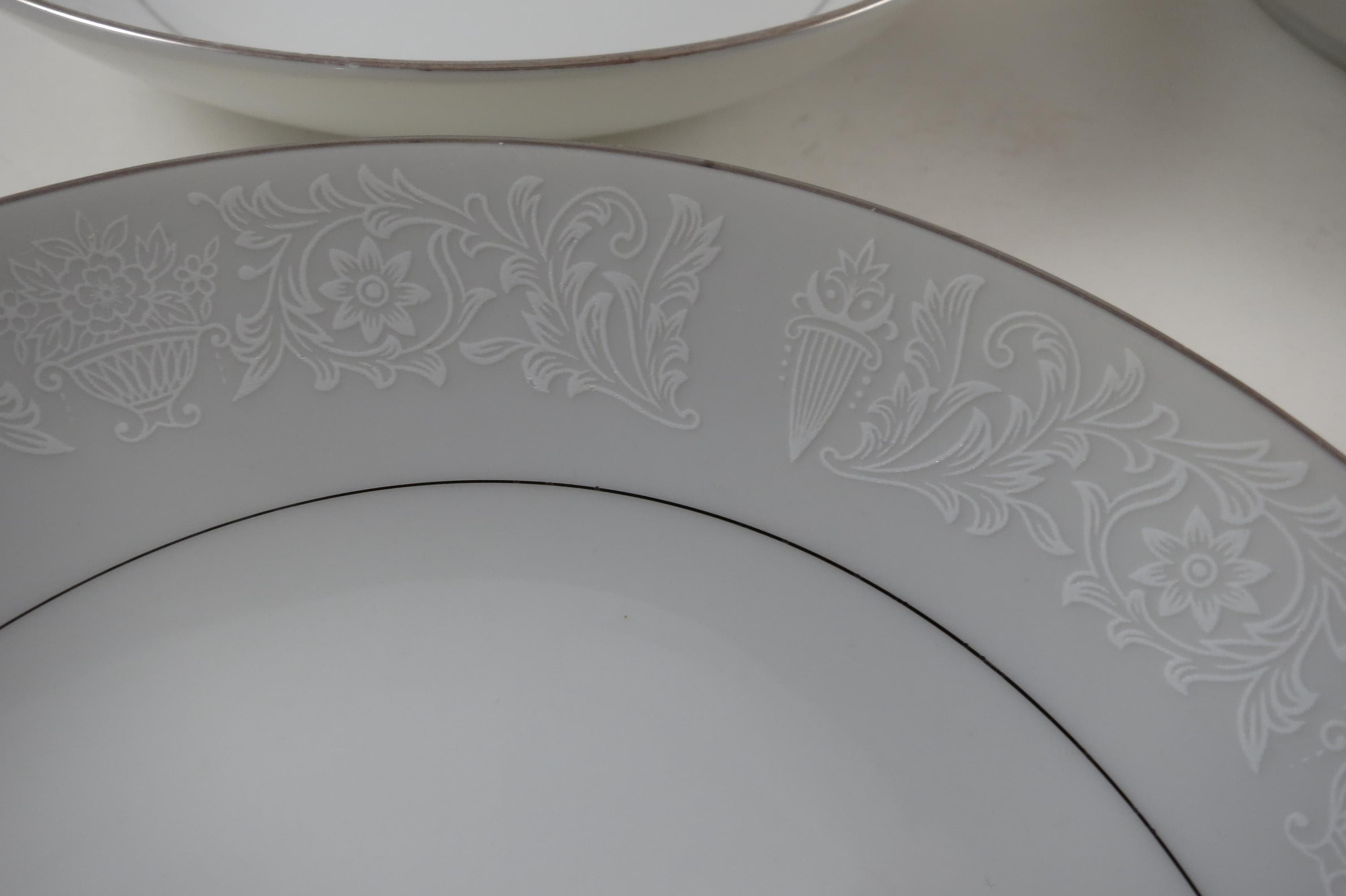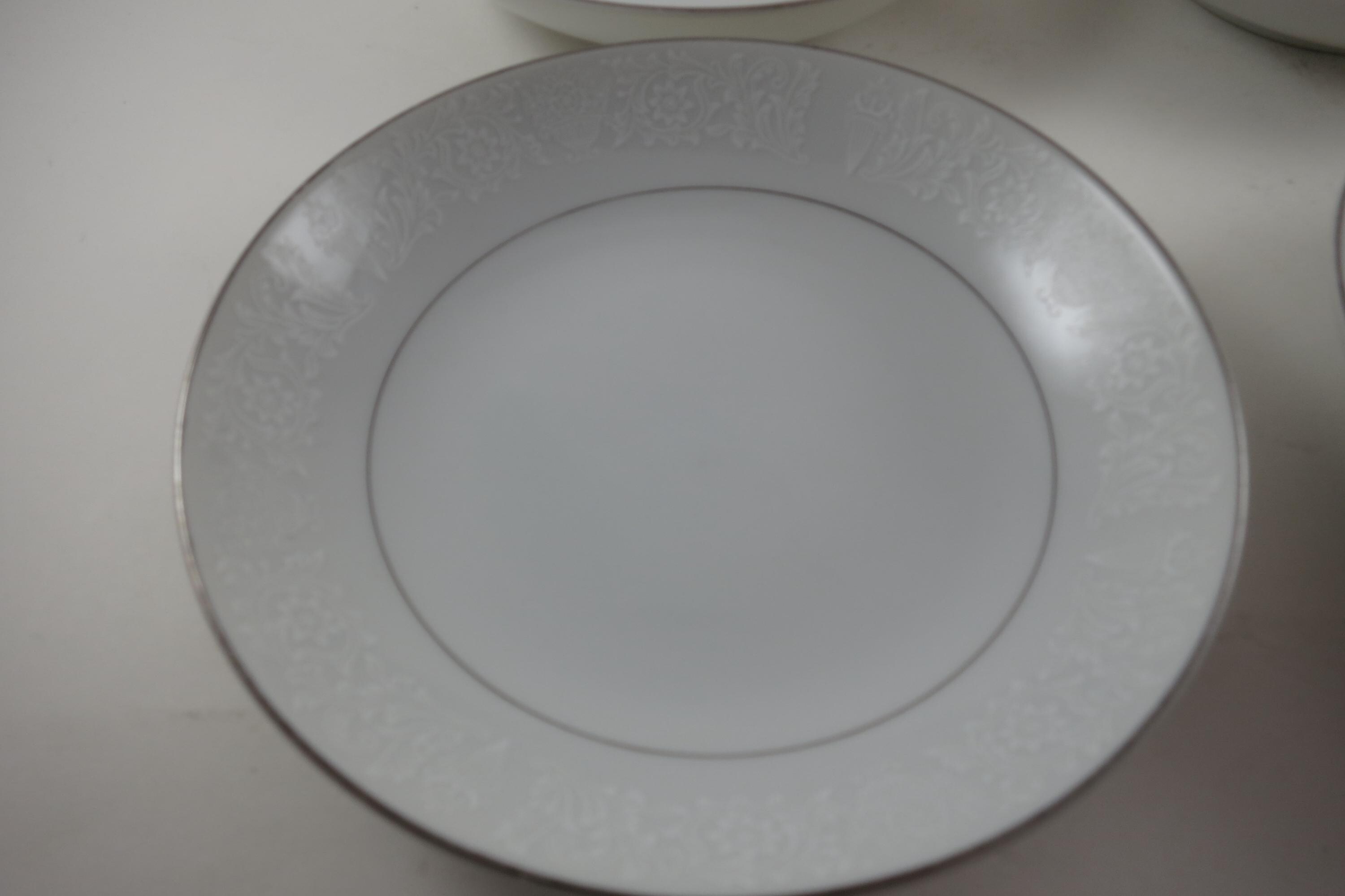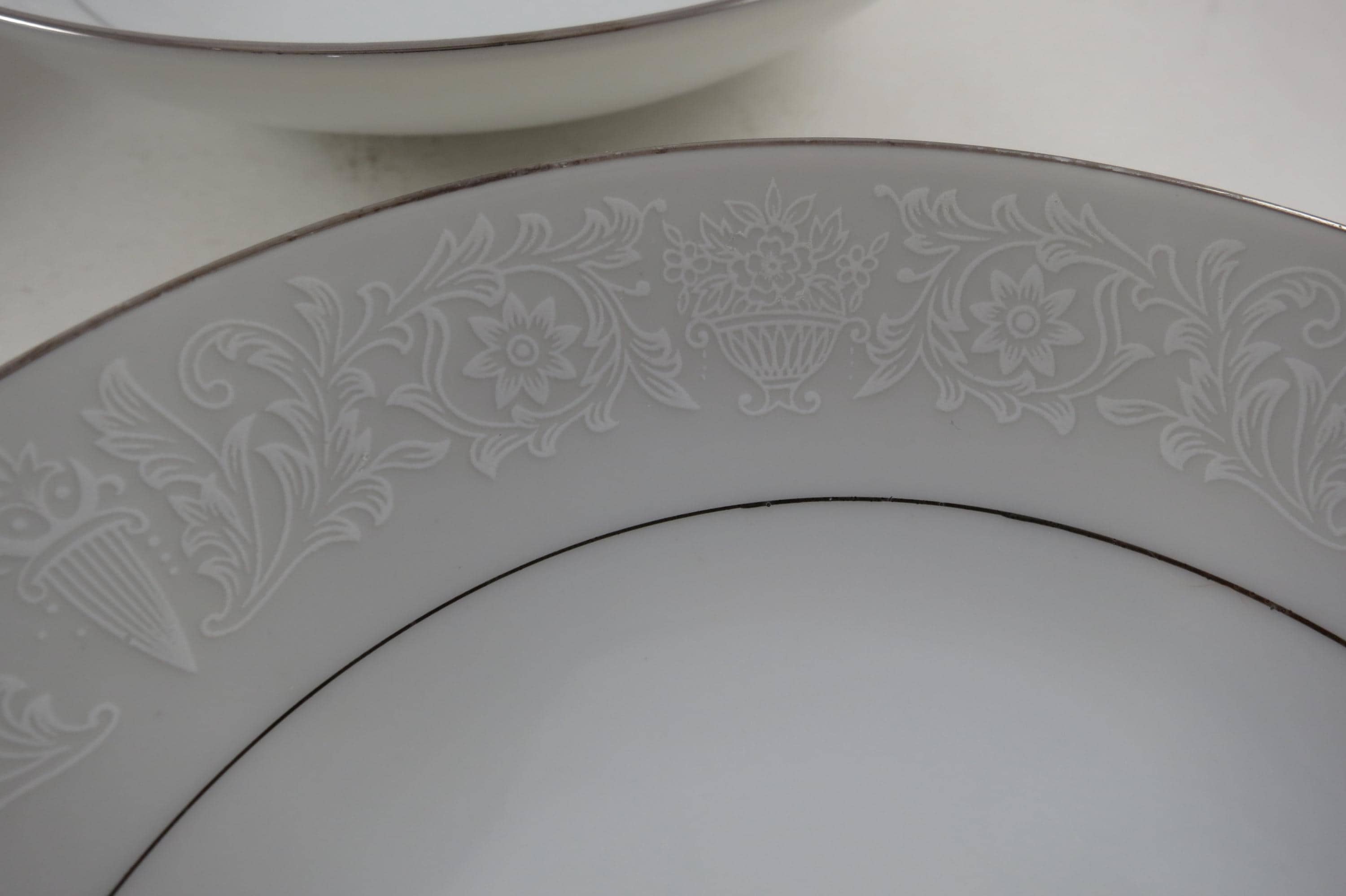 Vintage Crown Victoria Lovelace Fine China Set of 4 5 1/2 Inch Fruit Bowls. Beautiful White Background with white flowers and urns.