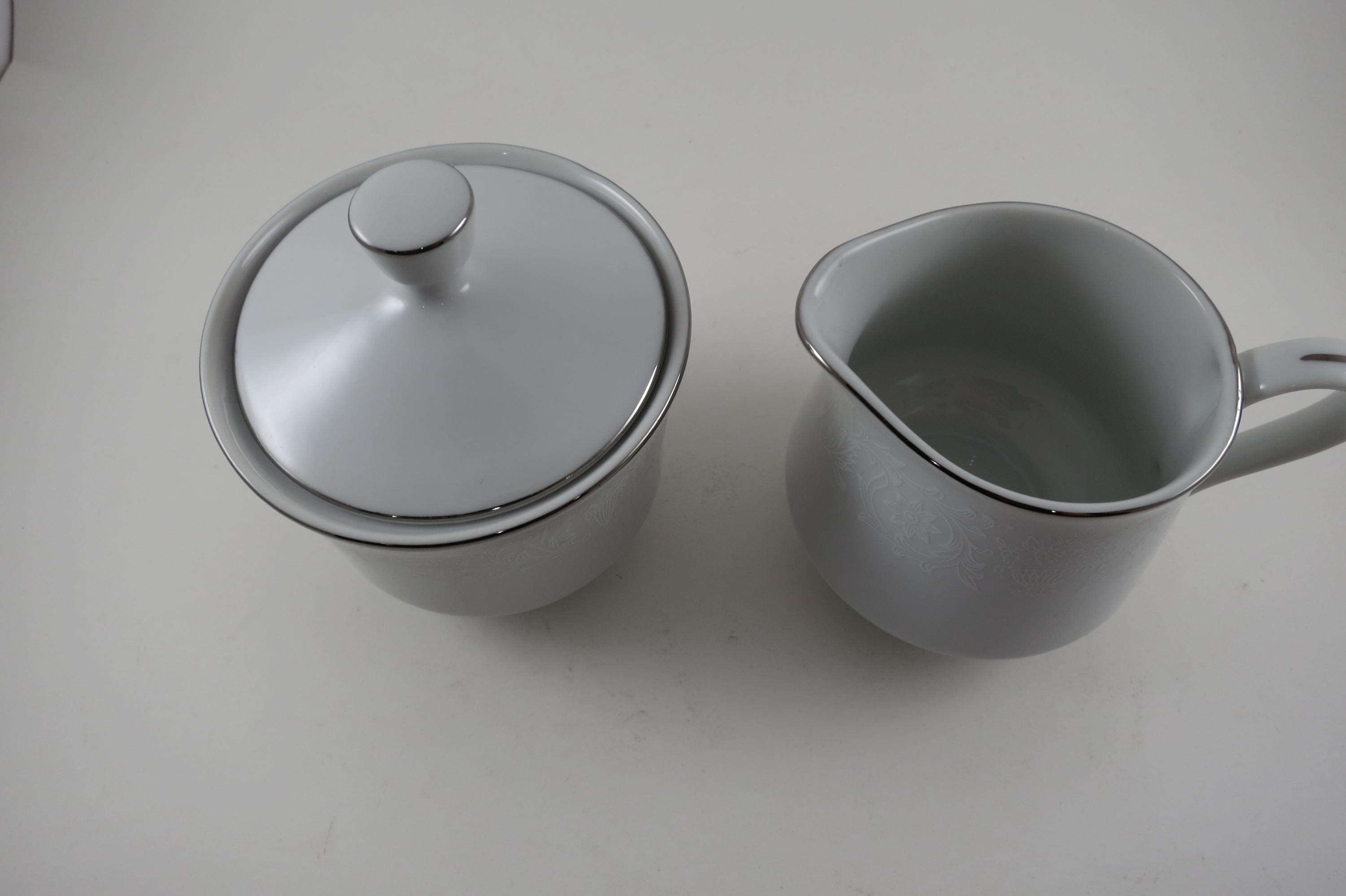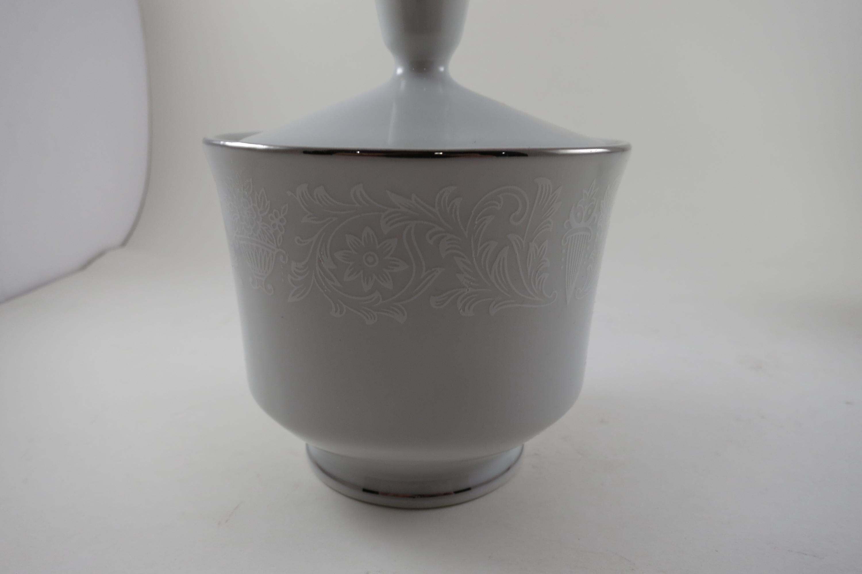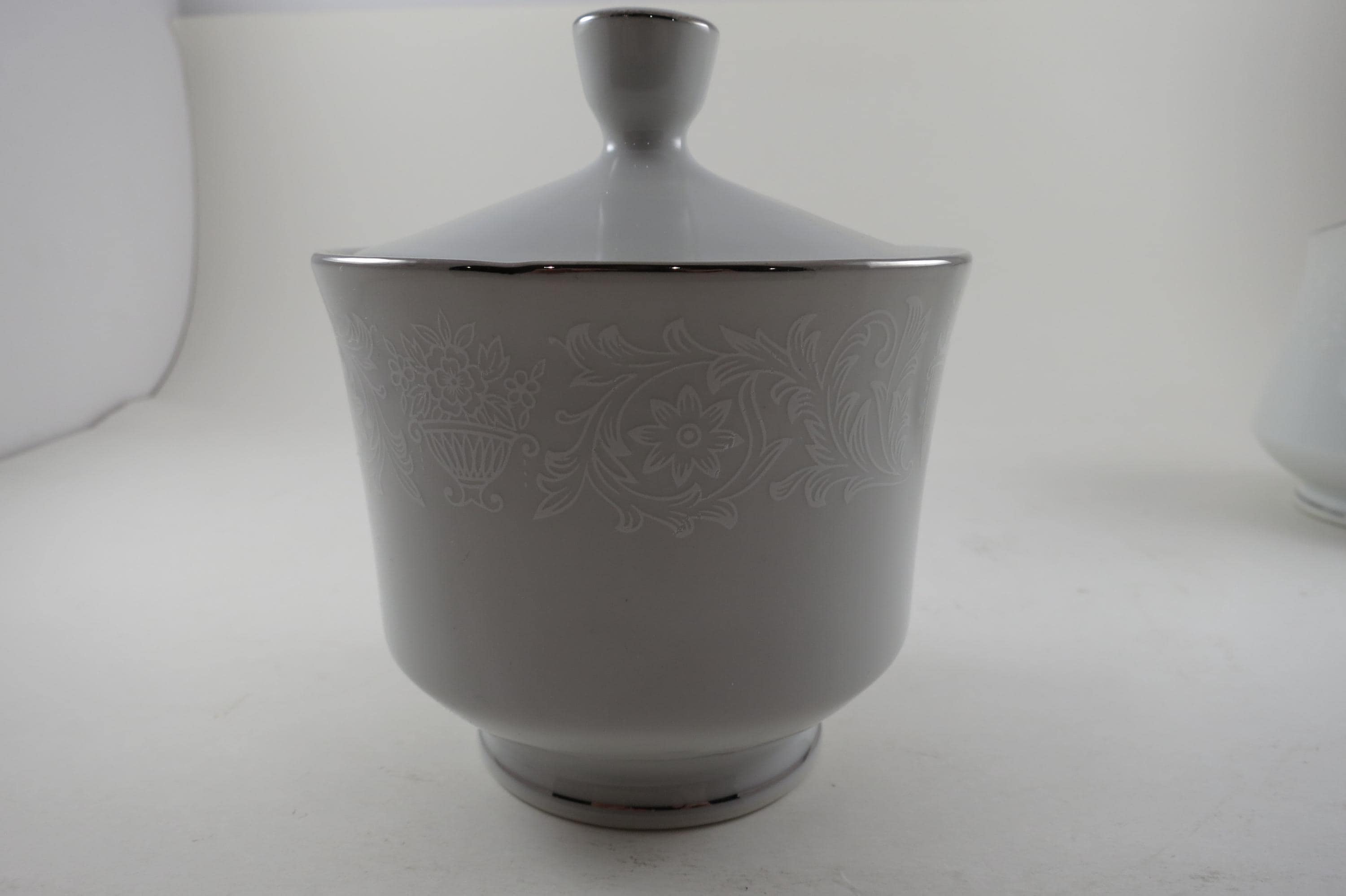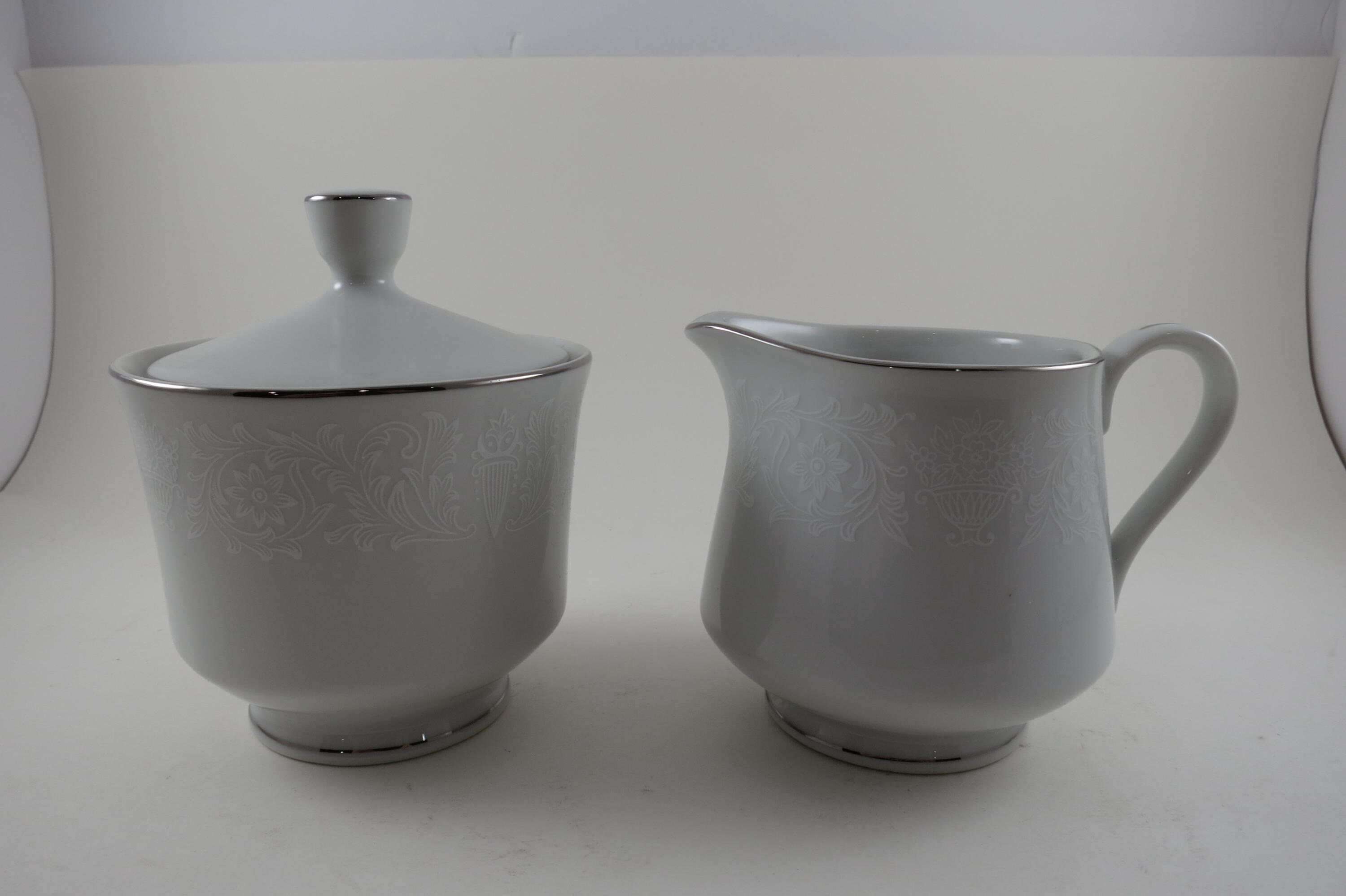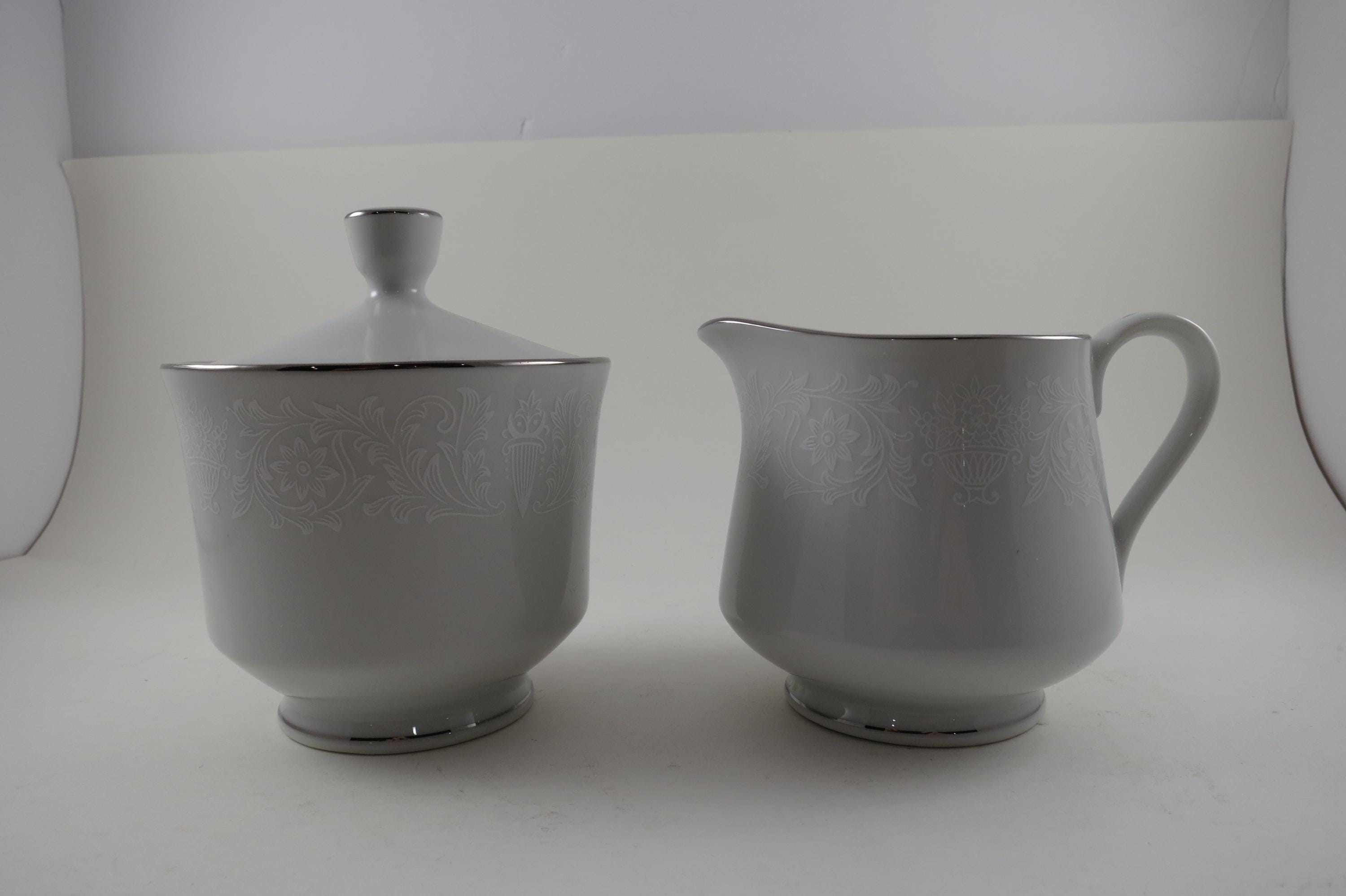 Vintage Crown Victoria Lovelace Fine China Creamer and Sugar Bowl with Lid. Beautiful White Background with white flowers and urns.